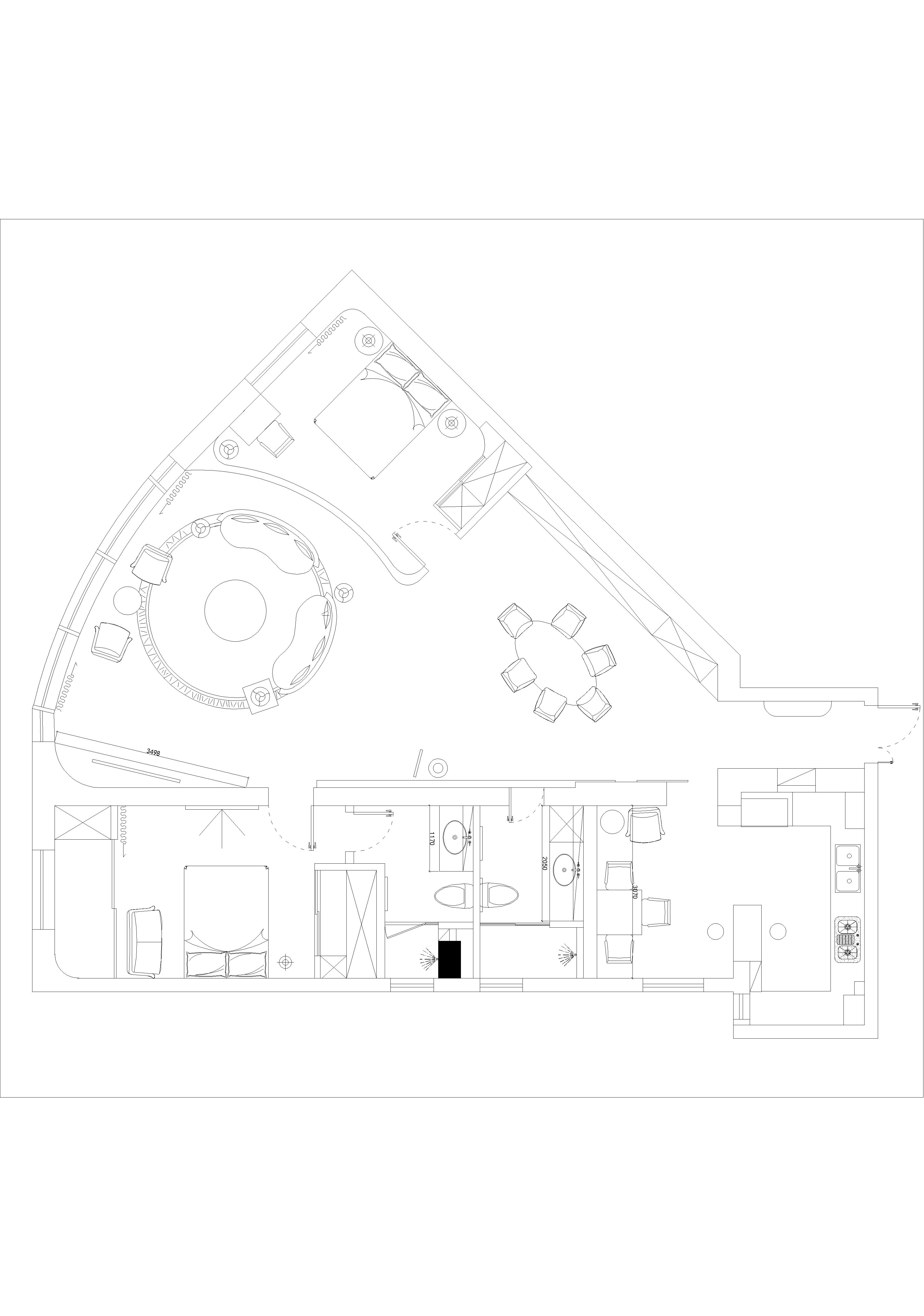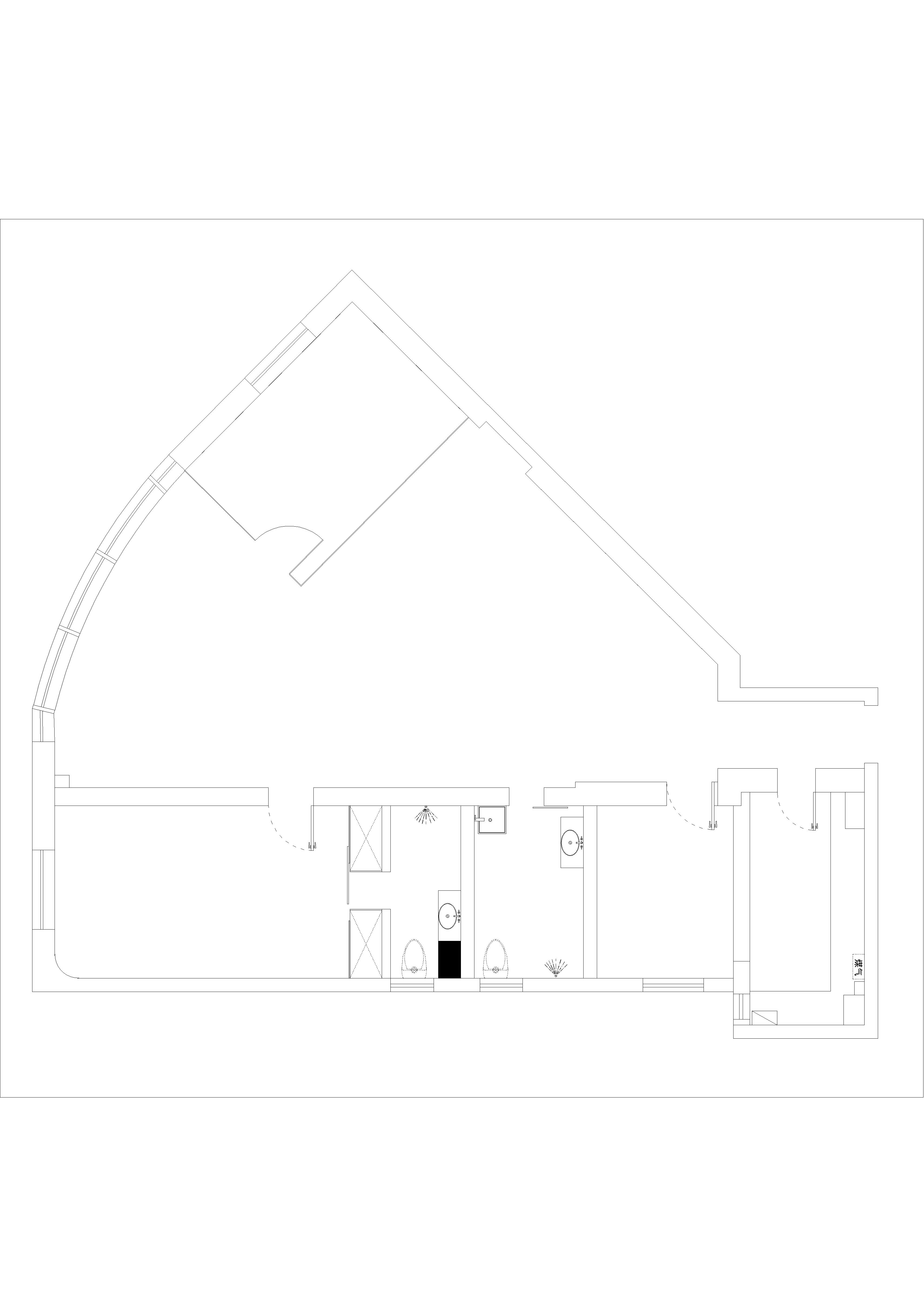 异形空间采用“圆”作为设计的出发点,设计师将次卧调整方向,改变餐厅空间尺度,从而更好地扩充客厅的空间感;以沙发为圆心,电视柜顺墙布置,将落地窗和弧形墙形成围合的空间;在次卧的对面设置一通透隔断规避进门的一眼望穿,划分区域;将厨房和邻近的小房间打通,符合业主长期居住国外使用宽敞开放厨房的生活习惯,考虑到国内生活的油烟问题,用一扇超窄边框移门让空间可分可合,美观兼顾实用;麻雀虽小五脏俱全,设计师以功能为前提,将主卫、次卫以及主卧重新调整尺度和比例,将朝南的主卧分隔出阳台用来晒衣服,并改变主卫的动线增加衣帽间,并对主卫及次卫的内部进行调整,冲淋布置在靠窗的位置更好的解决潮湿。