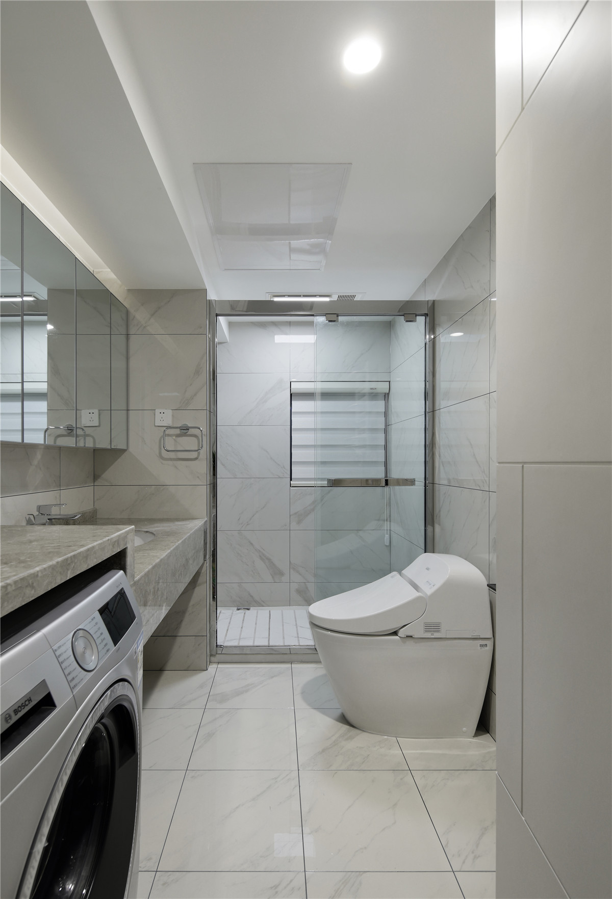 设计选材:异形空间的圆弧墙面处理,采用马赛克代替常规的墙砖不仅防晒防水,还易于卫生打理;同时采用硬包,划分竖条造型来处理弧形的墙体,美观又经济;过多的门集中在一面墙,采用最普通的白色木板通过变换的几何装造型来弱化门,提升效果。