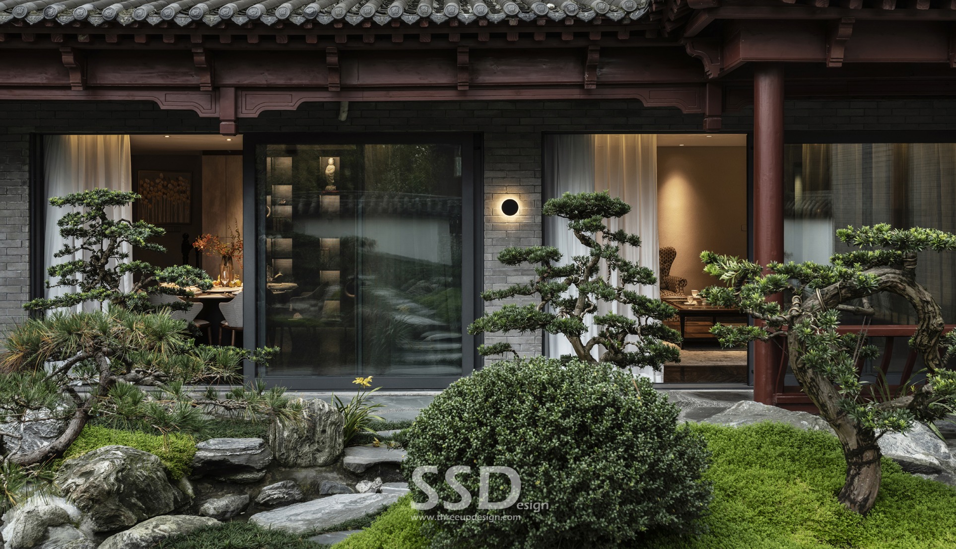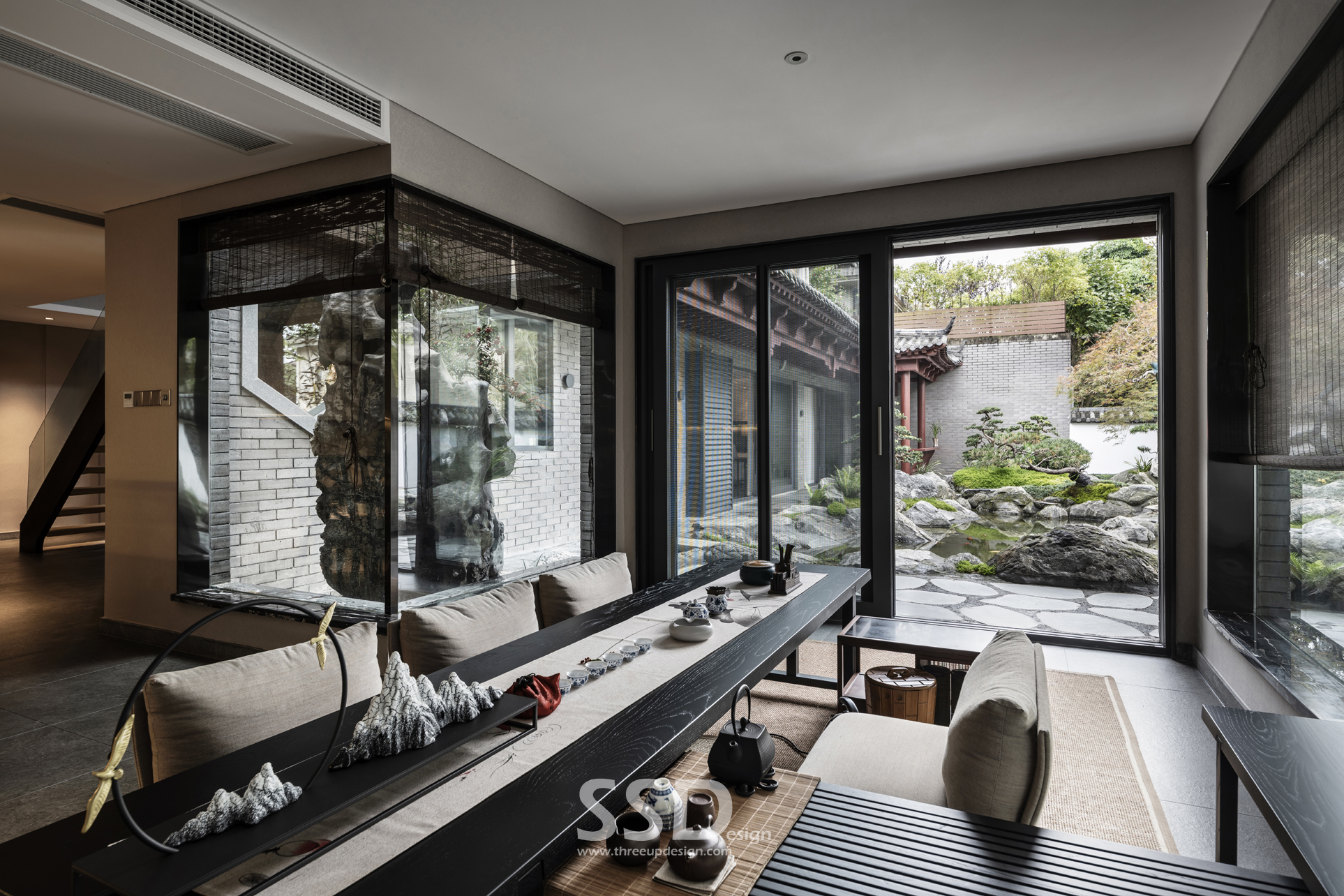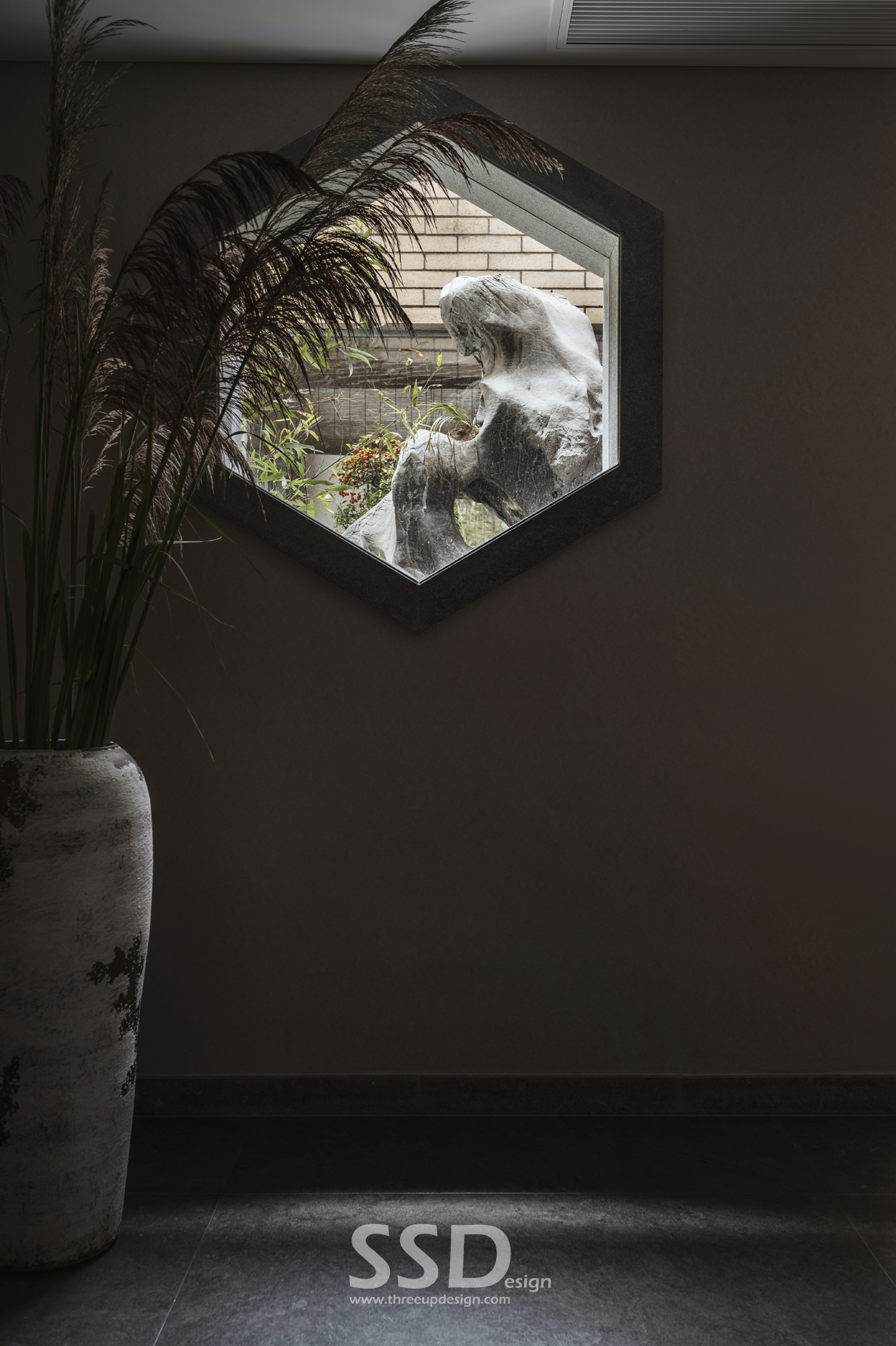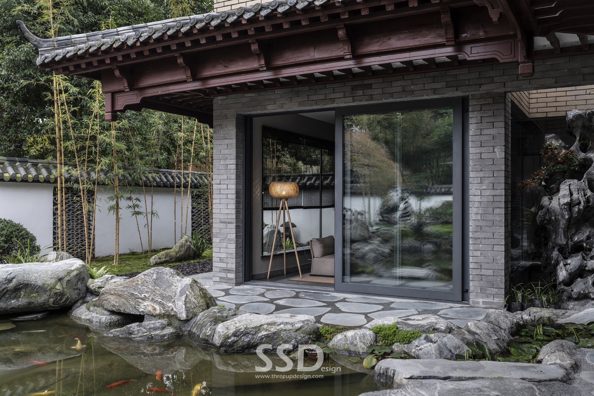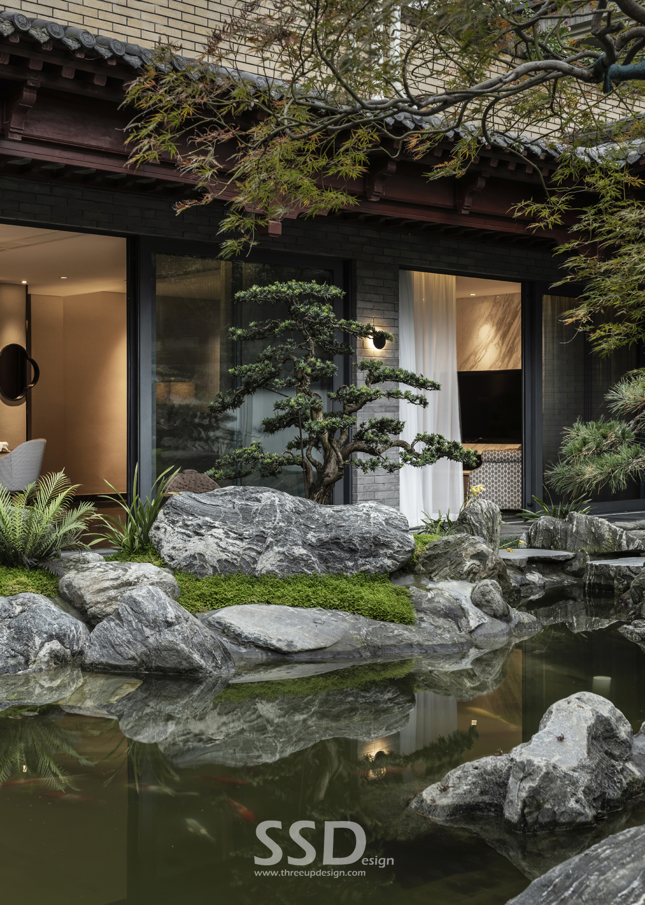 空间布局:玄山•墅的院子以水系贯穿其间,阐述园林艺术之美,把禅宗美学渗透到作品之中,体现了无形胜有形的独有境界。《道德经》云:“凿户牖以为室,当其无,有室之用”。室内和室外应为浑然一体,由于使用功能的不同建隔墙以区分。住宅以L型将院落围合其中,临园面大面积开窗,使各室内都能透过玻璃窗看到院落景观。形成“各房皆有景、各景皆不同”的视觉感受。