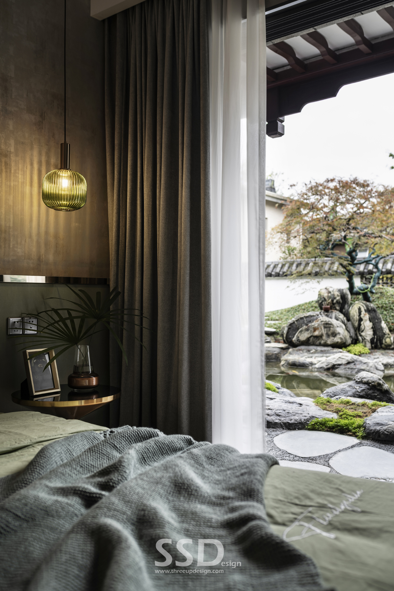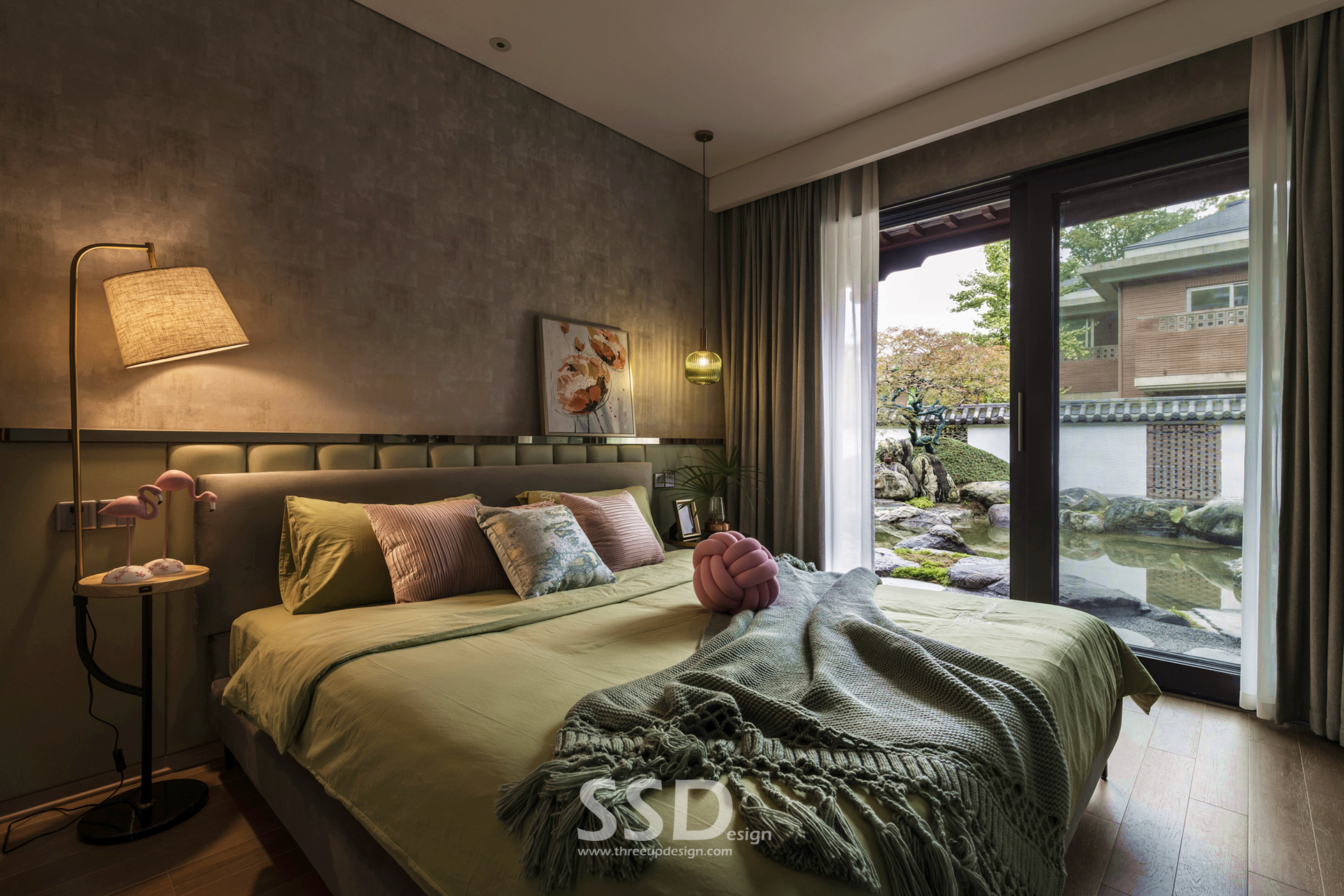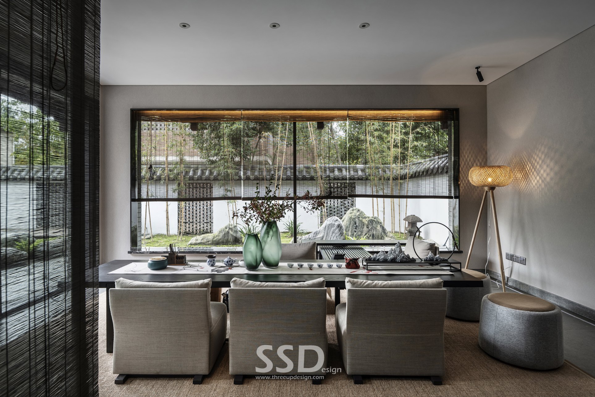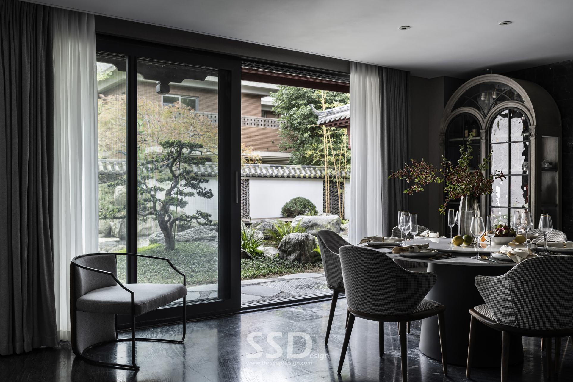 室内各空间主体以现代空间风格,简洁明亮的注入东方装饰主义意境。房间的布局均以花园为造景中心,设计中延伸庭院视觉,以灰阶淡彩登堂,干净利落,更显通透。