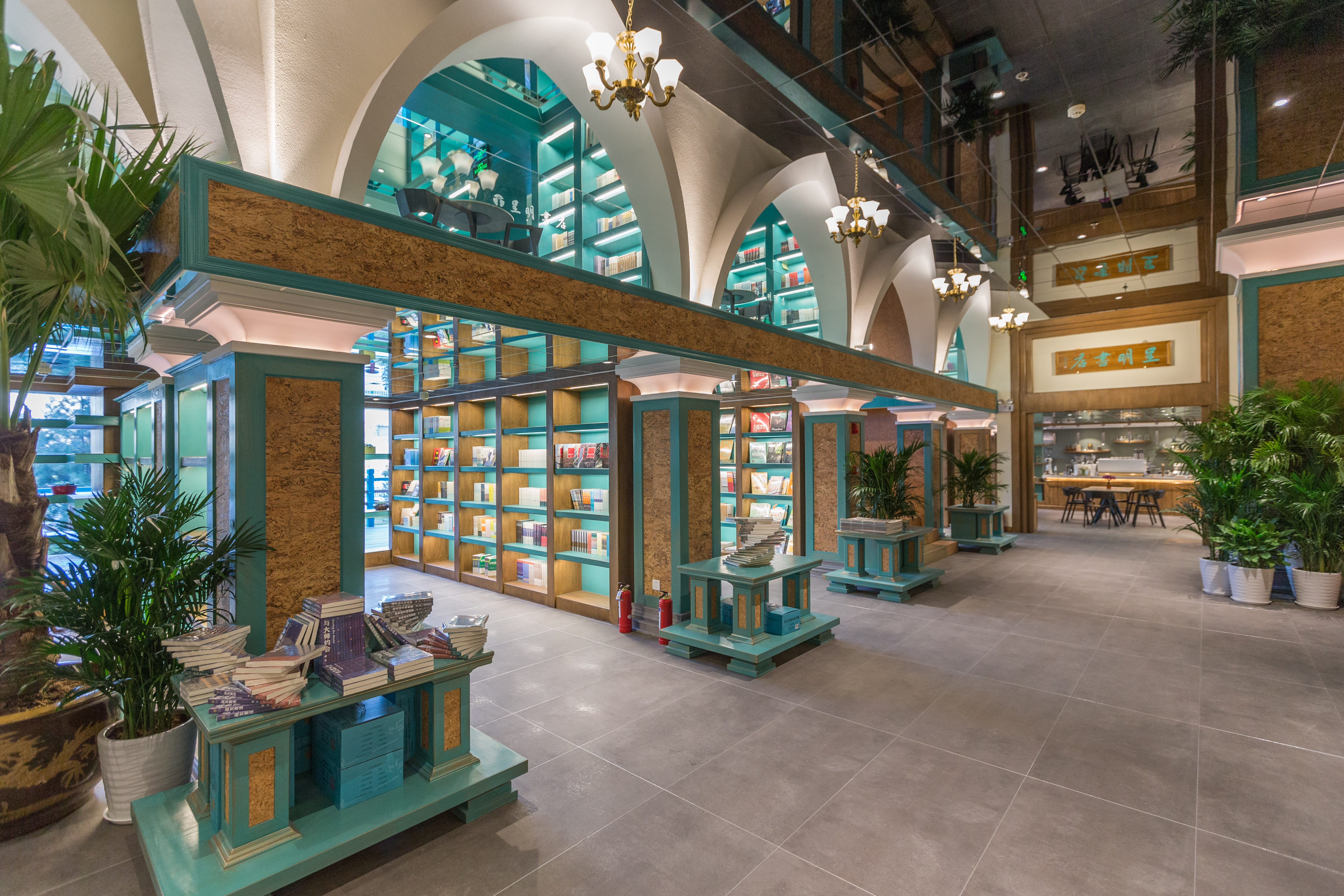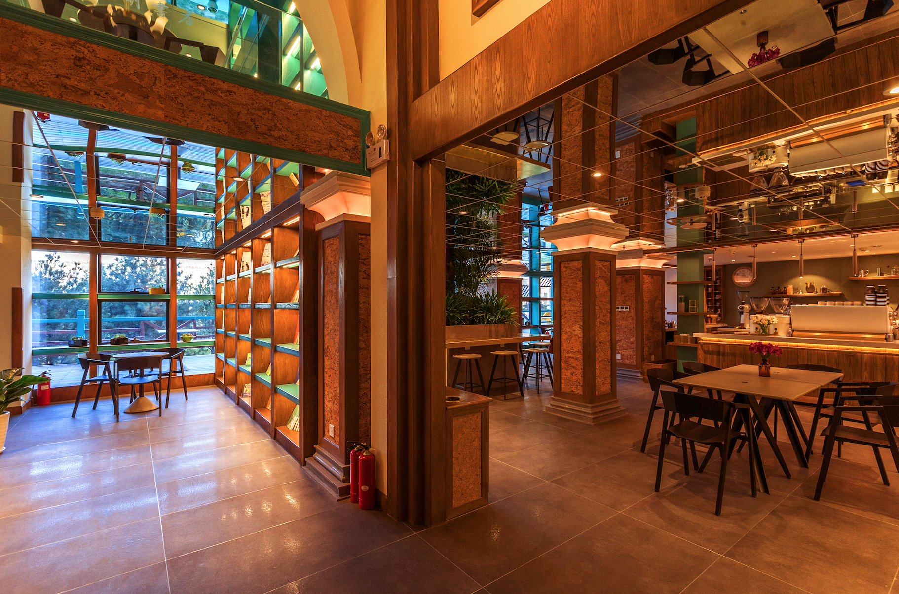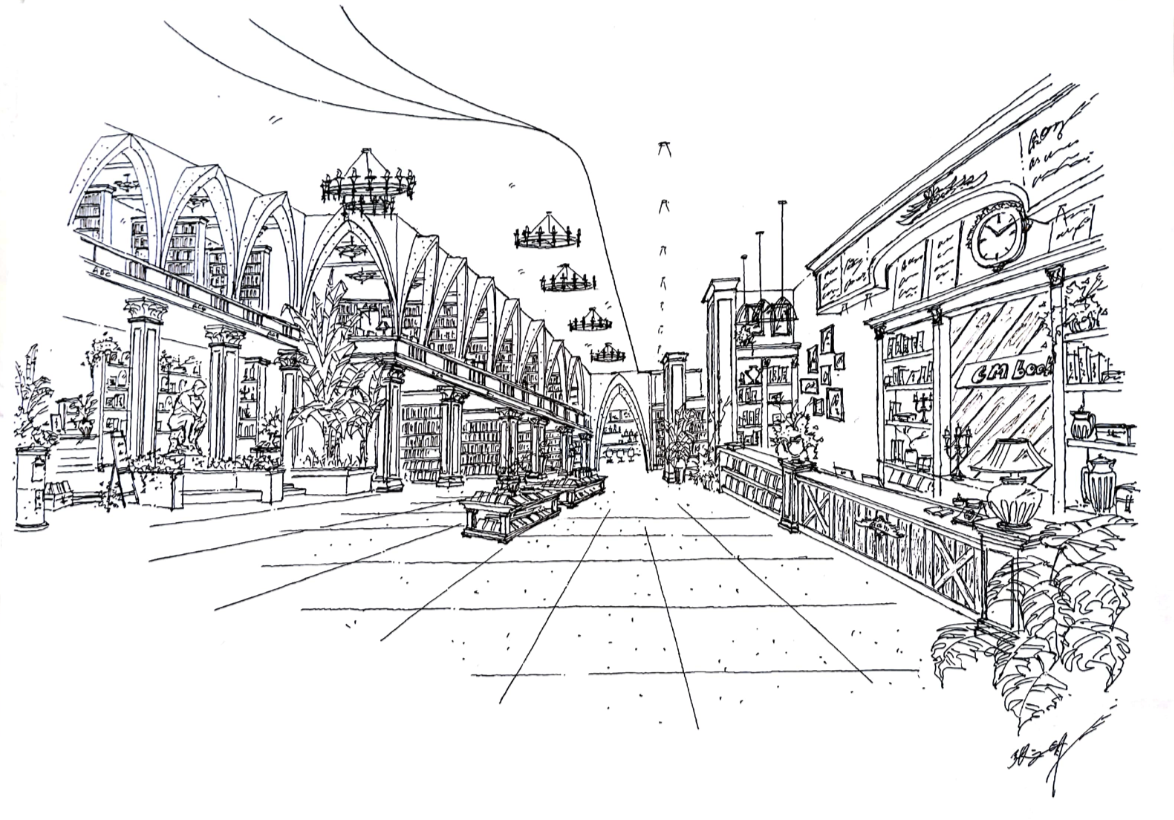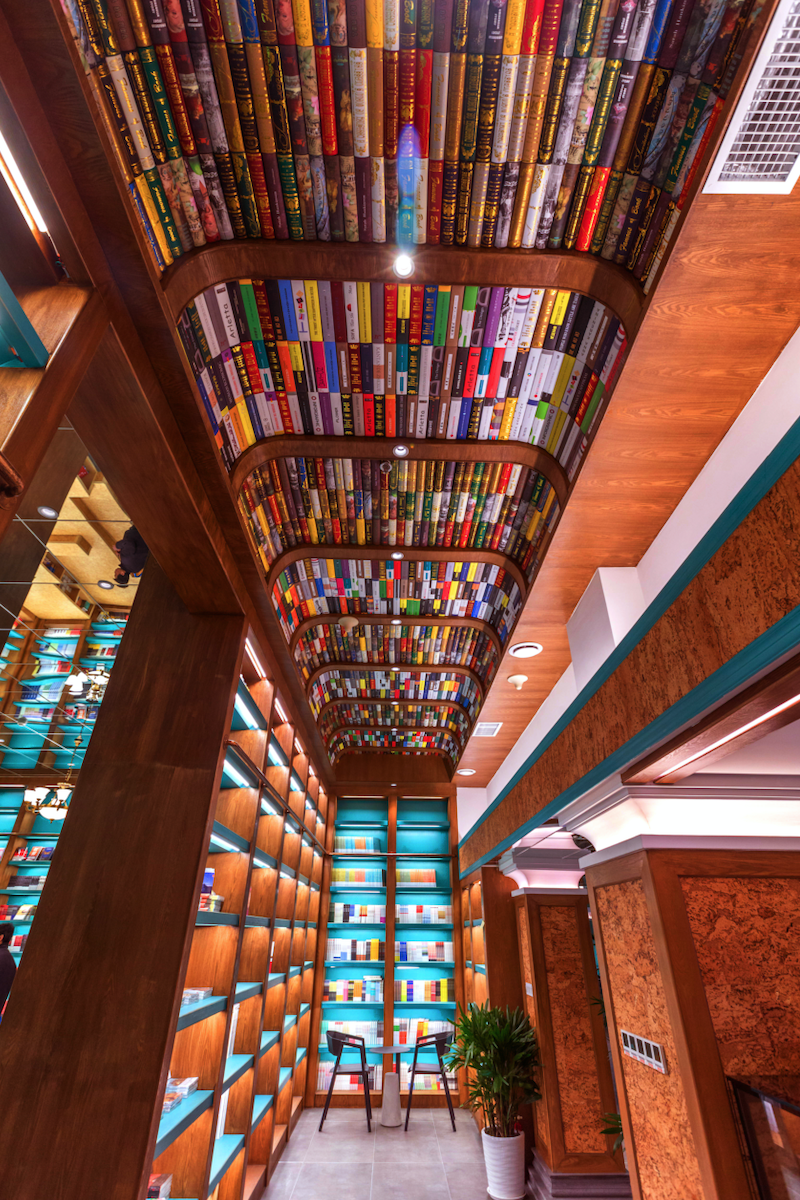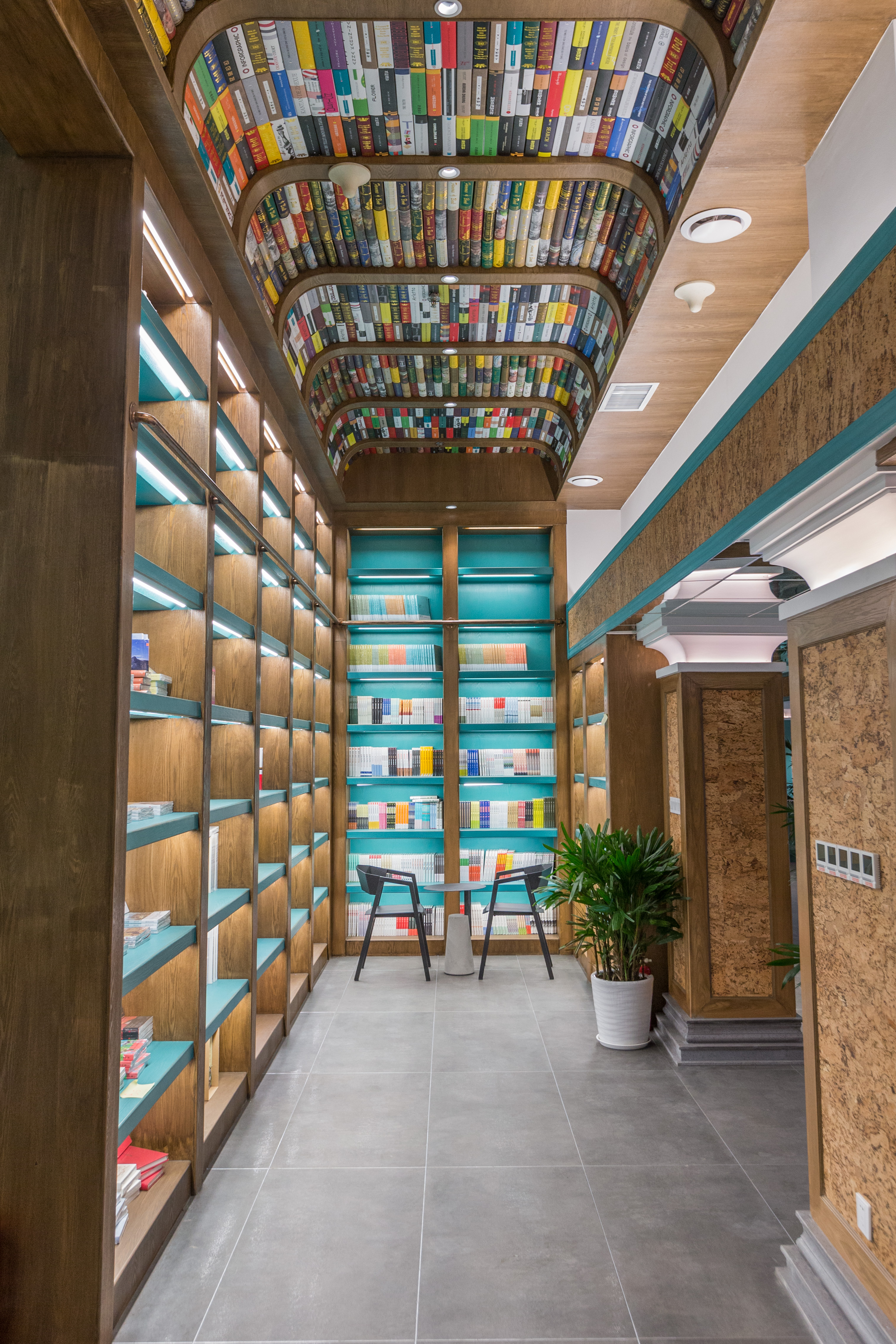 咖啡区通往洗手间的区域上空设计成了书的海洋,其灵感源于欧洲穹顶,象征着对知识的敬畏之心,也能提升视角。圆角的设计又有火车车厢的感觉,象征石家庄是一座火车拉来的城市。