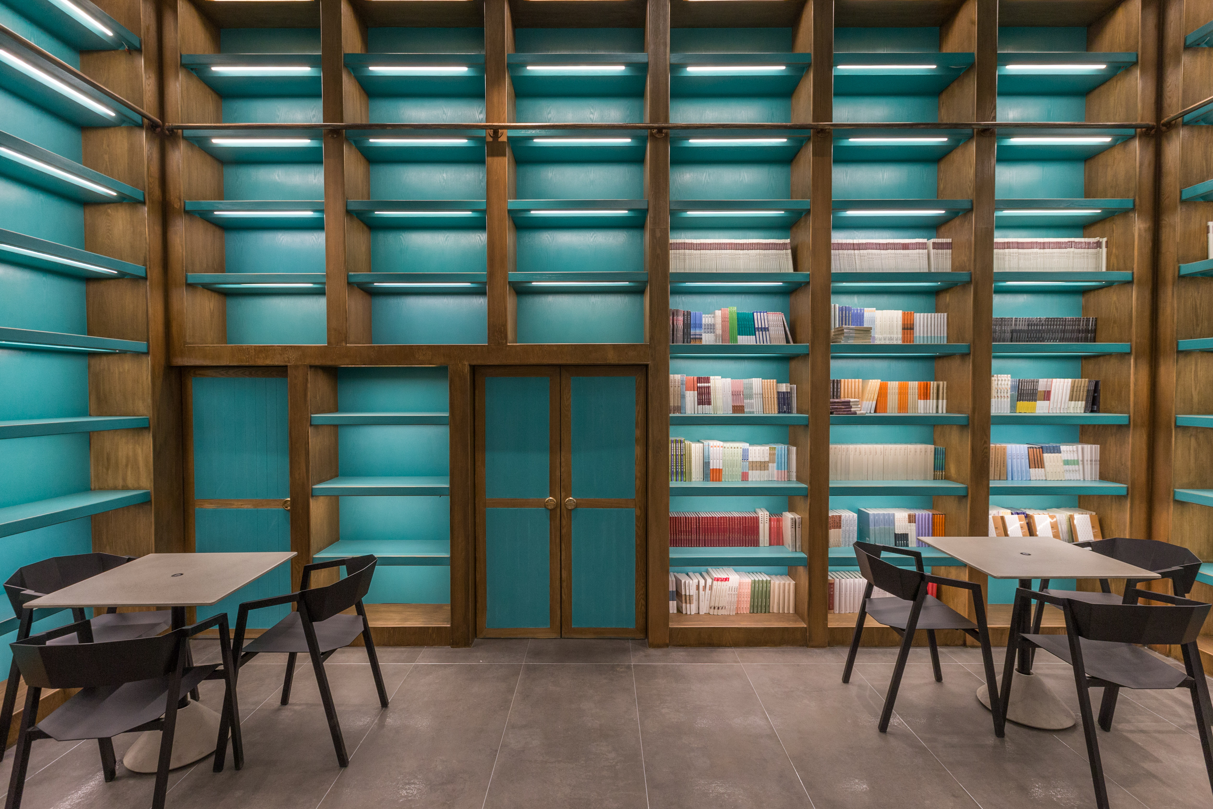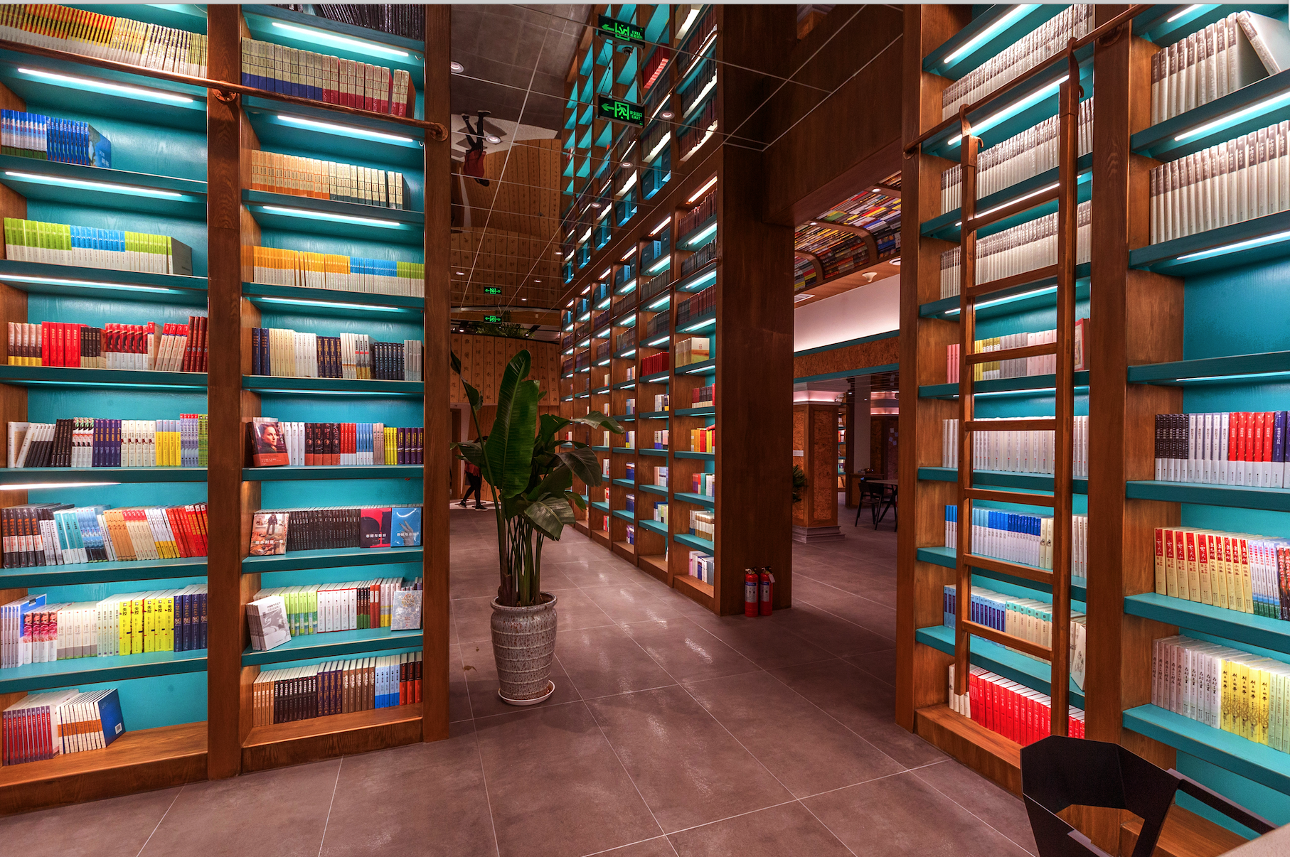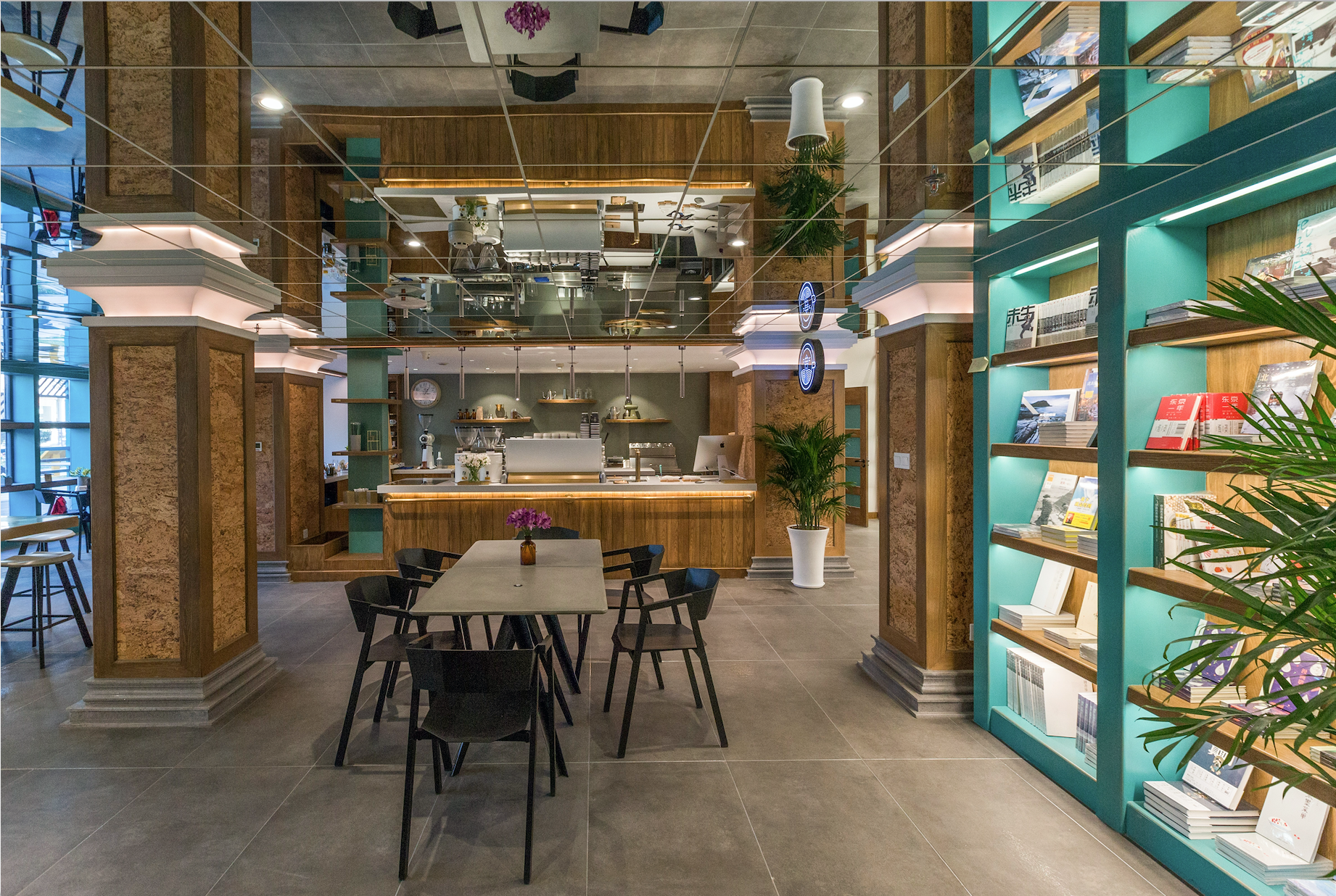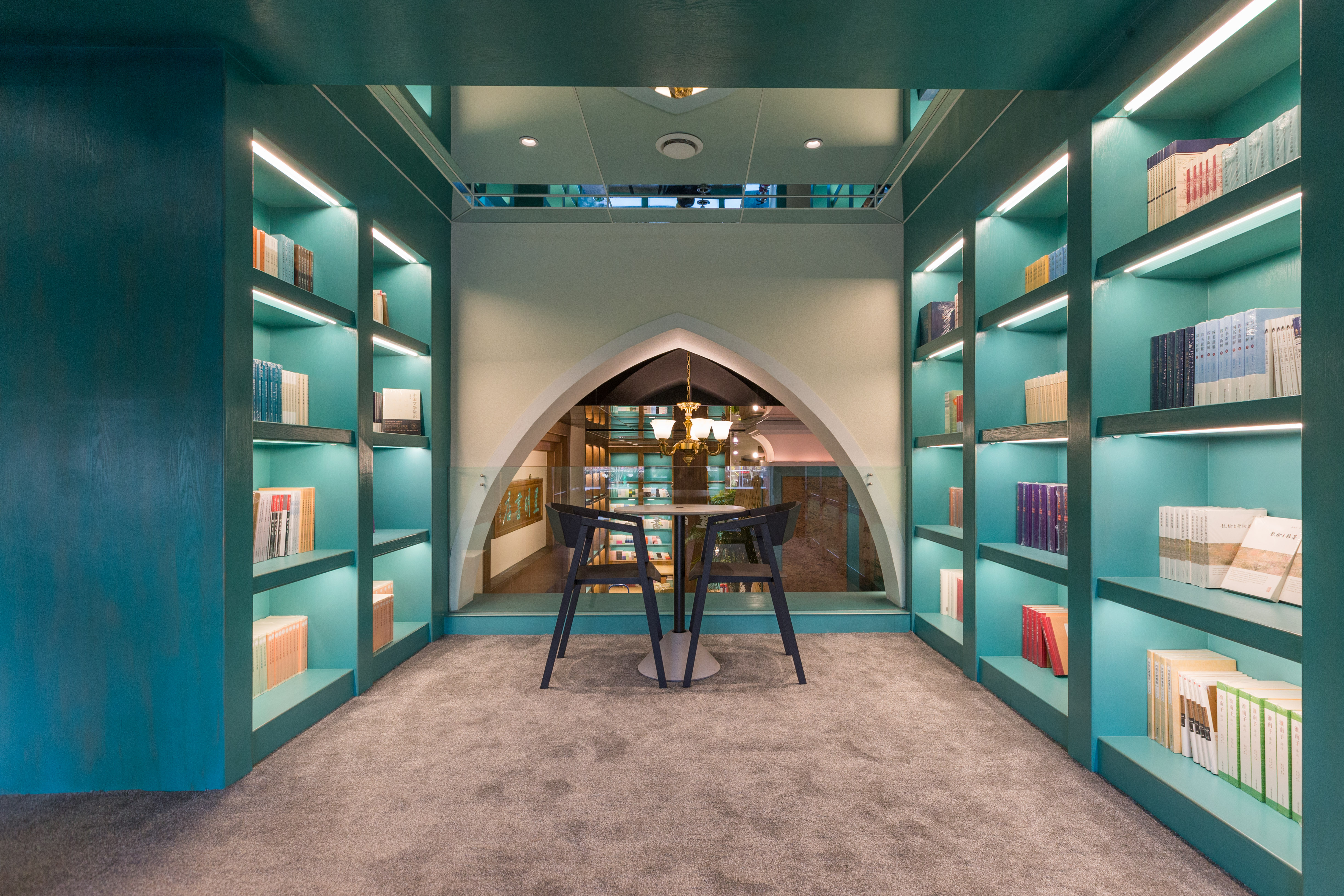 中厅的天花板采用了黑色镜面,与右侧天花板的白色镜面相呼应,一黑一白、一压一放,打造出丰富的层次感,增加了两侧空间的视觉宽度,并有意识地引领读者视角向两边侧重。