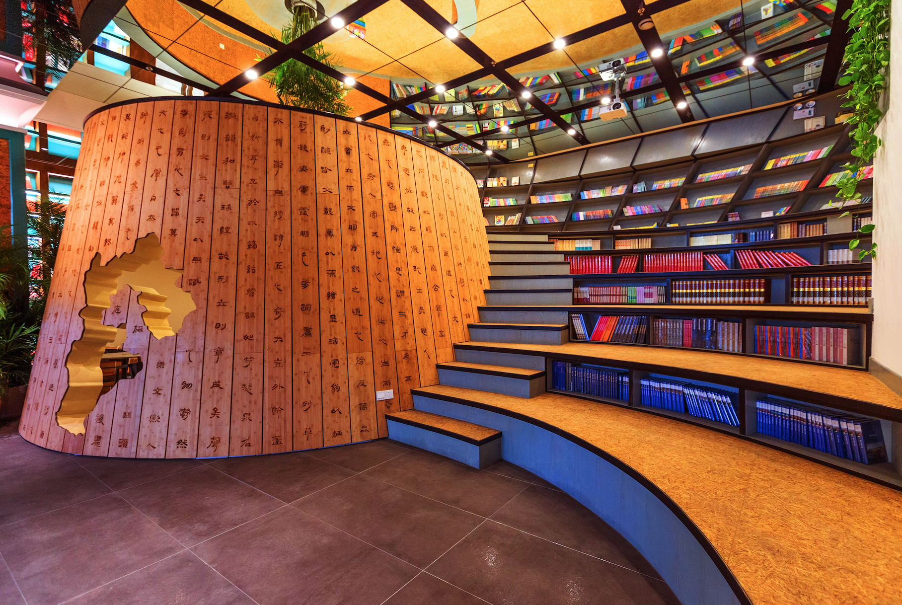书店竹简区的设计颇富创意,其造型既像一个逗号,代表来这里的读者正在人生旅途的行进过程中;又像一个蜗牛壳,让读者在那小小的壳里找到一丝温暖;还像人类的怀抱,拥着读者走入心灵的梦乡。