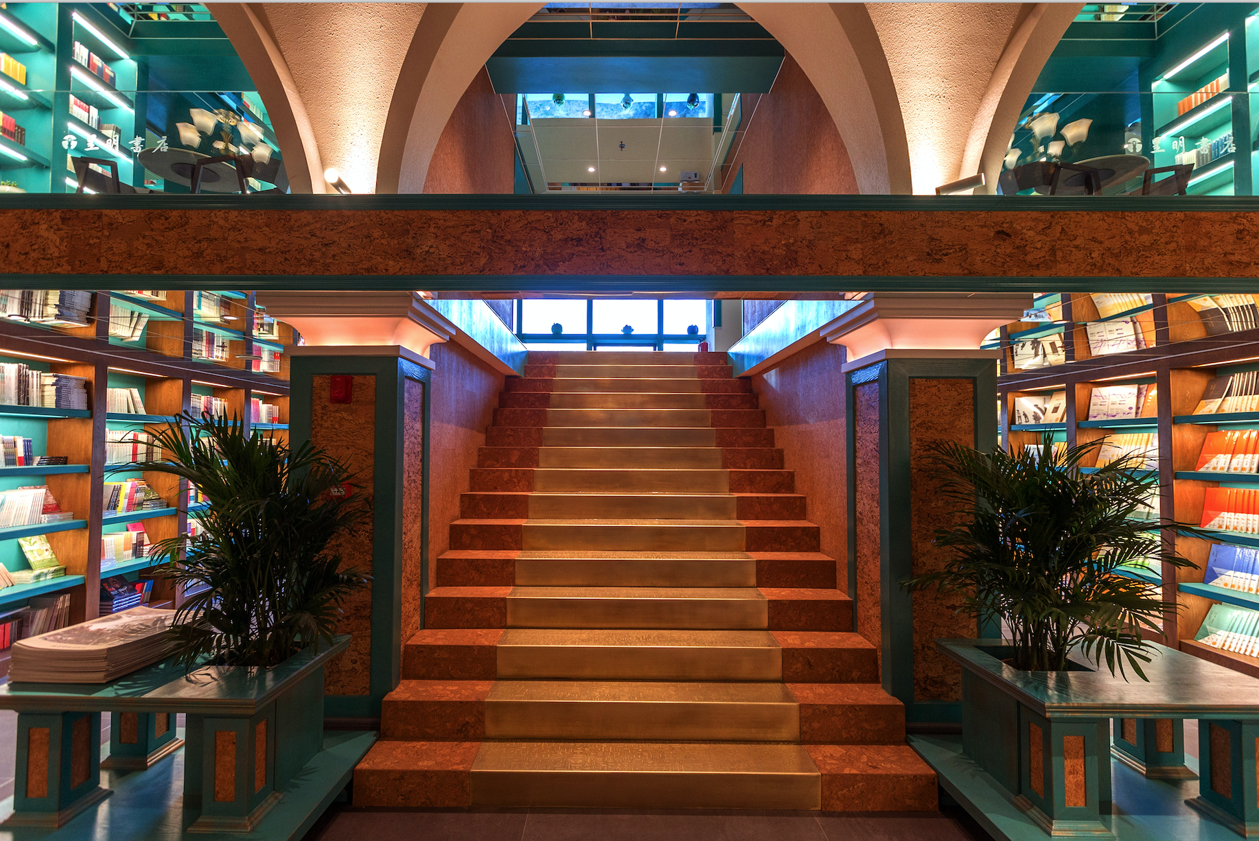 中厅通往二层的台阶,中间部分仍为59铜做旧加腐蚀工艺刻字,既能防滑,又如同文字在台阶间自然流淌。两侧采用的是葡萄牙软木,温性材质,可随意而坐。