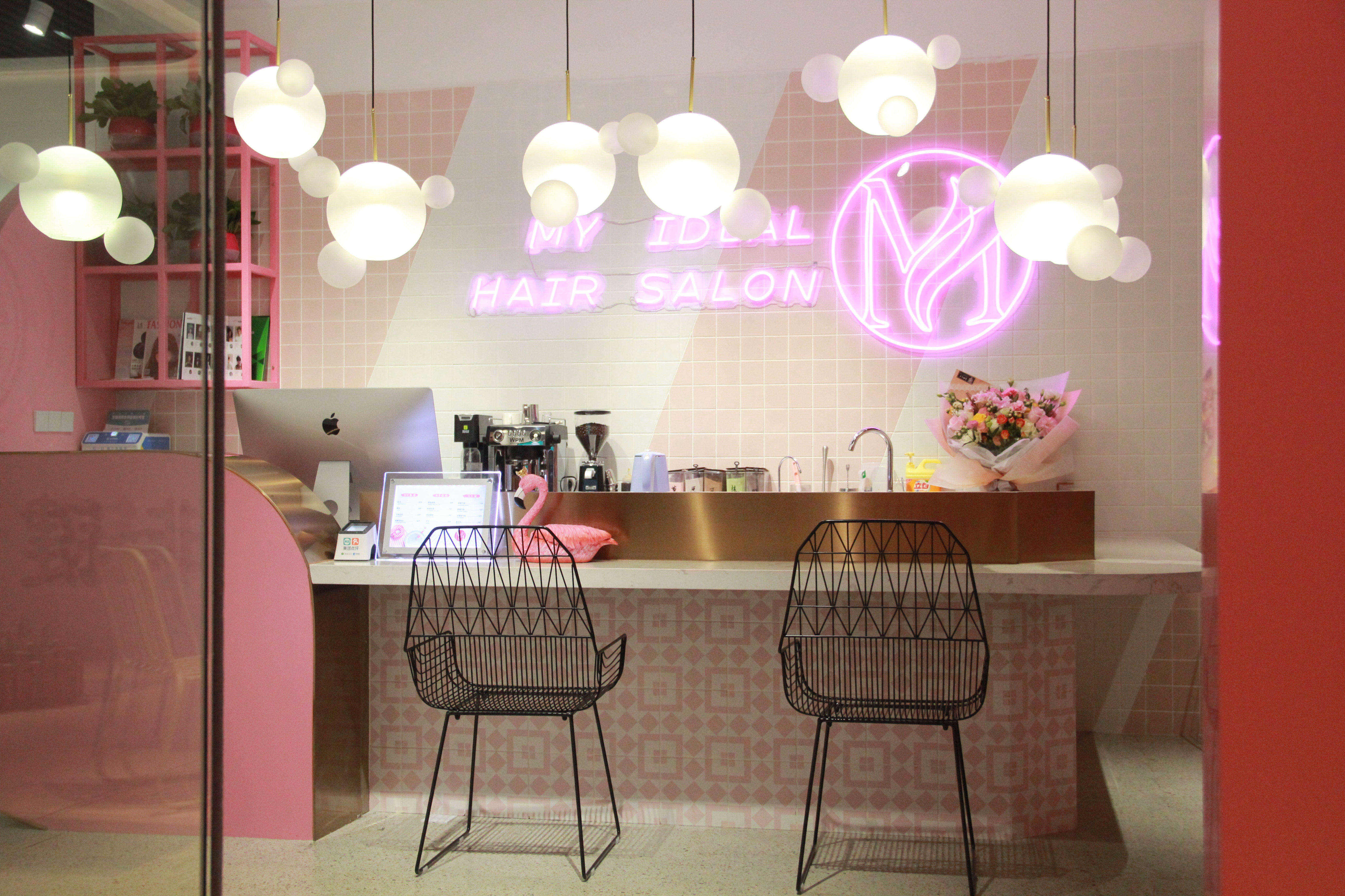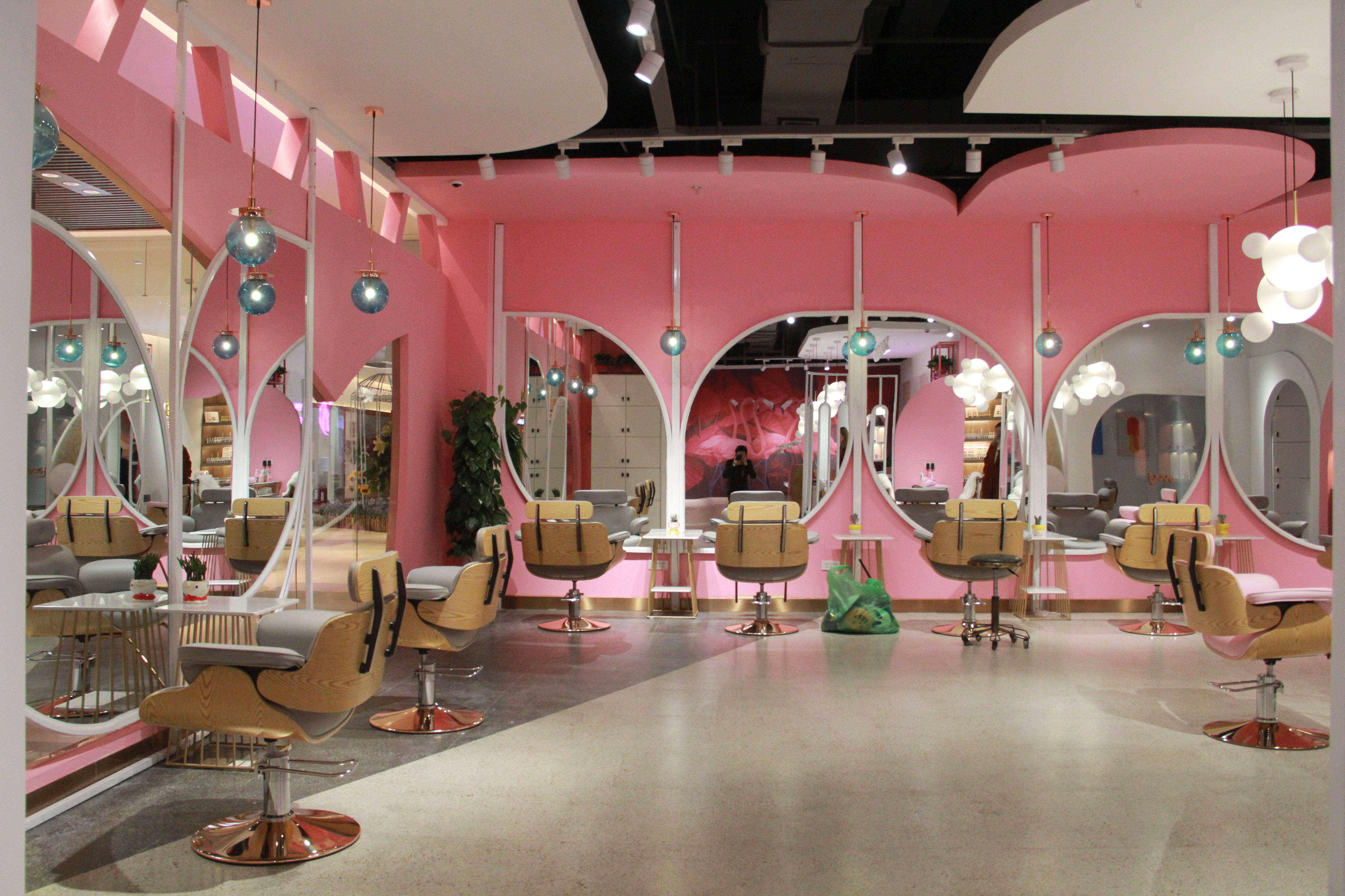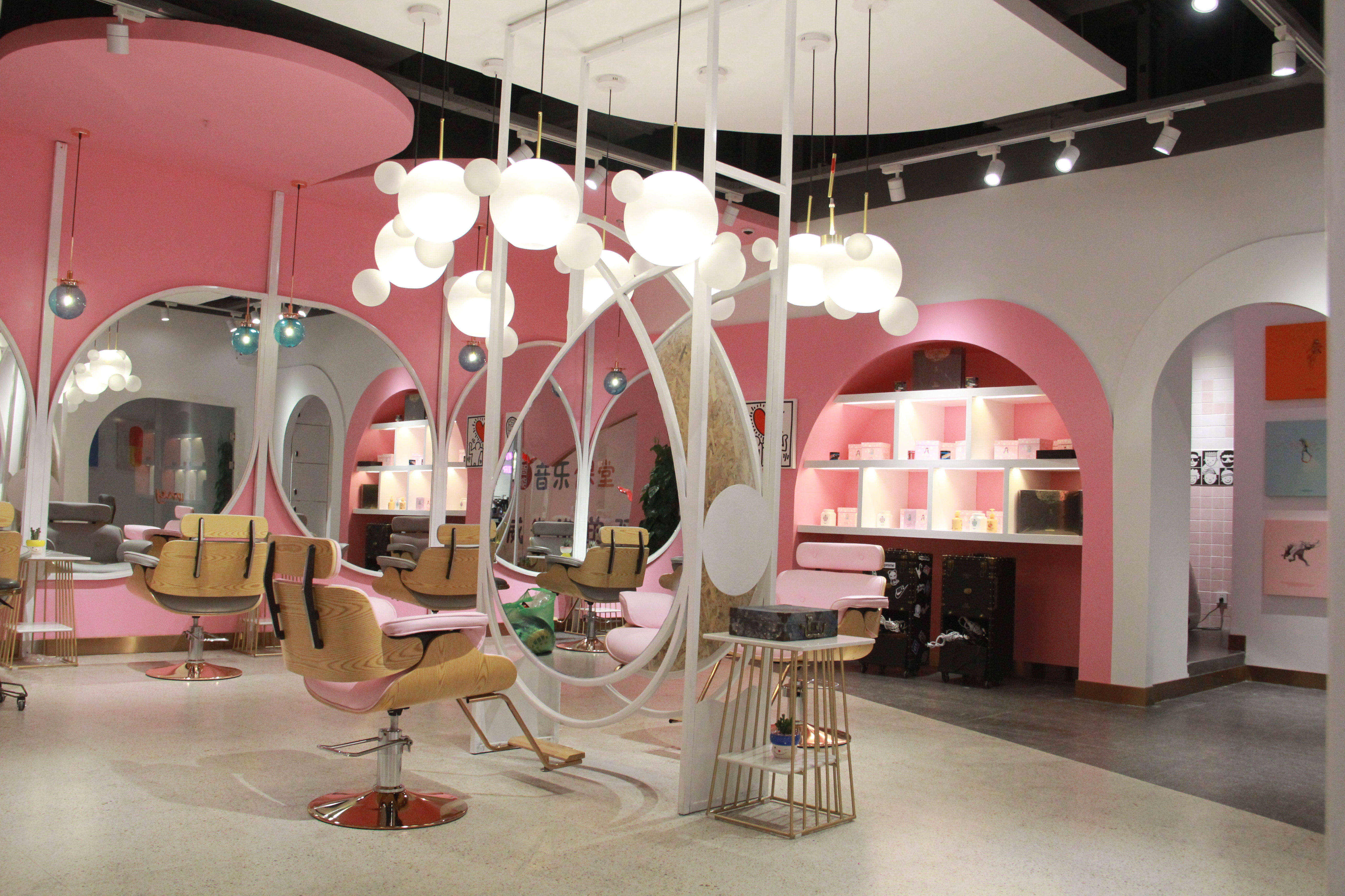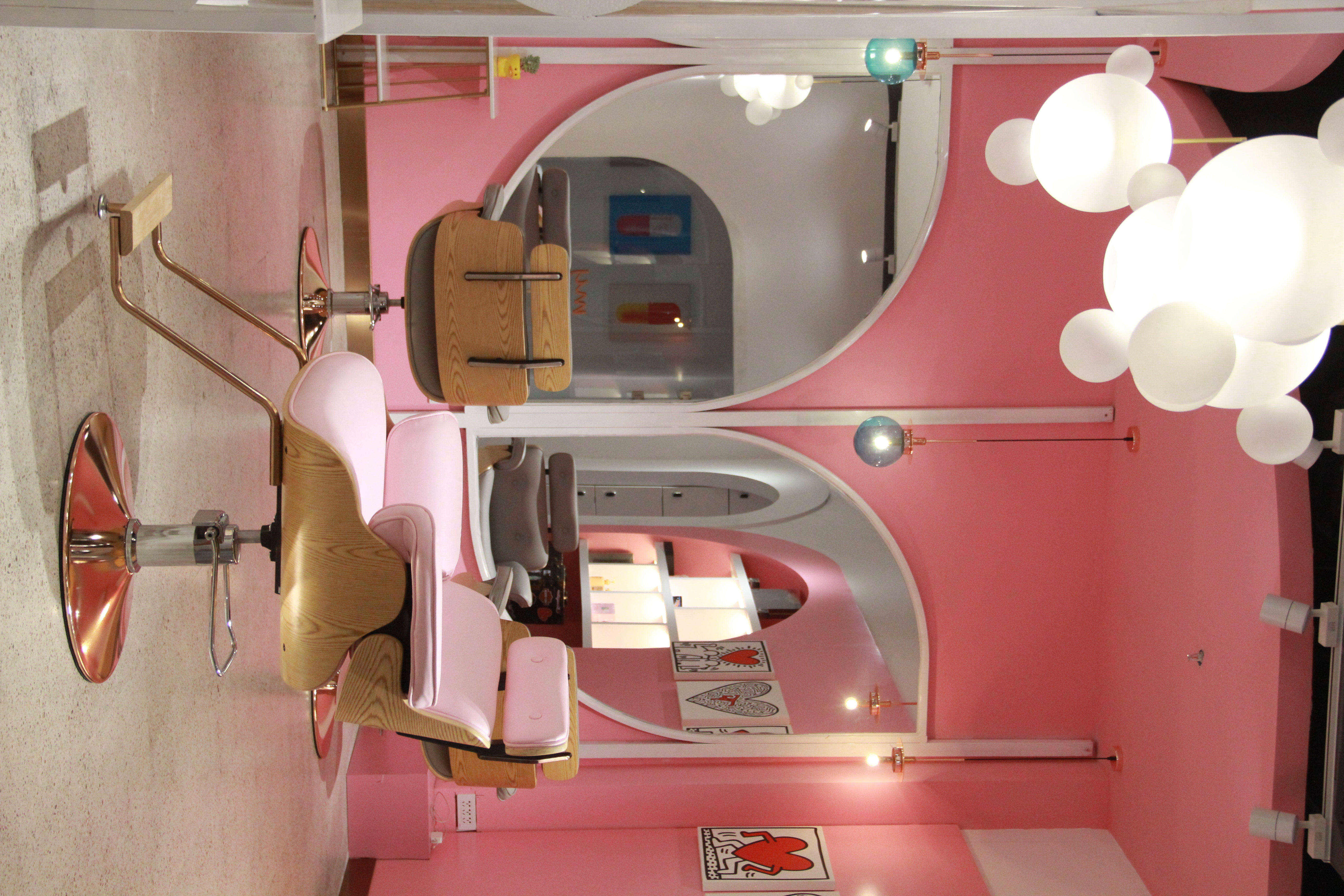 空间意境:设计之初我以店名“MY”的手绘连笔形态联想到花瓣,故此花瓣成为了本案设计围绕的核心。从店面外立面的造型到每一个剪发位的镜面,空间里处处可见这样的元素,俏皮可爱同时也增加了店面形象的辨识度。除了花瓣的元素,空间内我还大量的运用了粉色和白色的搭配来烘托少女心的氛围,搭配上空中像泡泡一样的灯以及玻璃镭射放光的质感,从而让空间的梦幻感增加