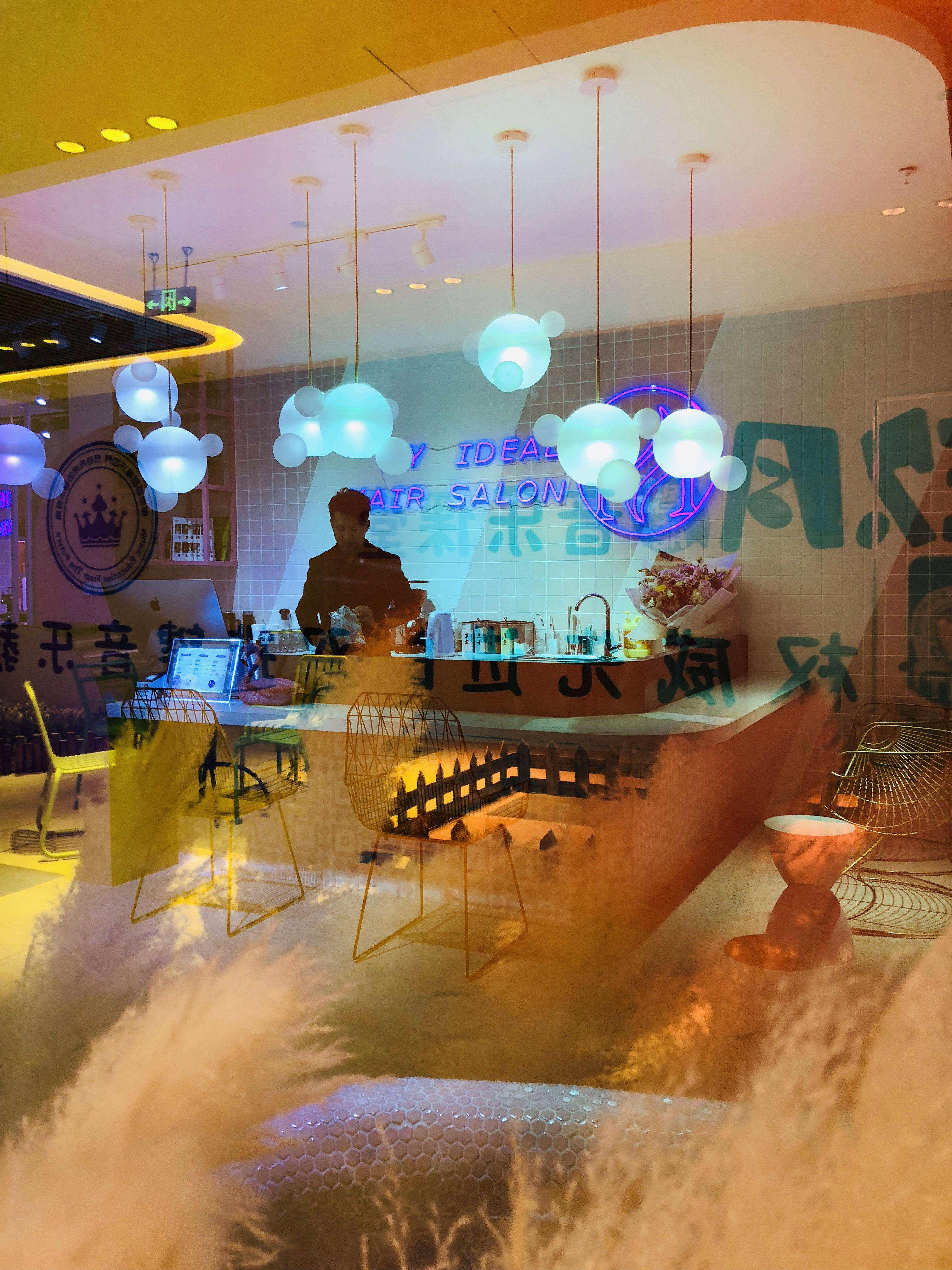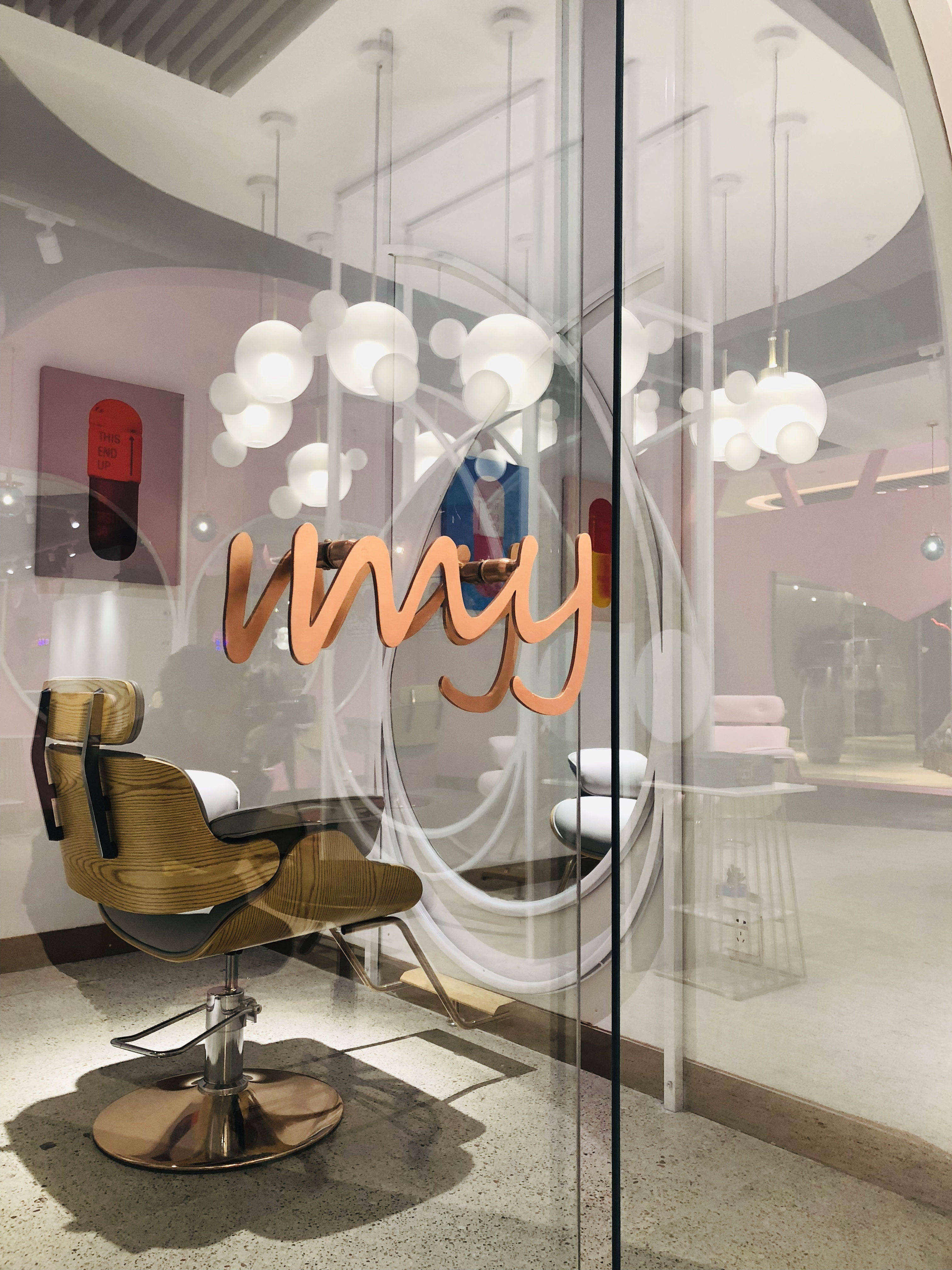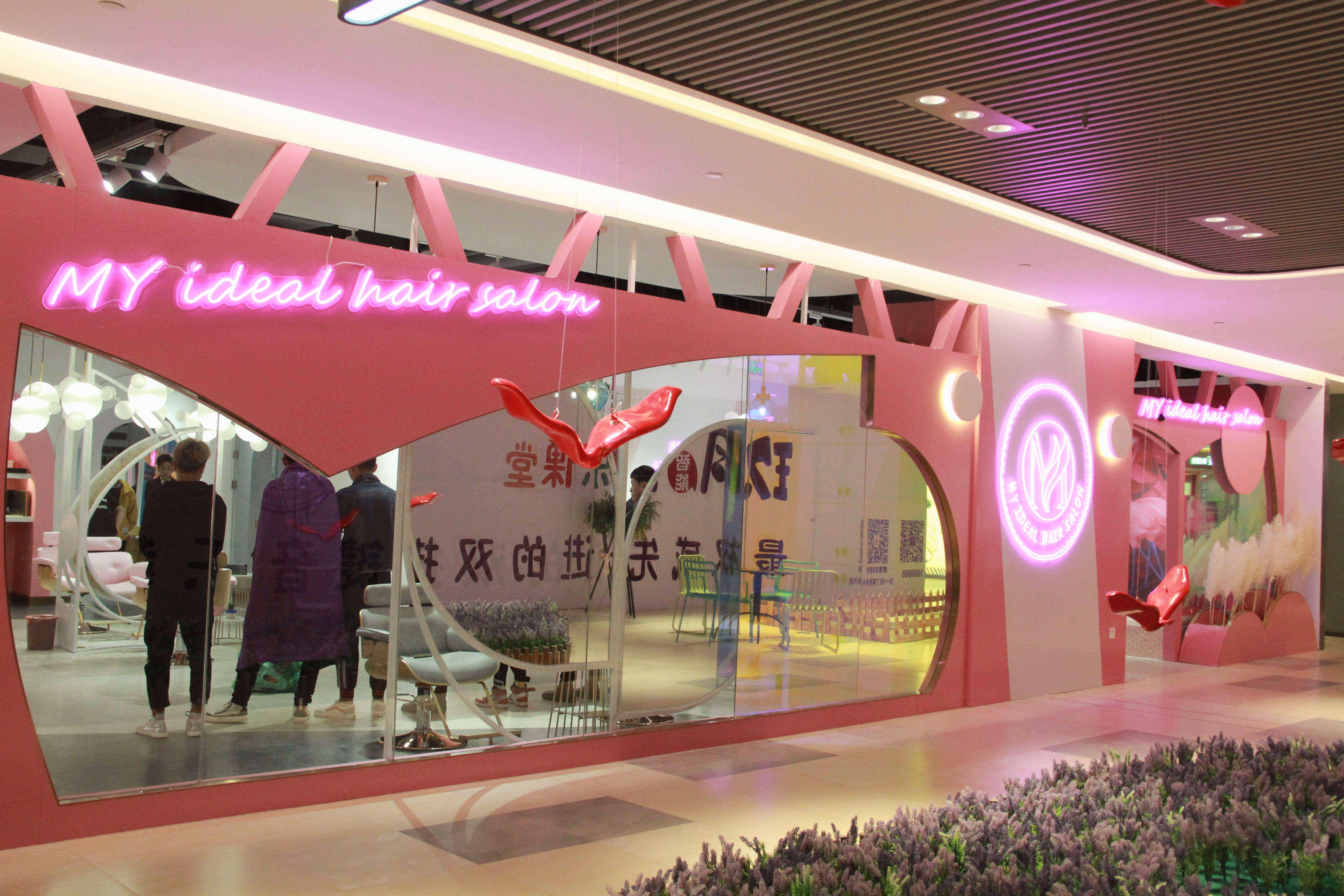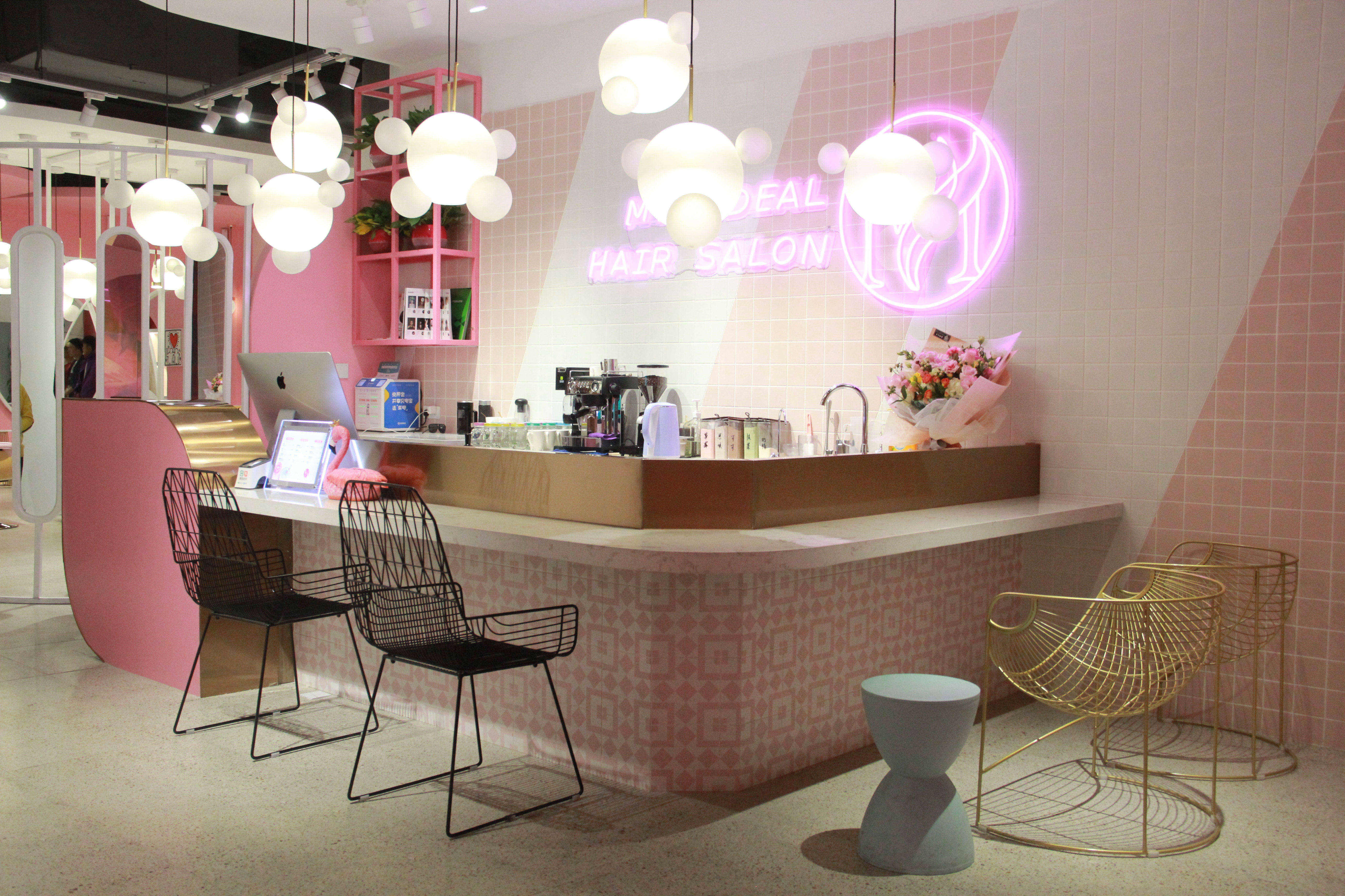 空间意境:设计之初我以店名“MY”的手绘连笔形态联想到花瓣,故此花瓣成为了本案设计围绕的核心。从店面外立面的造型到每一个剪发位的镜面,空间里处处可见这样的元素,俏皮可爱同时也增加了店面形象的辨识度。除了花瓣的元素,空间内我还大量的运用了粉色和白色的搭配来烘托少女心的氛围,搭配上空中像泡泡一样的灯以及玻璃镭射放光的质感,从而让空间的梦幻感增加