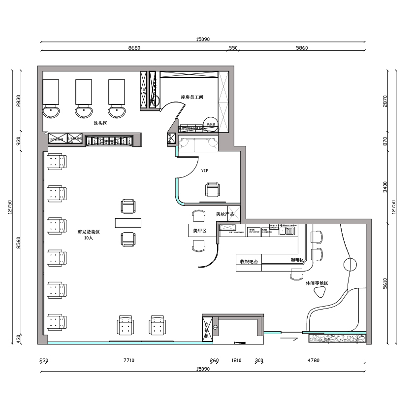 空间布局:本案为环形动线,所有的剪发位环绕空间排布让整个店面看起来有条不紊。同时在空间的中心位置我们又单独设立了两个VIP的位置,通过与后期的氛围设计,让这两个位置的顾客可以成为视觉中心。