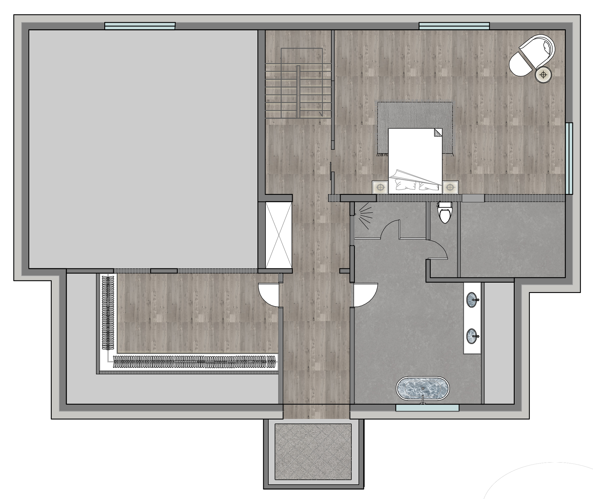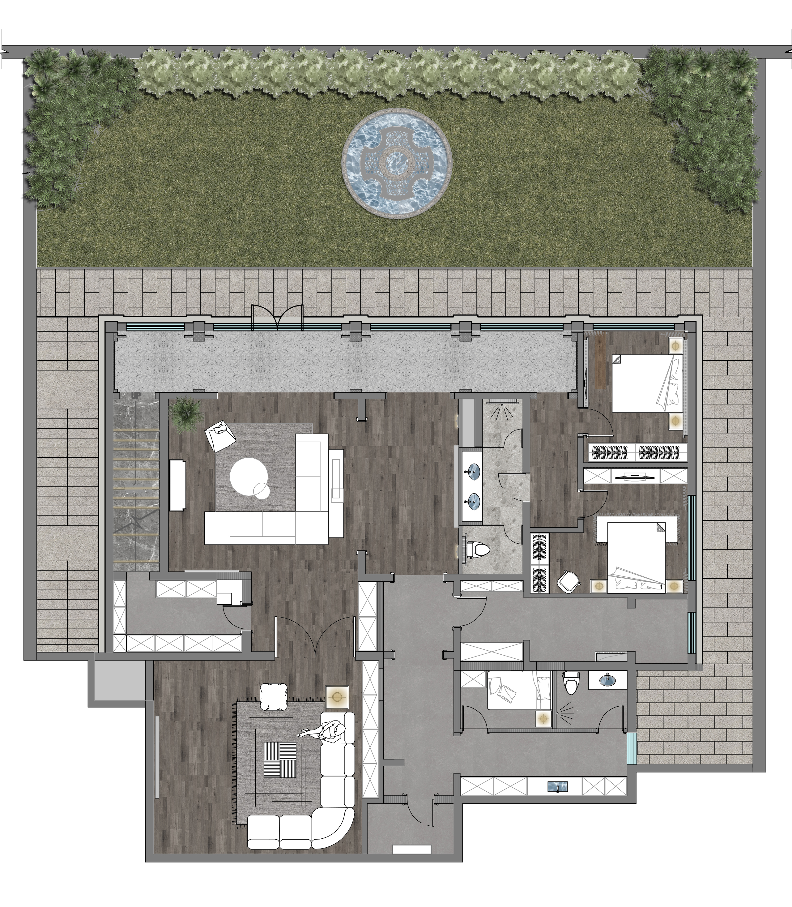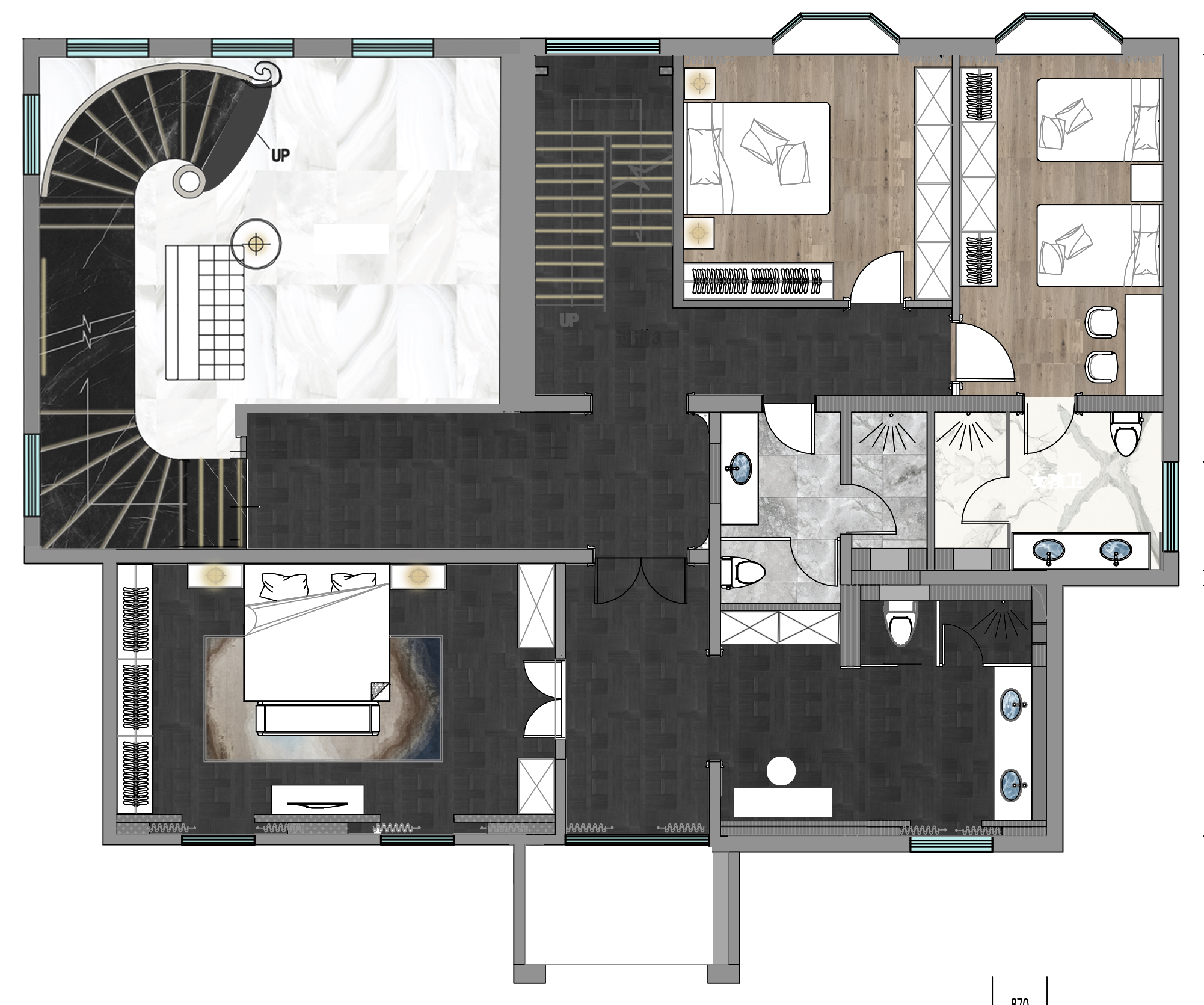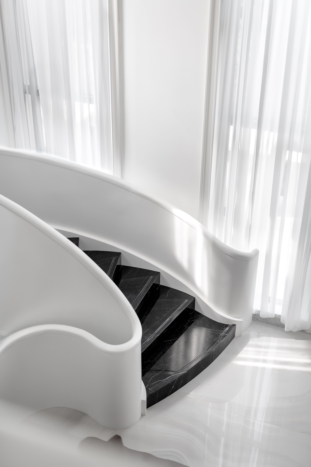 空间布局:空间整体布局更注重于开放空间的使用和呈现,大量开放空间的使用更有利于人在空间与人的交流,取消了传统一层大厅的设计,而是使用带有变化的楼梯来联动生活空间与公共空间的层叠关系,同时也更拉近人与人、人与空间的距离感。让整体空间更能释放出空间的强大气场。