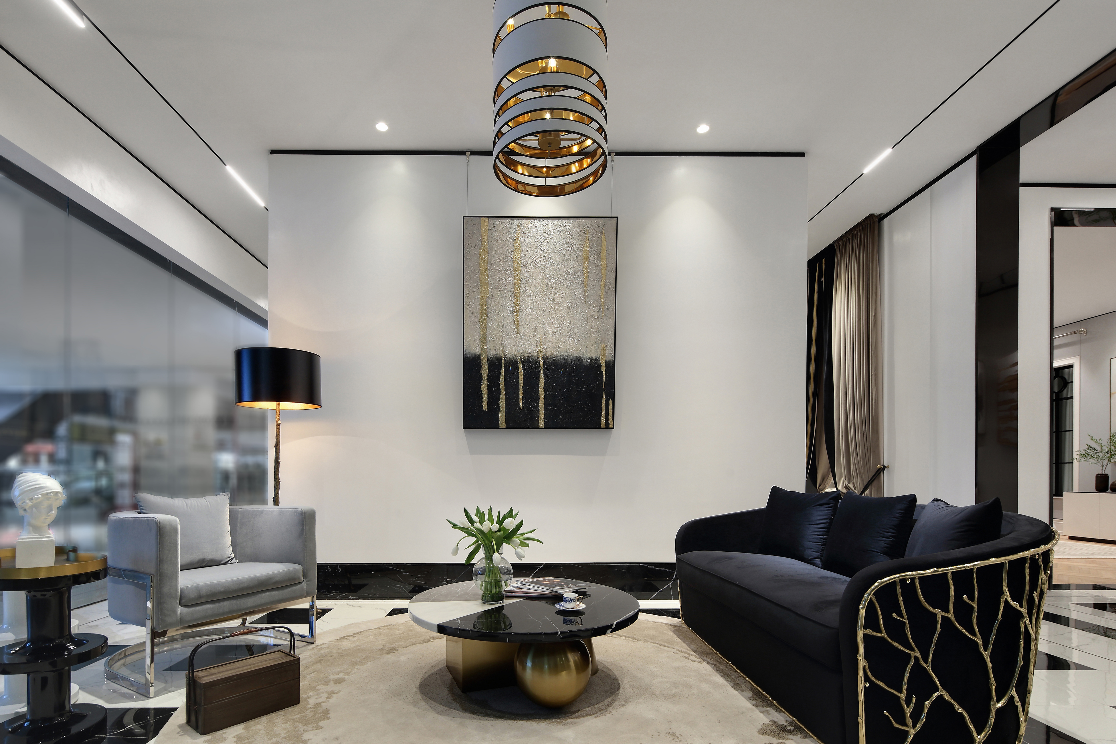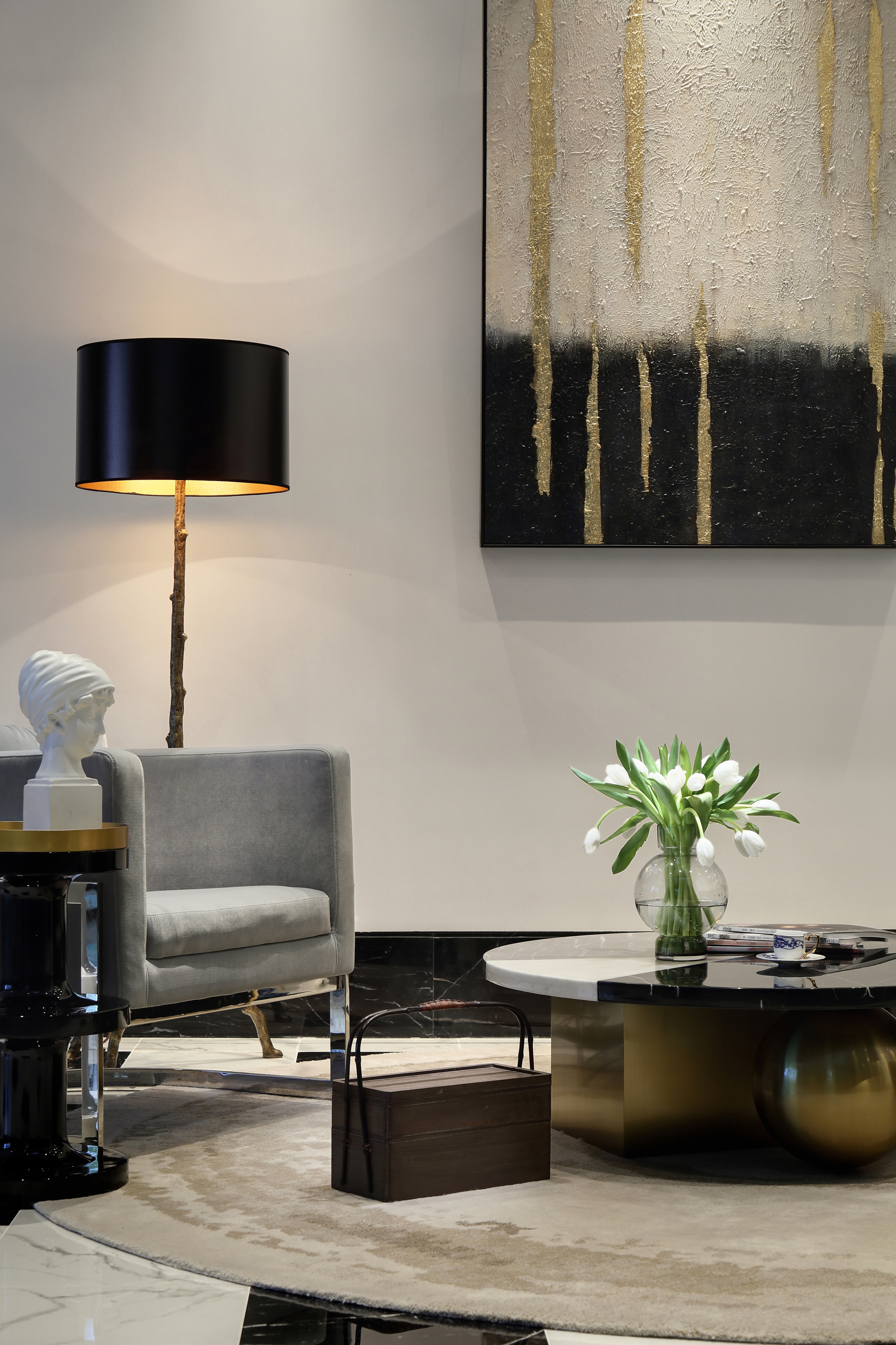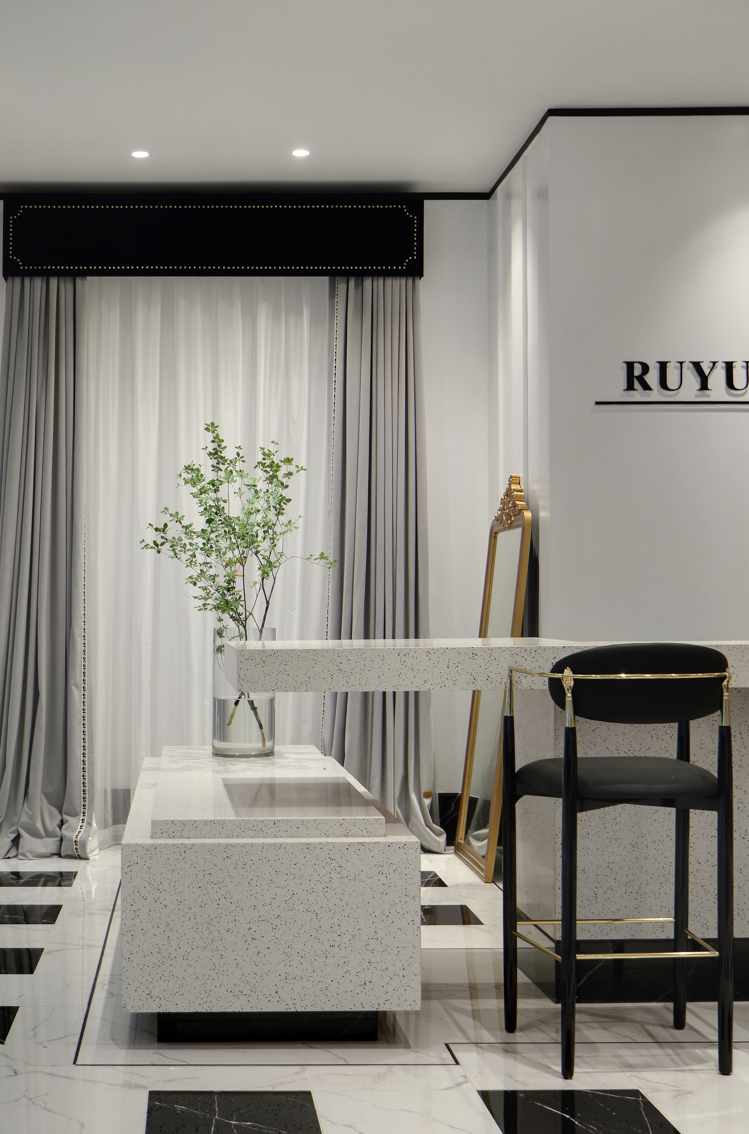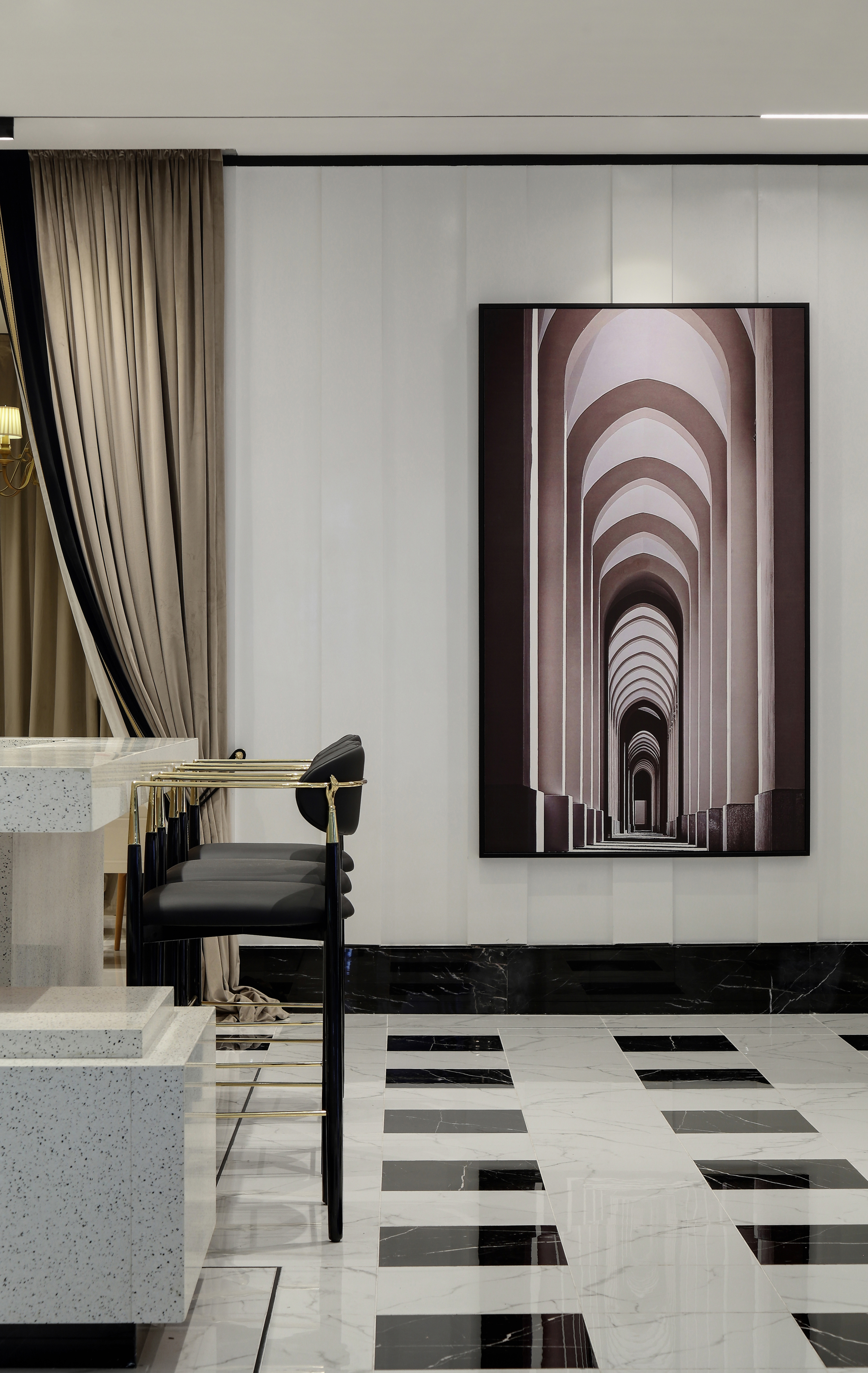设计选材:优雅、舒适以及不露圭角的奢华是空间所要传达给人们的感受,坚硬的大理石和金属永远擅长表达奢华和现代感。为了避免空间过于冷淡或浮夸,所以选择丝绒布料穿插其中,在坚硬和温暖中获得平衡。材质、肌理与色泽交织对照,一切都恰如其分,却又灵活可塑。
