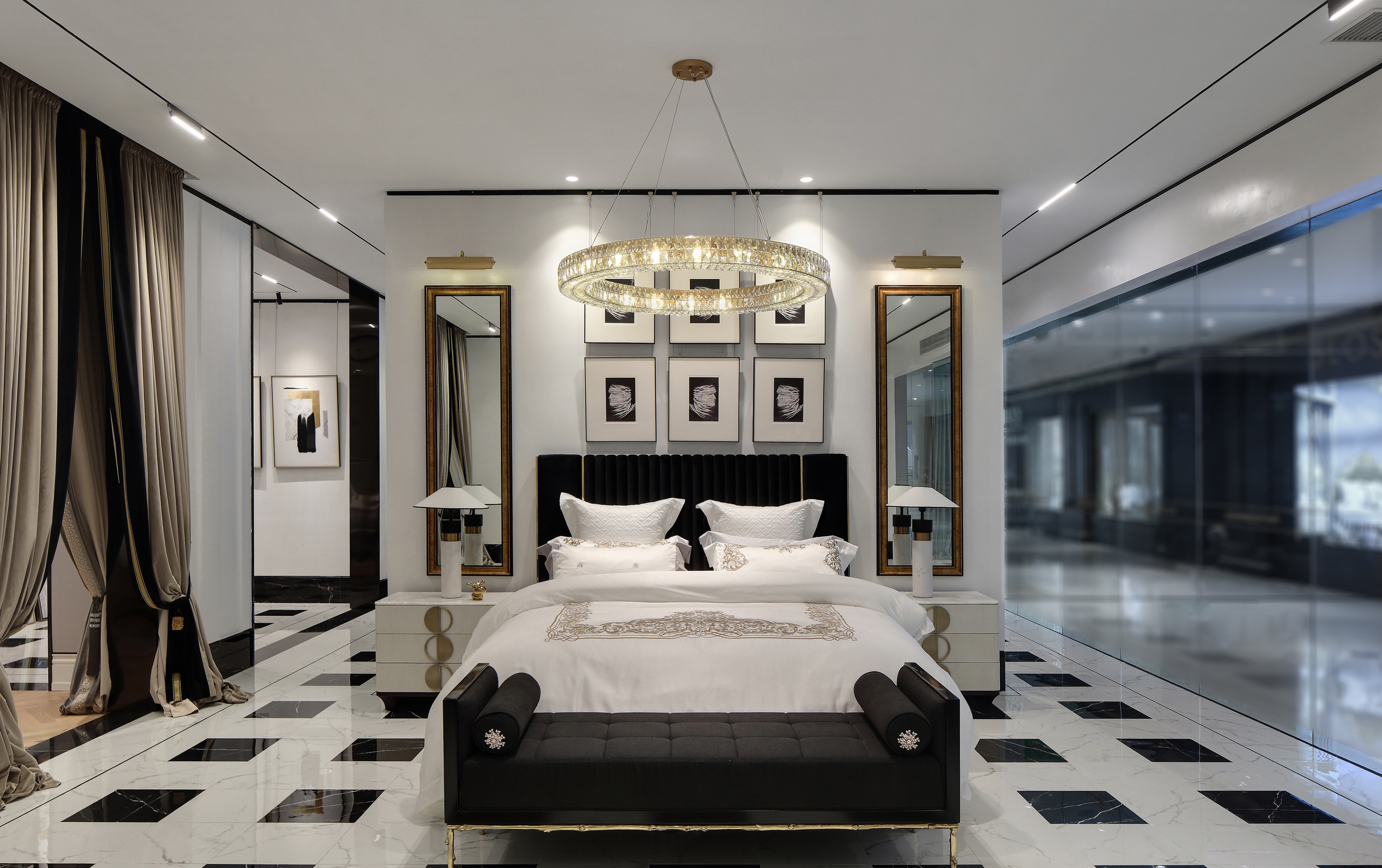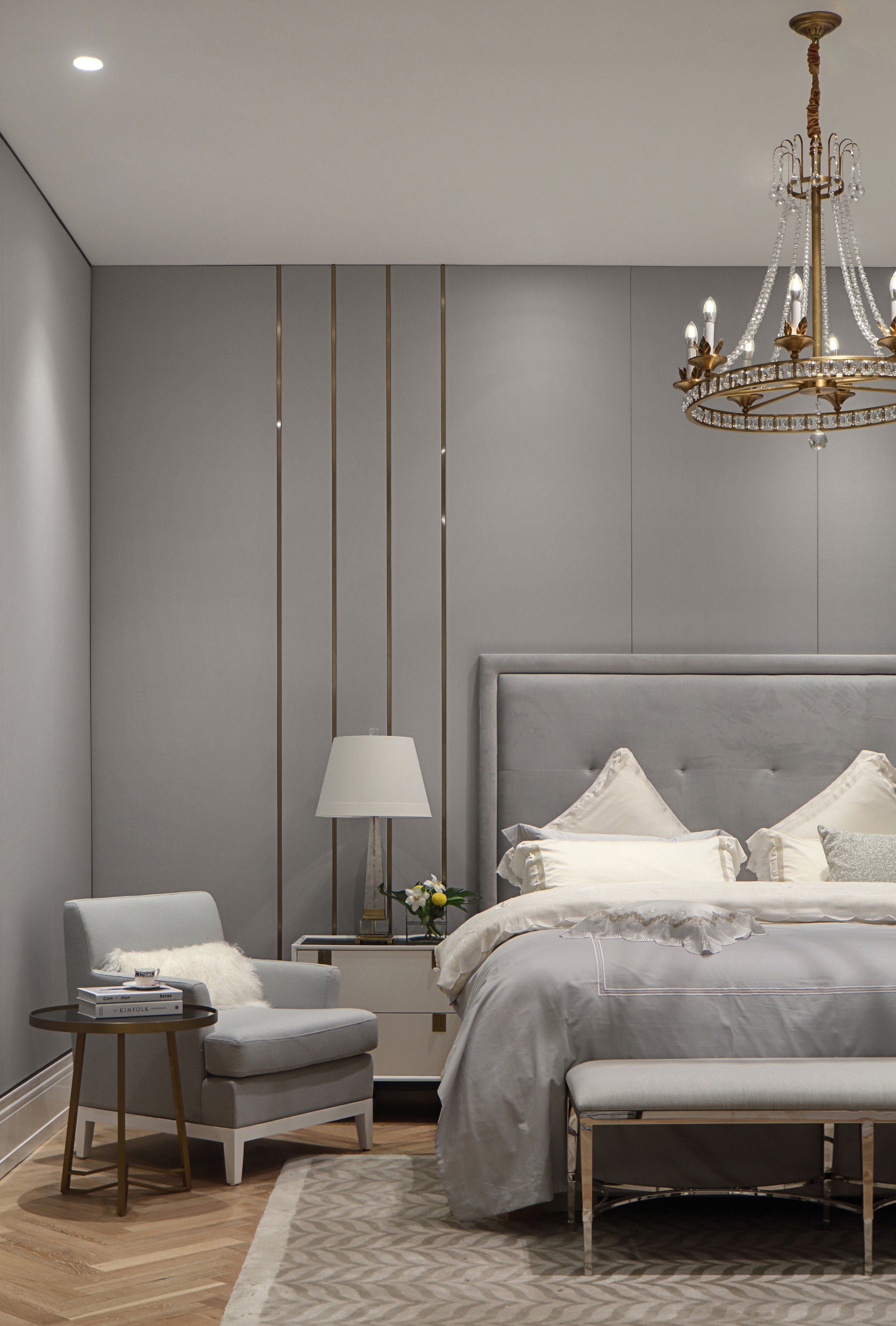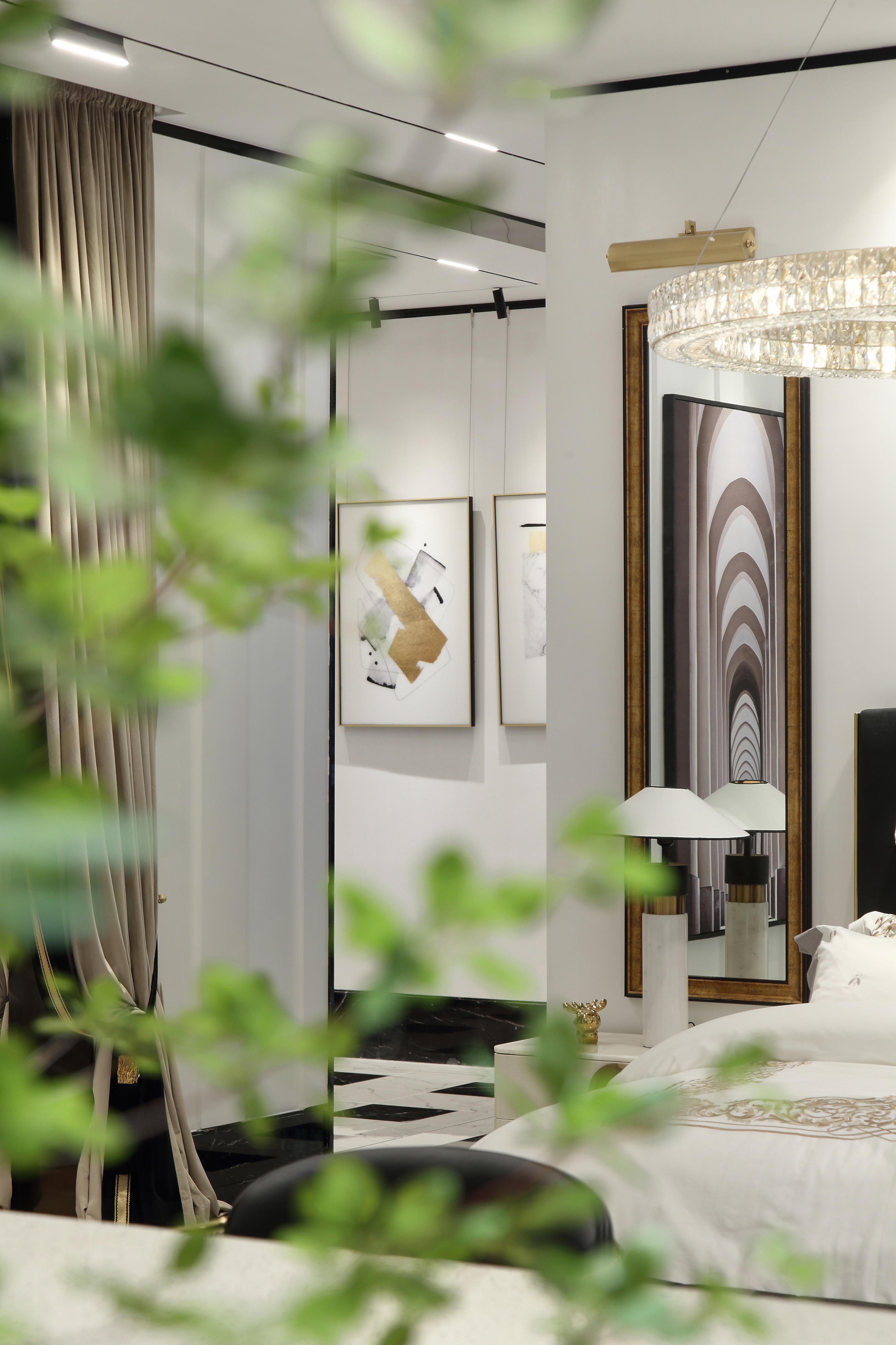 设计选材:优雅、舒适以及不露圭角的奢华是空间所要传达给人们的感受,坚硬的大理石和金属永远擅长表达奢华和现代感。为了避免空间过于冷淡或浮夸,所以选择丝绒布料穿插其中,在坚硬和温暖中获得平衡。材质、肌理与色泽交织对照,一切都恰如其分,却又灵活可塑。