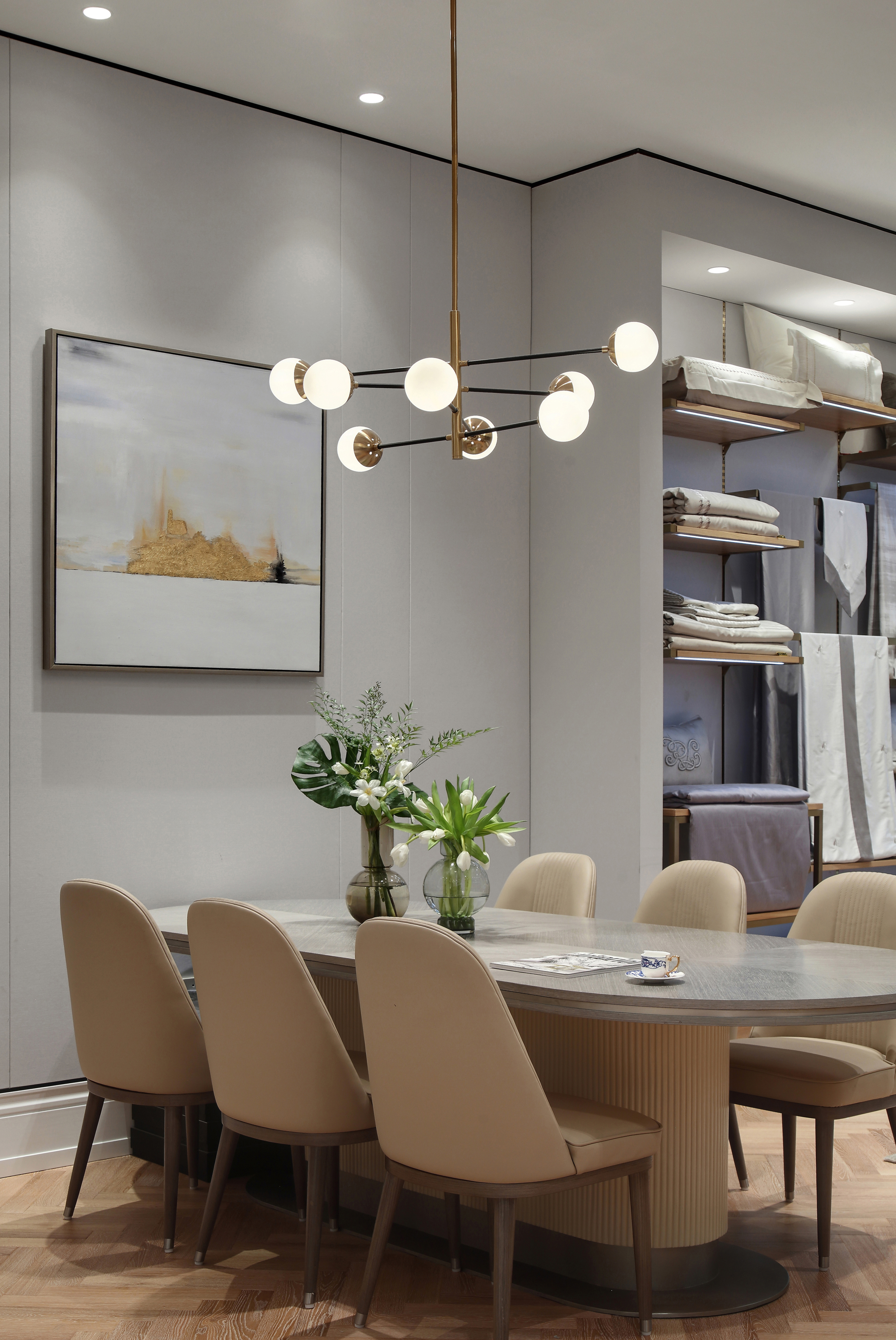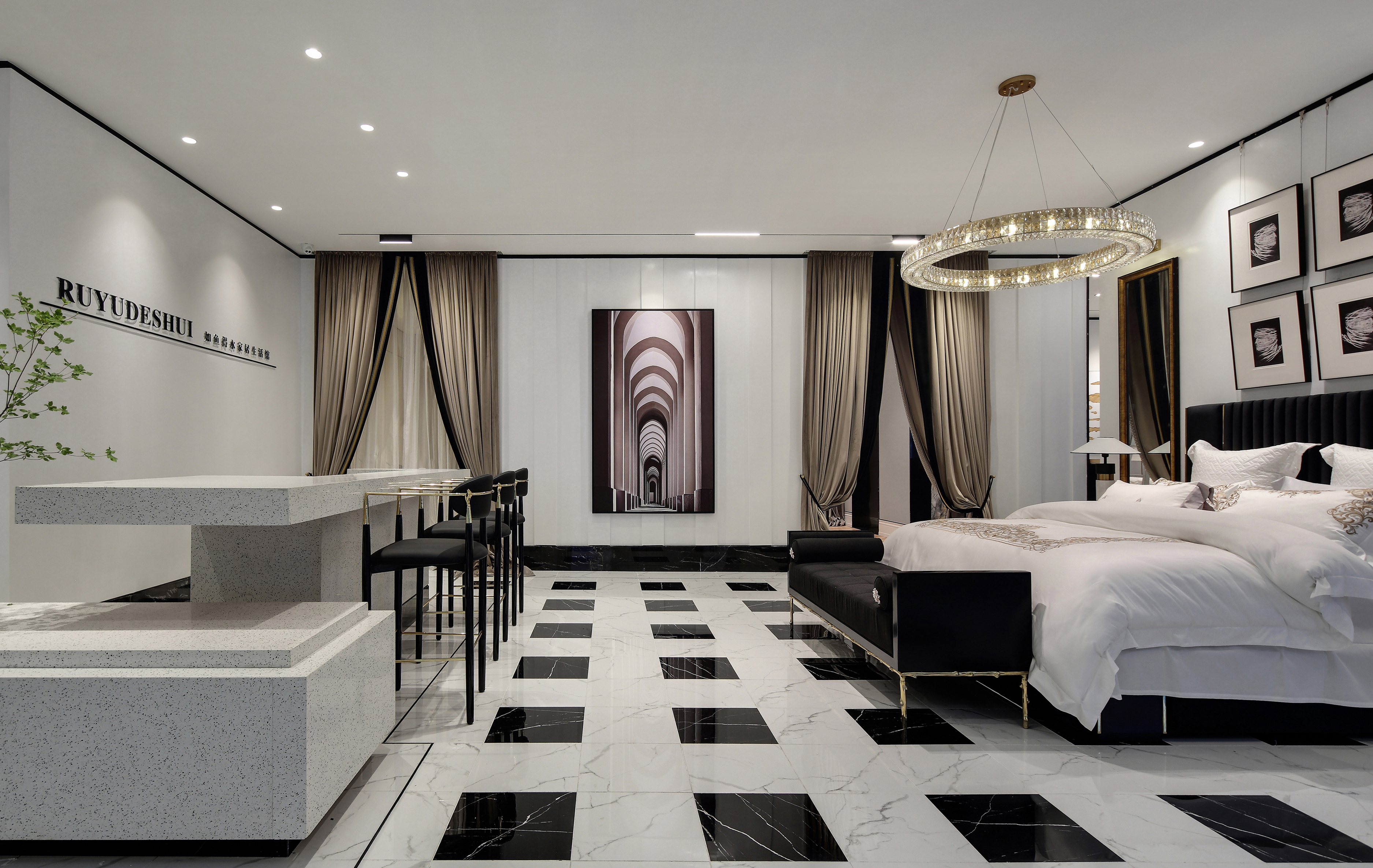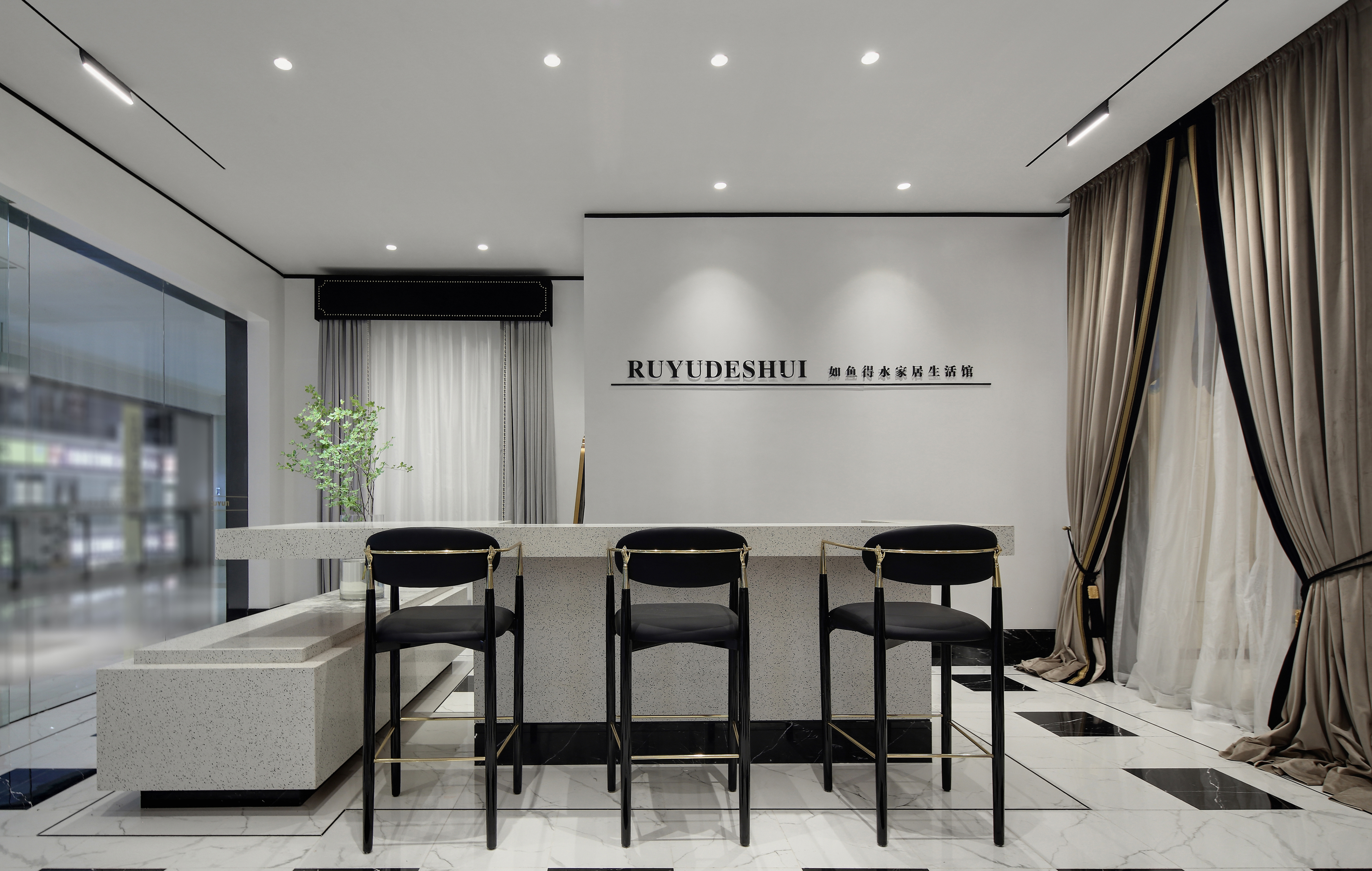项目定位:这次的改造项目位于南京金盛国家家居,是南京领军品牌软装馆如鱼得水店铺的升级改造。随着消费群体和消费个性化的转变,老店的欧式风格已经不能满足现在市场需求。我们设计的出发点不光是空间的美感,还需要考虑商家与消费者的关系,如何给消费者提供与众不同的视觉感受和消费体验也是重中之重。如鱼得水品牌走高端路线,时尚简约、简单舒适、纯正风范。“流行稍纵即逝,风格永存”是品牌背后的指导力量。