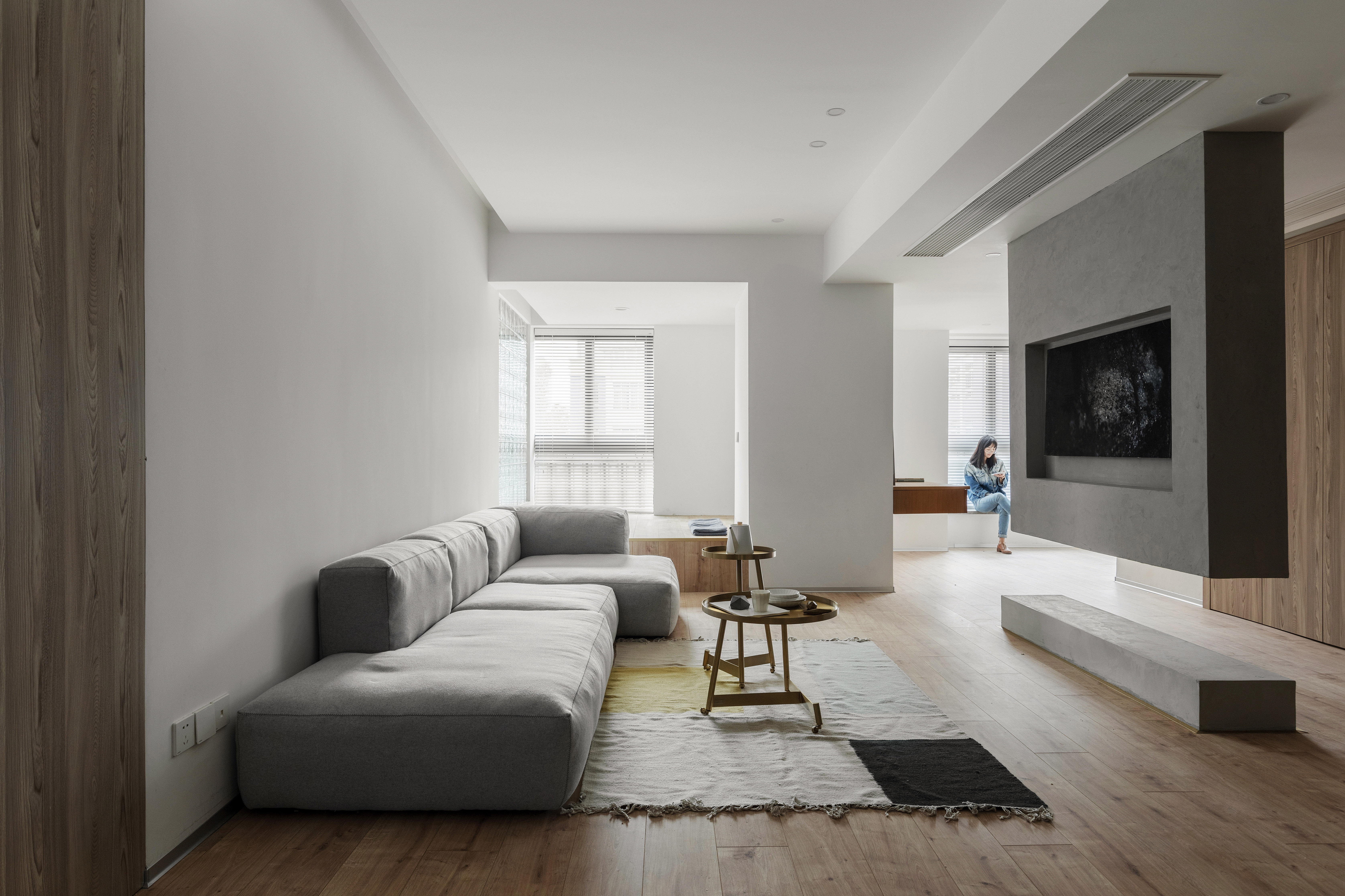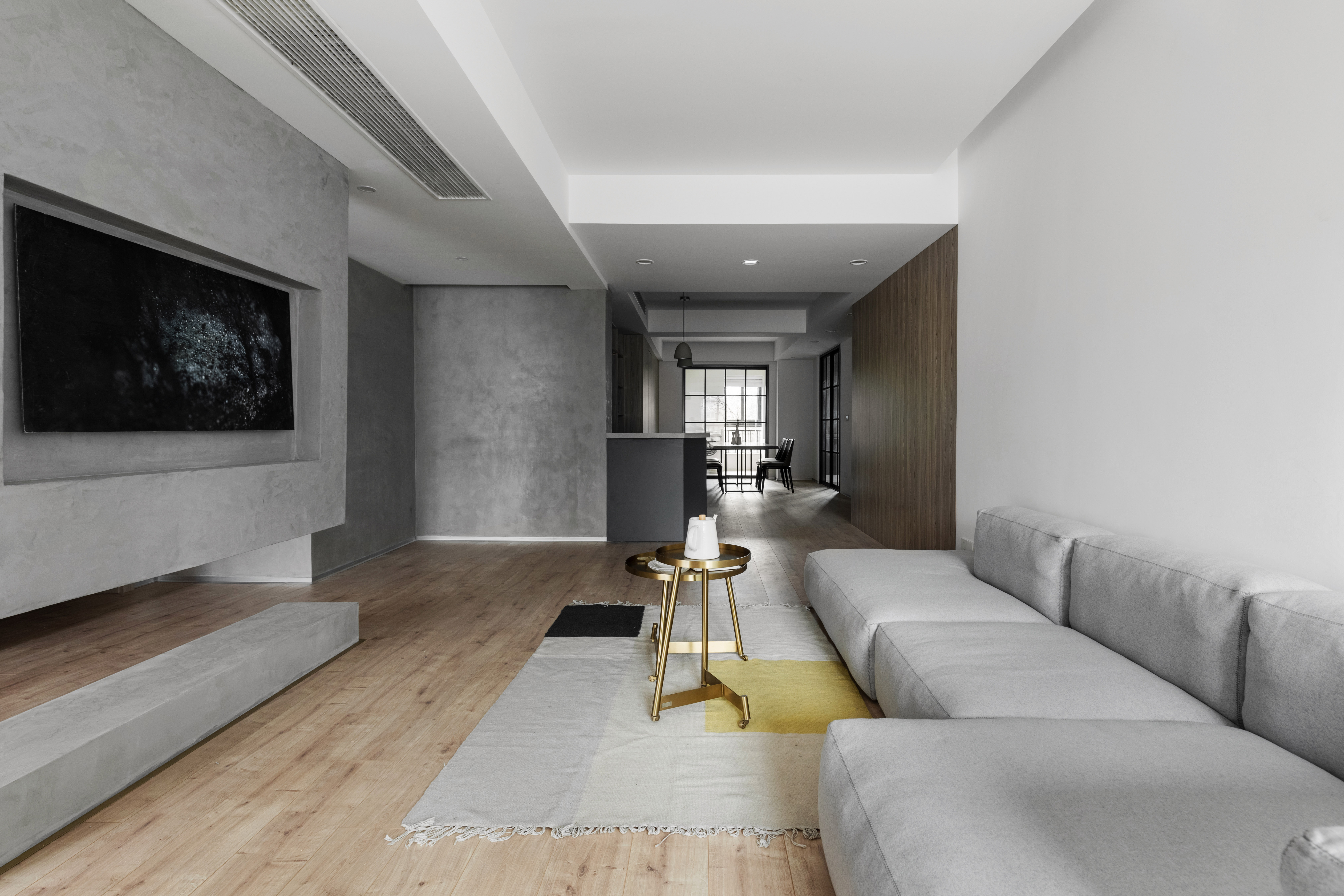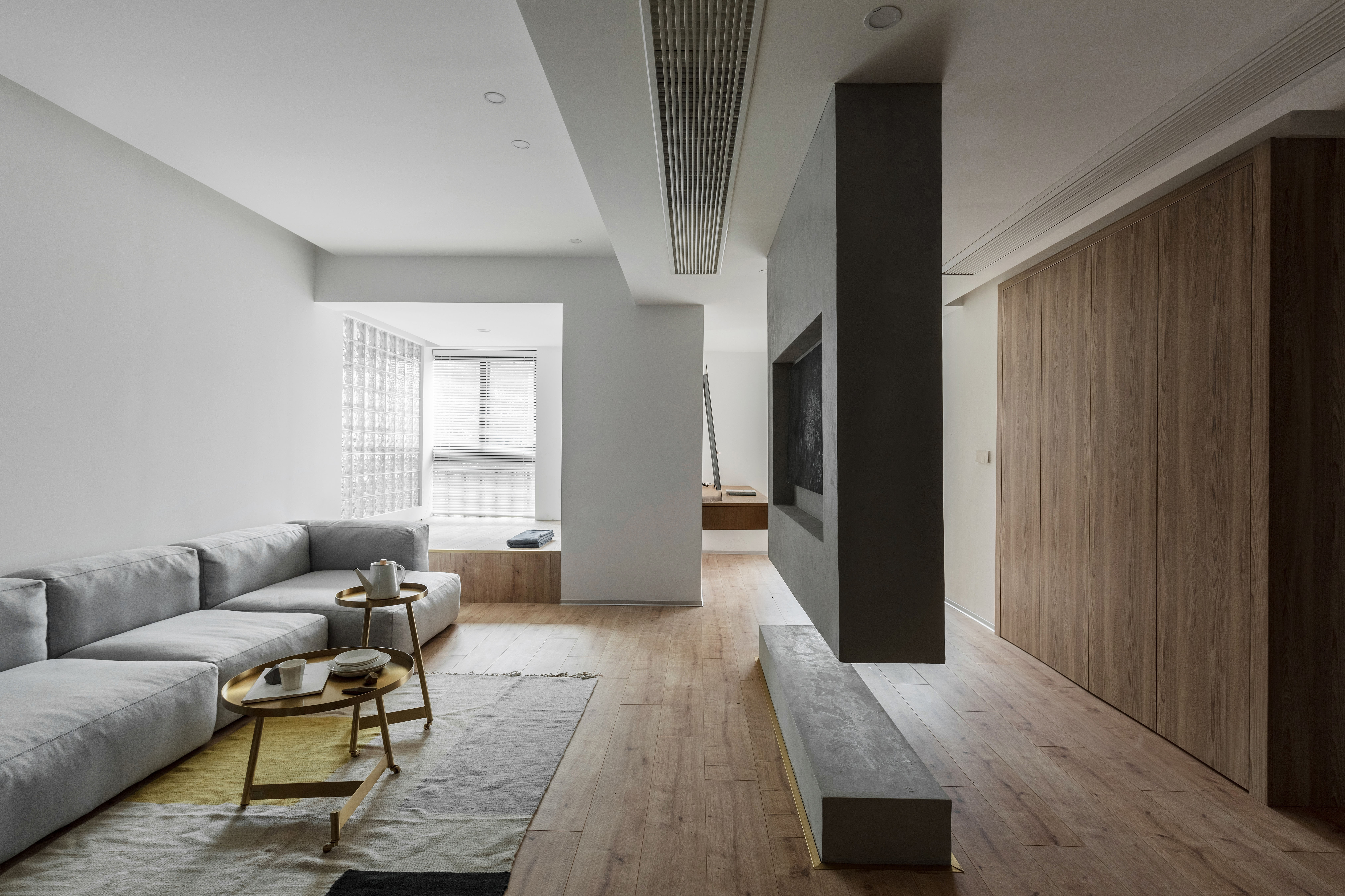 电视墙采用了装置的手法,上部从顶面往下生长,起到遮挡进门视线的作用,靠下部悬空又让其显得轻盈不显拥堵,围绕电视墙的洄游动线自由开阔。主卧采用隐形门,延伸的墙板分割了沙发背景墙,简单的材质对比丰富整个立面。 -