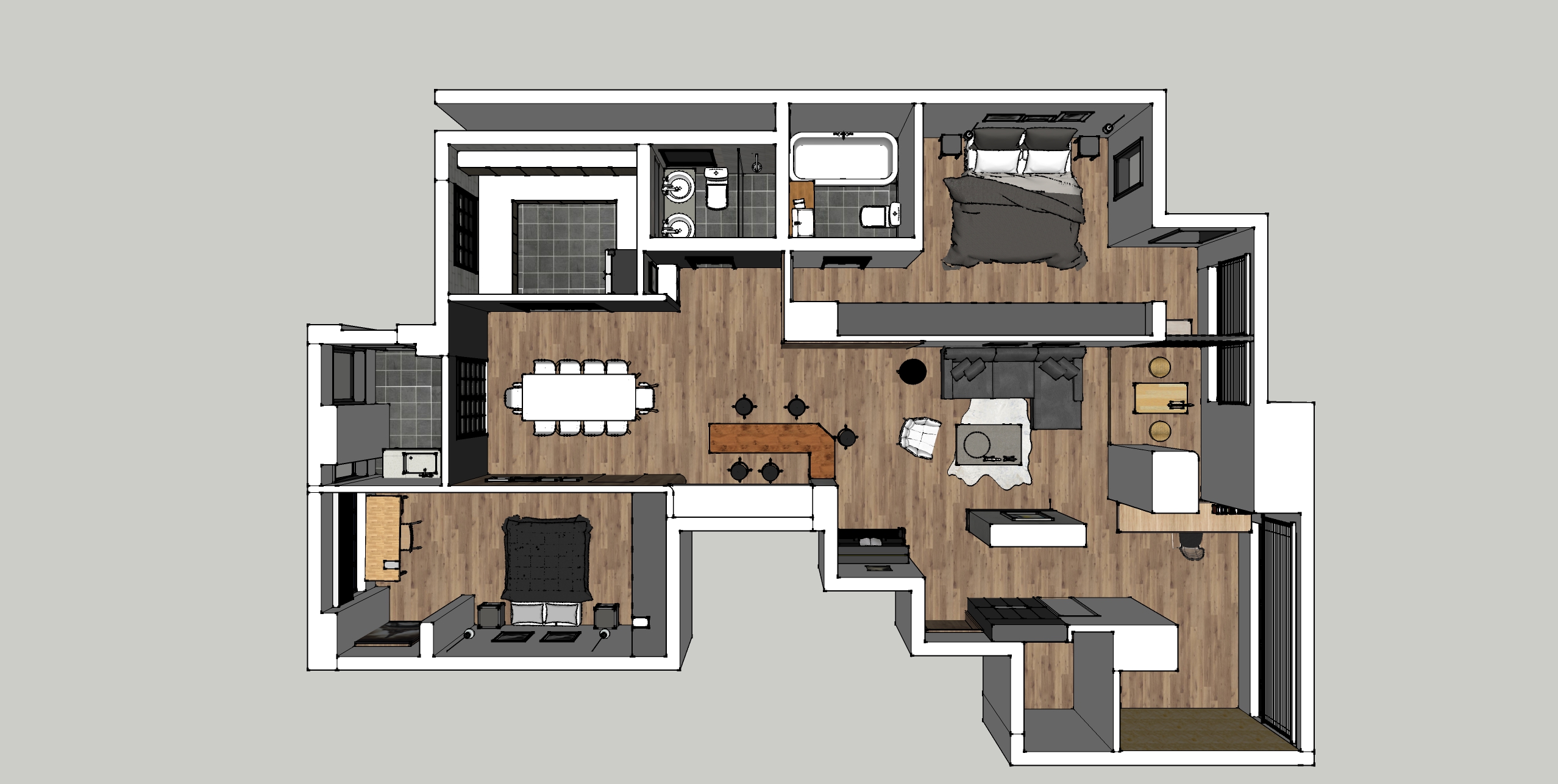 空间意境:此为屋主过年过节回乡省亲时居住的房屋,大约一年的居住时长在1-2个月,居住人口为一家3口,但考虑到时常会有亲朋好友到家里来聚会,因此大厨房和大公共区域是必不可少的,而卧室只需要满足居住的条件即可,在风格上希望简洁有质感同时易于打理。