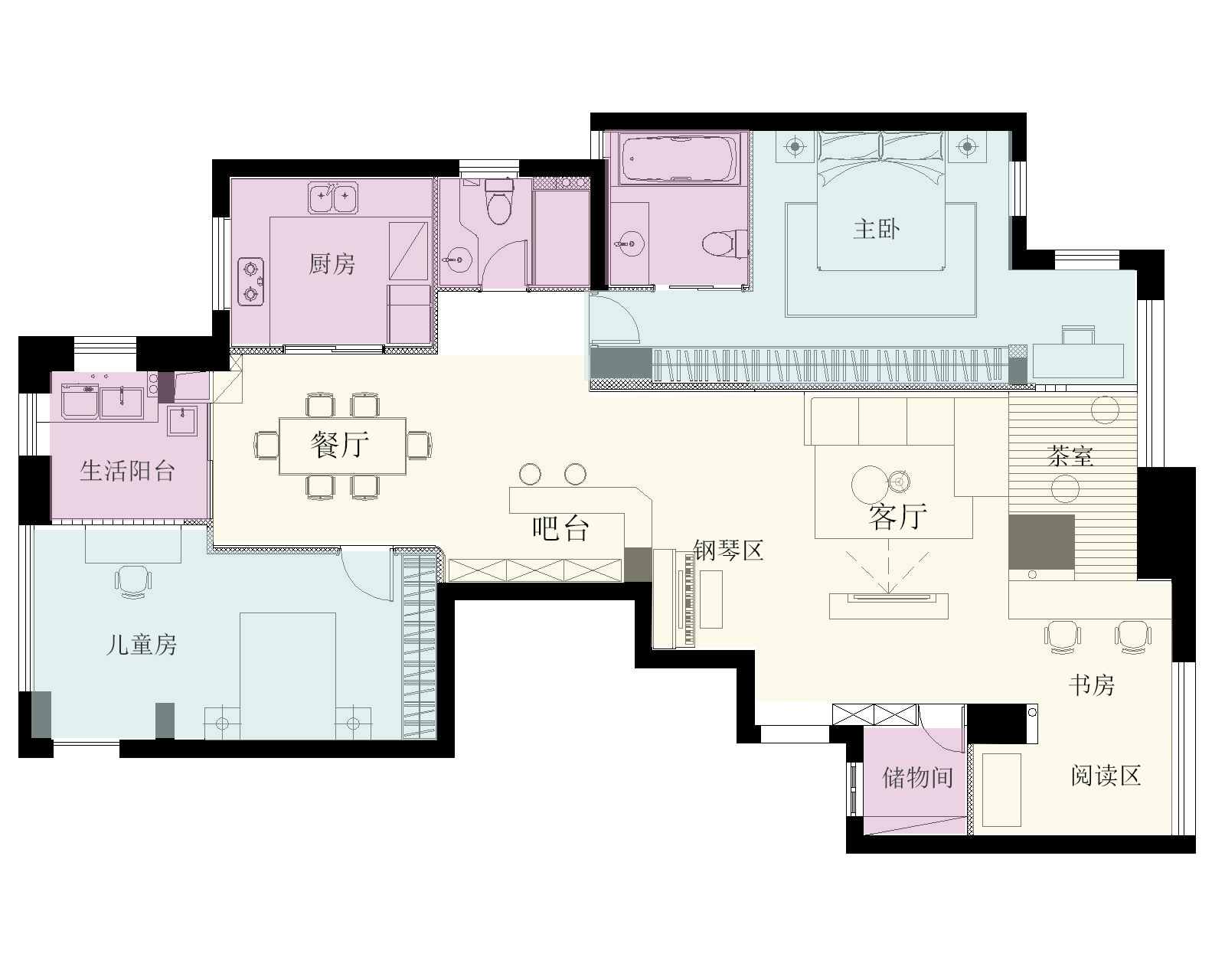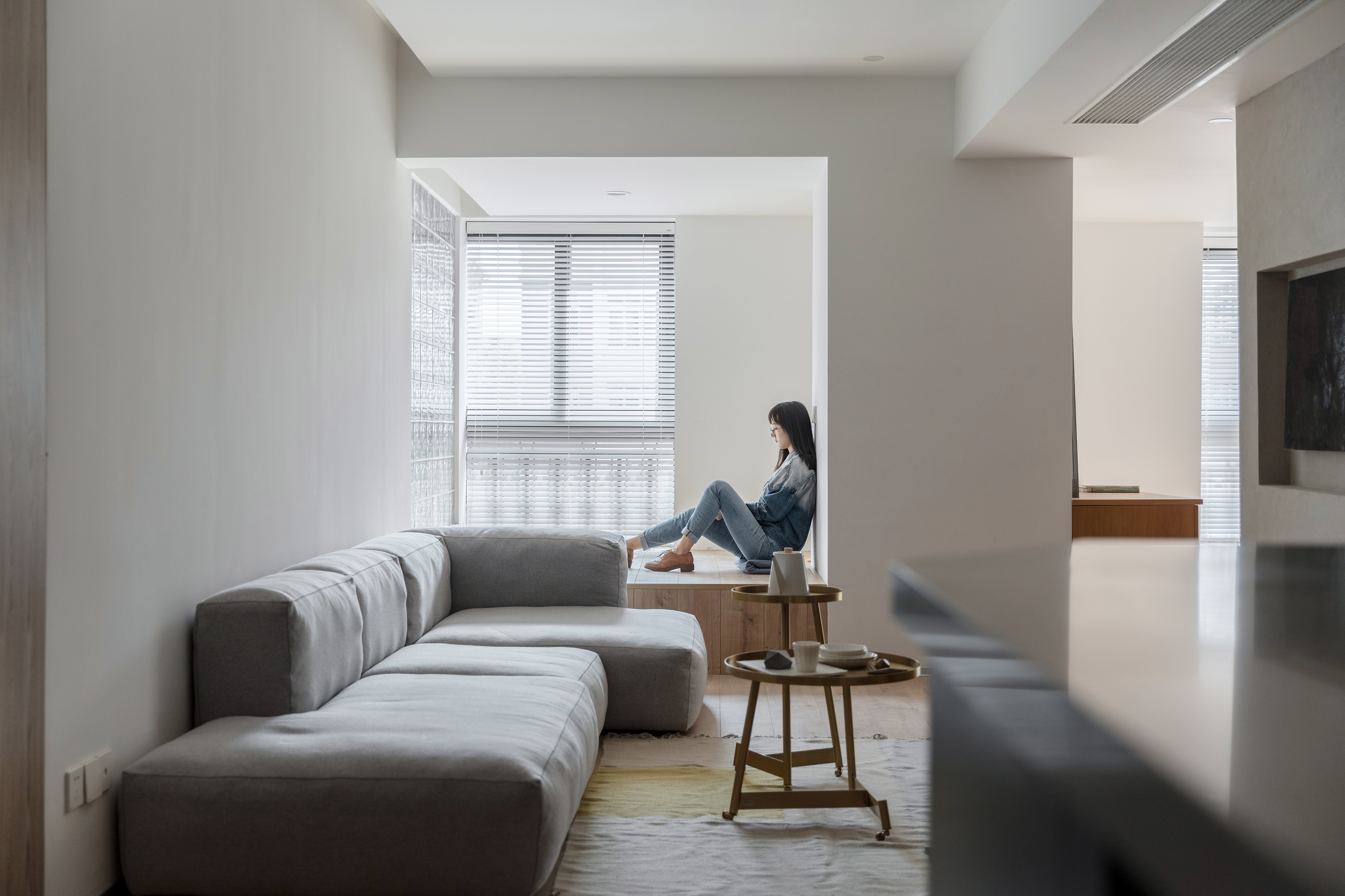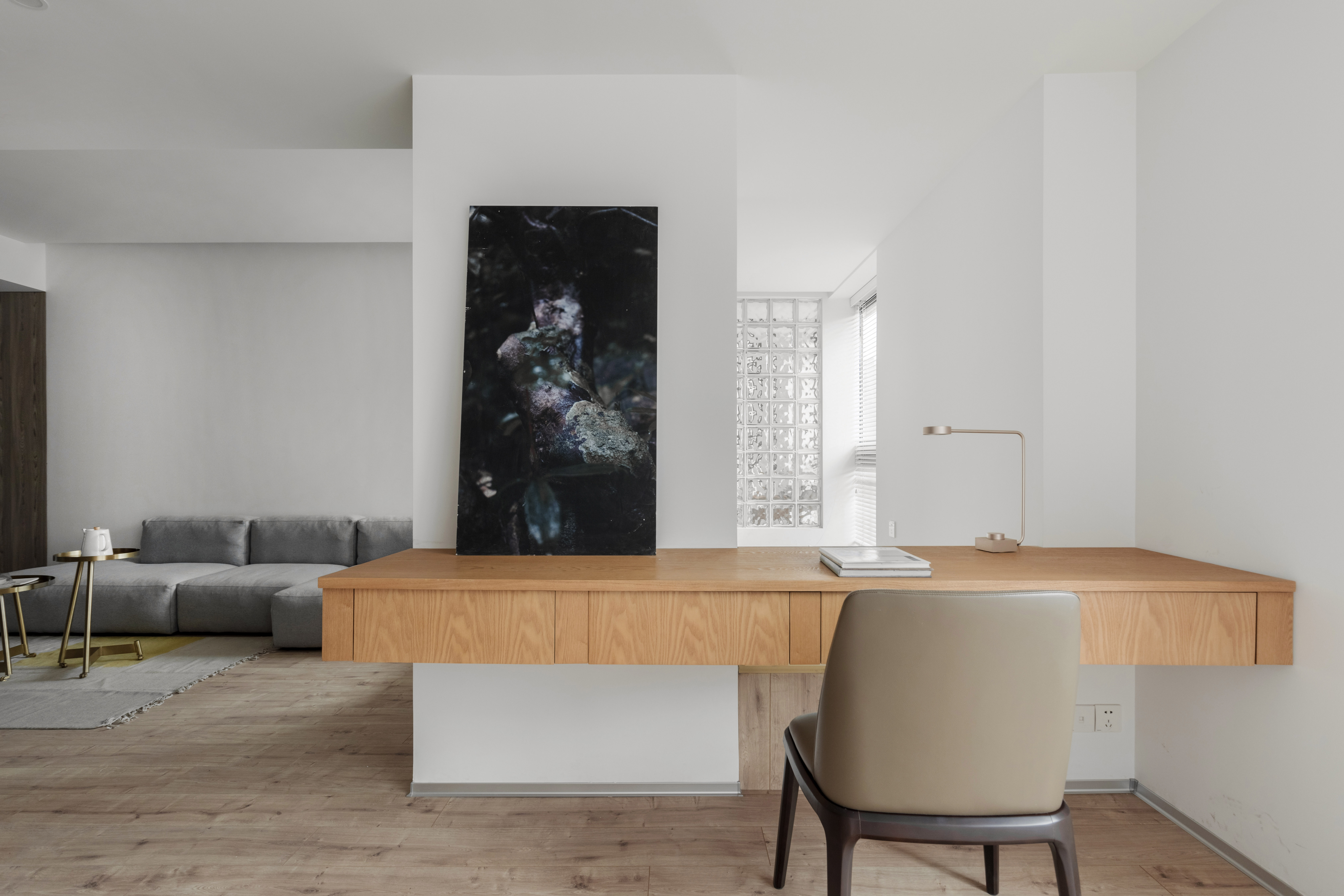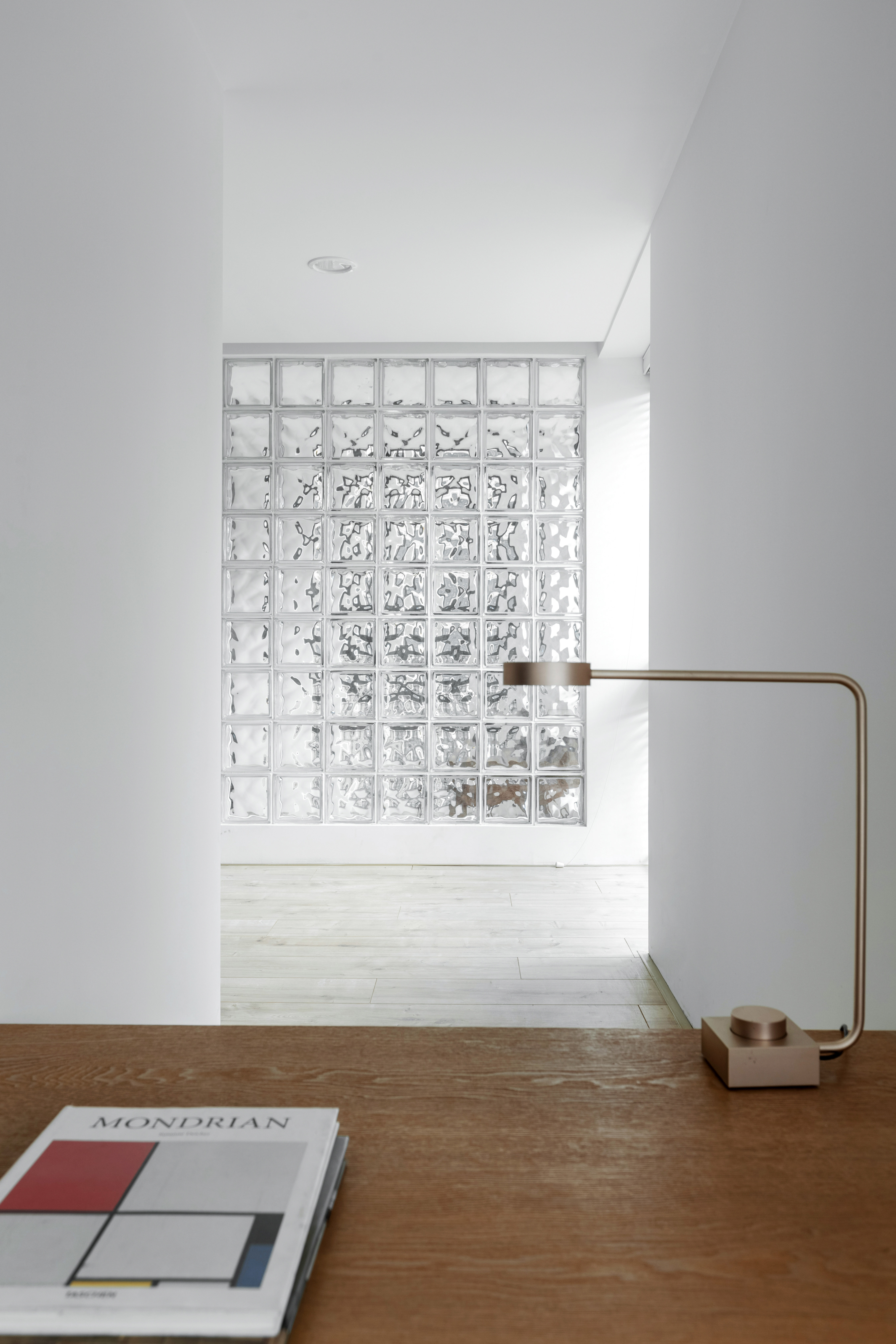 空间布局:长轴距进深带来的优点是空间连贯,浪费面积少,但是缺点却也很明显,中间部位的采光势必会很弱,为了解决这个问题我们将茶室靠主卧墙面采用了玻璃砖墙作为隔断,使得两个空间不用凿壁也能借光。另外所有靠窗区域的墙顶面均采用白色漆,让光线的二次反射可以均匀延伸。
