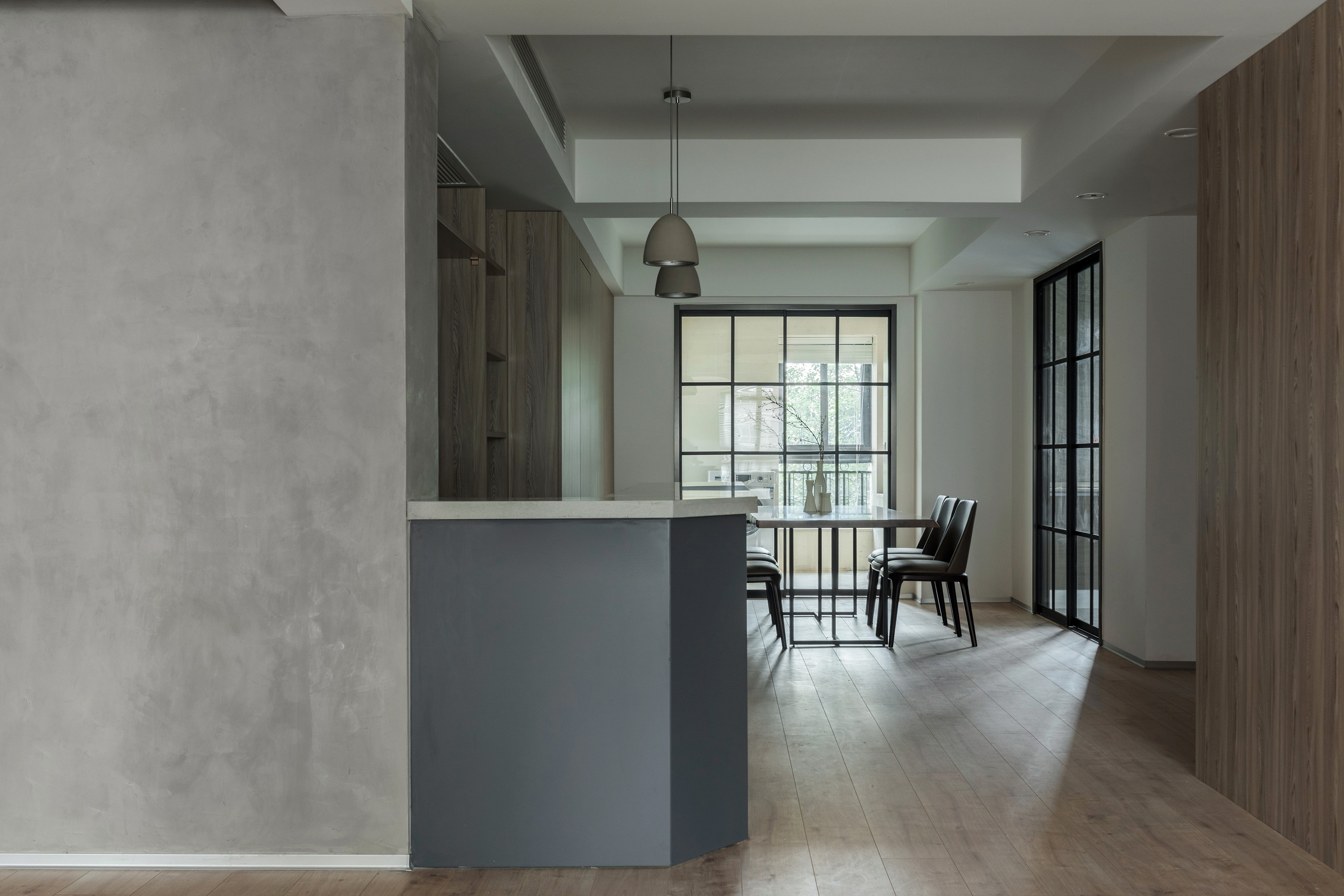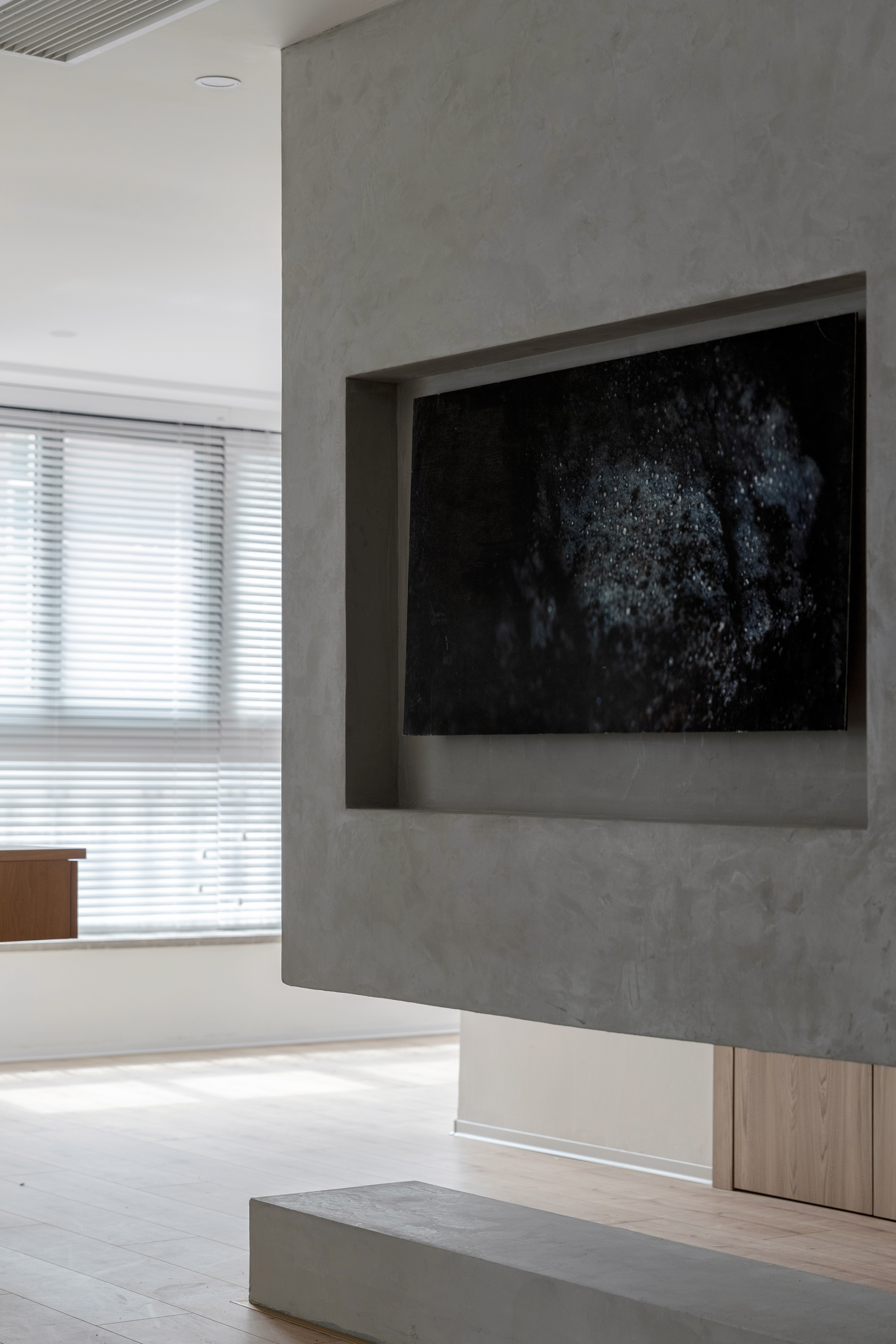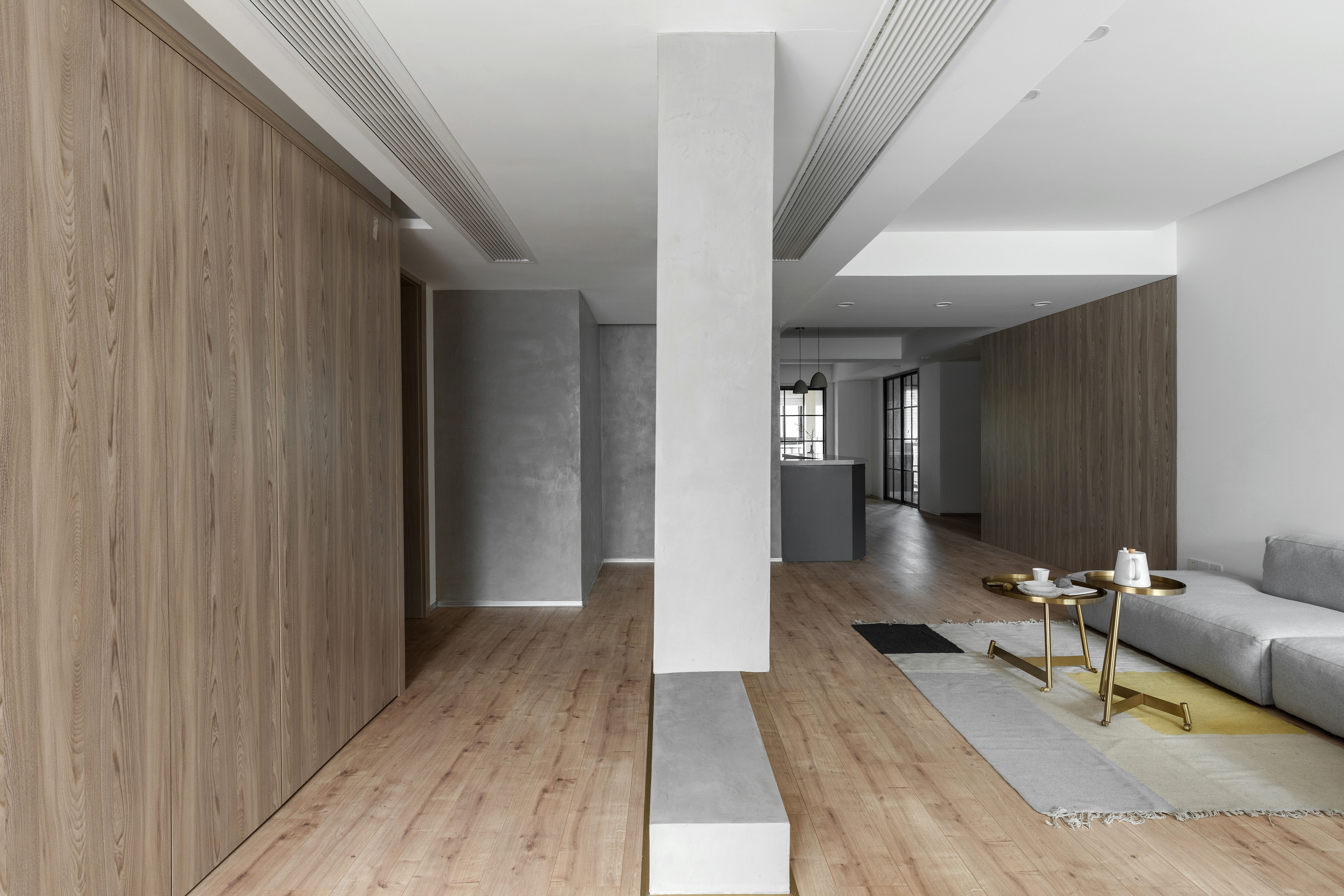 设计选材:整个开放区域我们选择了水泥漆、木饰面、白色乳胶漆作为主要材质穿插使用,使得联系与独立的主题延续。
