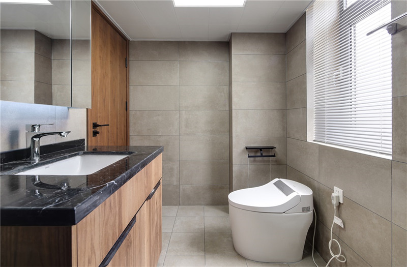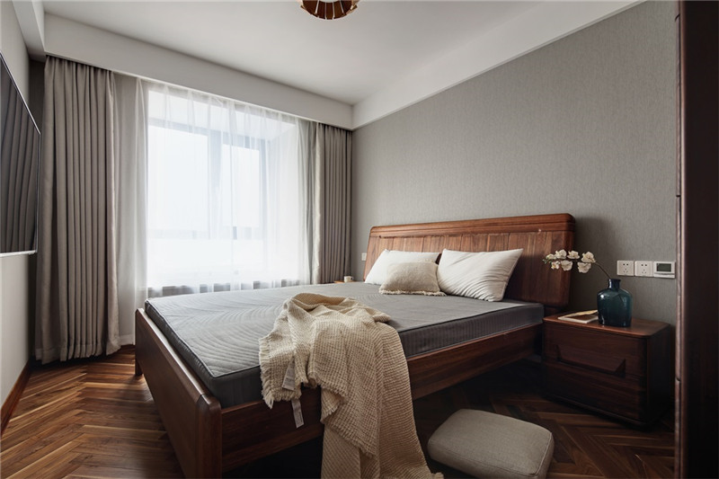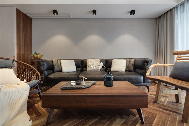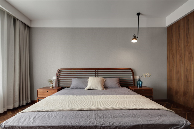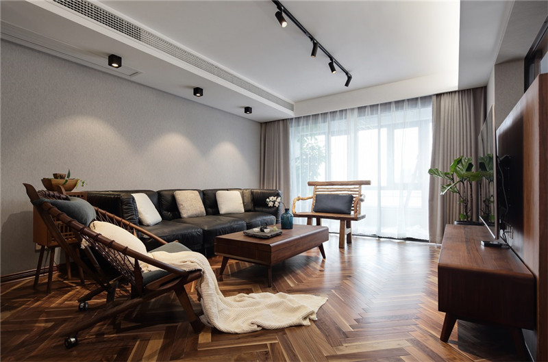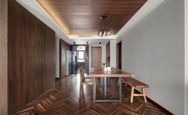 客厅与餐厅是一体化的设计,给人一种视觉上的通透感,鱼骨纹的木地板给空间带来一种流动的感,同时也与木饰面的墙壁和顶面的色彩产生的互动的氛围,客厅一角的那一抹绿植给空间带来了生机感。开放式的书房让屋里的空间格局不限与一处,使其学习办公时没有一点压抑感。简而雅的卧室让你在休息时心灵得以安放,享受着温馨的时 -
