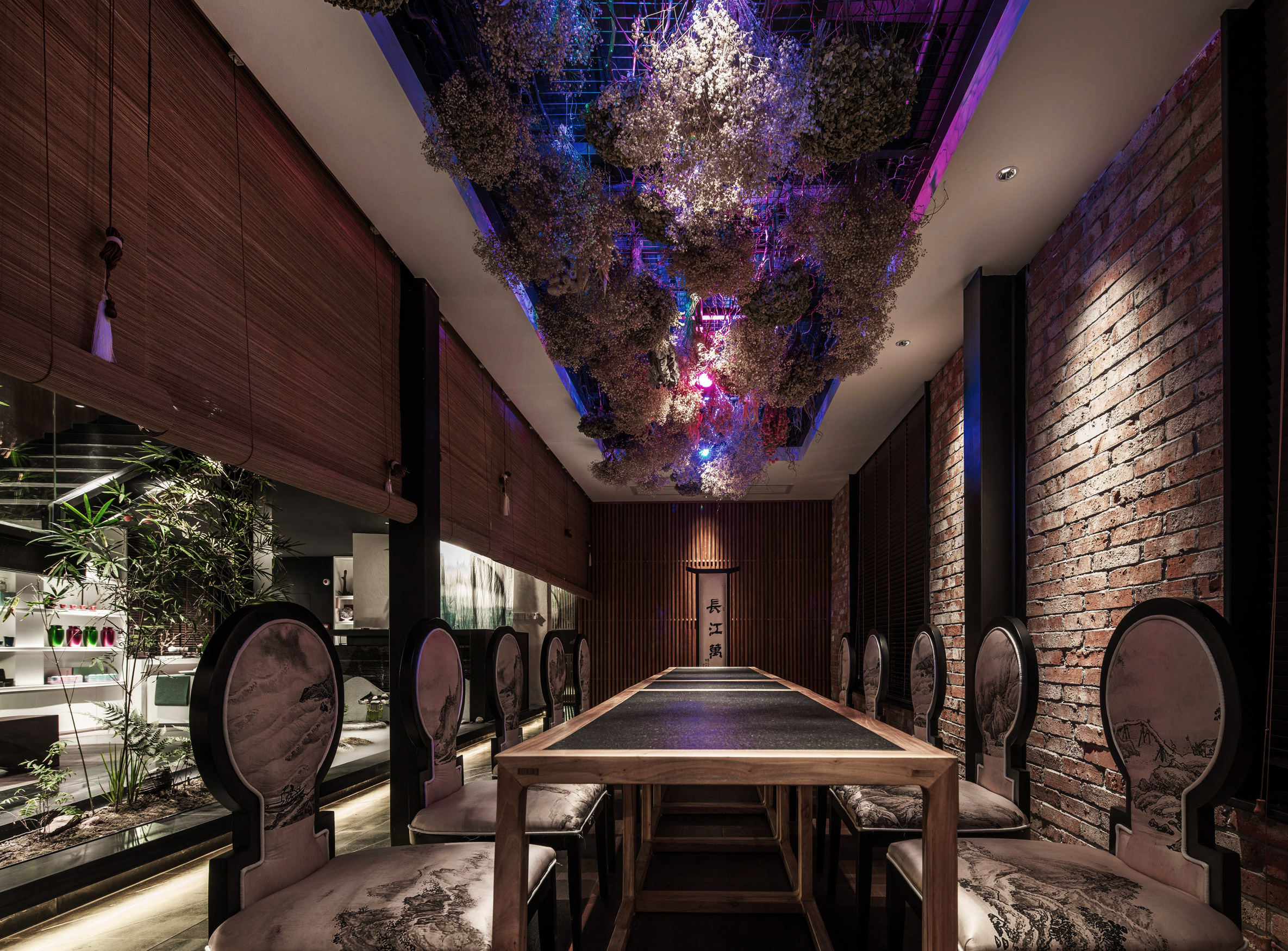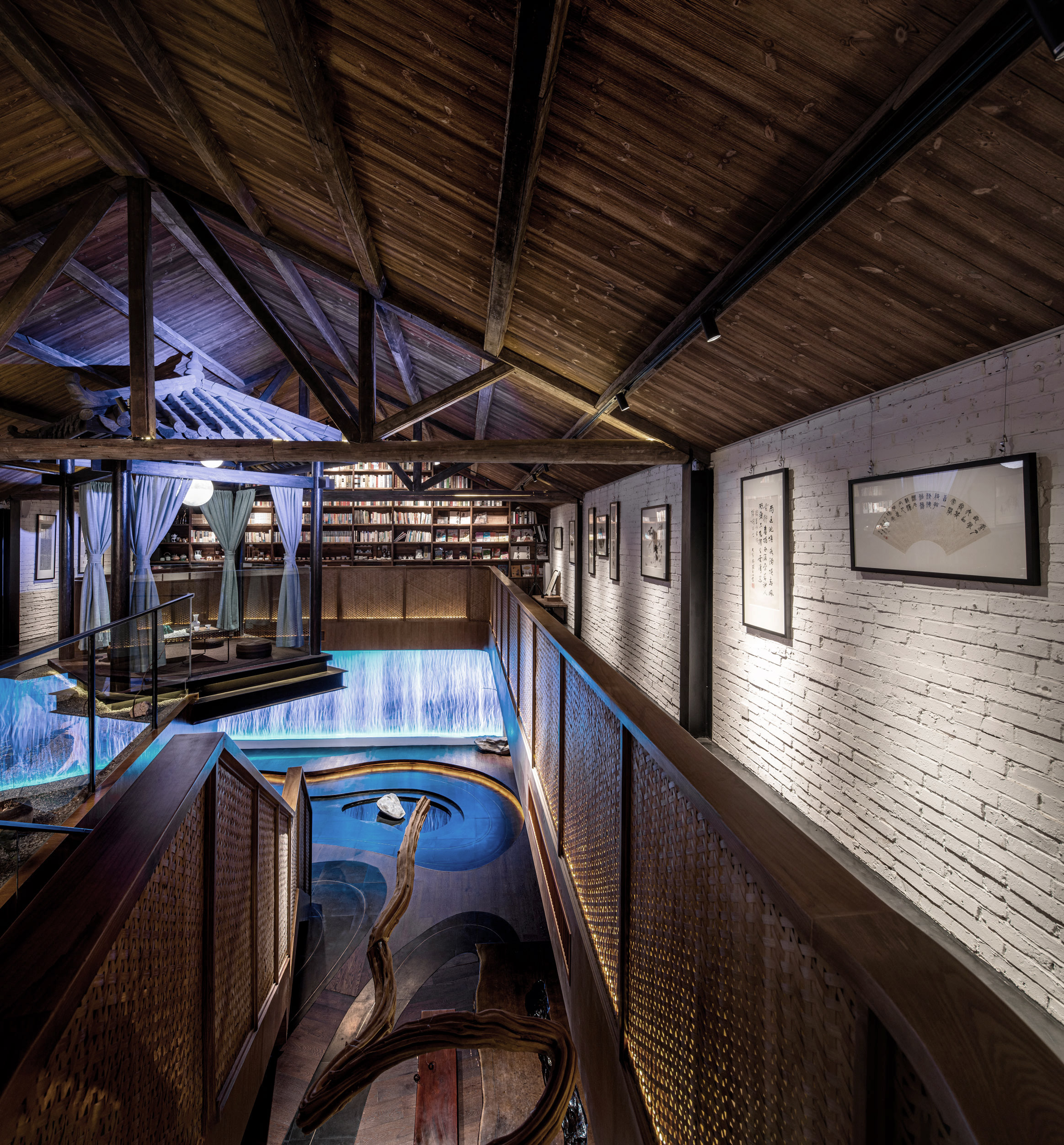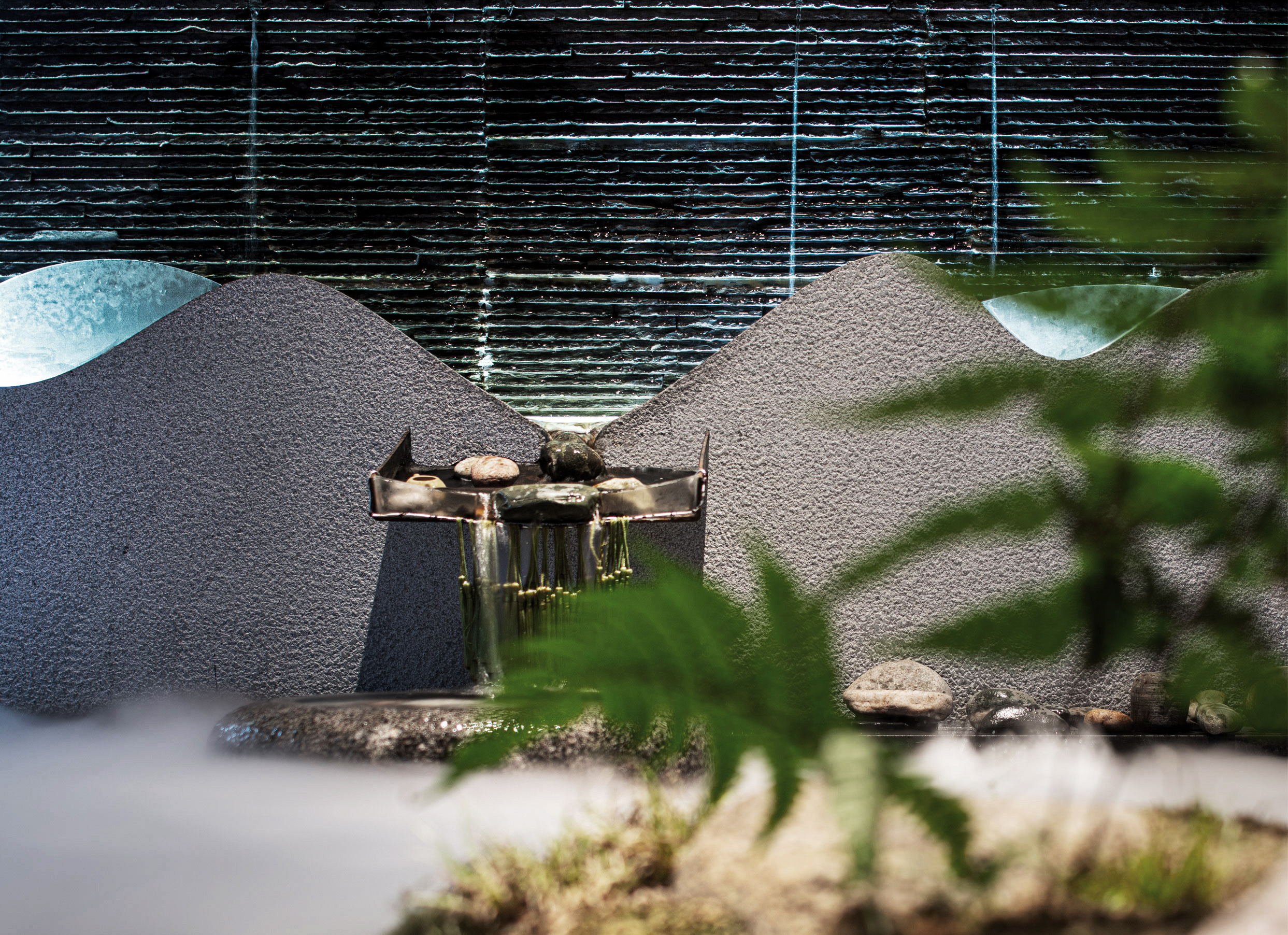 拾步入内,清泠水声伴着袅袅云雾将人扑个满怀,吧台被云山与流瀑包裹,灰白火烧板勾勒出山影叠嶂笼罩着黑色叠水石,倾泻而下的流水与向上映射的灯光在石板上相遇交织,顺着水槽汇入池中,水汽浸润着丛竹,几尾鱼儿怡然畅游,绿植和山水吐露山野的气息,氤氲的光影诉说着溪山的静谧与暖意。若问自古人生何其乐?不过偷得浮生半日闲。