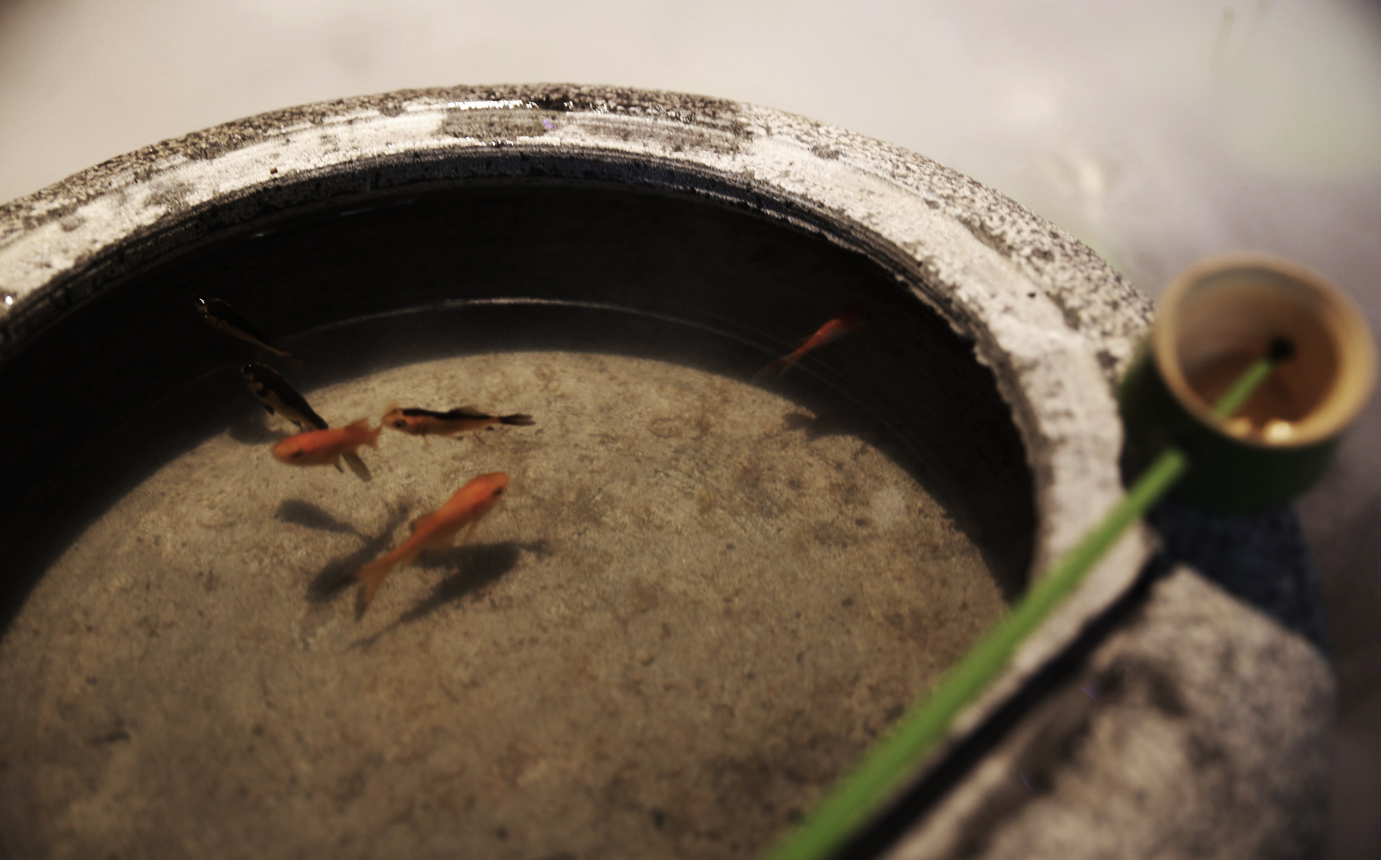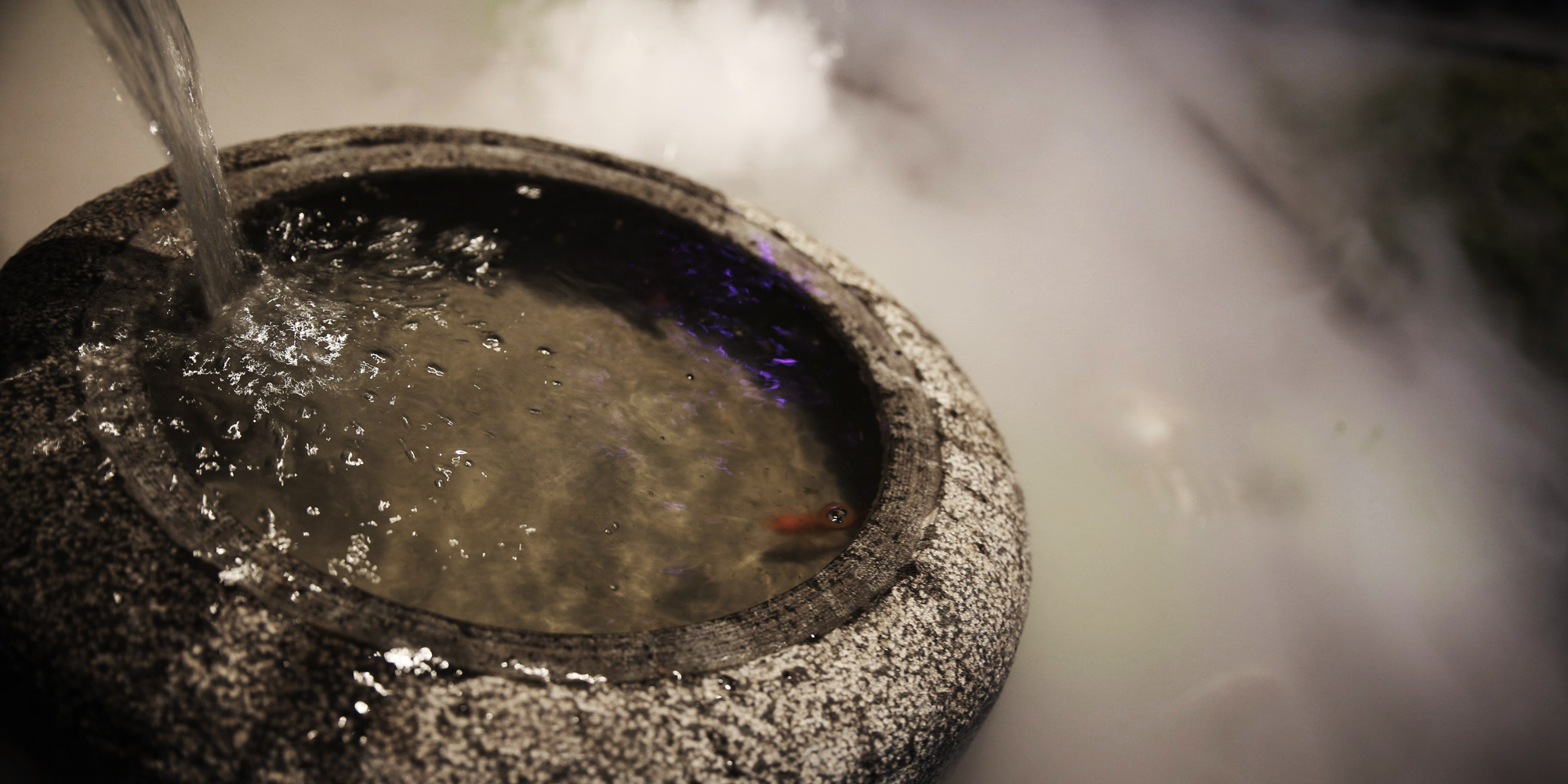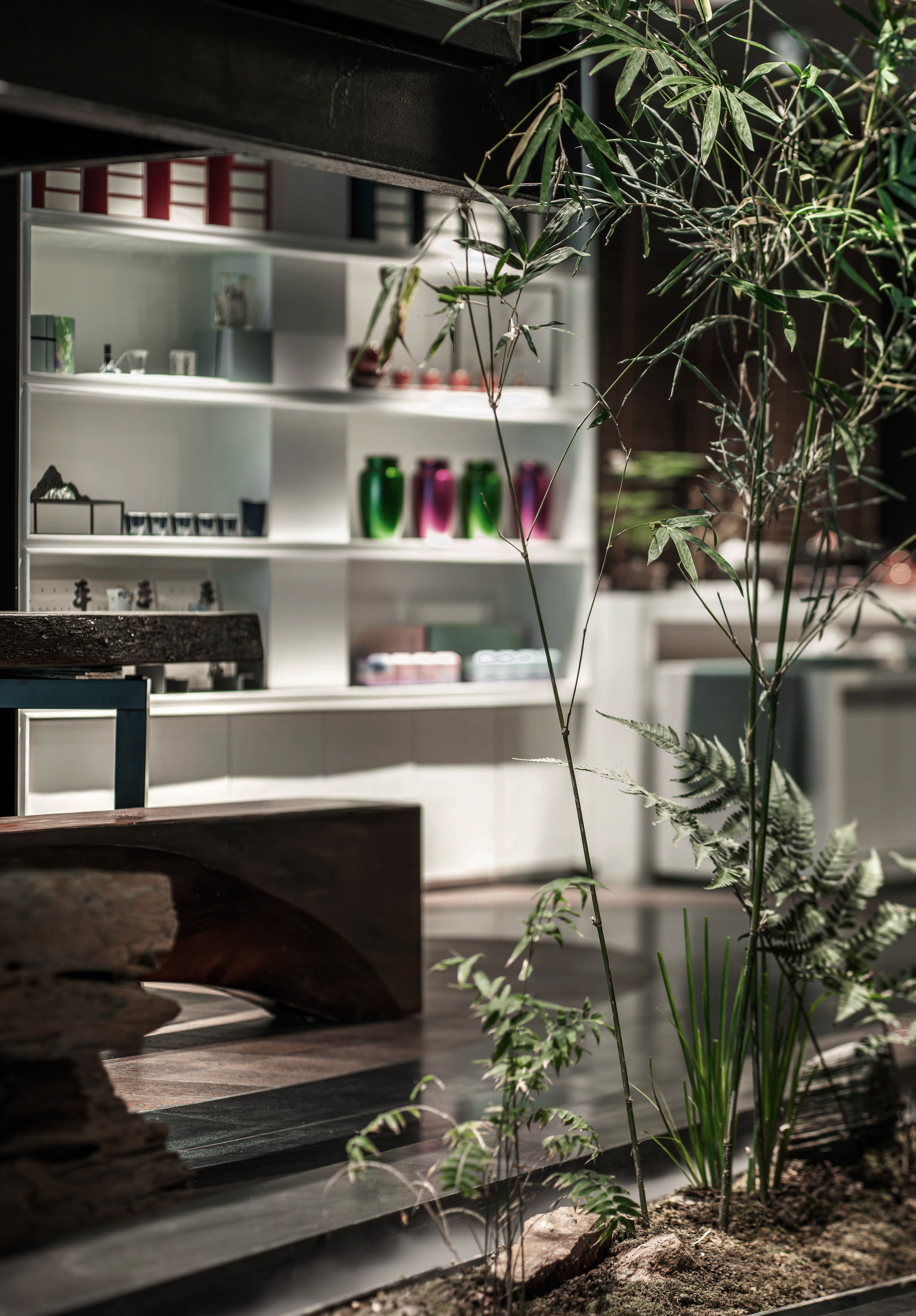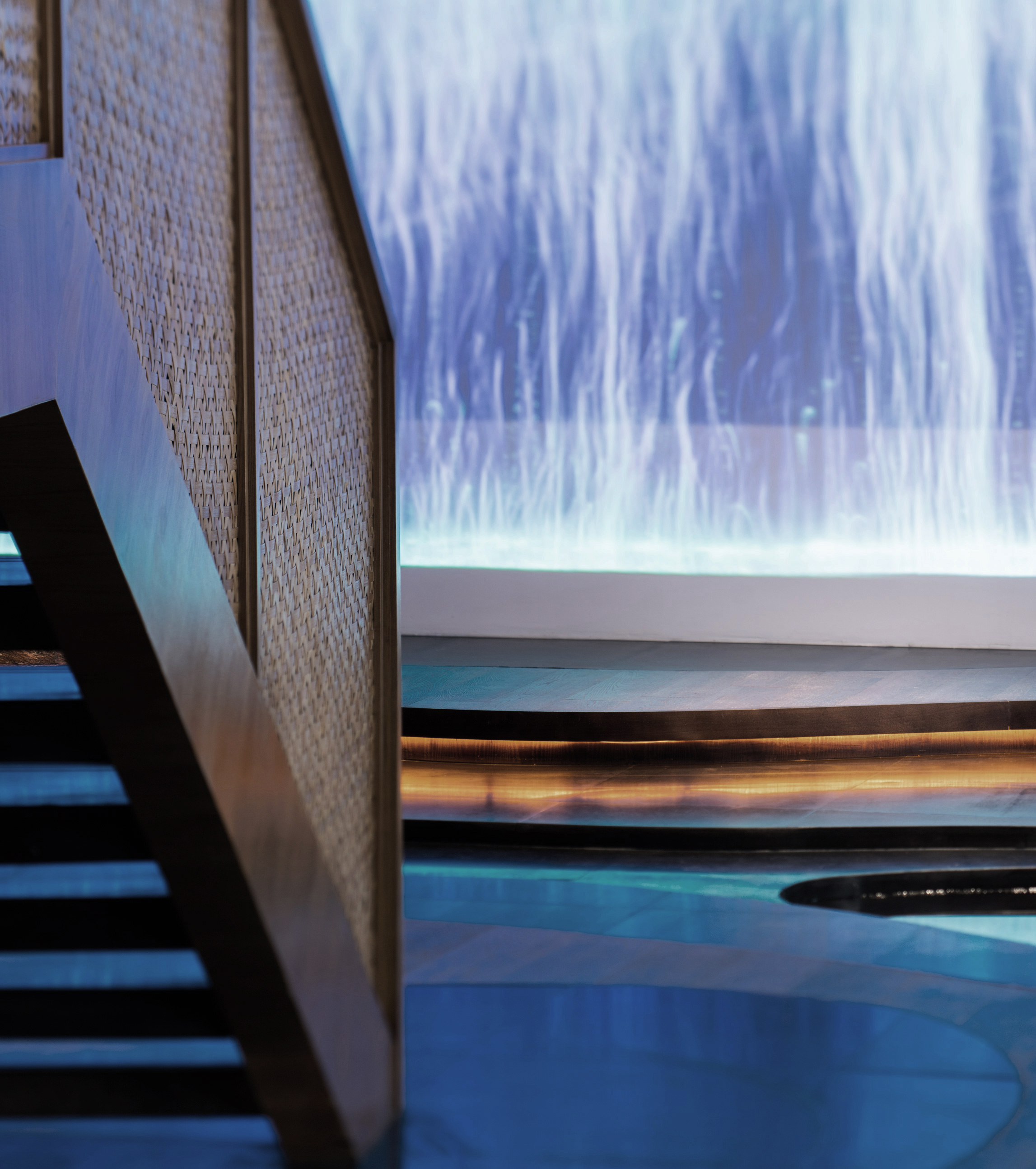 拾步入内,清泠水声伴着袅袅云雾将人扑个满怀,吧台被云山与流瀑包裹,灰白火烧板勾勒出山影叠嶂笼罩着黑色叠水石,倾泻而下的流水与向上映射的灯光在石板上相遇交织,顺着水槽汇入池中,水汽浸润着丛竹,几尾鱼儿怡然畅游,绿植和山水吐露山野的气息,氤氲的光影诉说着溪山的静谧与暖意。若问自古人生何其乐?不过偷得浮生半日闲。