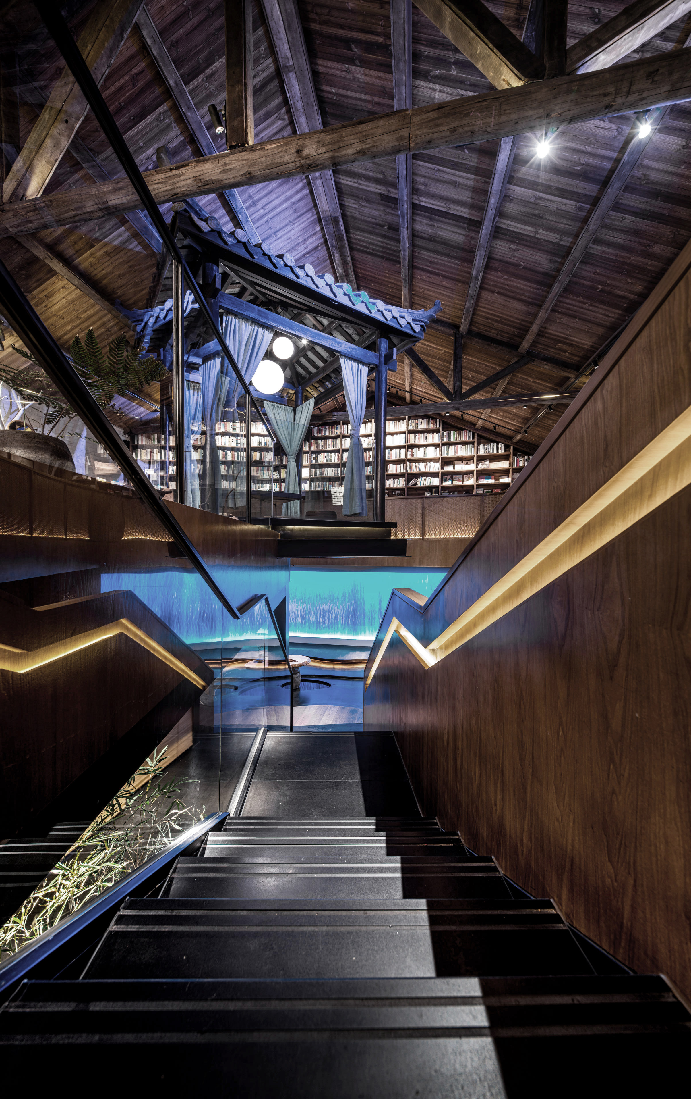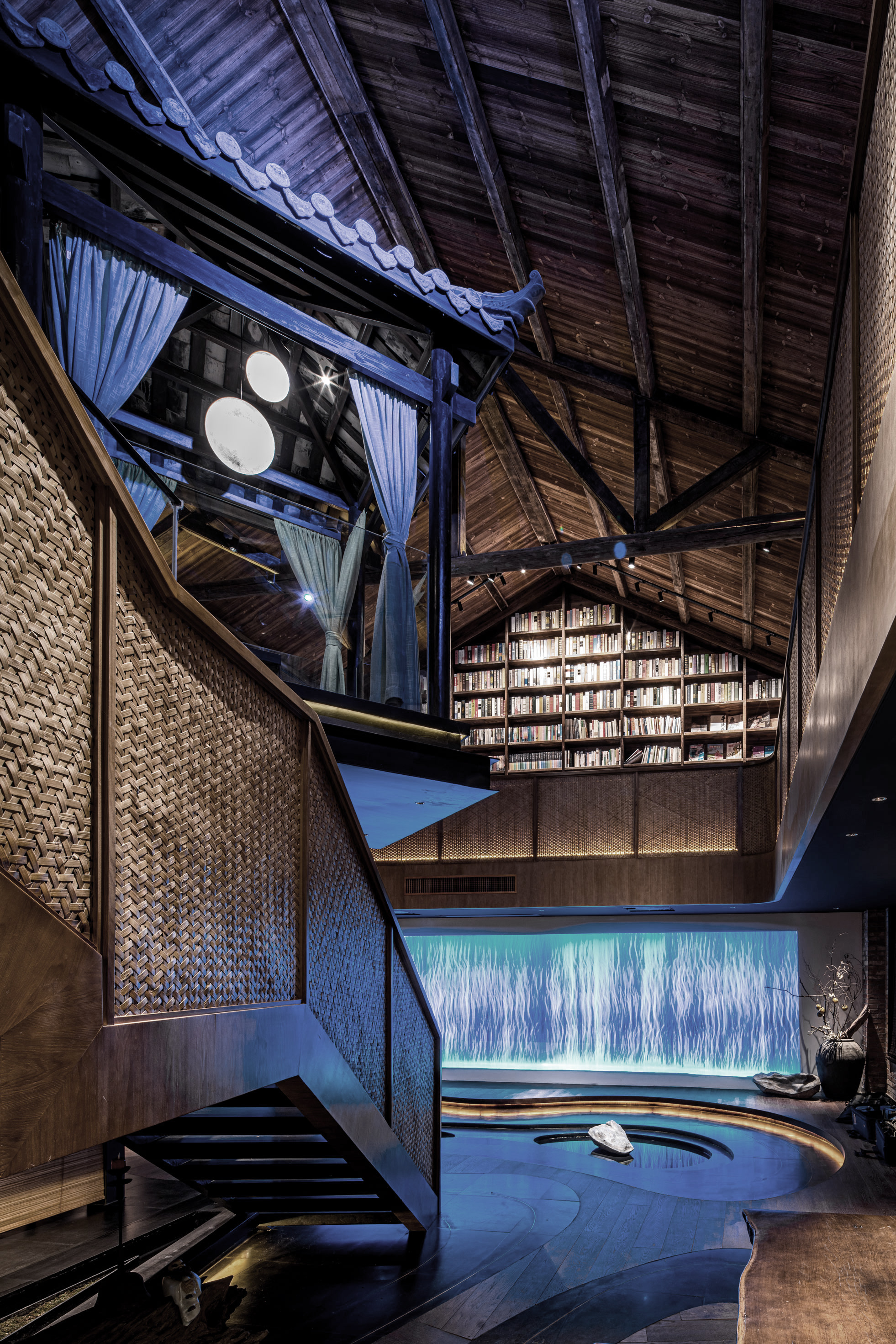 风乍起,吹皱一湖春水。 设计师室内造“湖”,一楼地面大理石与木地板的曲面拼接,仿佛水波纹一圈一圈荡漾开来,在室内静静流淌,最终汇聚到下沉式艺术舞台,温暖的木色与深黑石材混搭,粗糙与细腻的碰撞,既有细节又突出造型感。8米长的投影幕墙,用声光电的科技手法,将古典文化与空间流动在一起,在怀旧的氛围里,制造一场如梦似幻的光影之旅。