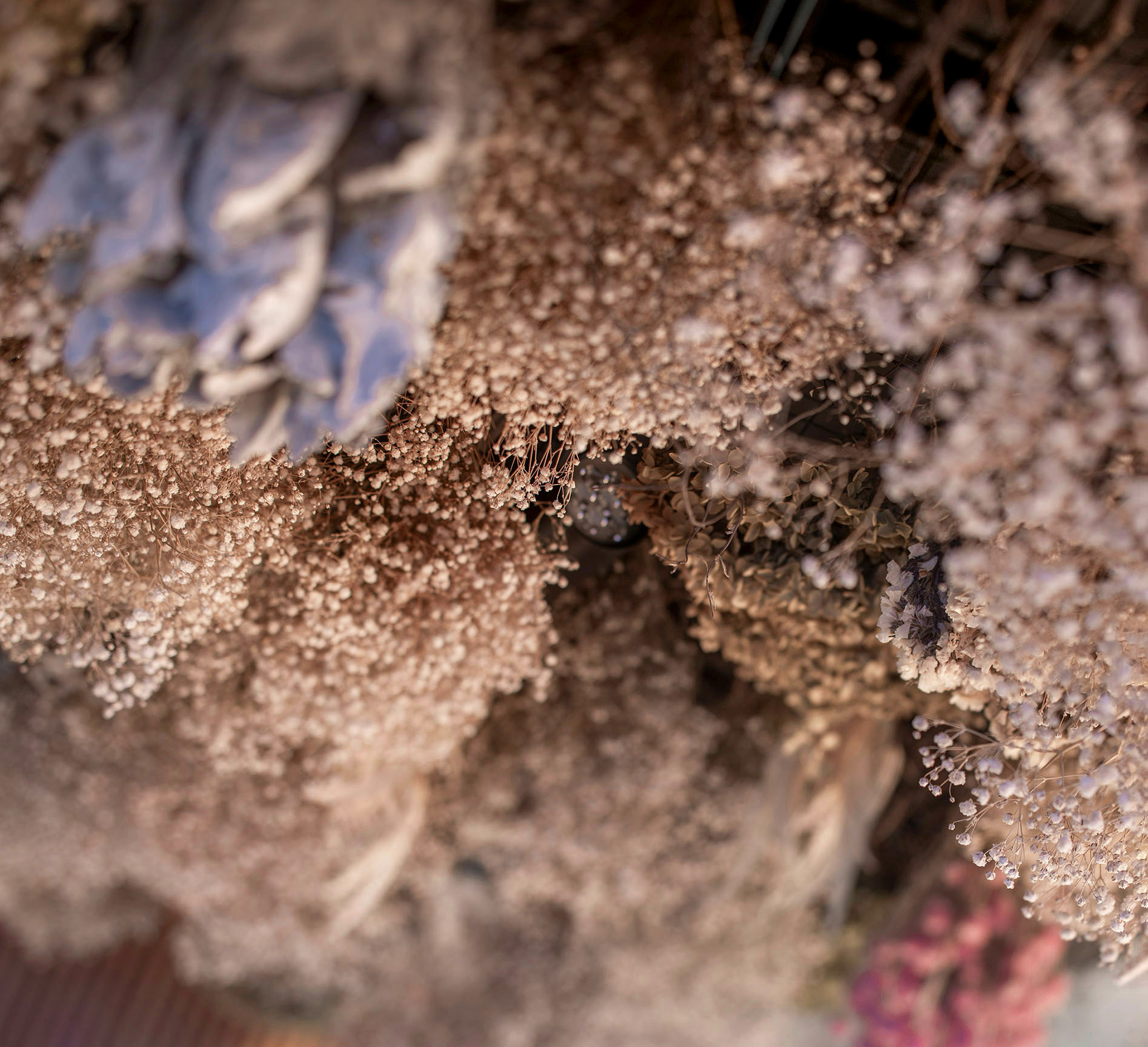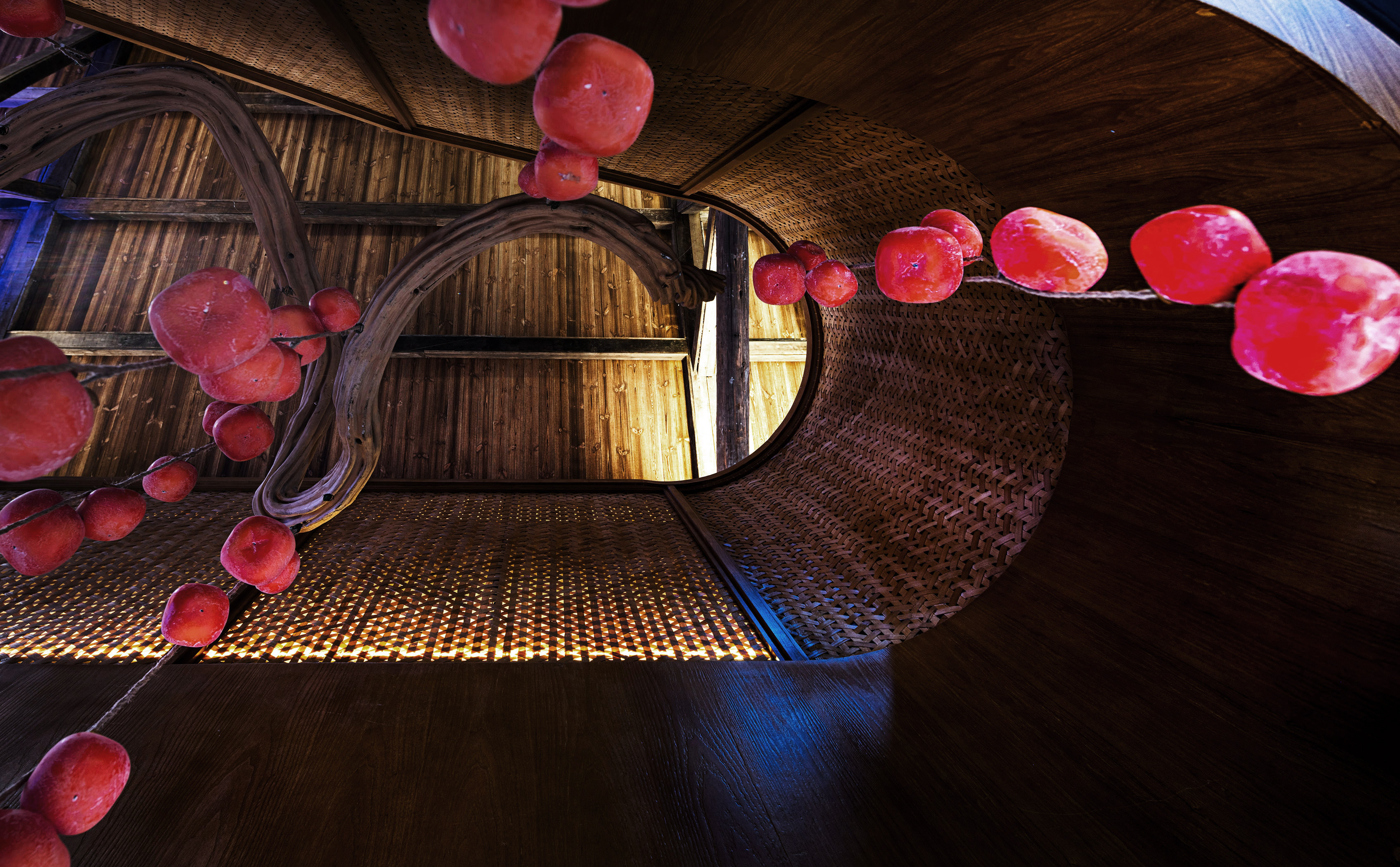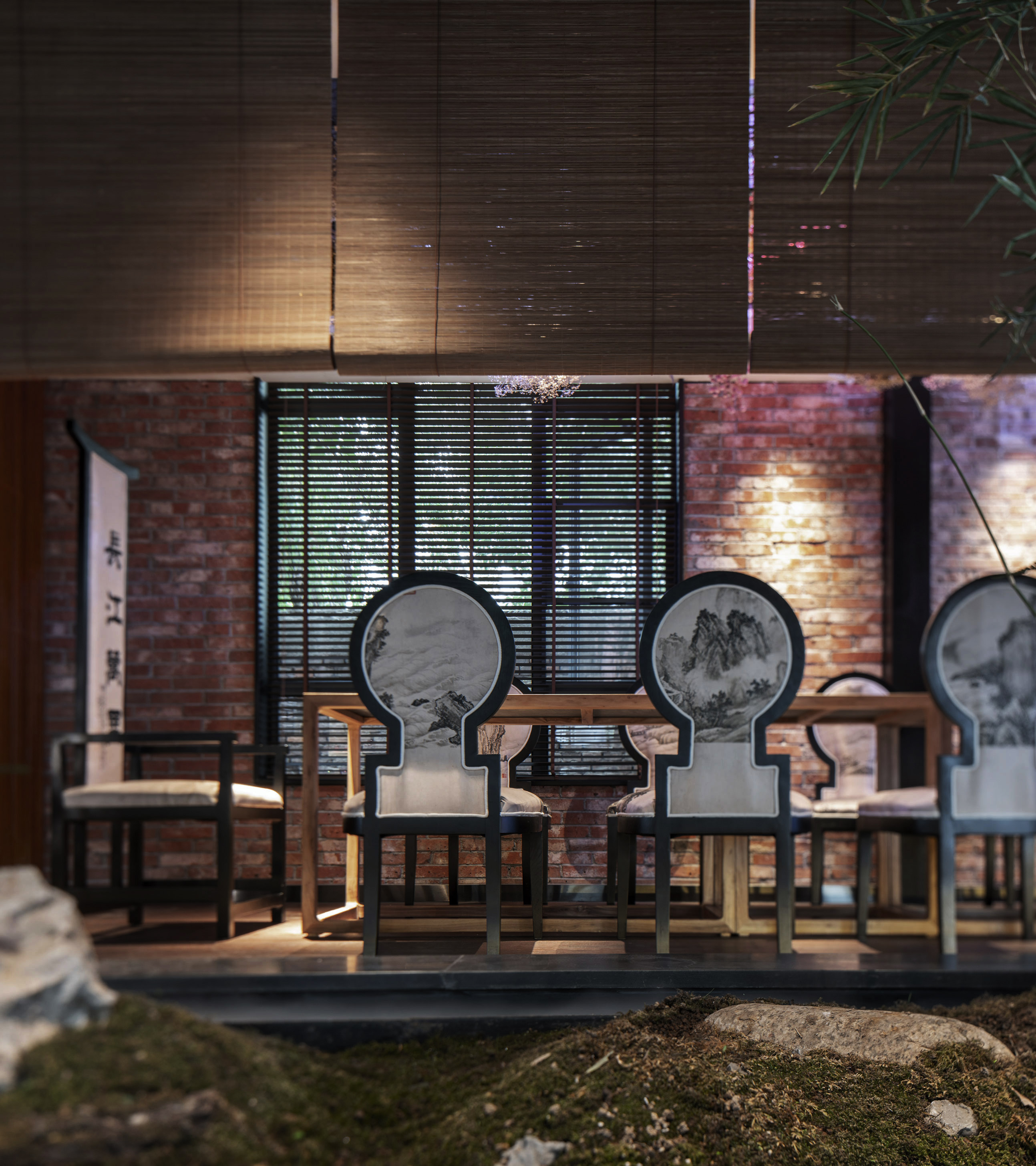 茶席散台上方以倒挂花卉为装饰,竹帘落下,自成一方会客小空间,品一口茶,齿间留香,尝四时山味,心满意得。