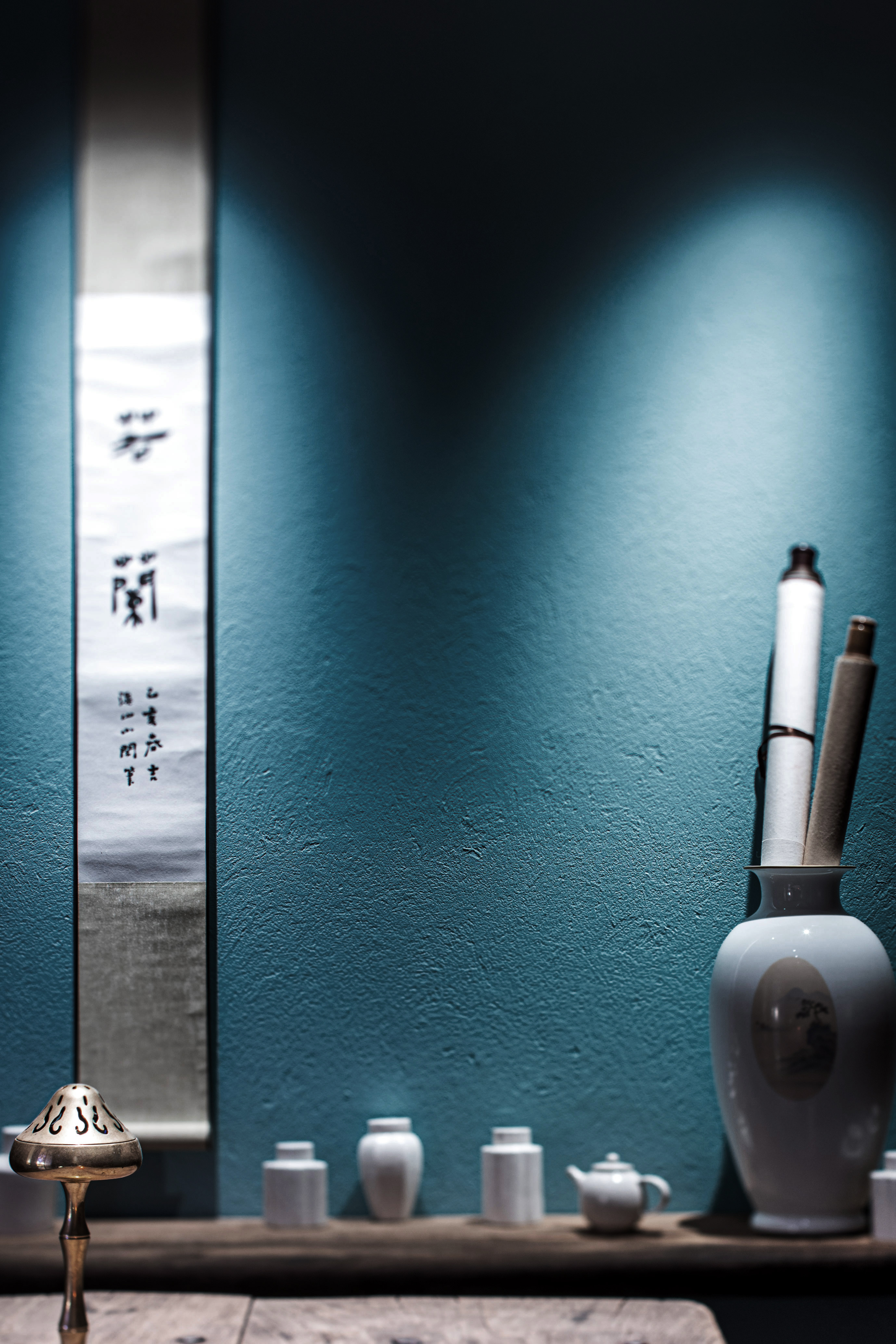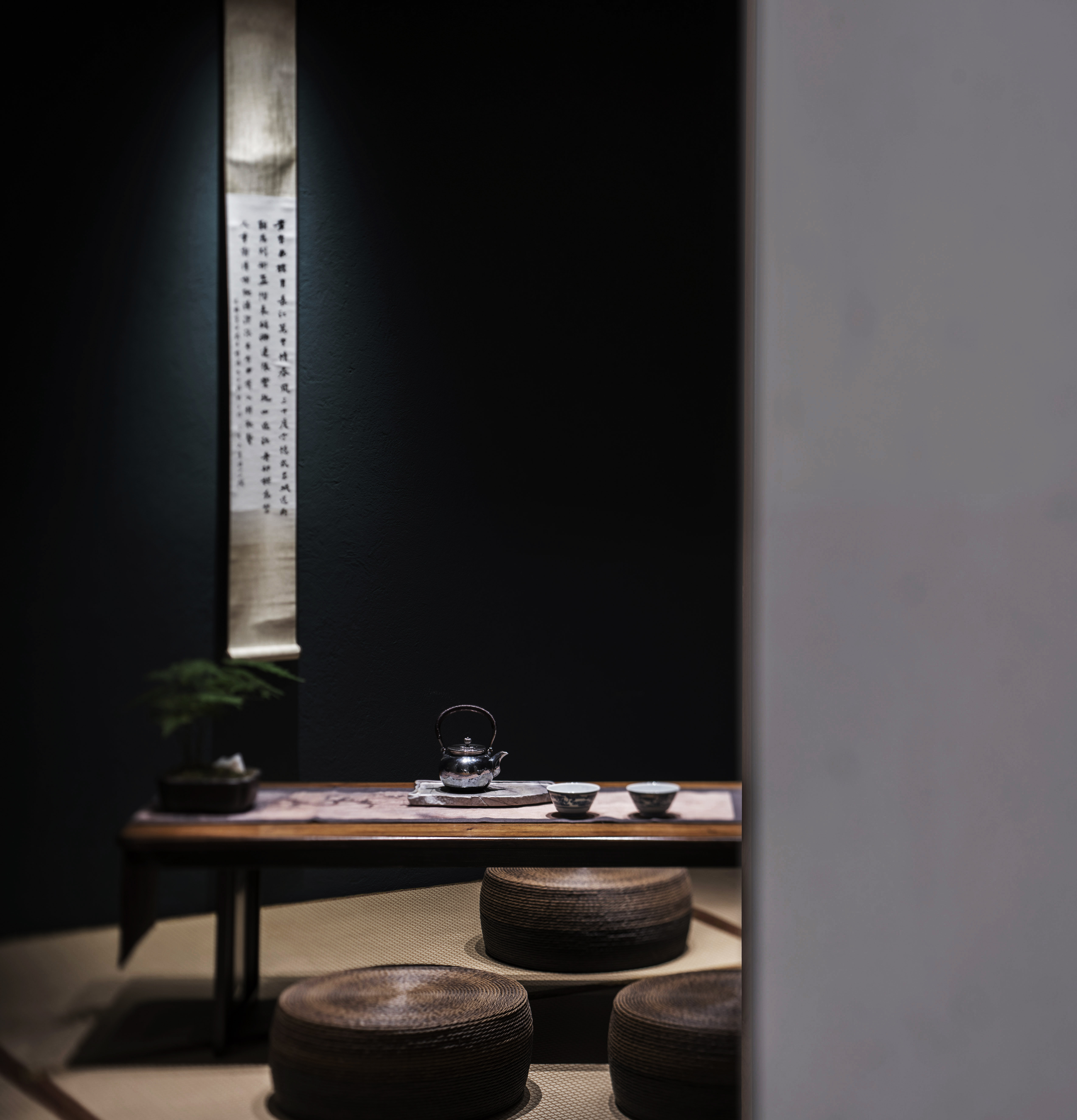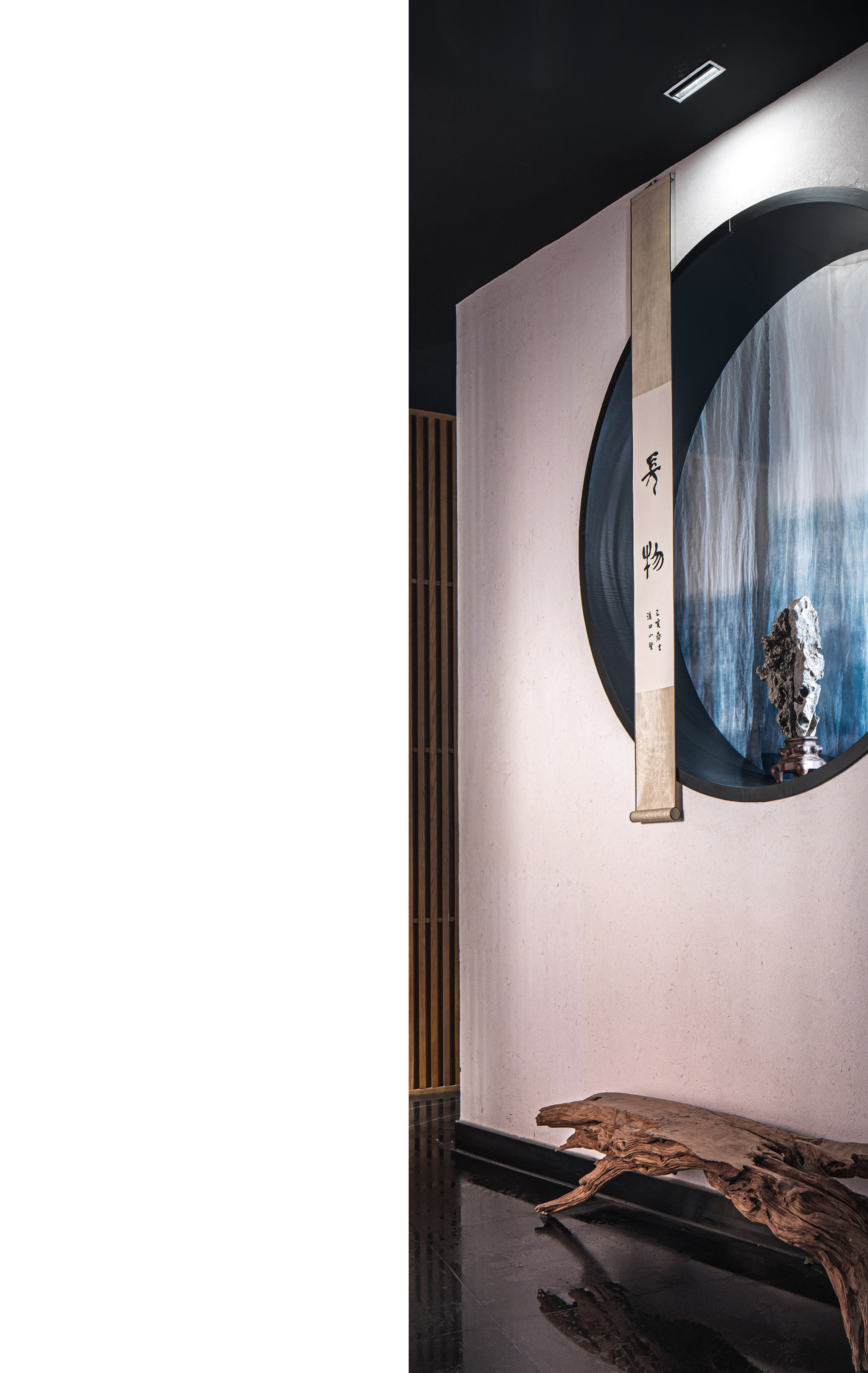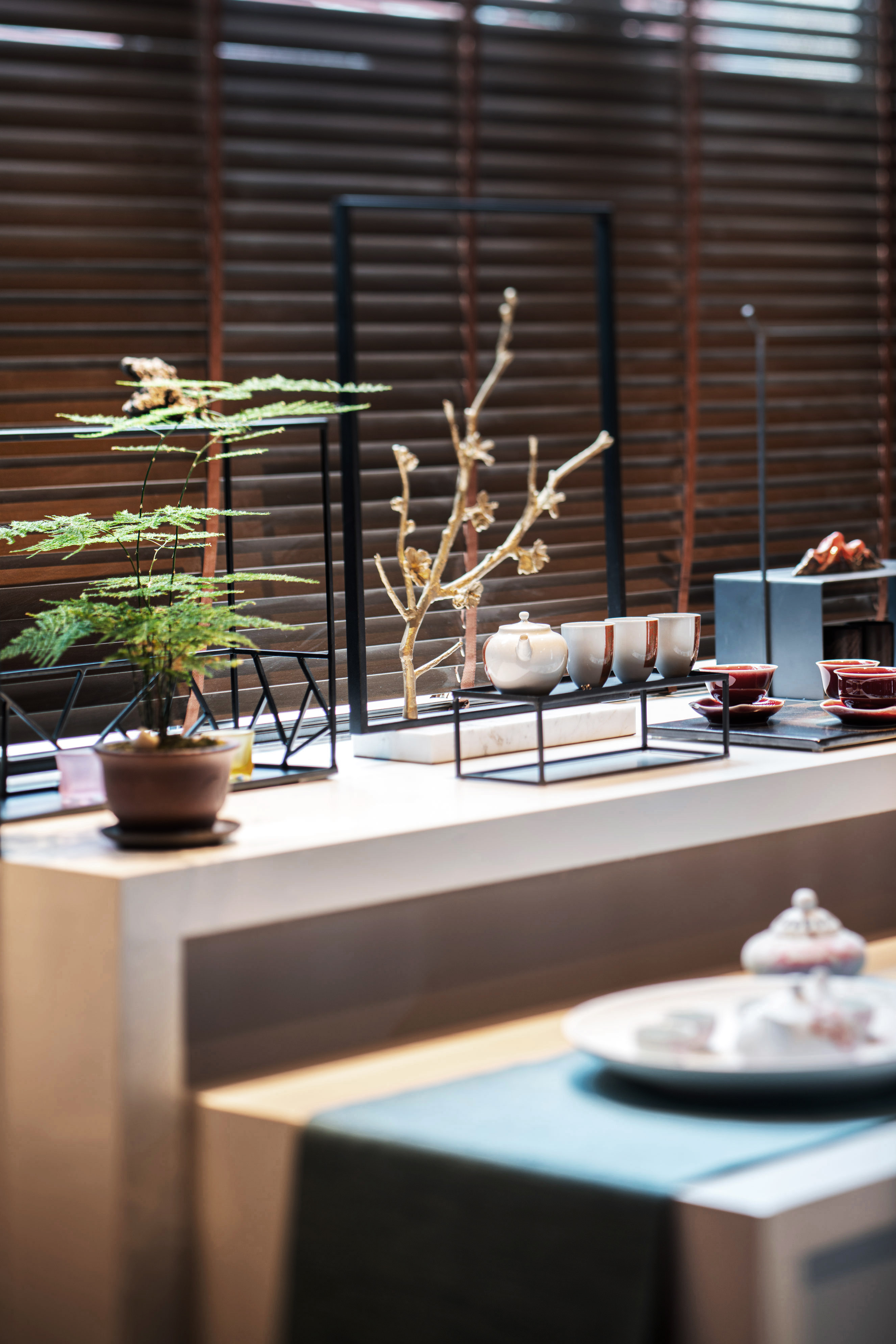 水景两侧分置两方茶席,可邀三五好友,闲聊柴米油盐酱醋茶的日常,把话茶酒香花诗书画的风雅。茶具本身亦是艺术品,茶台后方被设置为千杯墙,满足实用性与装饰性的同时,将空间利用到极致。