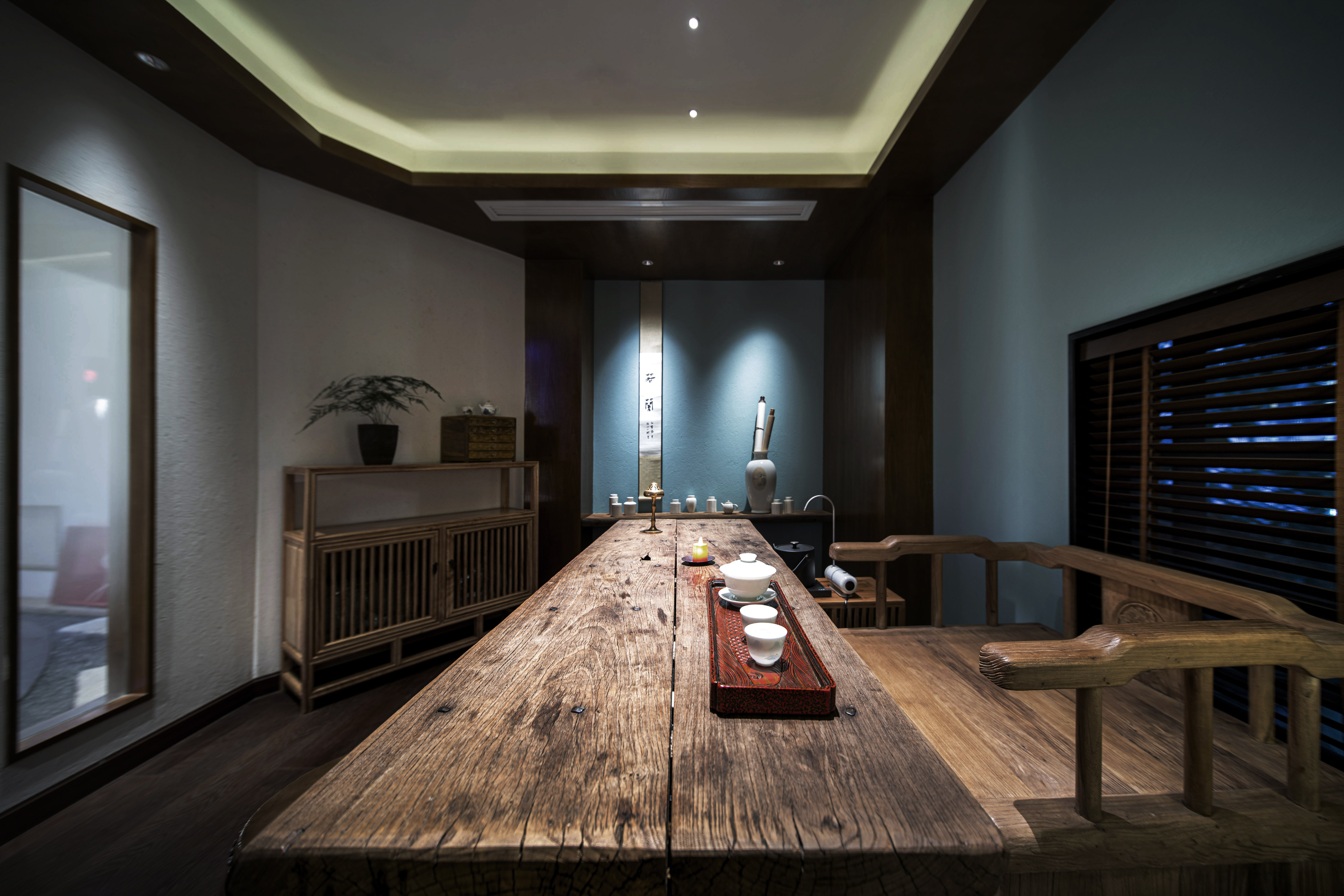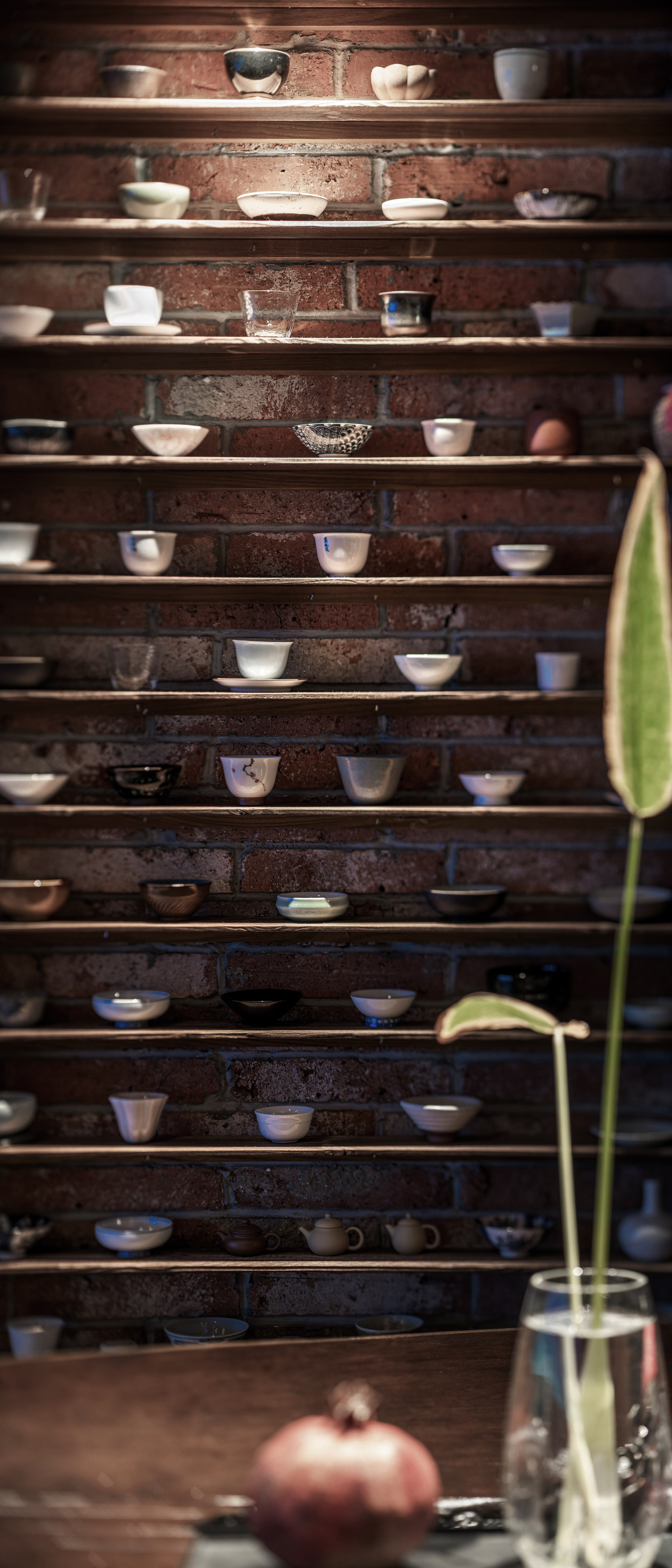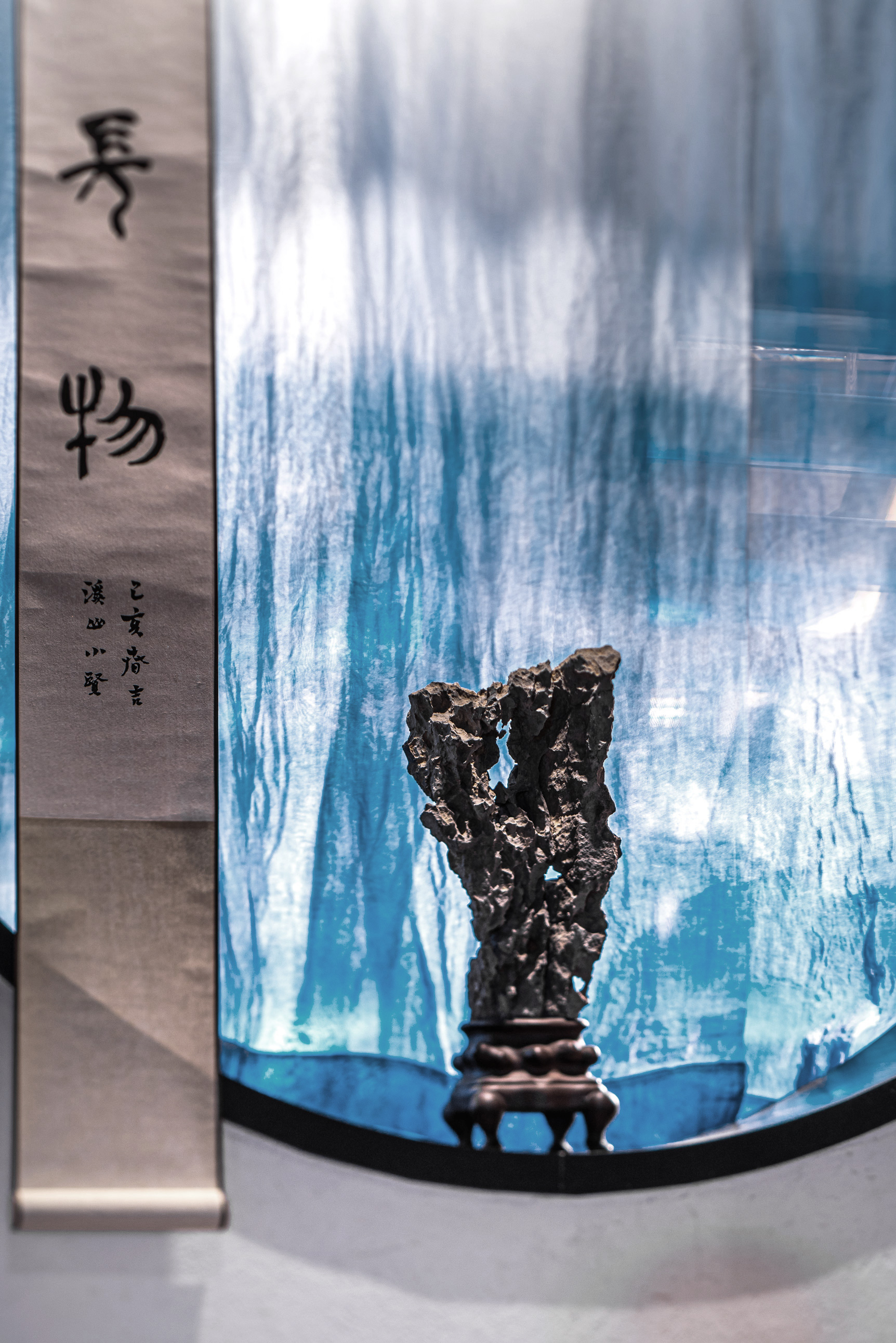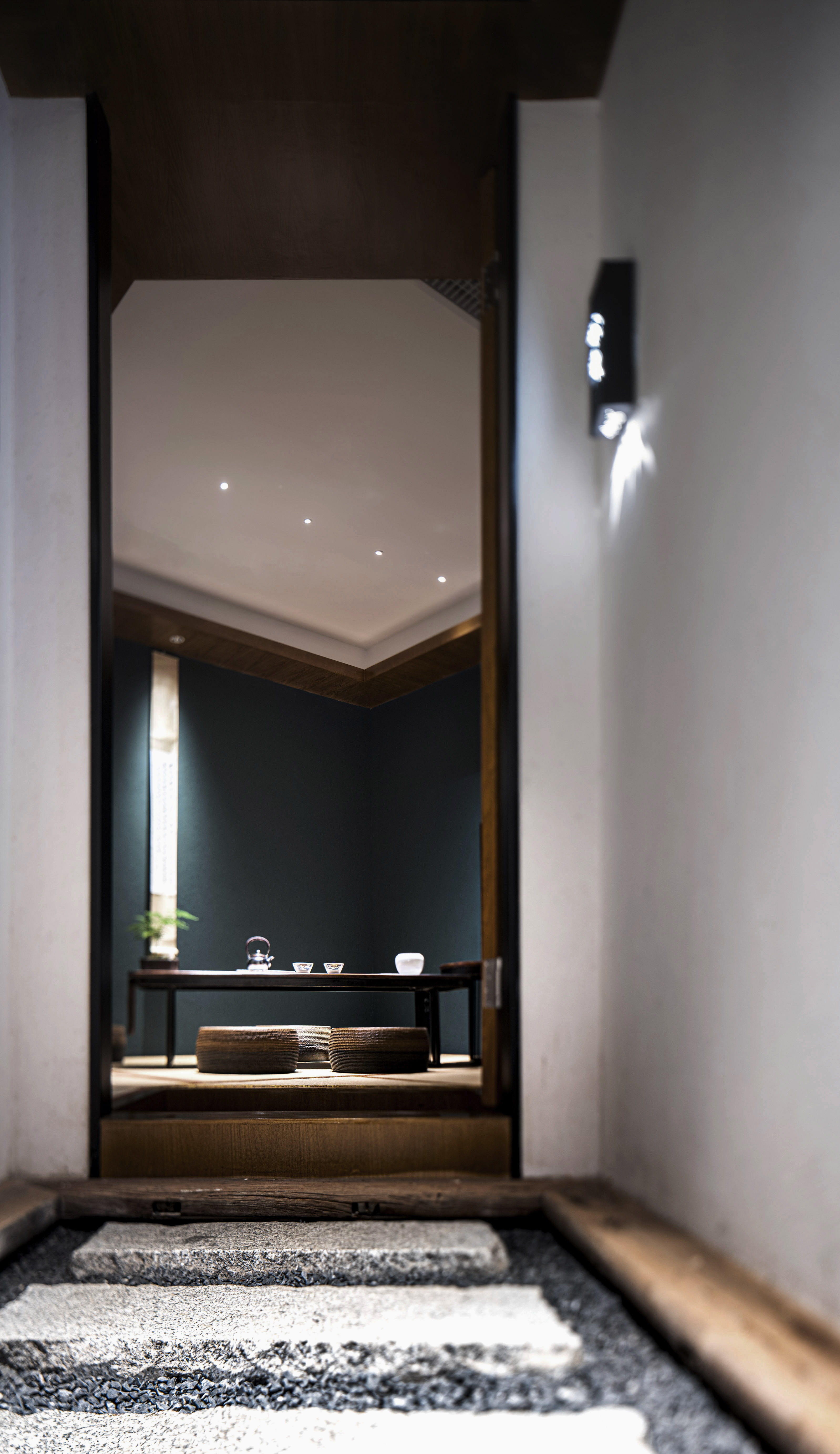 水景两侧分置两方茶席,可邀三五好友,闲聊柴米油盐酱醋茶的日常,把话茶酒香花诗书画的风雅。茶具本身亦是艺术品,茶台后方被设置为千杯墙,满足实用性与装饰性的同时,将空间利用到极致。