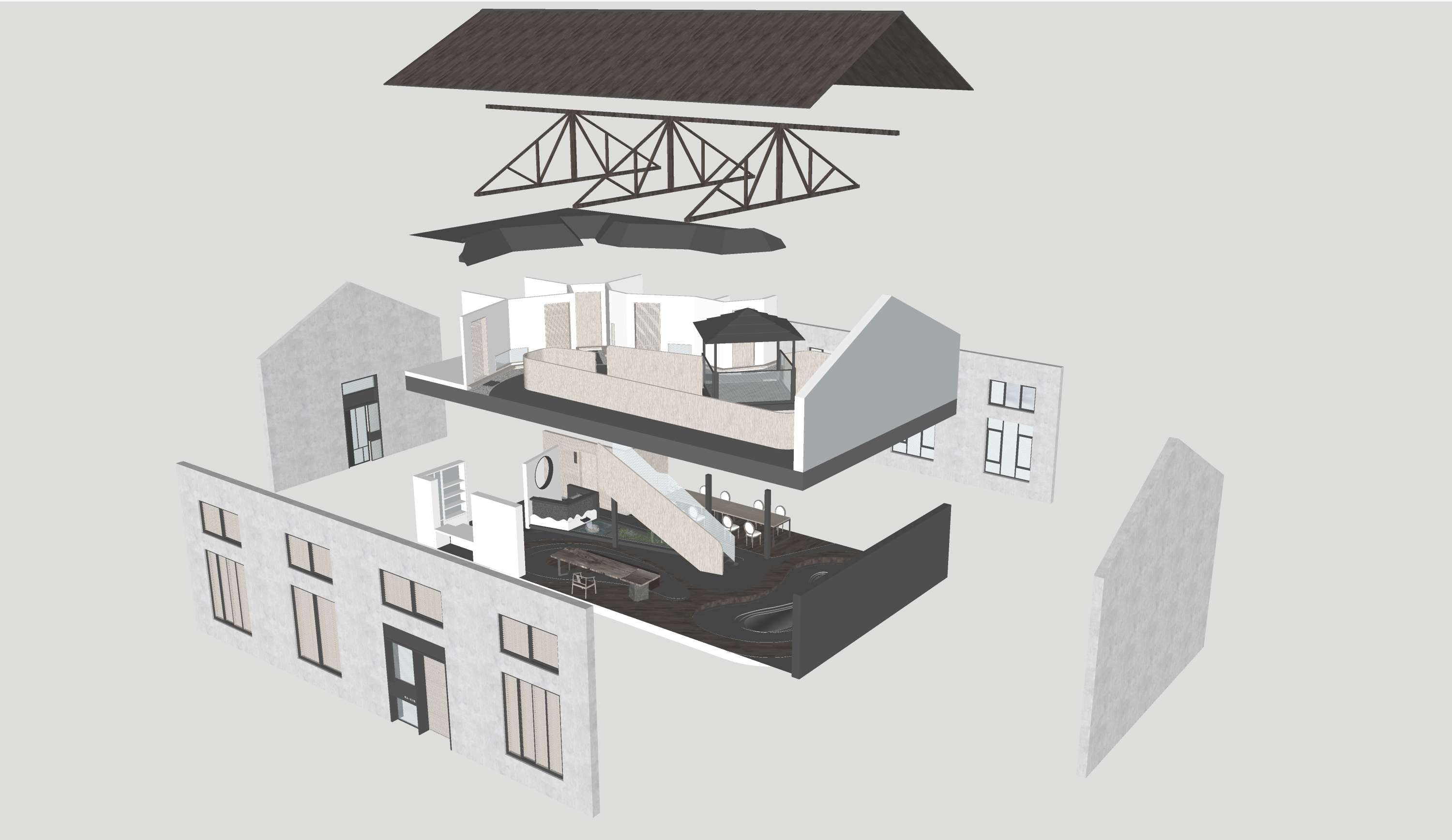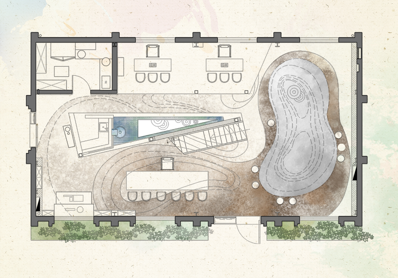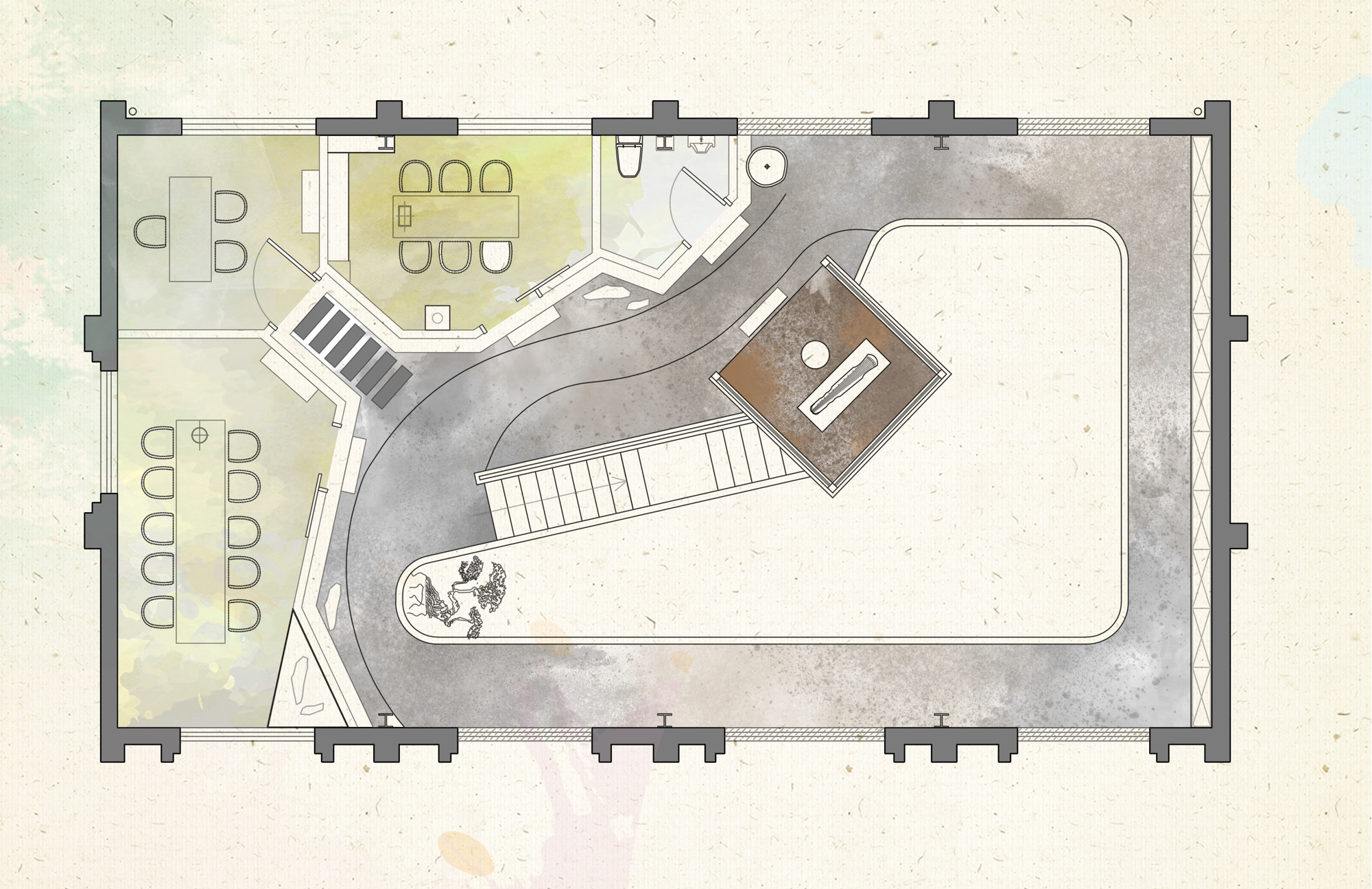 设置斜向的楼梯,利用层高增加楼板,将一、二层功能独立开来,二楼中空部分与一楼艺术舞台区域建立互动,设置半悬空亭台,突出空间层次感。