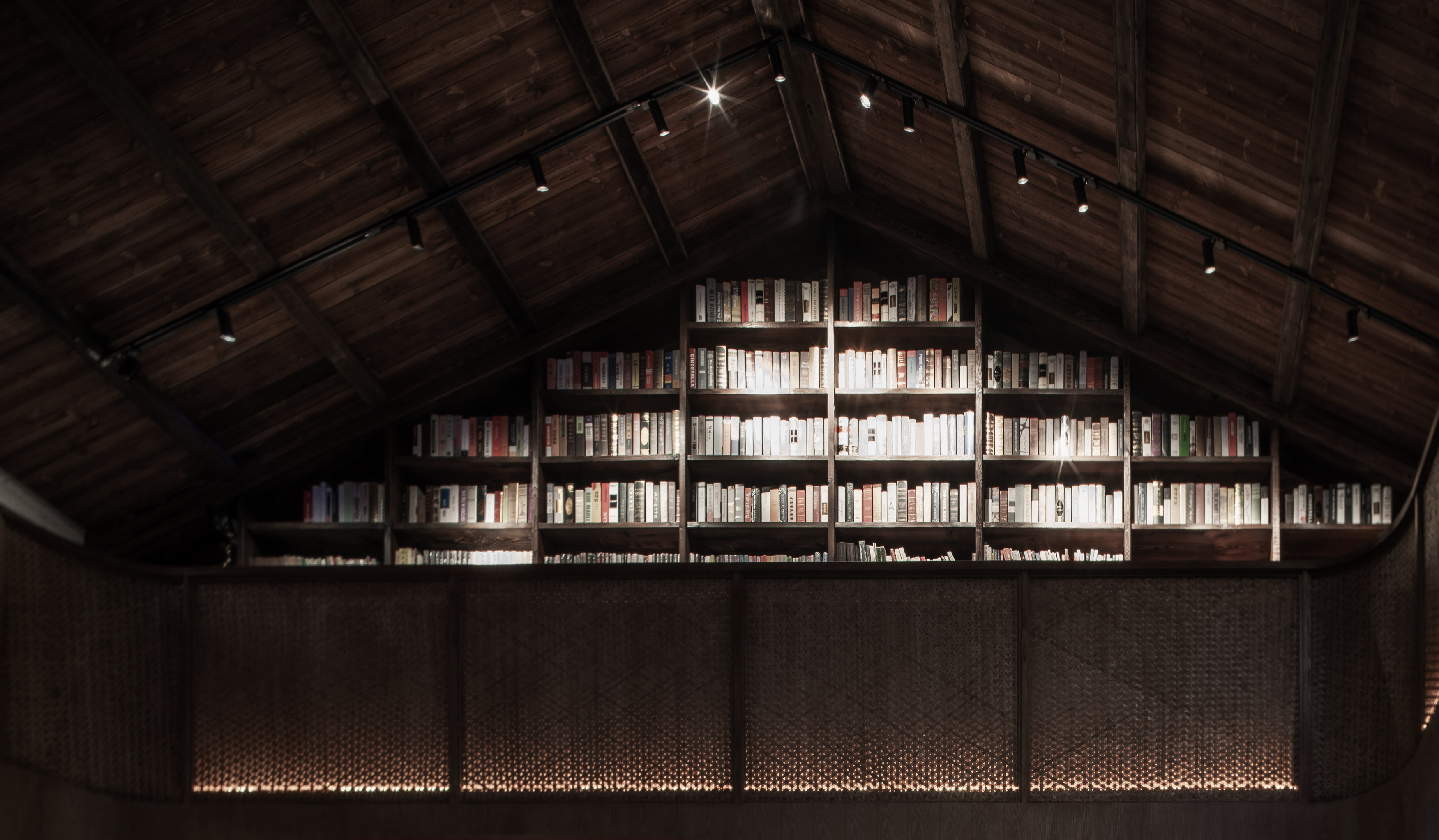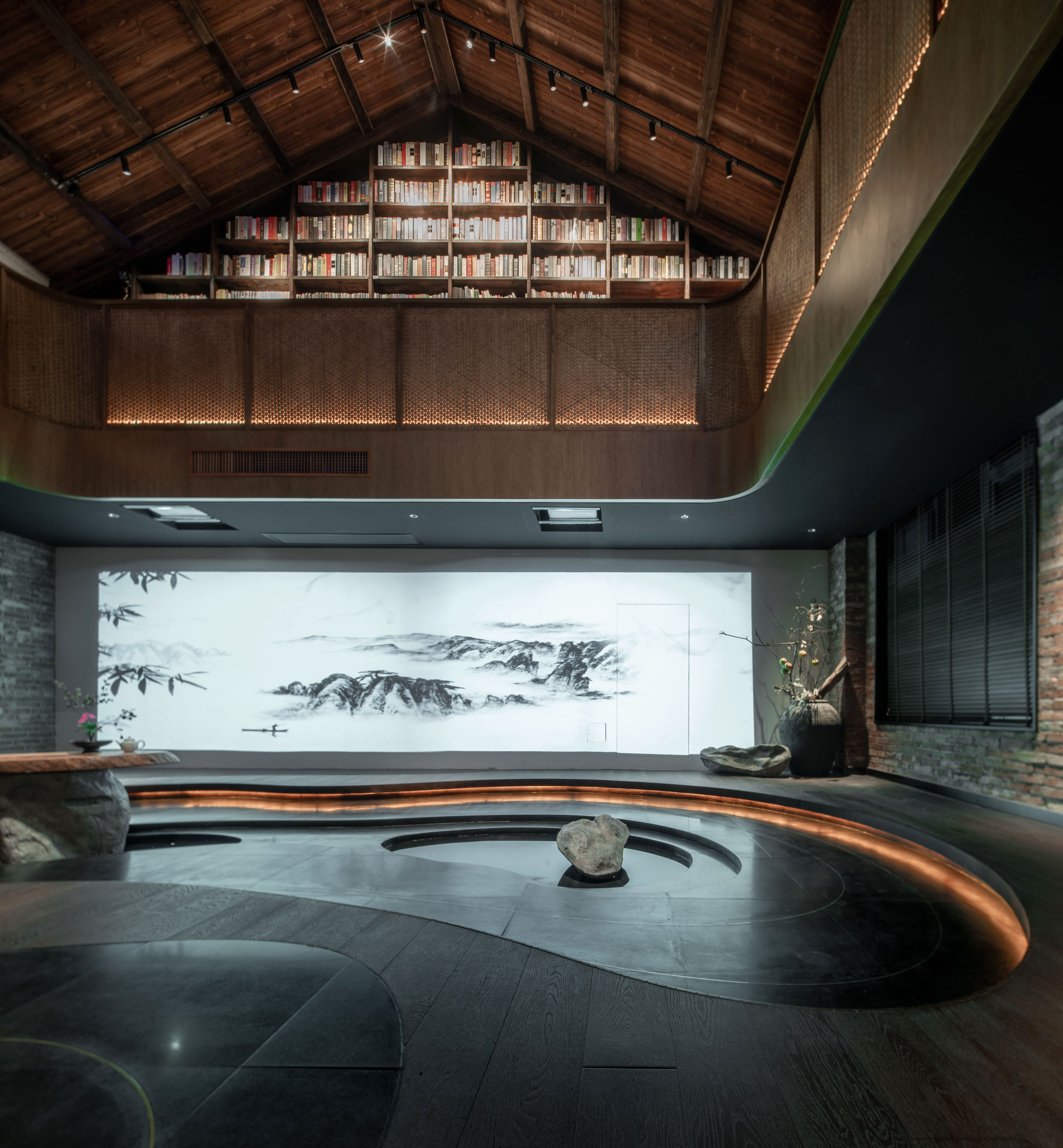 空间布局:下沉区艺术舞台与二楼亭台遥相呼应,配以大型投影幕墙,可容纳30人举办沙龙雅集、商务会议等;文创和书画展示用唯美的陈列唤起人们对美的仪式感;4米高8米宽的书墙,享受独处阅读的美好时光。