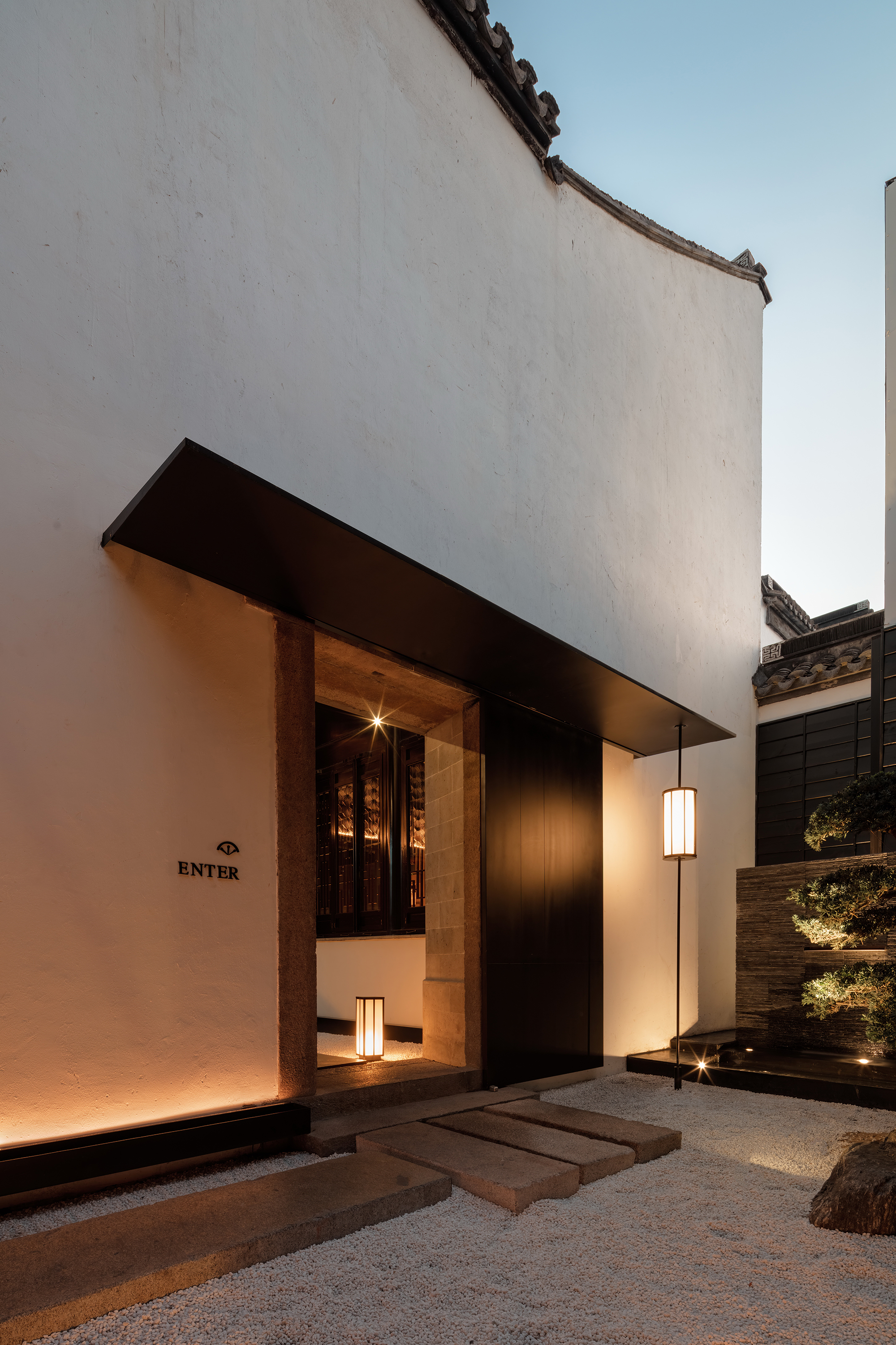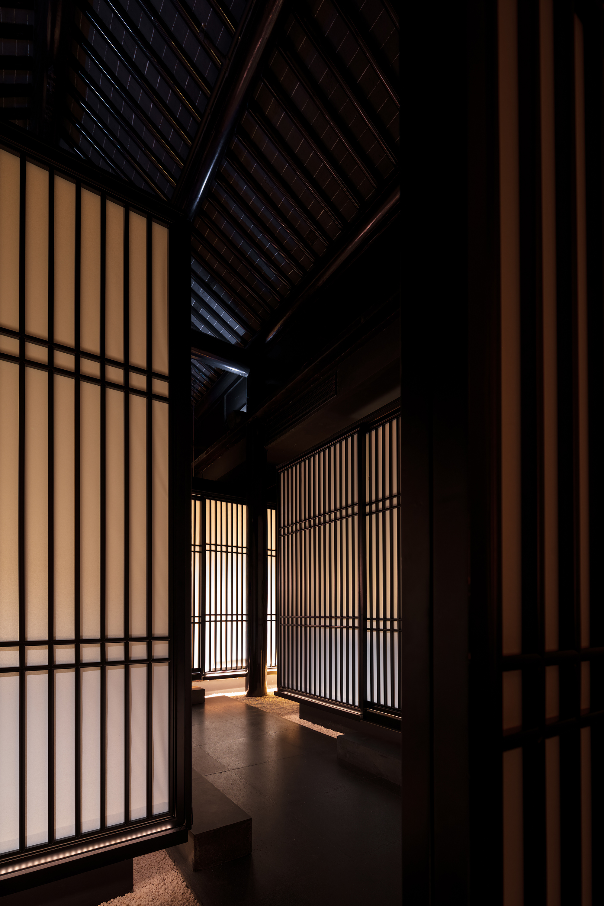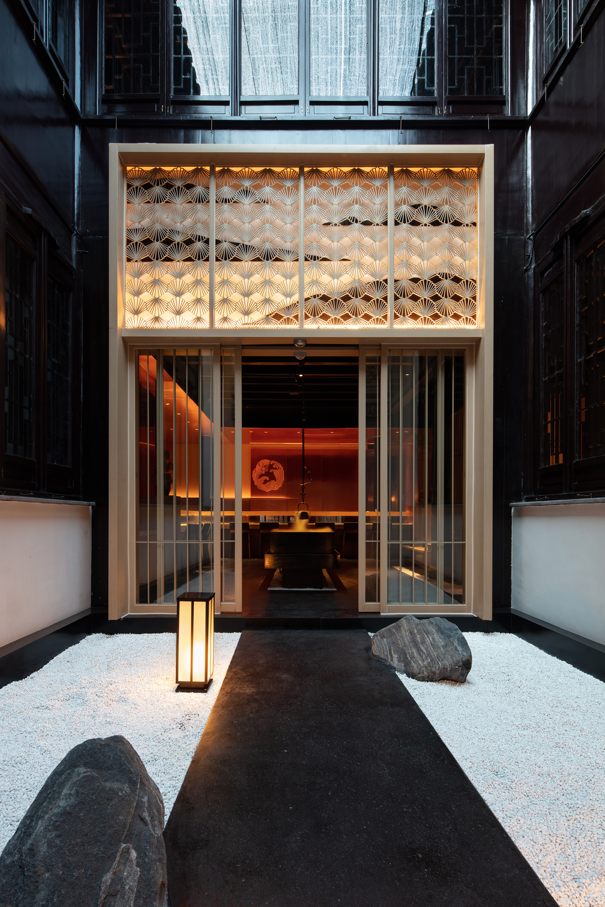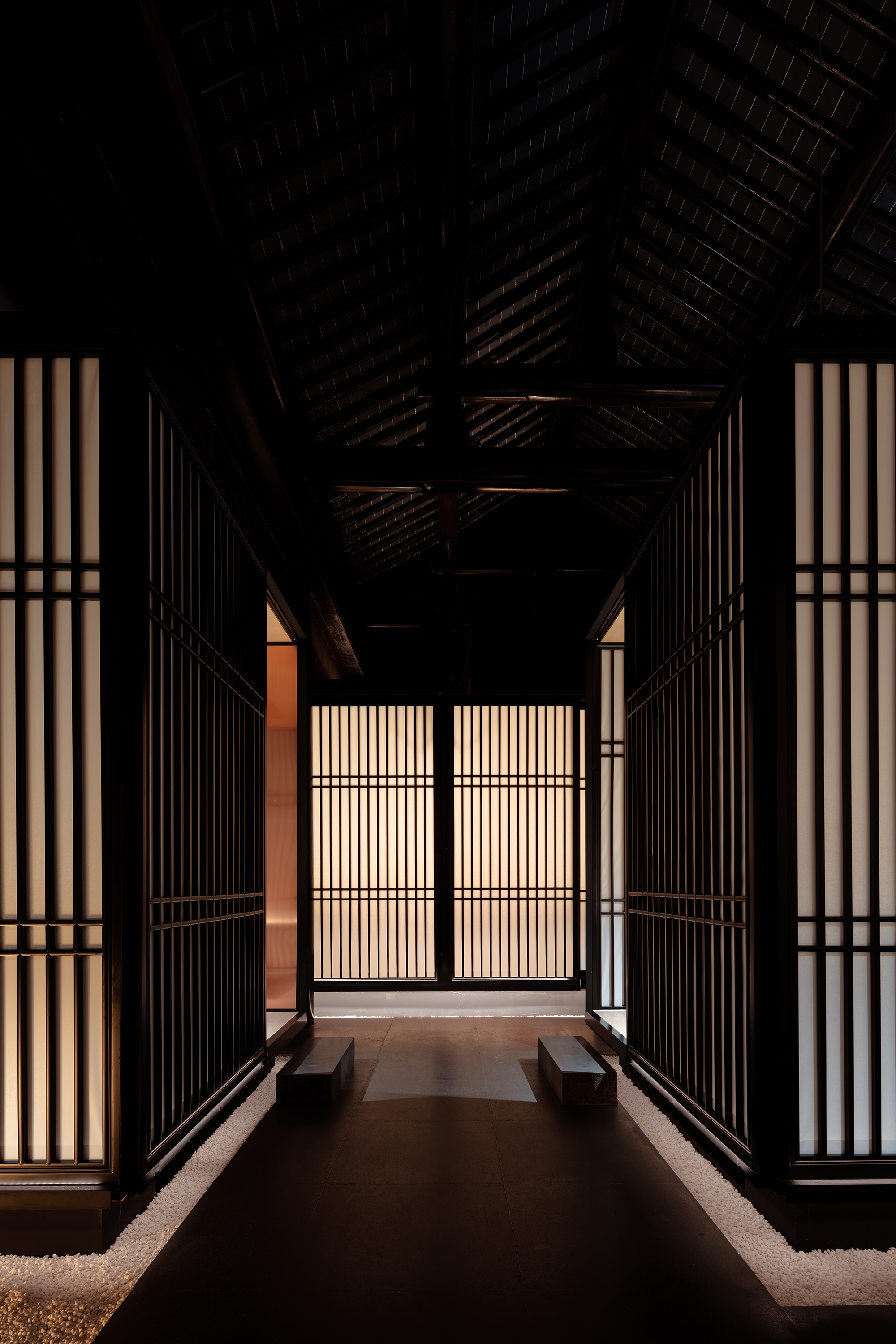寄席位于无锡市中心的小娄巷历史风貌区,是一家高级日料店,业主希望寄席是一个空间氛围与气质俱佳的一个场所,项目场地的空间形态丰富,廊-院-庭-楼形态交织,因此设计把空间的秩序放到首位,以空间剧情的方式引人入胜,通过空间的转乘来让顾客体验到层层开合,渐入佳境。