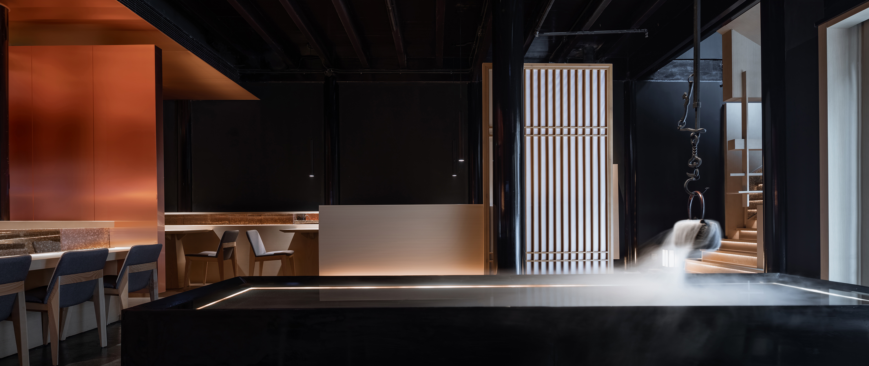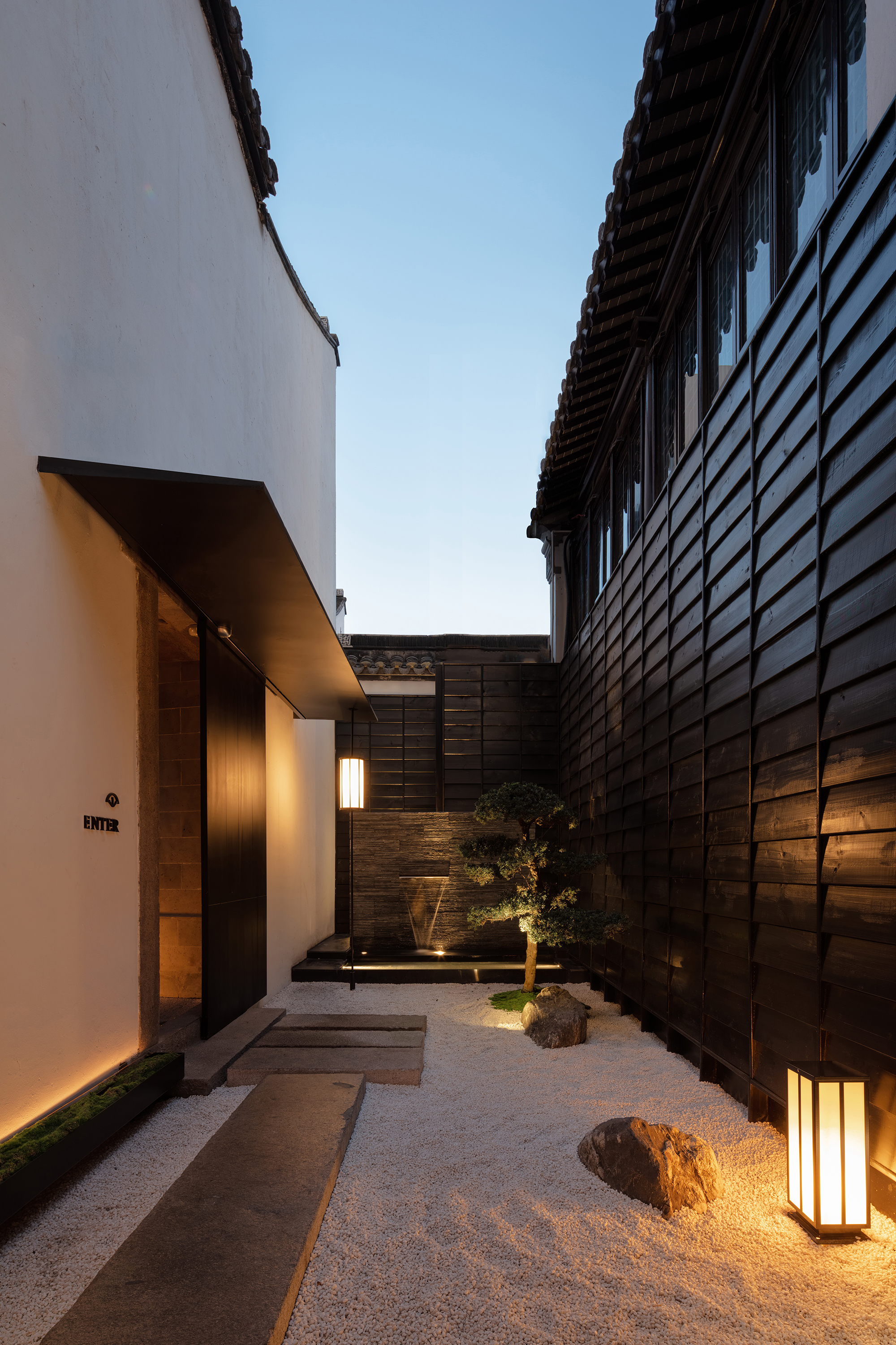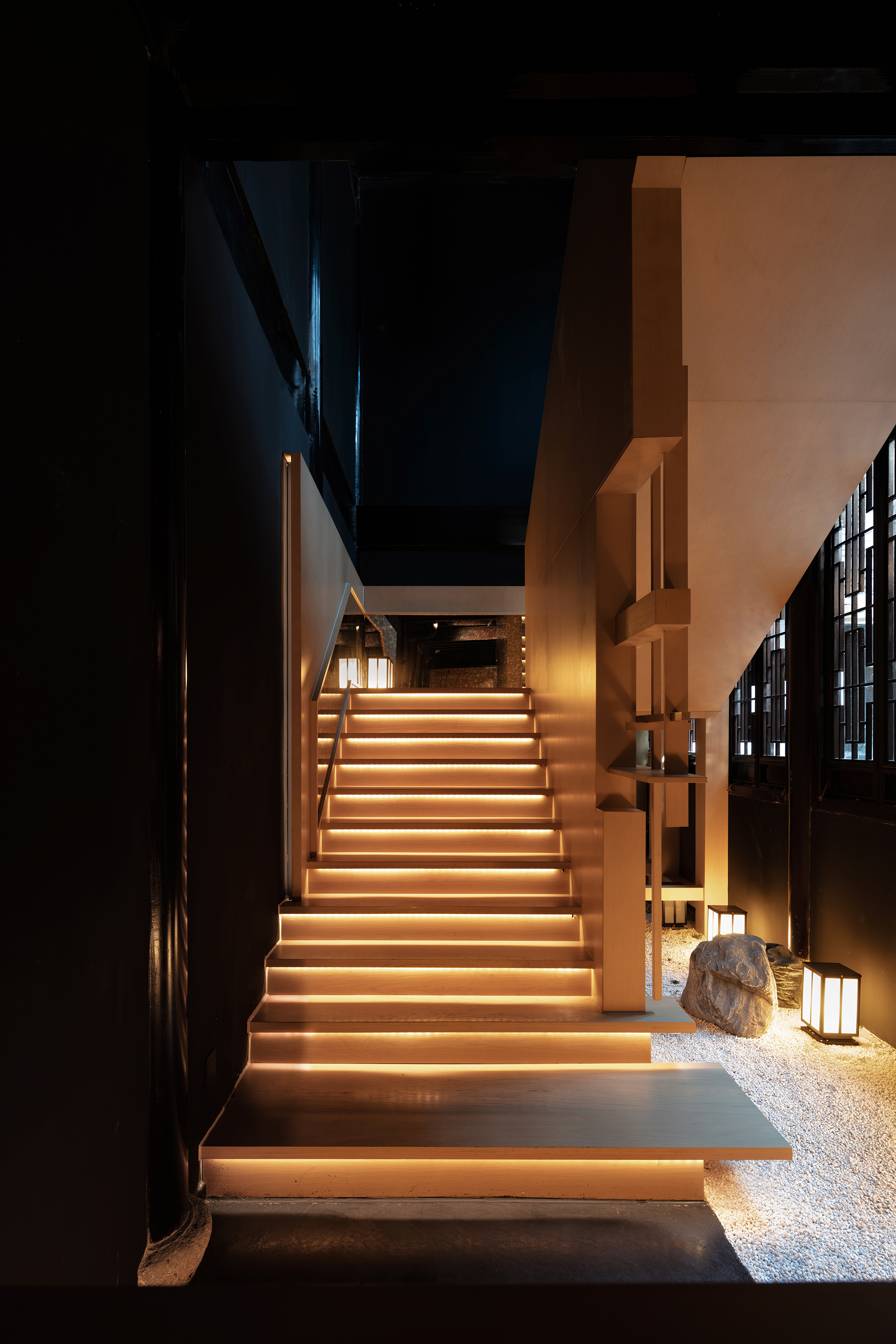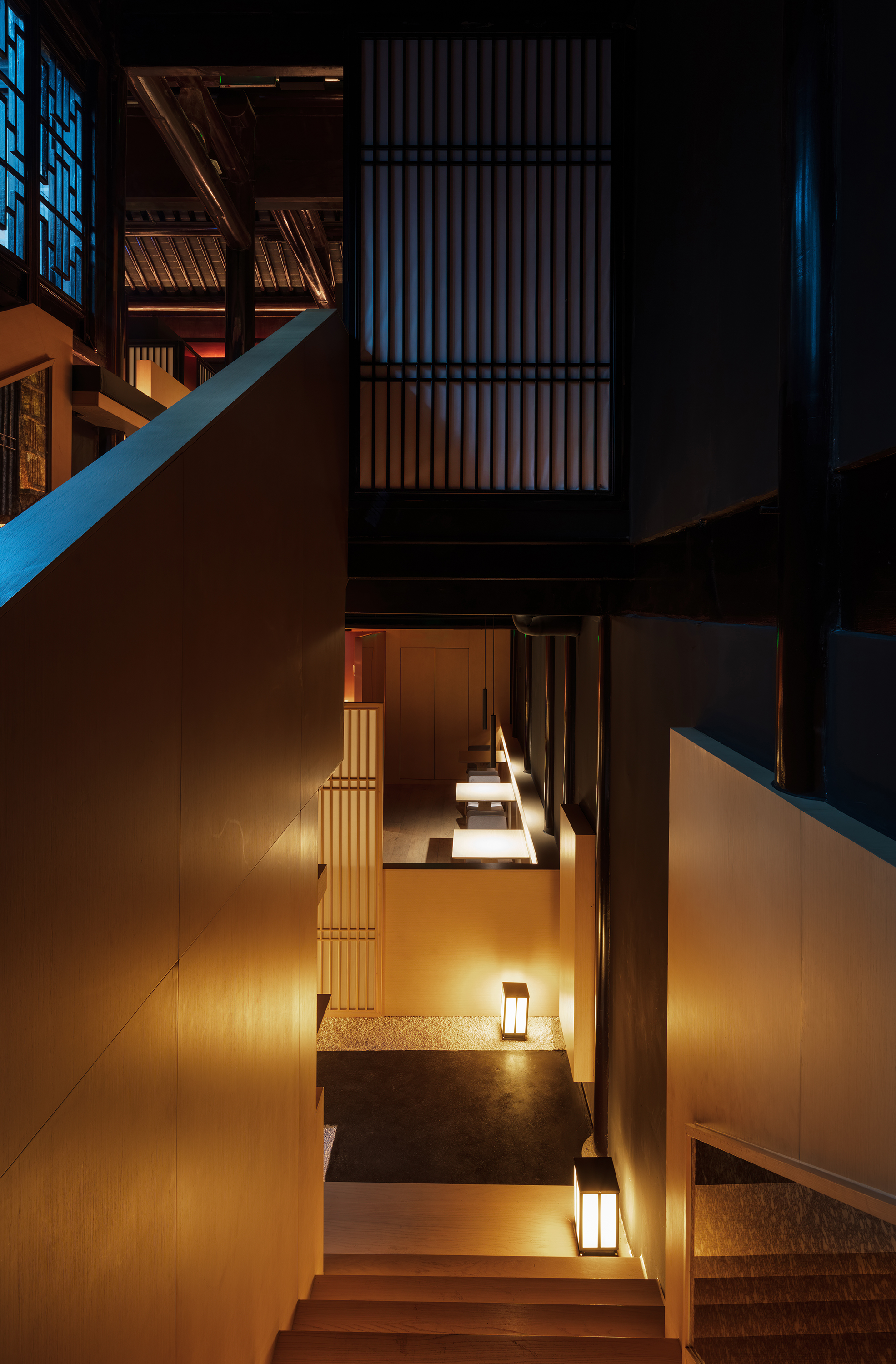 寄席位于无锡市中心的小娄巷历史风貌区,是一家高级日料店,业主希望寄席是一个空间氛围与气质俱佳的一个场所,项目场地的空间形态丰富,廊-院-庭-楼形态交织,因此设计把空间的秩序放到首位,以空间剧情的方式引人入胜,通过空间的转乘来让顾客体验到层层开合,渐入佳境。
