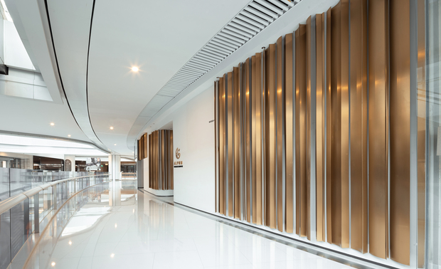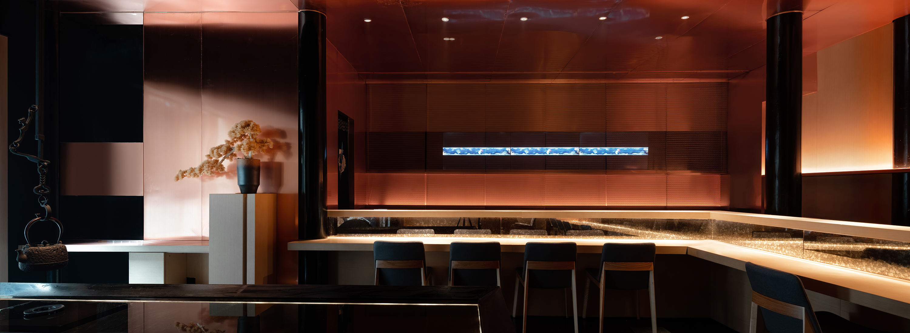 红铜作为一层的亮点提升了空间的质感,配合灯光将漫反射的光线传递各处,獐子纸透光不透影朦胧了界限