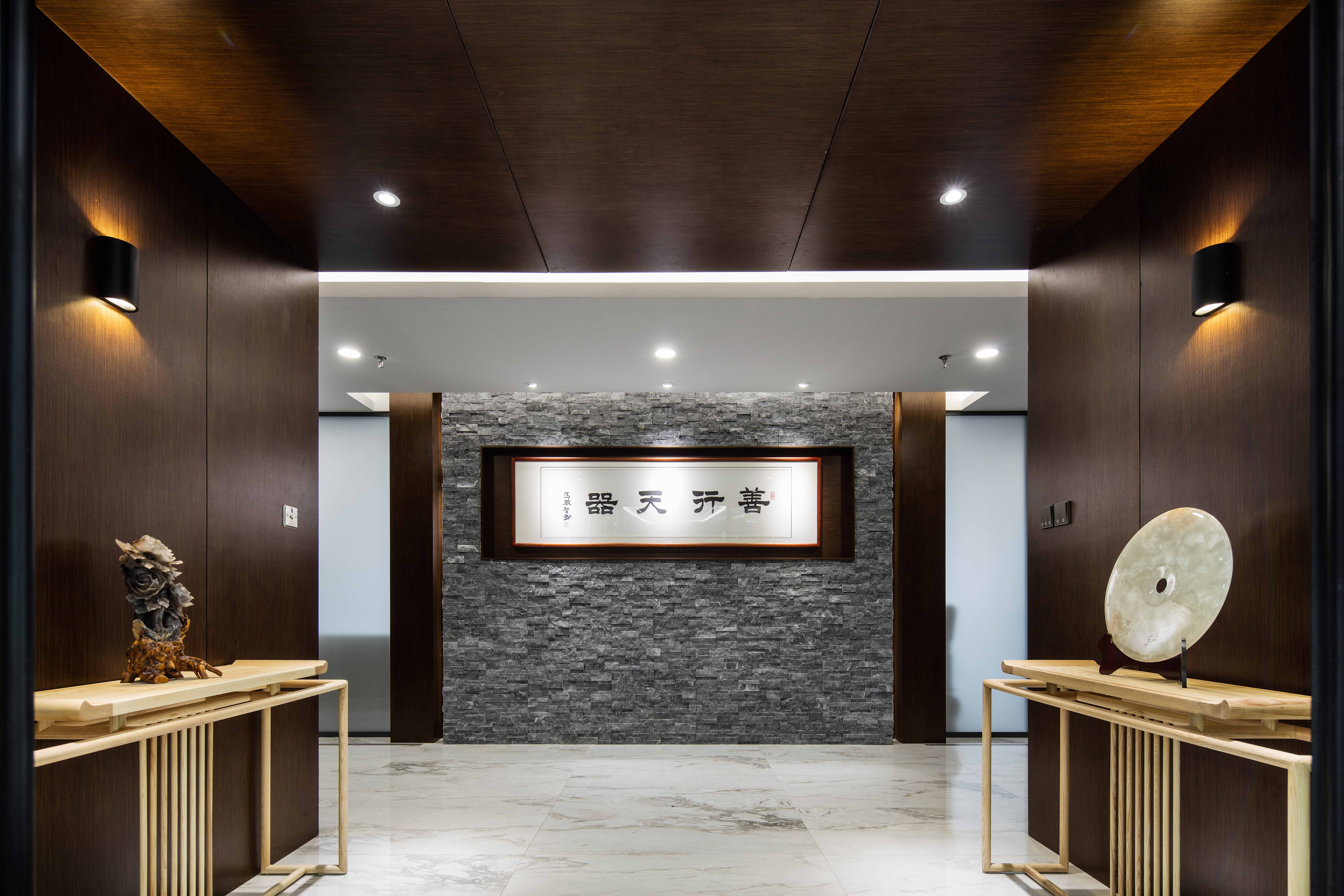 设计选材:材料上采用了深色的直纹木质品,结合火山岩,狼鳍鱼化石等材料作为基础,木质色泽偏重给环境带入中式感,火山岩及化石是以材料特性说明事务所的积淀,地面给人以中式水墨的意境,部分入口处地面有深色拼花标识,明确各个空间入口的位置。