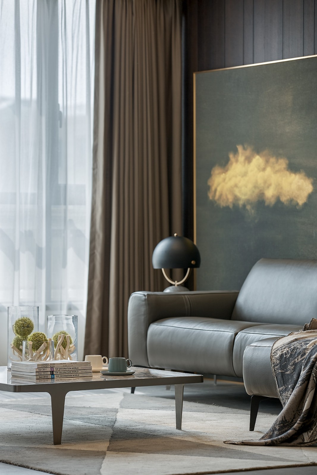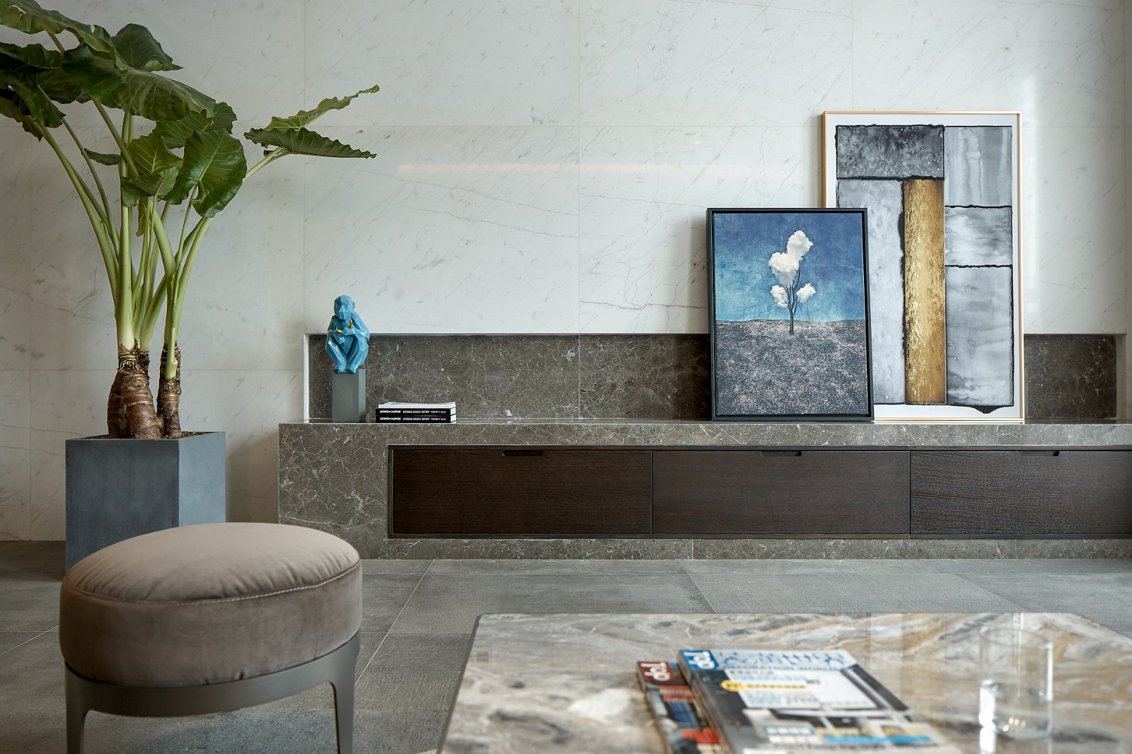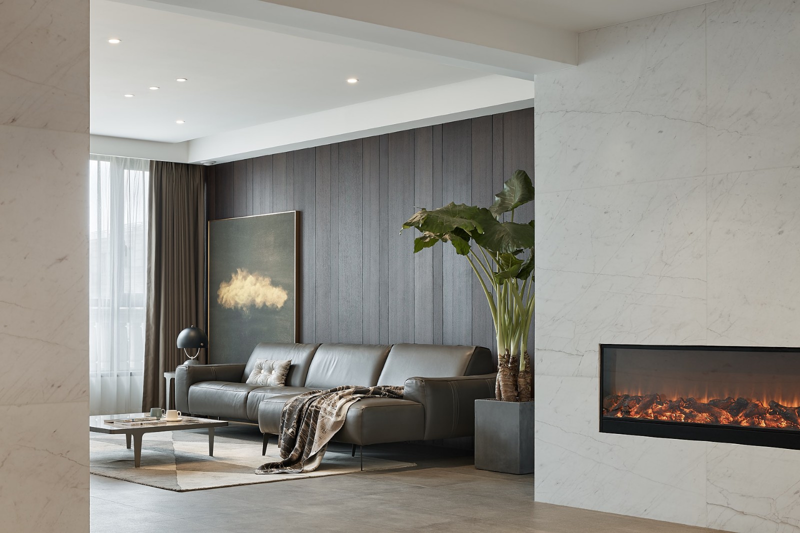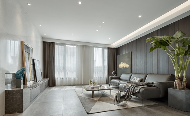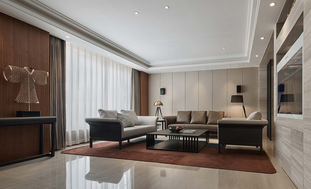 初于听、始于感。整个的空间以中性色彩为主,通常墙面的色彩为白色或者白色调,有时候局部运用色彩是为了达到某种视觉效果。家具的色彩基本为中型或者同色调配色,石材可以让空间丰富起来,有肌理的中性色能够让僵硬的表面柔和起来,同时也让客厅看起来更加温暖和亲切。 由于现代装修风格的所有间隔和障碍都被消除,所以传统意义上功能明确的客厅、餐厅和厨房空间融为一体。白色、米色、浅褐色墙面,中性色或者无特征地面色彩,突出家居、艺术品和饰品,简介、几何形沙发由靠垫点缀色彩。