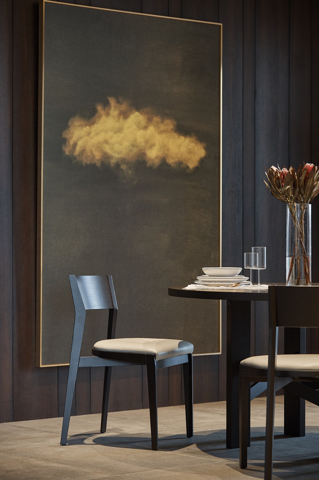 空间意境:往往已经与客厅和厨房融为一体,所以已经没有传统意义上独立的餐厅空间,而是成为了一个用餐区域。在这个区域中间,只有别具一格的餐桌椅、吊灯和艺术品。
