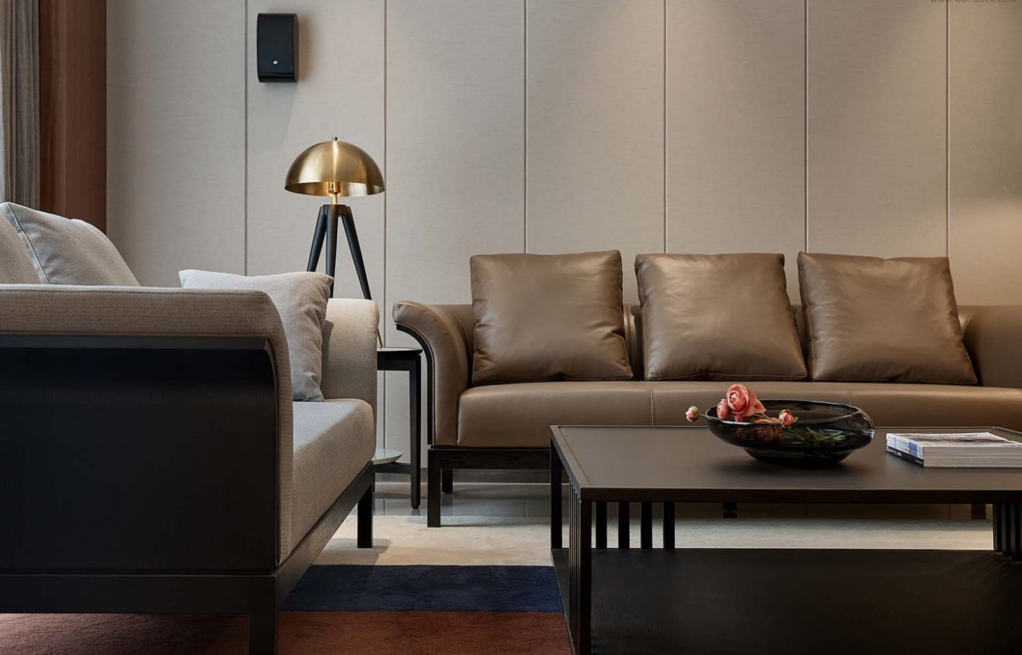 客厅 Living Room 客厅搭配以自然的棕灰为主色调,将质感性较强的棕色皮质沙发、金属饰品等挑动空间的品质感。实木、金属和布艺皮质、和木质相结合的家具相互碰撞构成了空间的层次感和品质感。