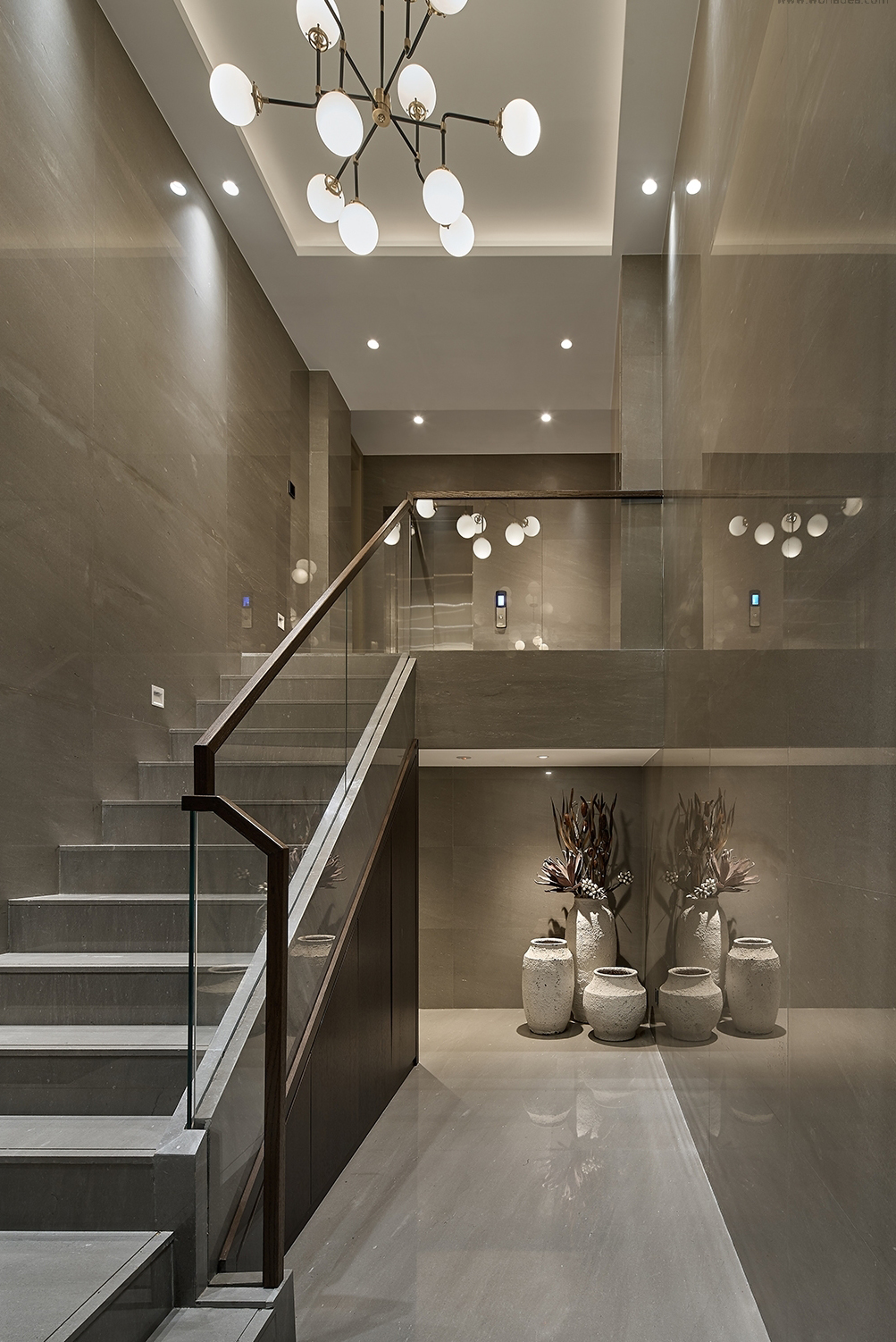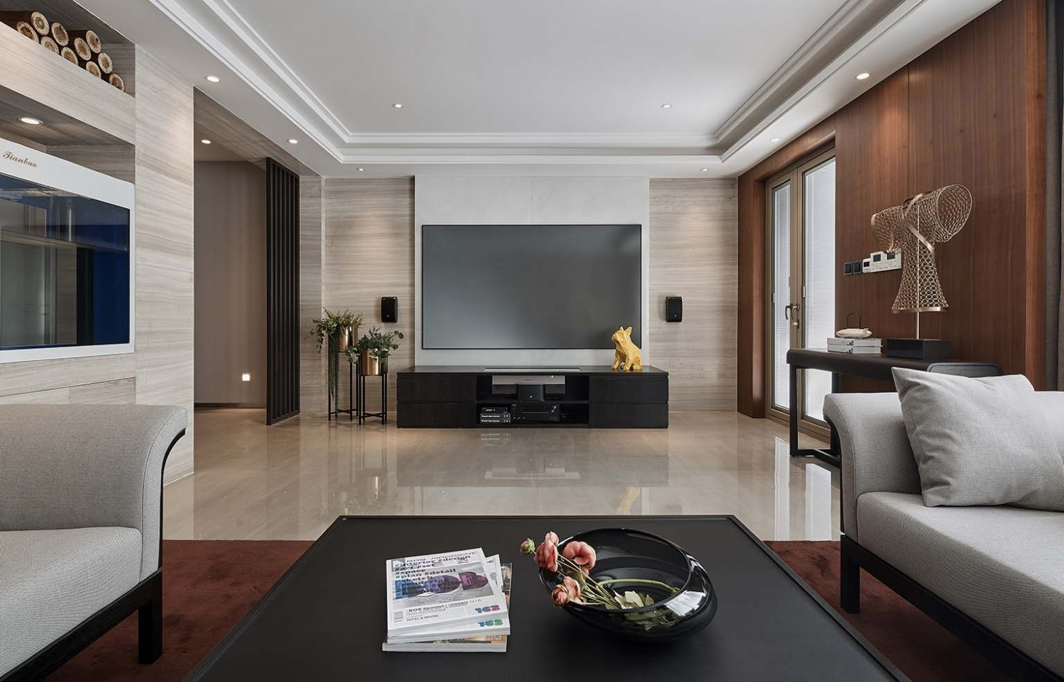 客厅搭配以自然的棕灰为主色调,将质感性较强的棕色皮质沙发、金属饰品等挑动空间的品质感。实木、金属和布艺皮质、和木质相结合的家具相互碰撞构成了空间的层次感和品质感。 -