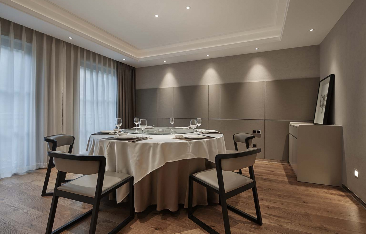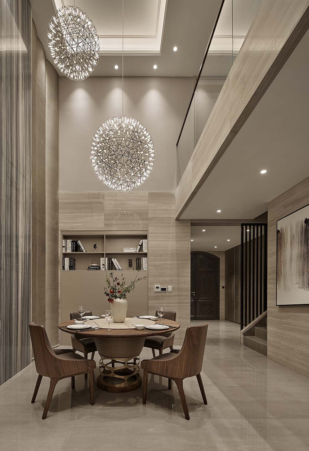 餐厅 Dining Room 为了增大整个一层的空间感,餐厅的挑空间的设计,相连链接了入户门厅和客厅之间的空间,增强了一层空间的连续性和空间感,有变的十分有趣味性。