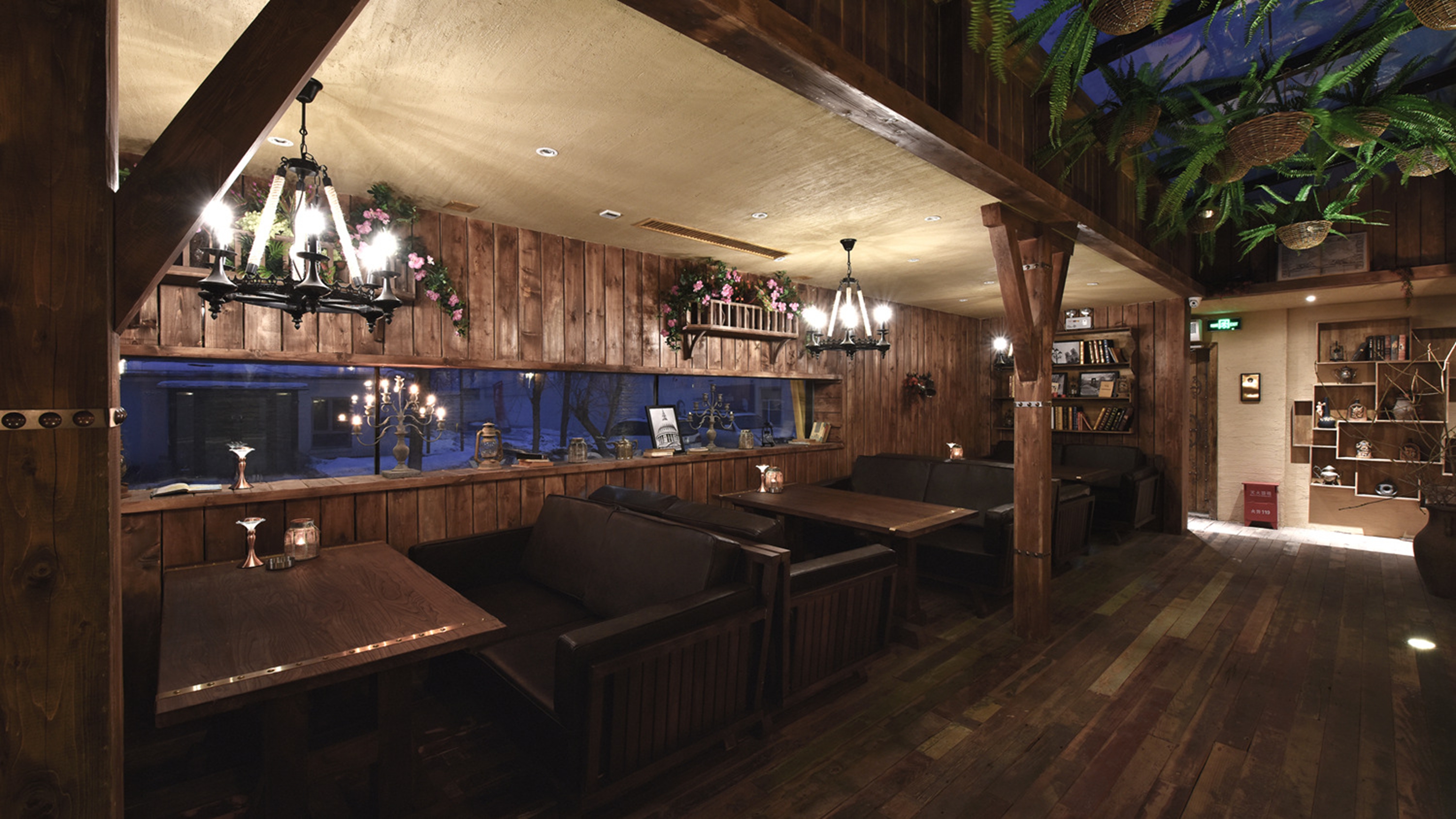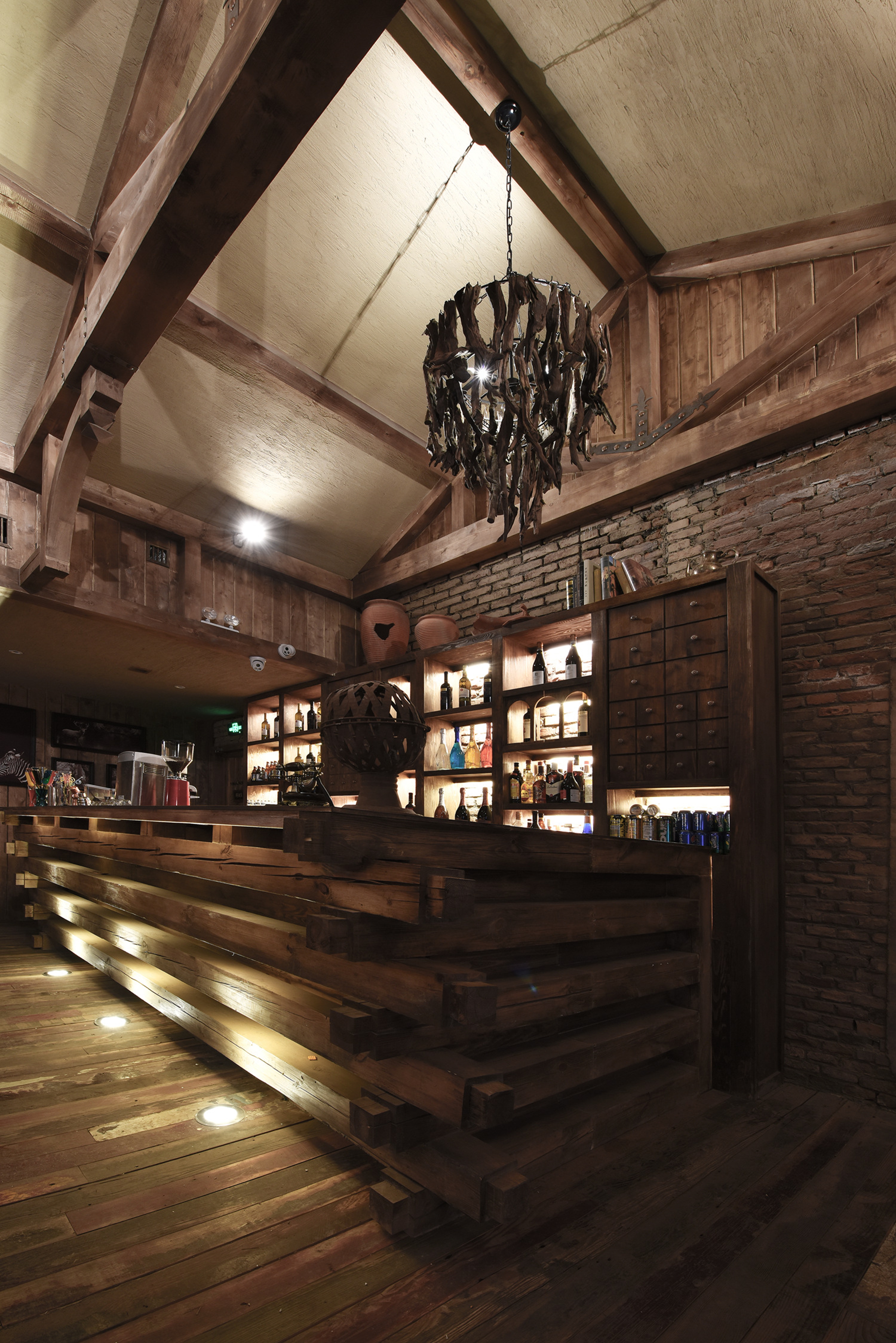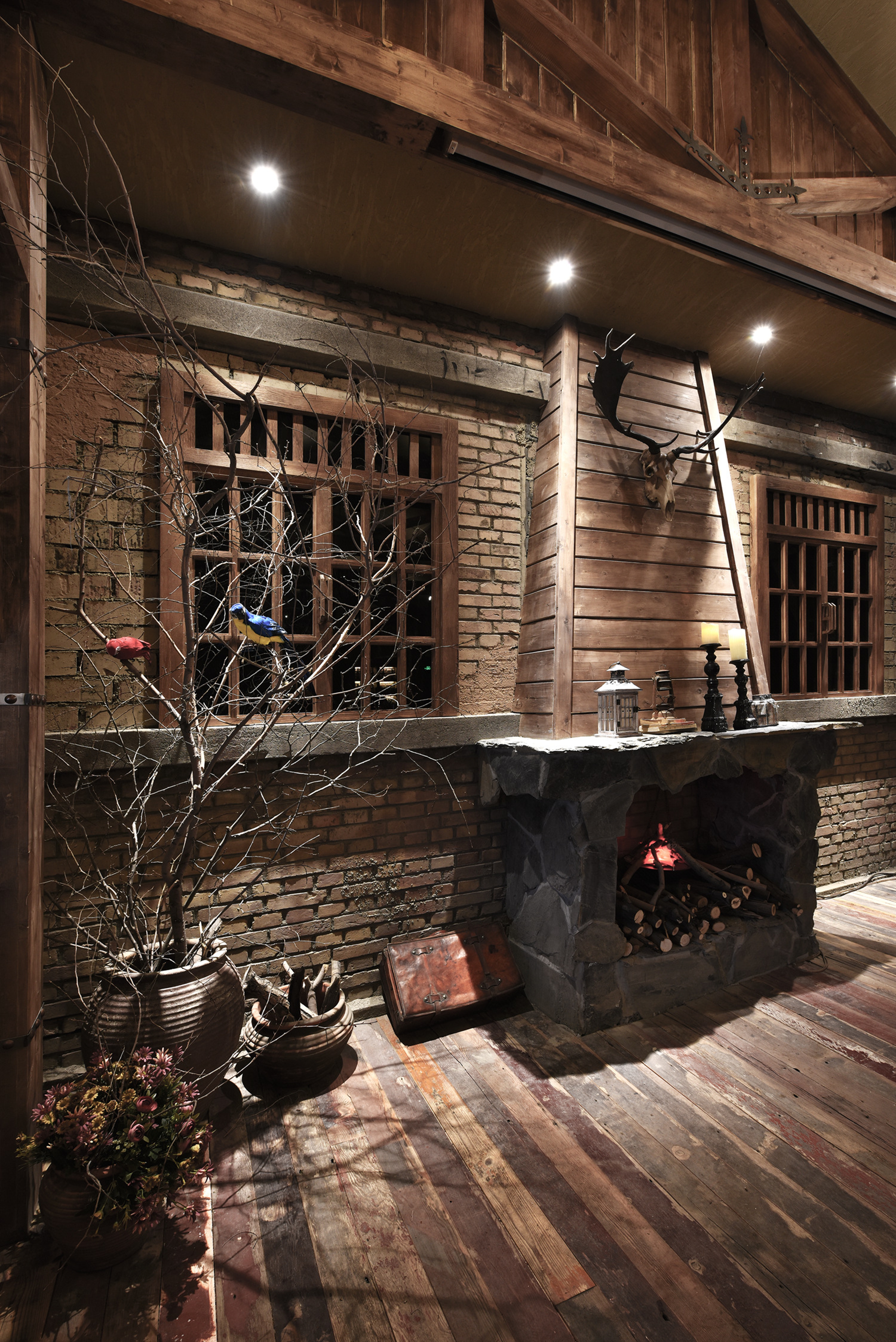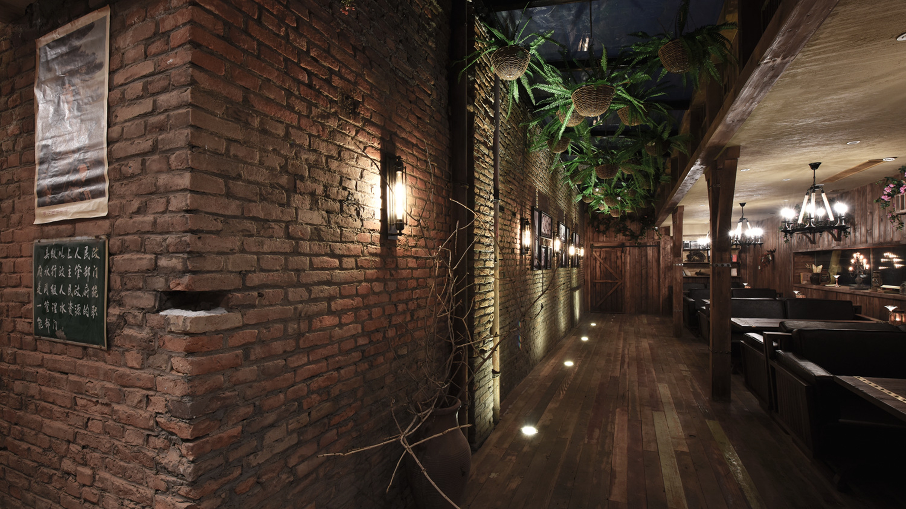 墙面采用老木板与红砖相结合,大厅顶部采用木结构,整个空间的氛围更加温馨、舒适。大厅定制主灯,让整个空间更加有年代感。