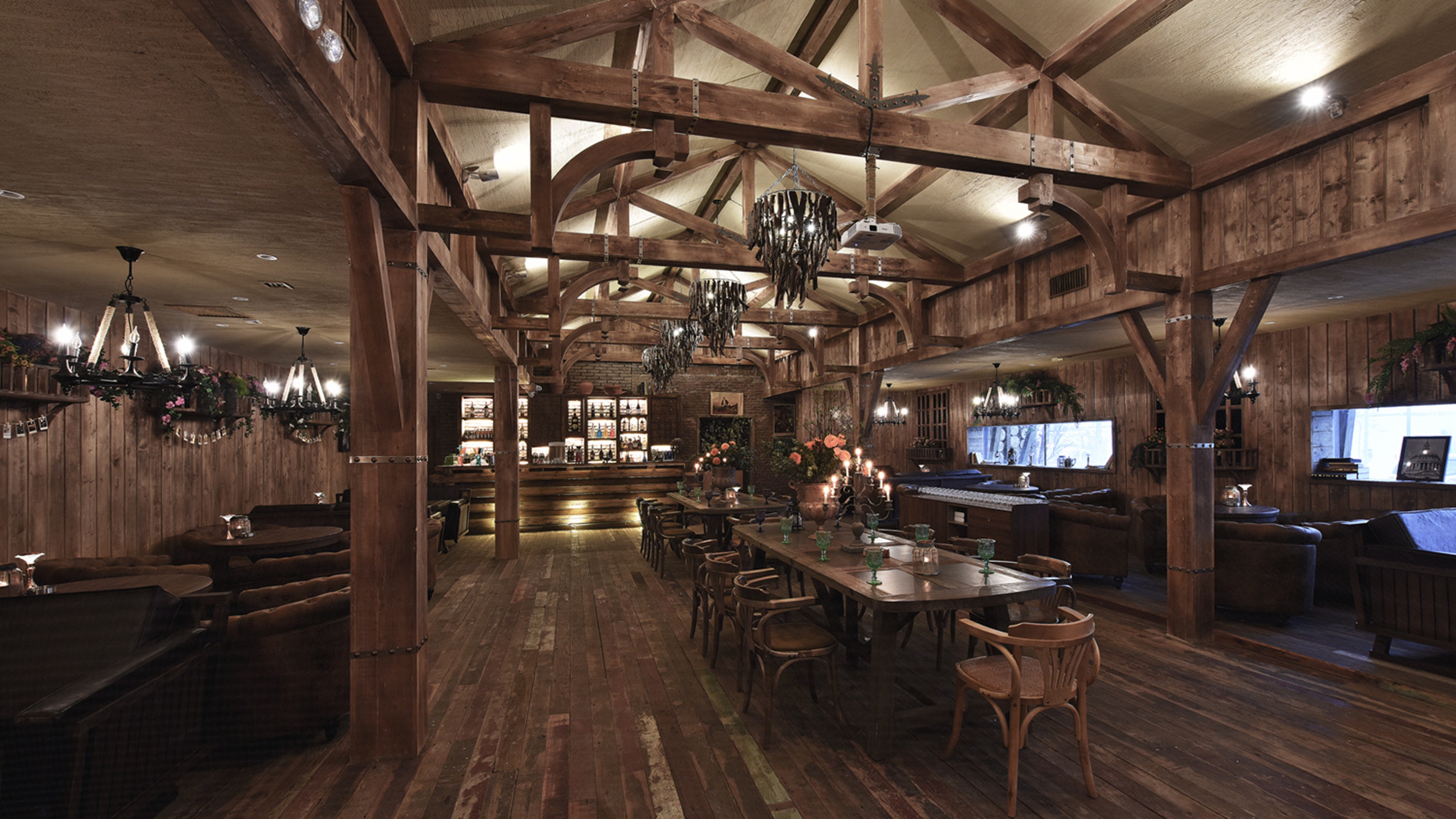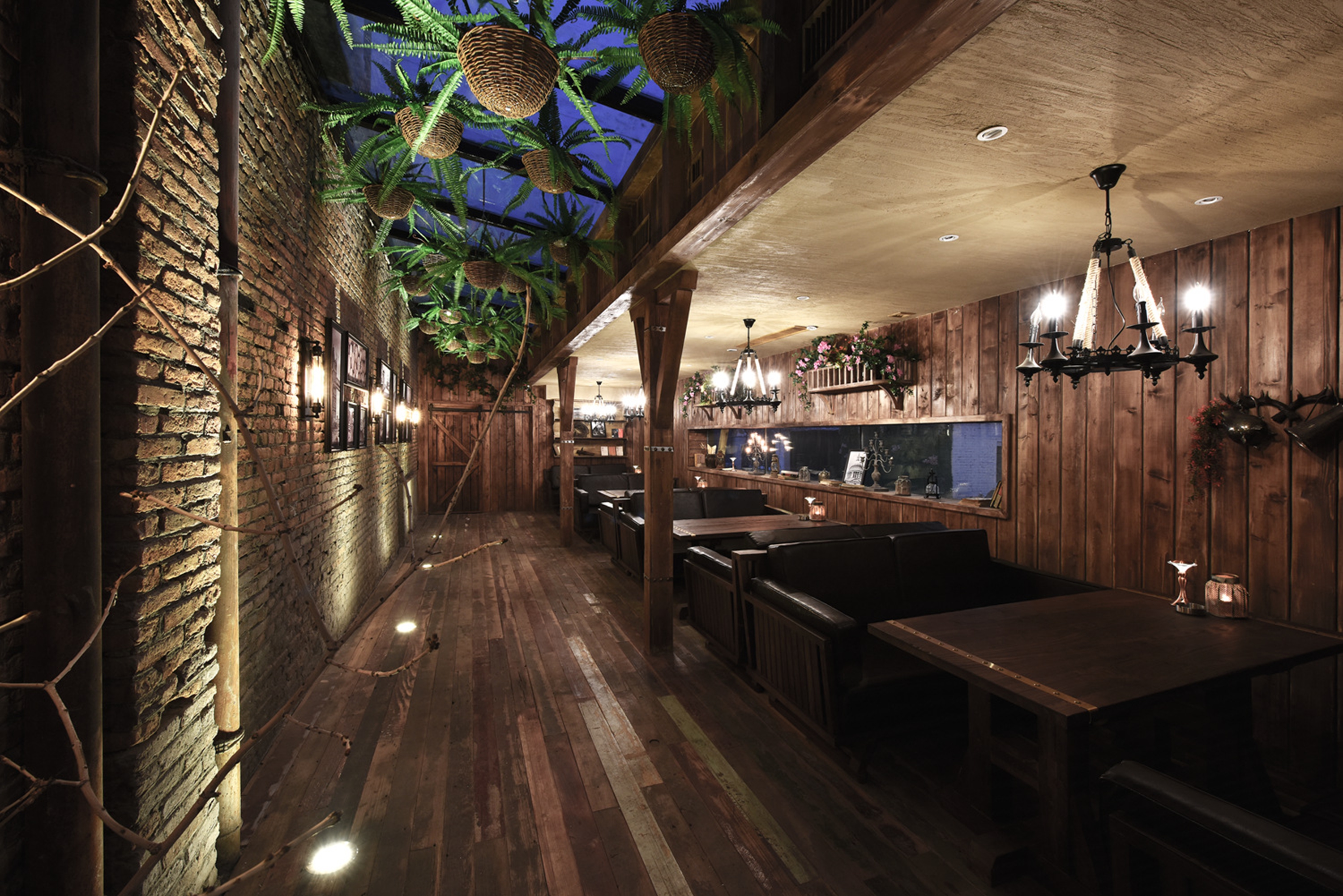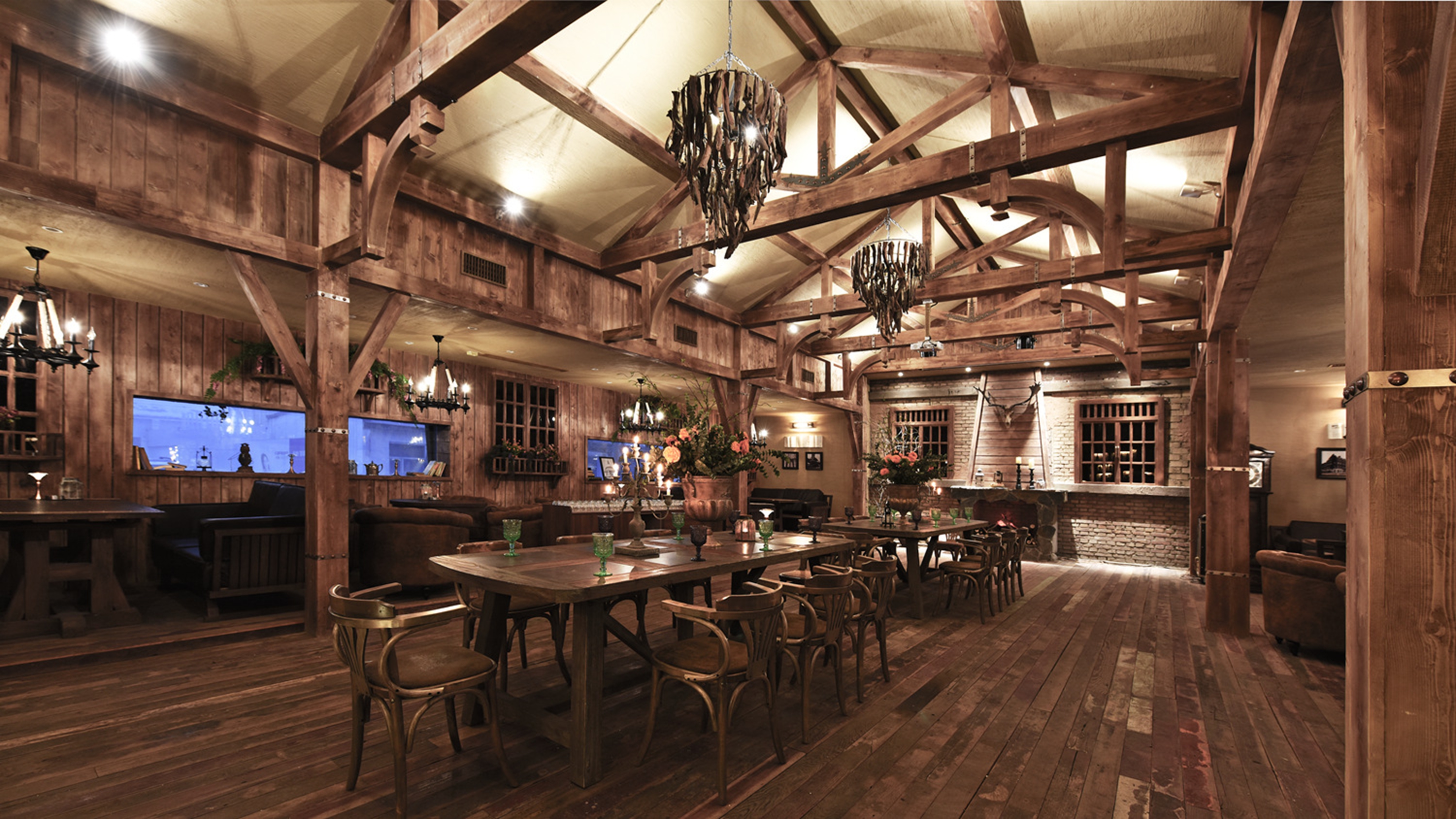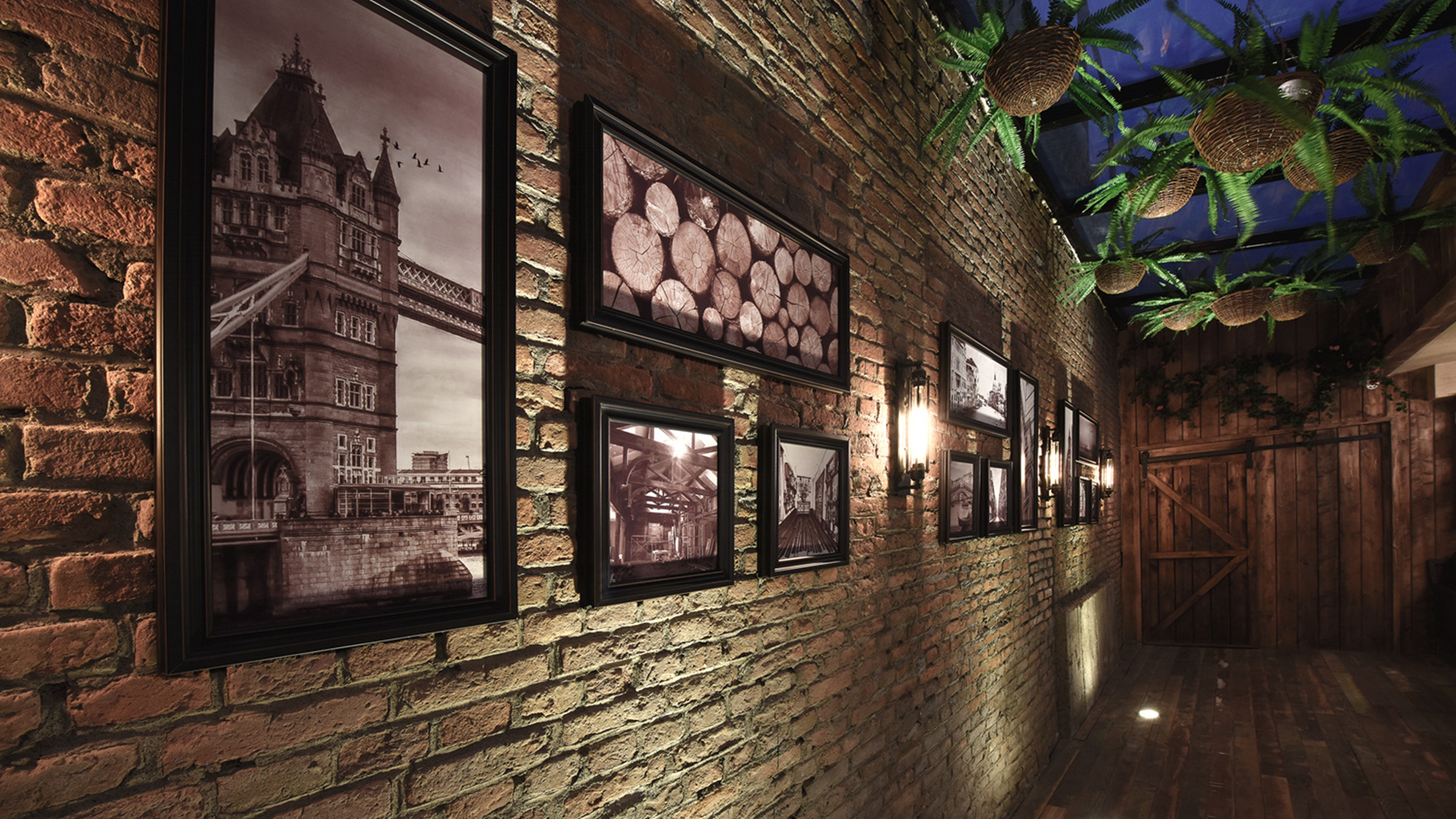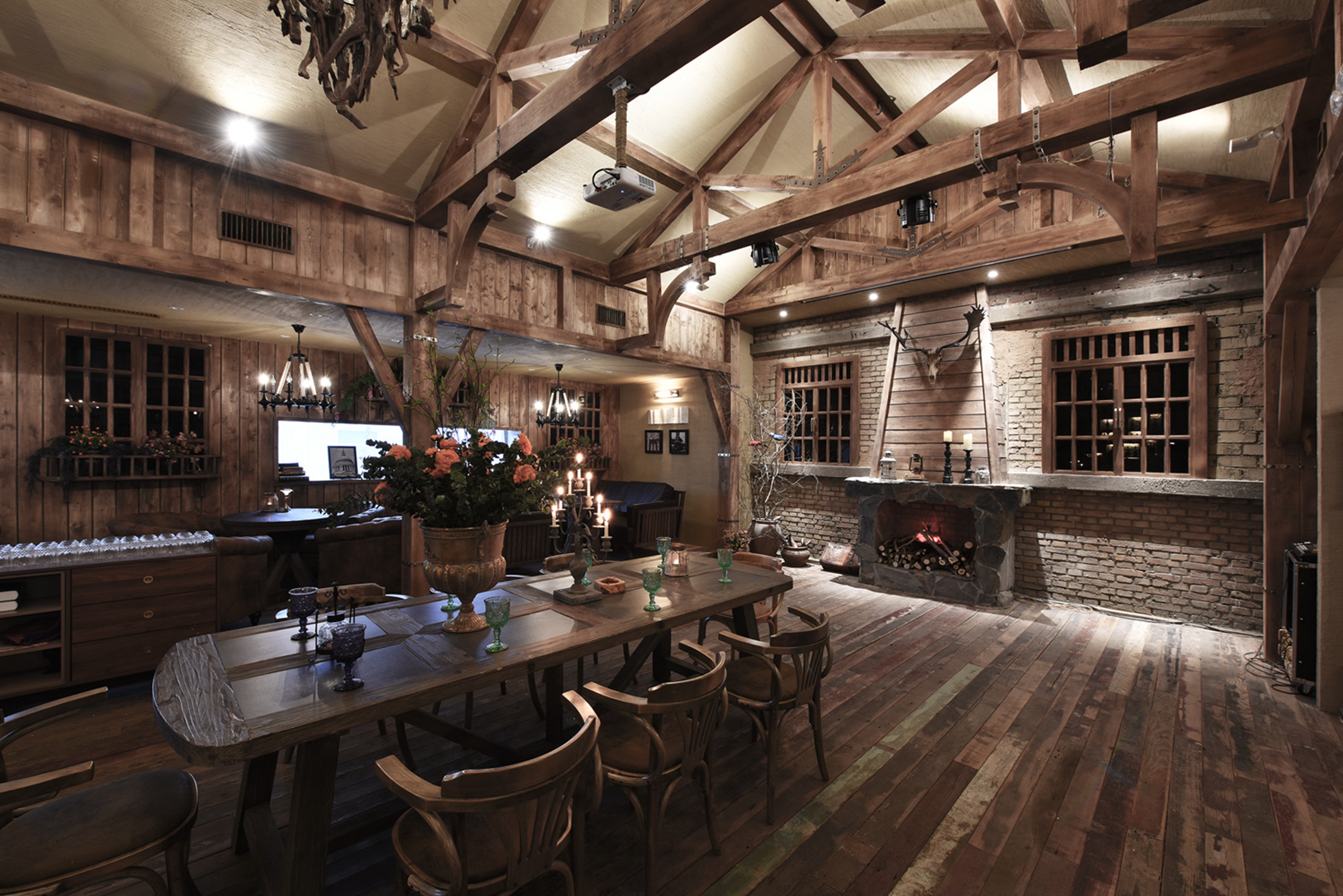 墙面采用老木板与红砖相结合,大厅顶部采用木结构,整个空间的氛围更加温馨、舒适。大厅定制主灯,让整个空间更加有年代感。