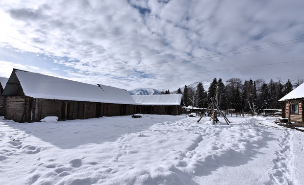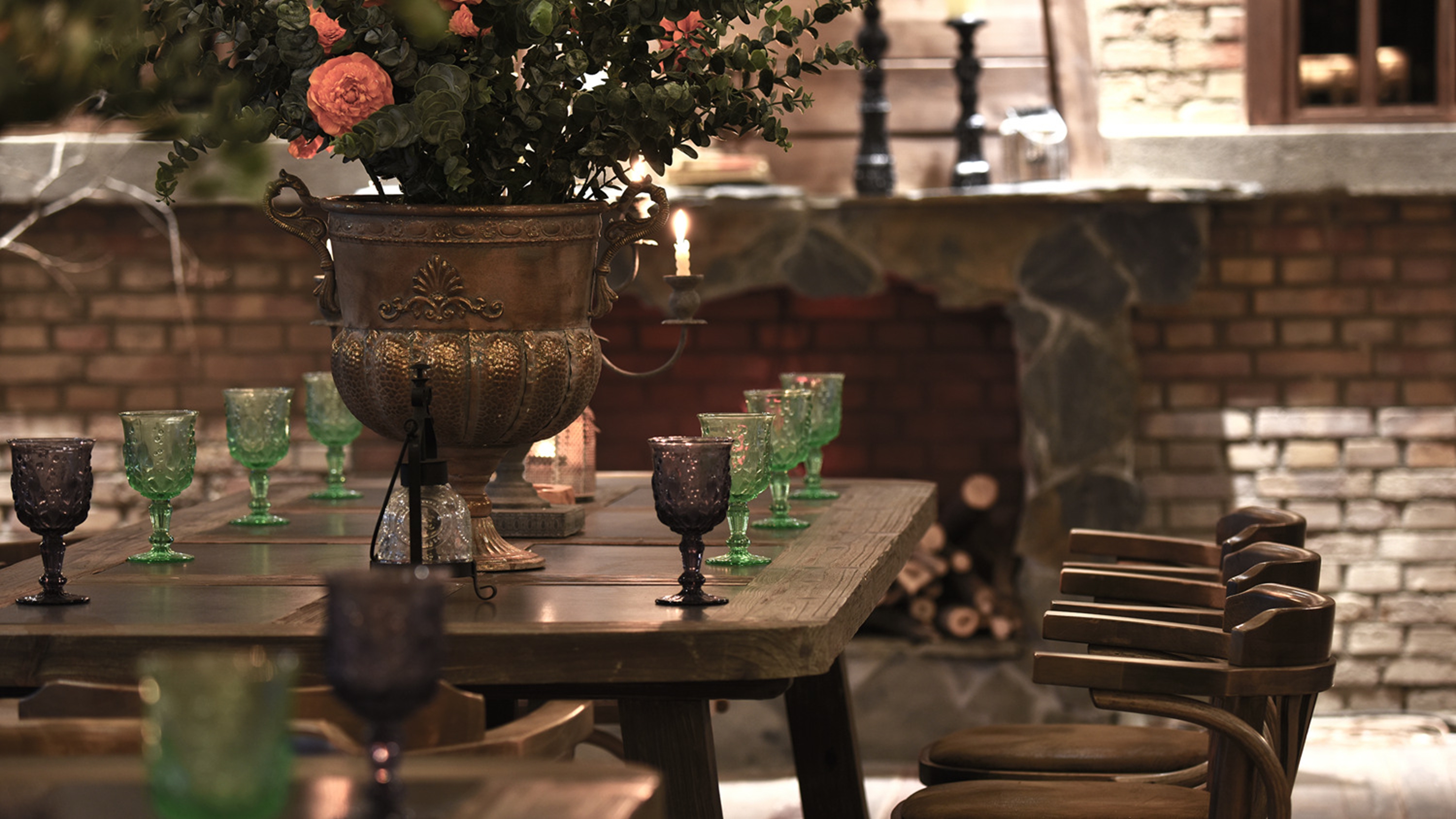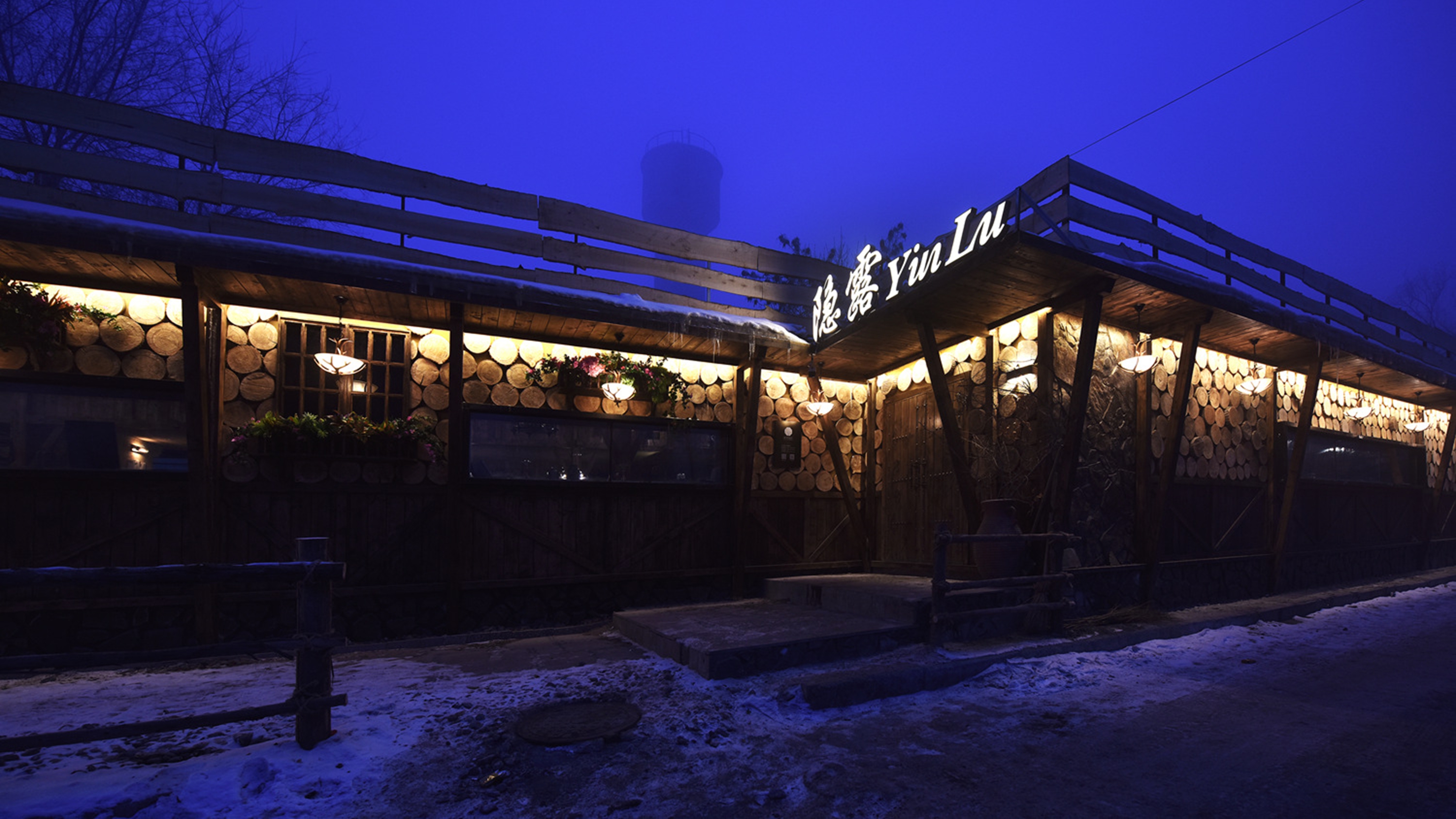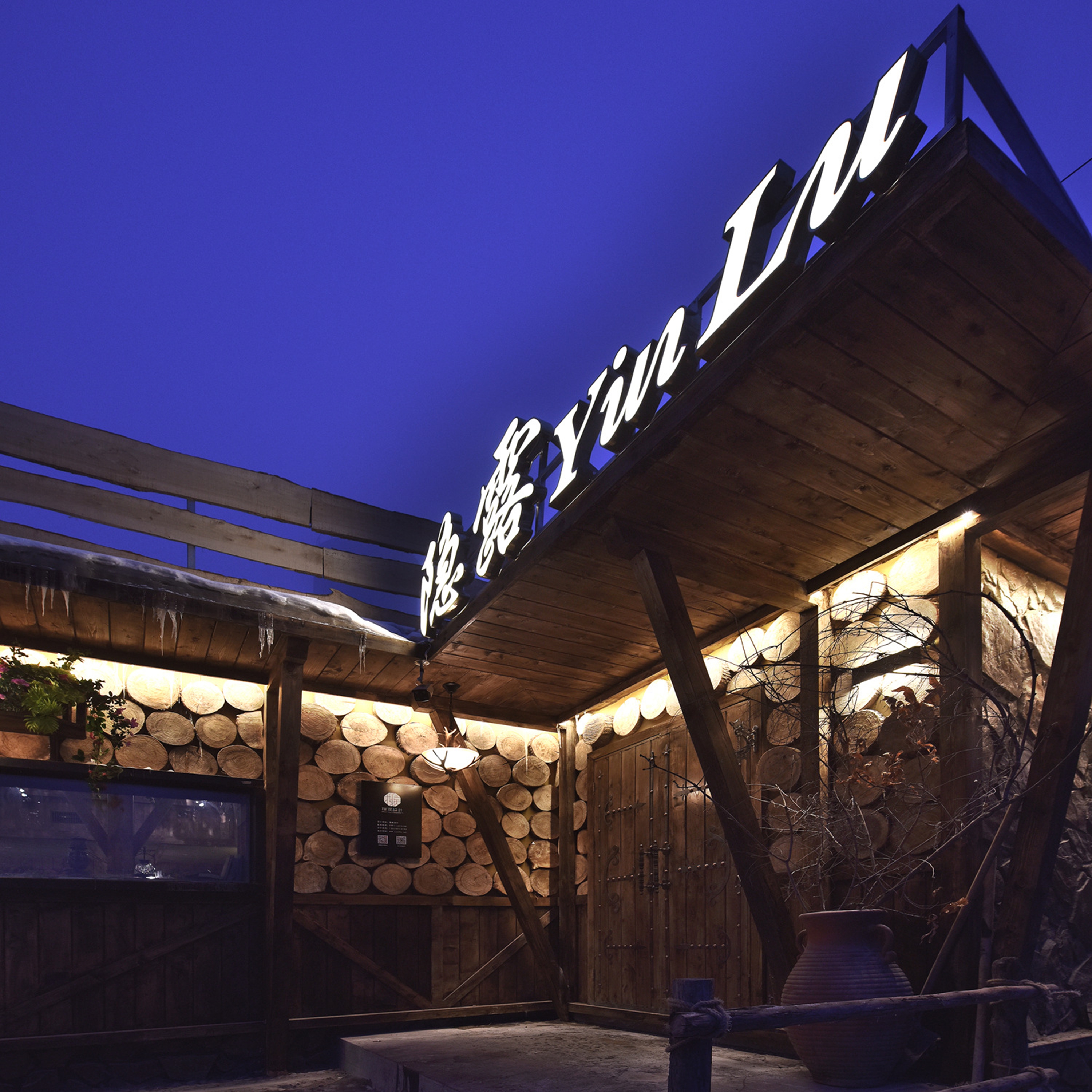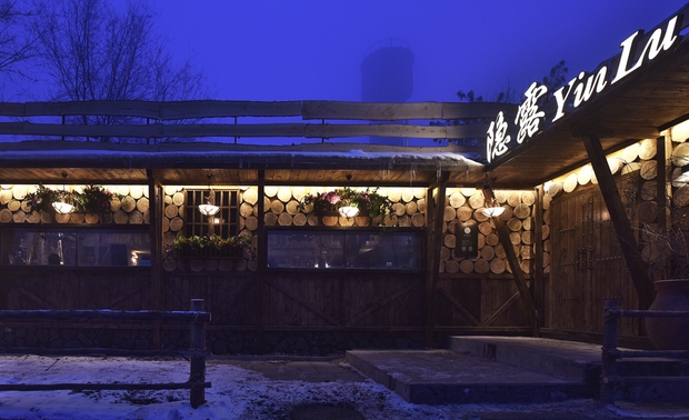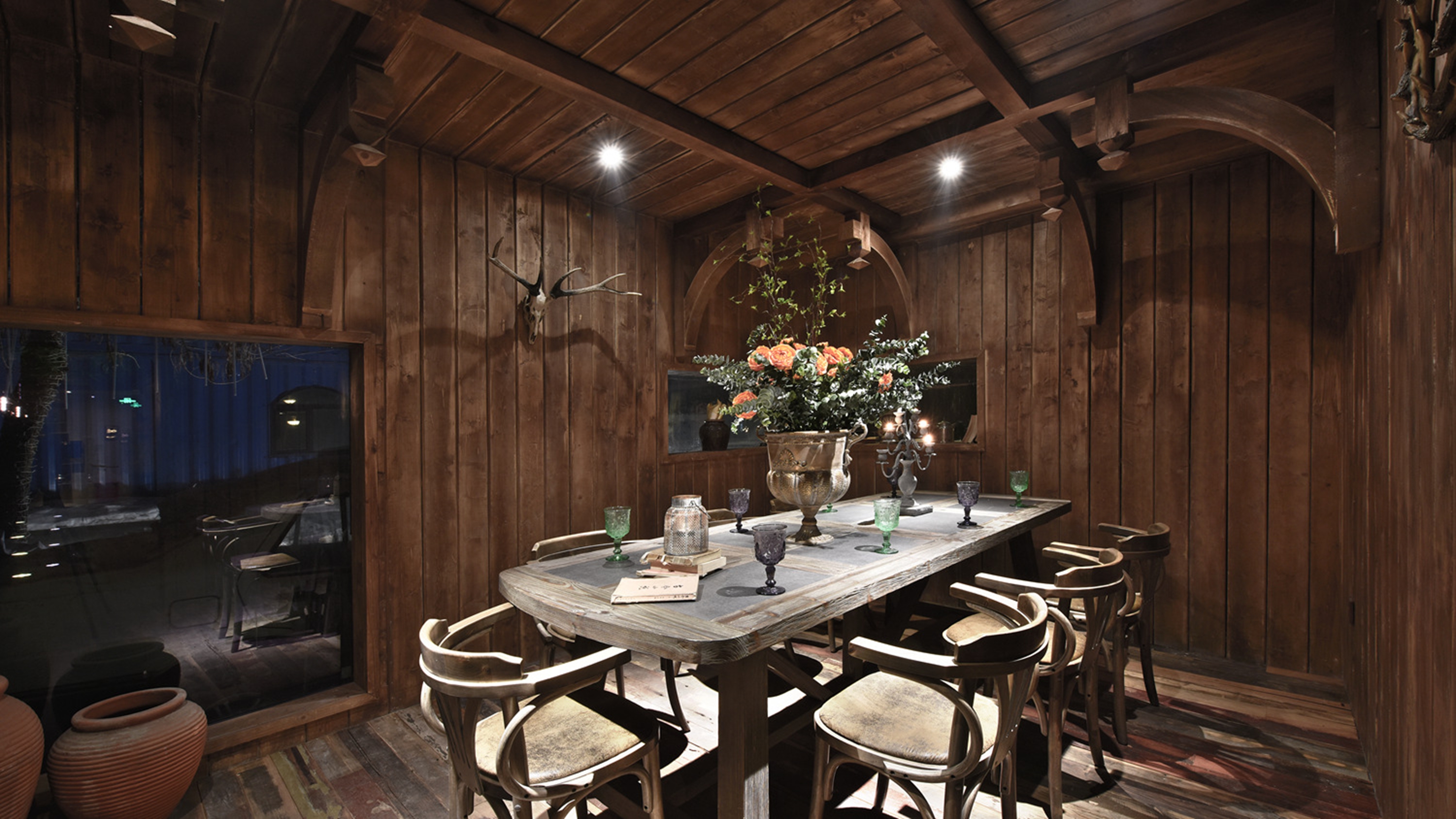 门头用麻绳连接老原木,将这一区域围合起来形成独立的院落。入口的木门让整个院落显得格外神秘,让进门更加有仪式感。花艺让整个空间变得软化、文艺、更有情调。