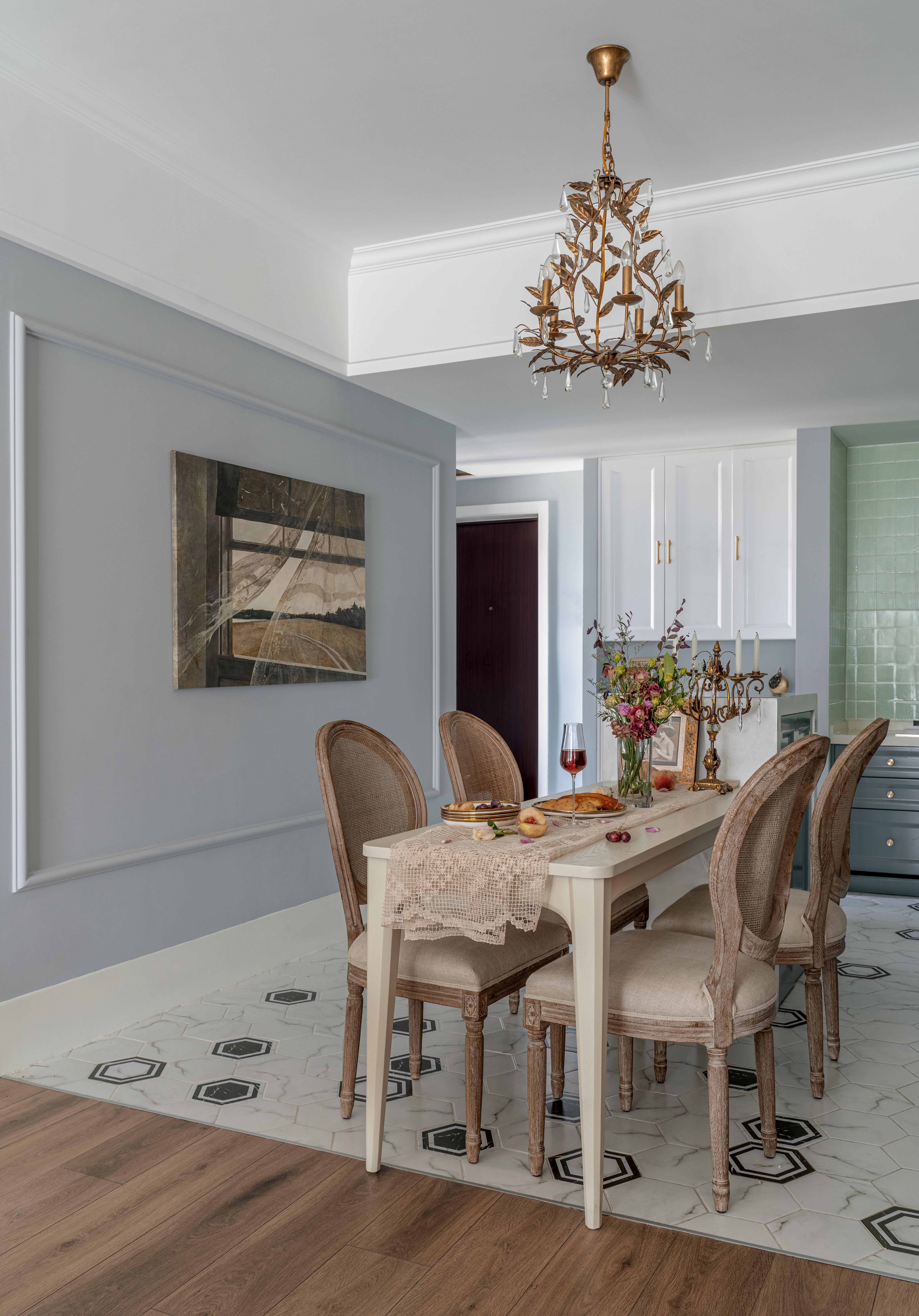 实木复古桌凳混搭出复古少女风,每次优雅烹饪,品味法式慵懒,古棕色挂画和精致藤蔓灯具将氛围融满,小唯美无处不在。