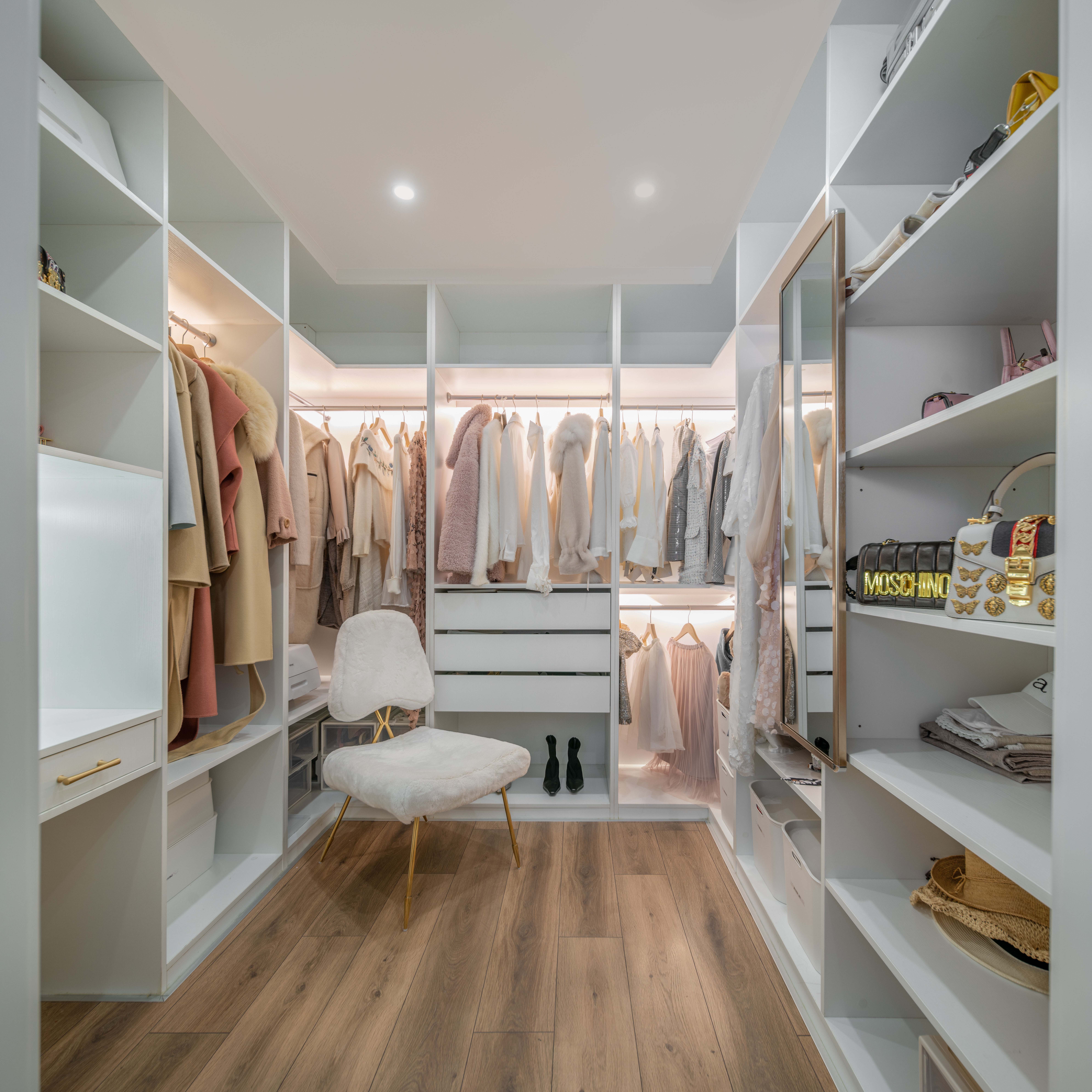 衣物为主角,受托于简洁实用的柜体,嵌上金属把手,挂上镜面画框,金属座羽毛垫,一切换装装扮都浪漫无比。