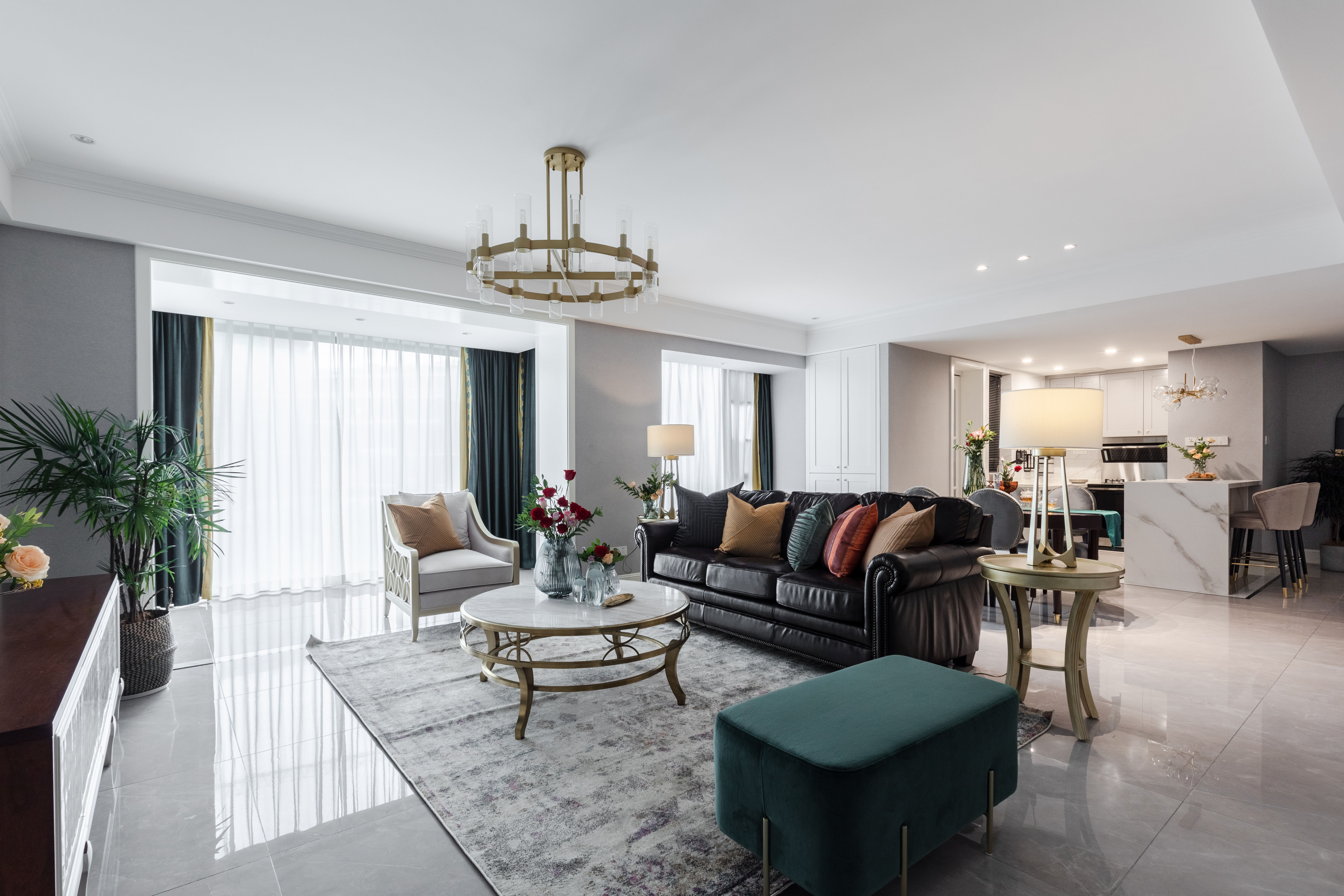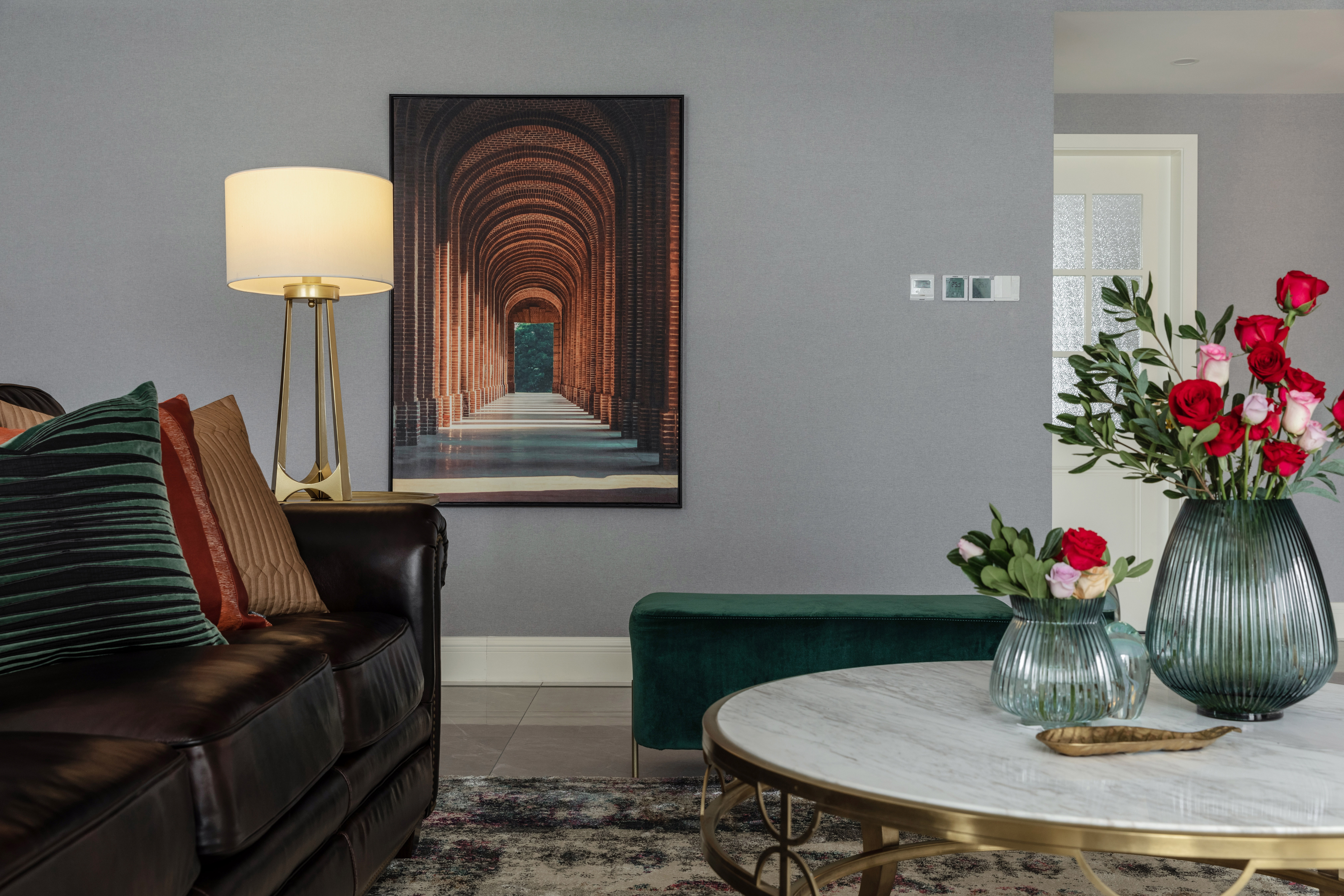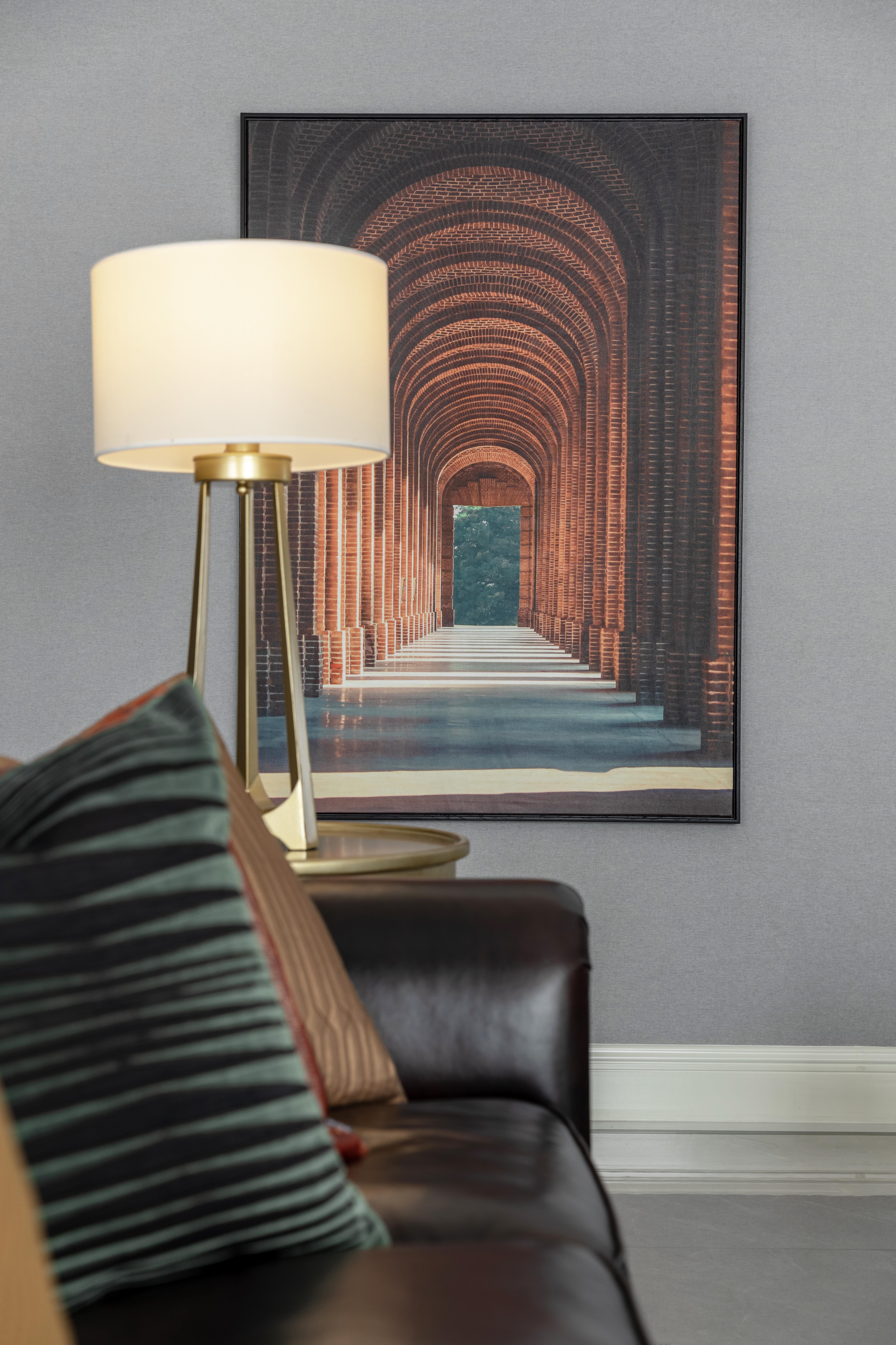 客厅选择了极具经典的美式深褐色皮艺沙发,金色的铆钉细节配合茶几与灯具的香槟金,提升了软装氛围的轻奢质感。抱枕橙黄色系的布艺,让空间在颜色和氛围上能有些柔和的跳动,也不会过于浮夸。客厅的过道墙面选用了一幅建筑装饰画,规律性的拱门图案给了整个空间不一样的故事性趣味以及张力,也是现代与复古的一次精妙碰撞。