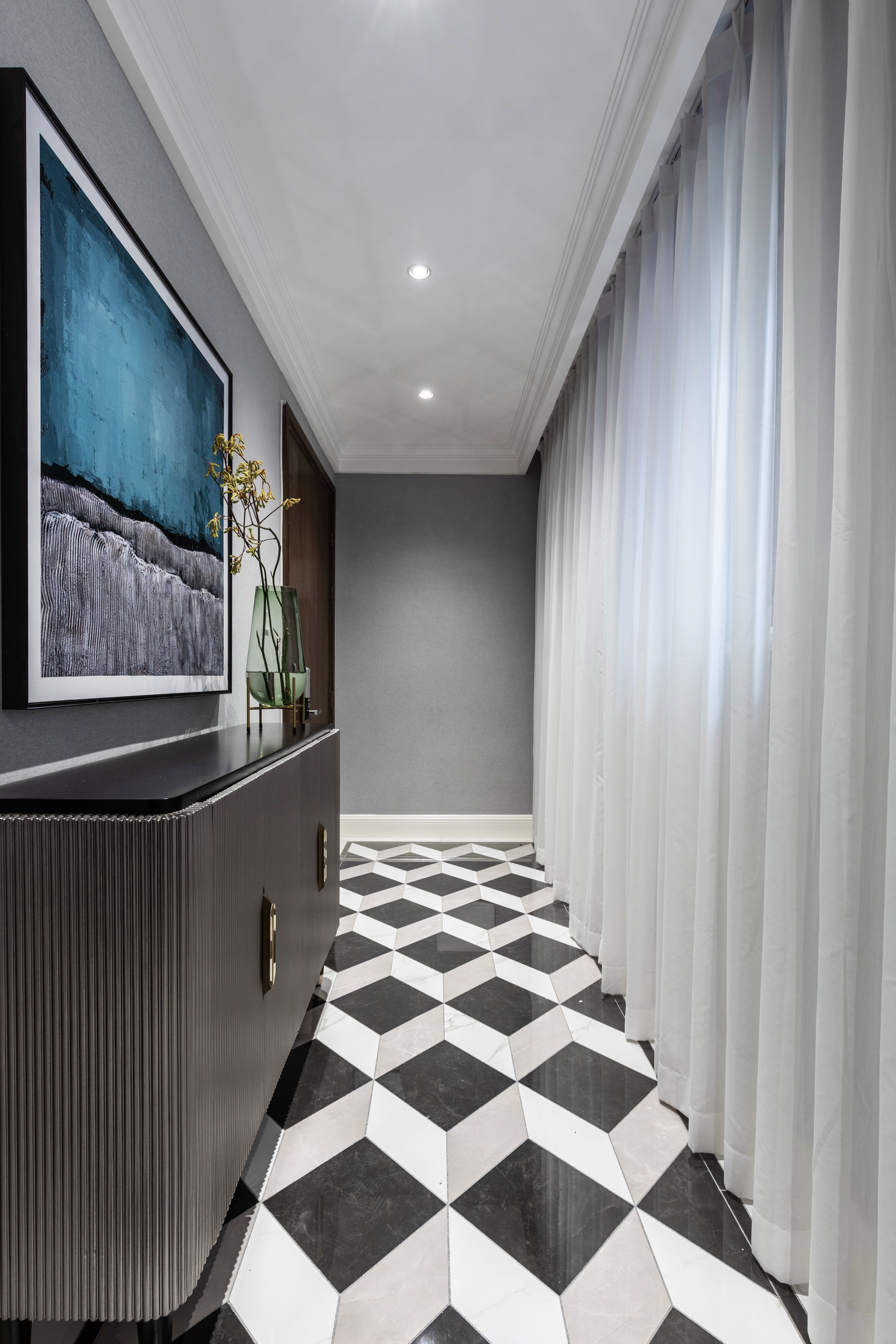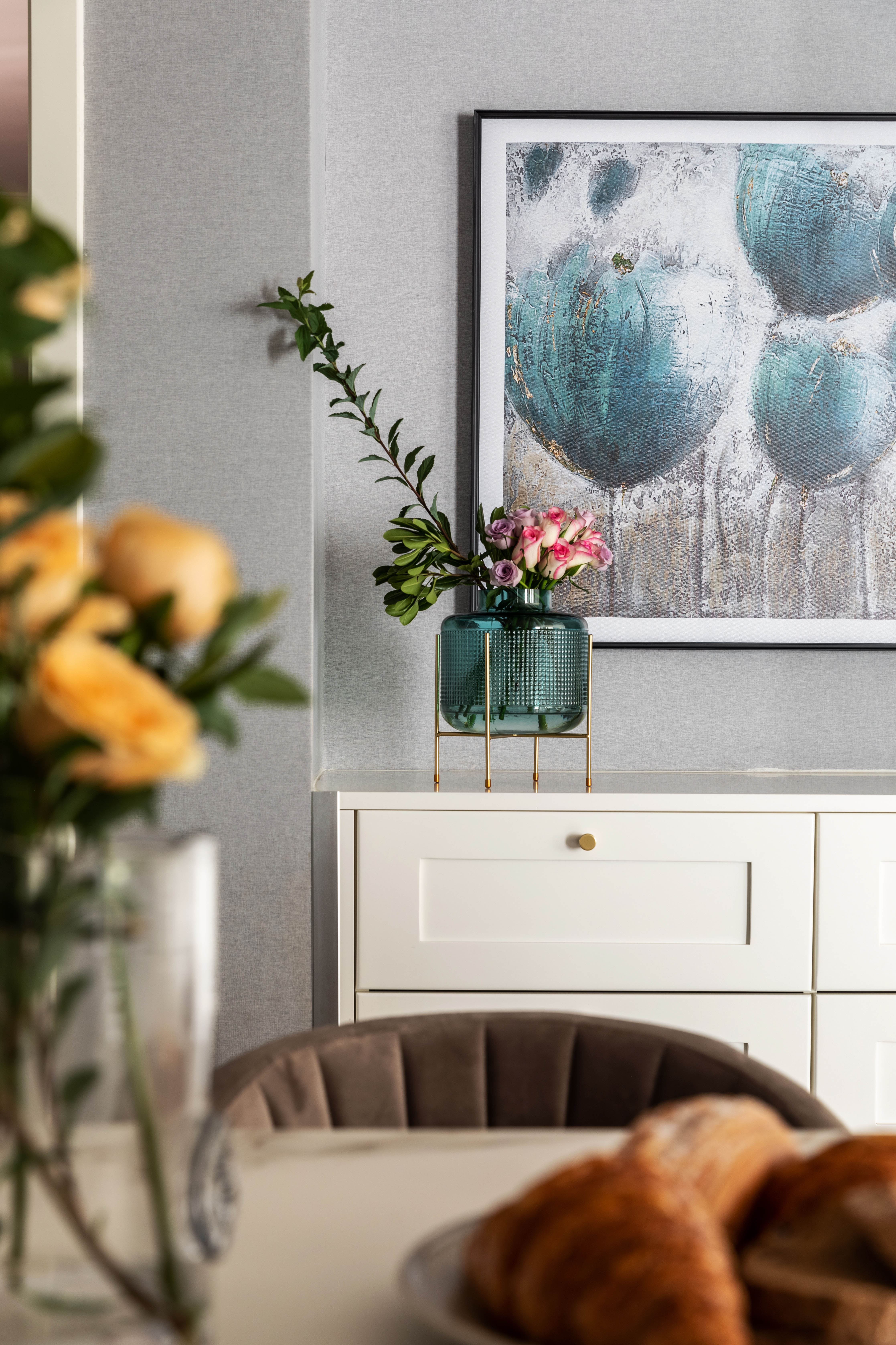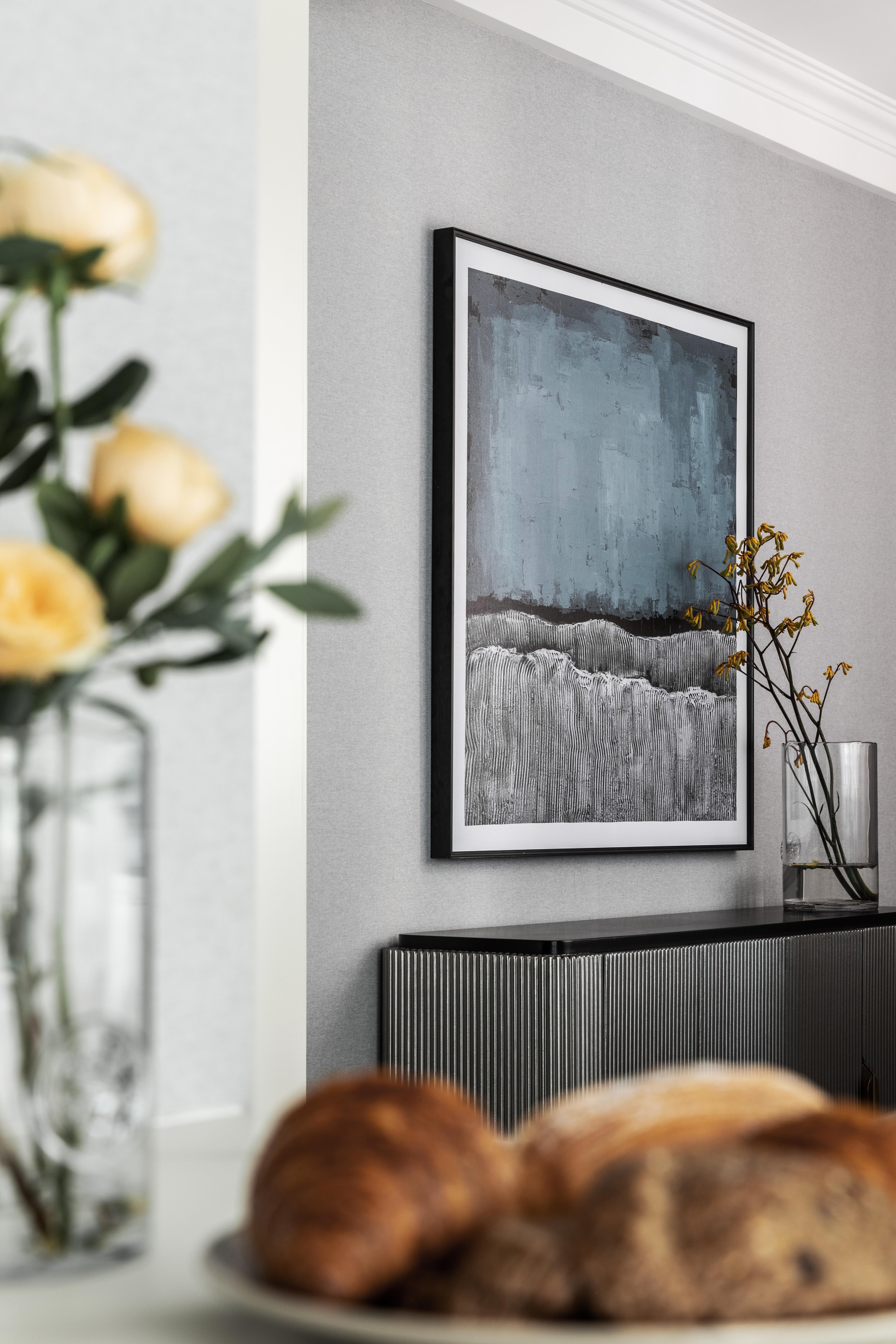 玄关的位置用一副蓝色格调挂画配上灰色的墙面,花艺的黄色和浅绿色搭配起来,蓝黄绿三色在这个空间显得非常和谐,带来一份舒适和优雅。玄关柜的柜体带有竖向的线条肌理,所以挂画的选择时,我们特地选了和柜体有同样肌理感的图案,仿佛让肌理在空间里延伸,生长。