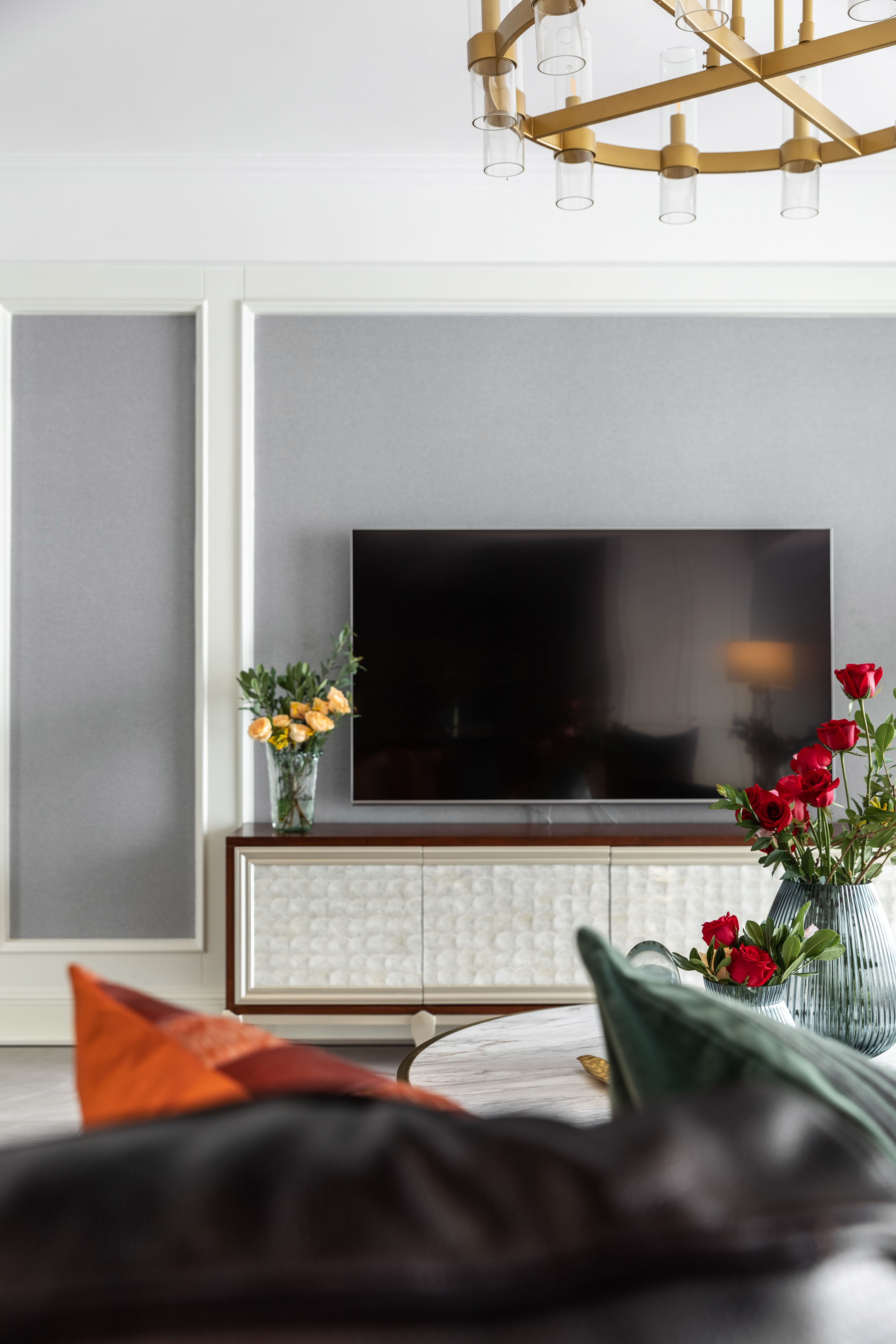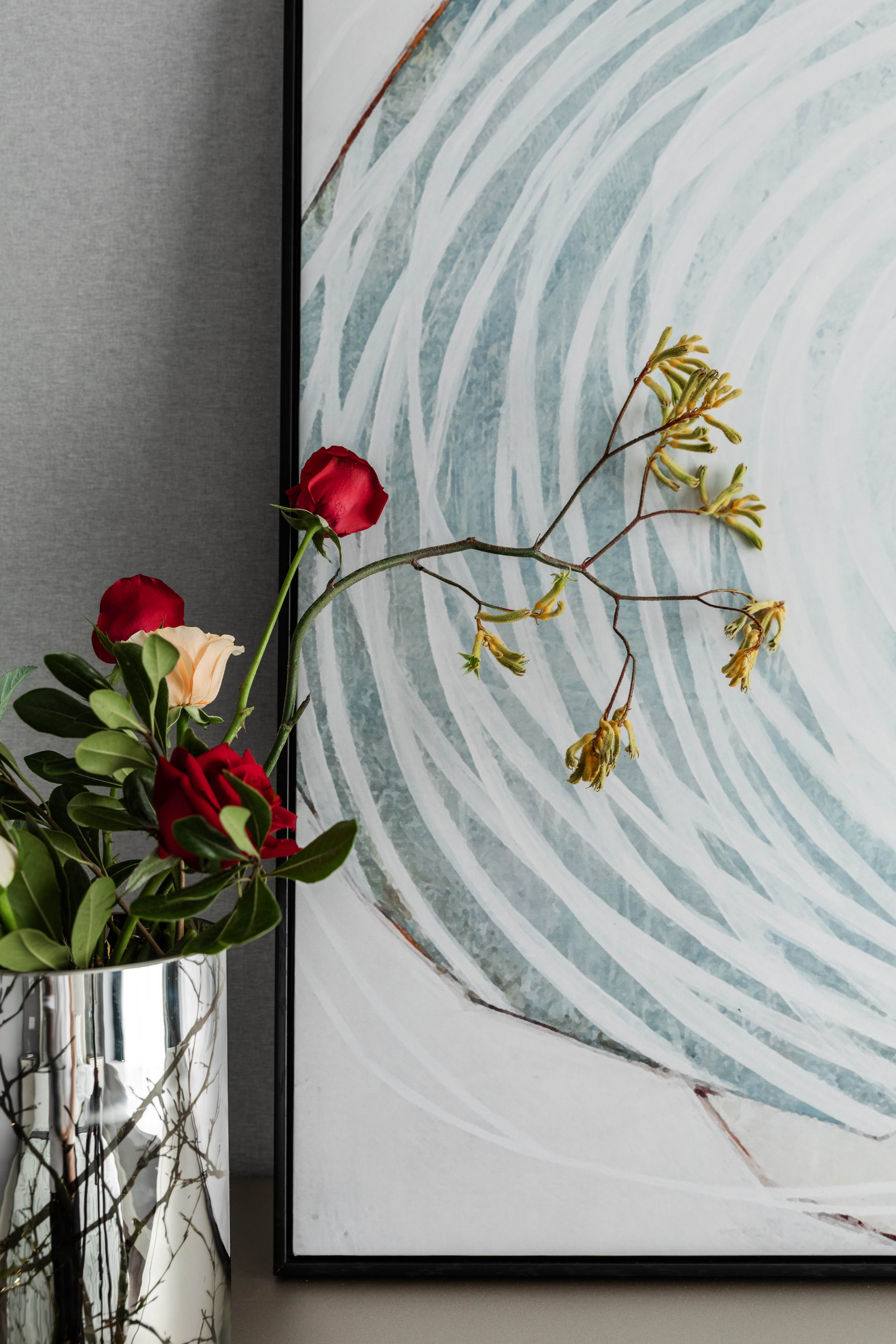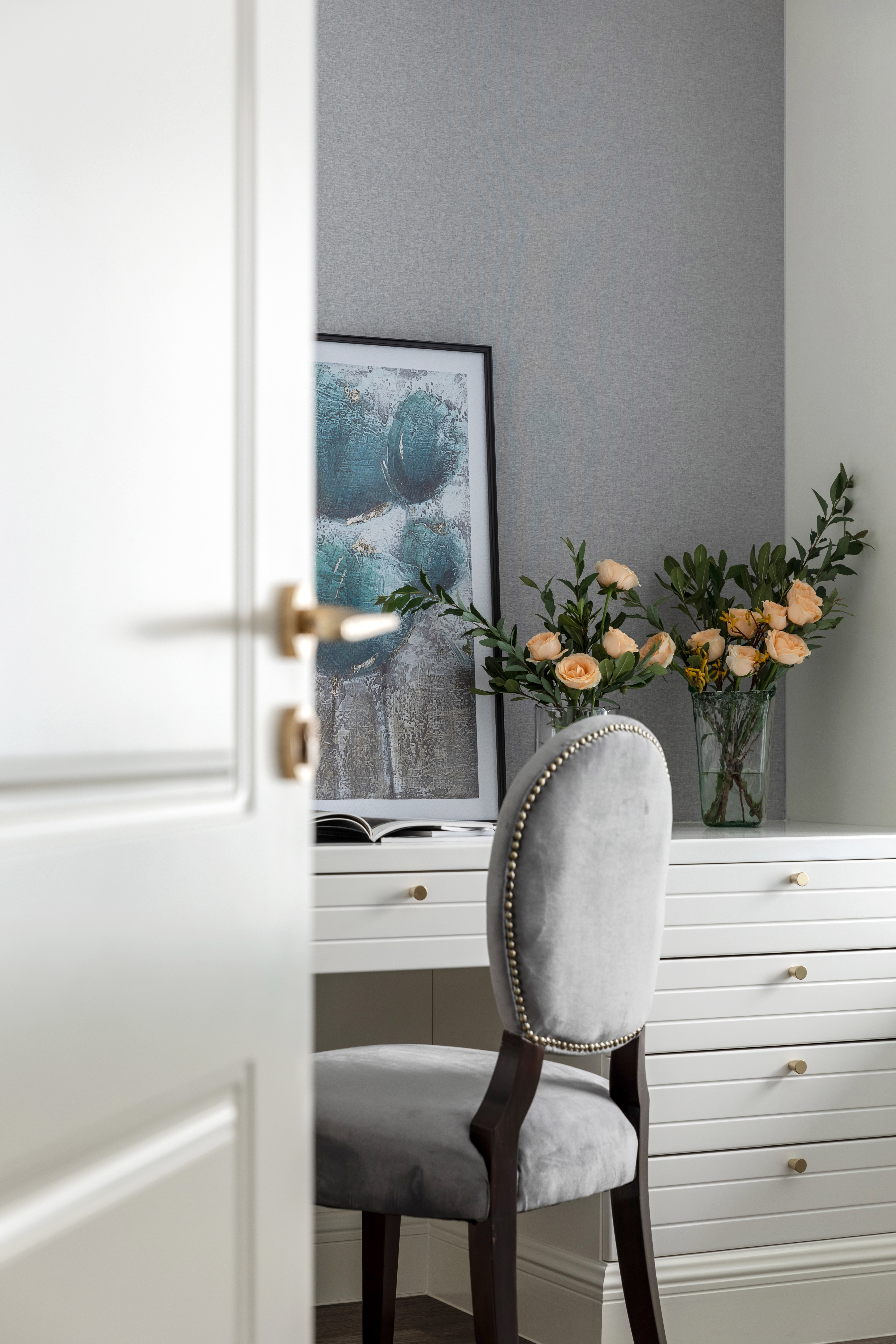 玄关的位置用一副蓝色格调挂画配上灰色的墙面,花艺的黄色和浅绿色搭配起来,蓝黄绿三色在这个空间显得非常和谐,带来一份舒适和优雅。玄关柜的柜体带有竖向的线条肌理,所以挂画的选择时,我们特地选了和柜体有同样肌理感的图案,仿佛让肌理在空间里延伸,生长。