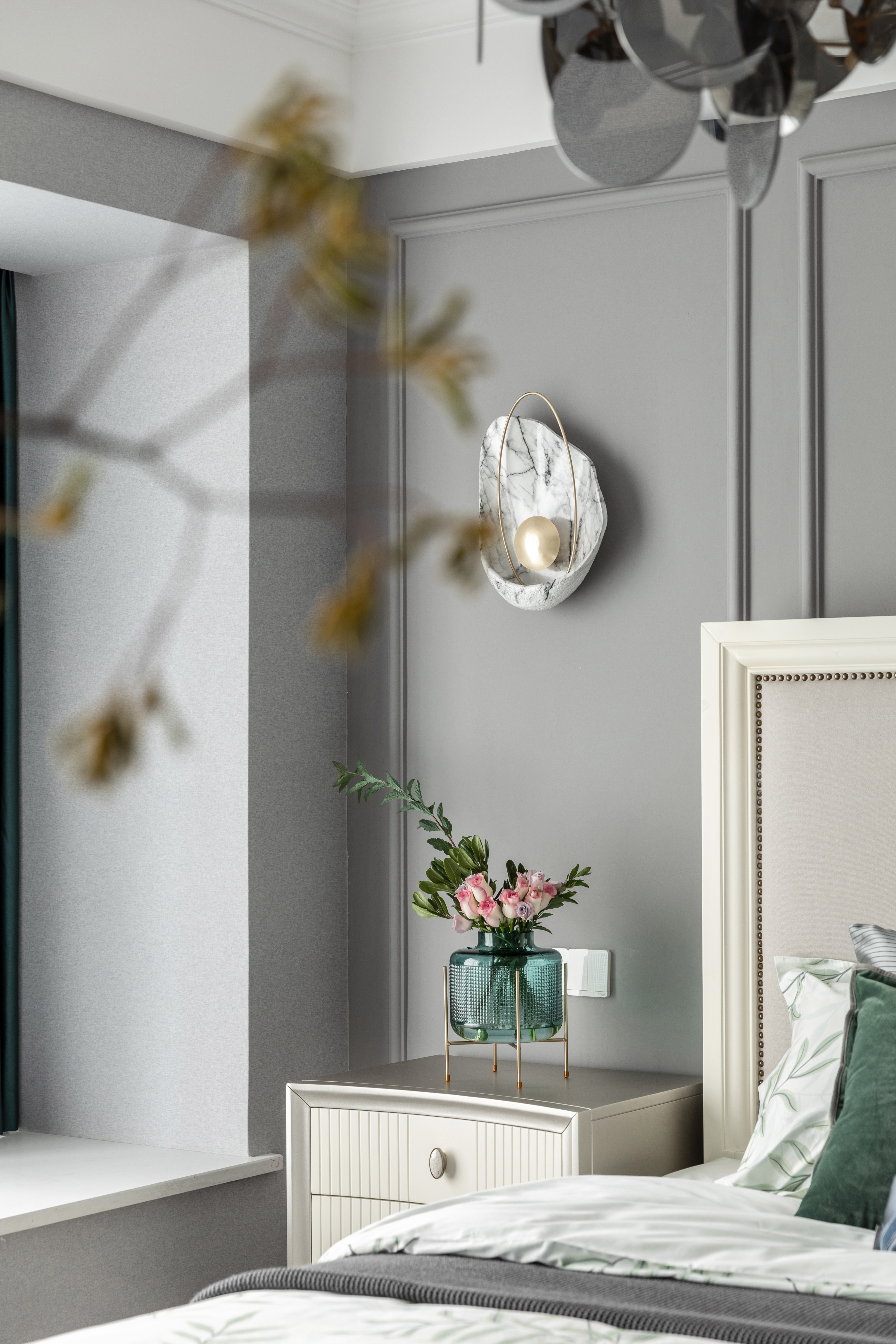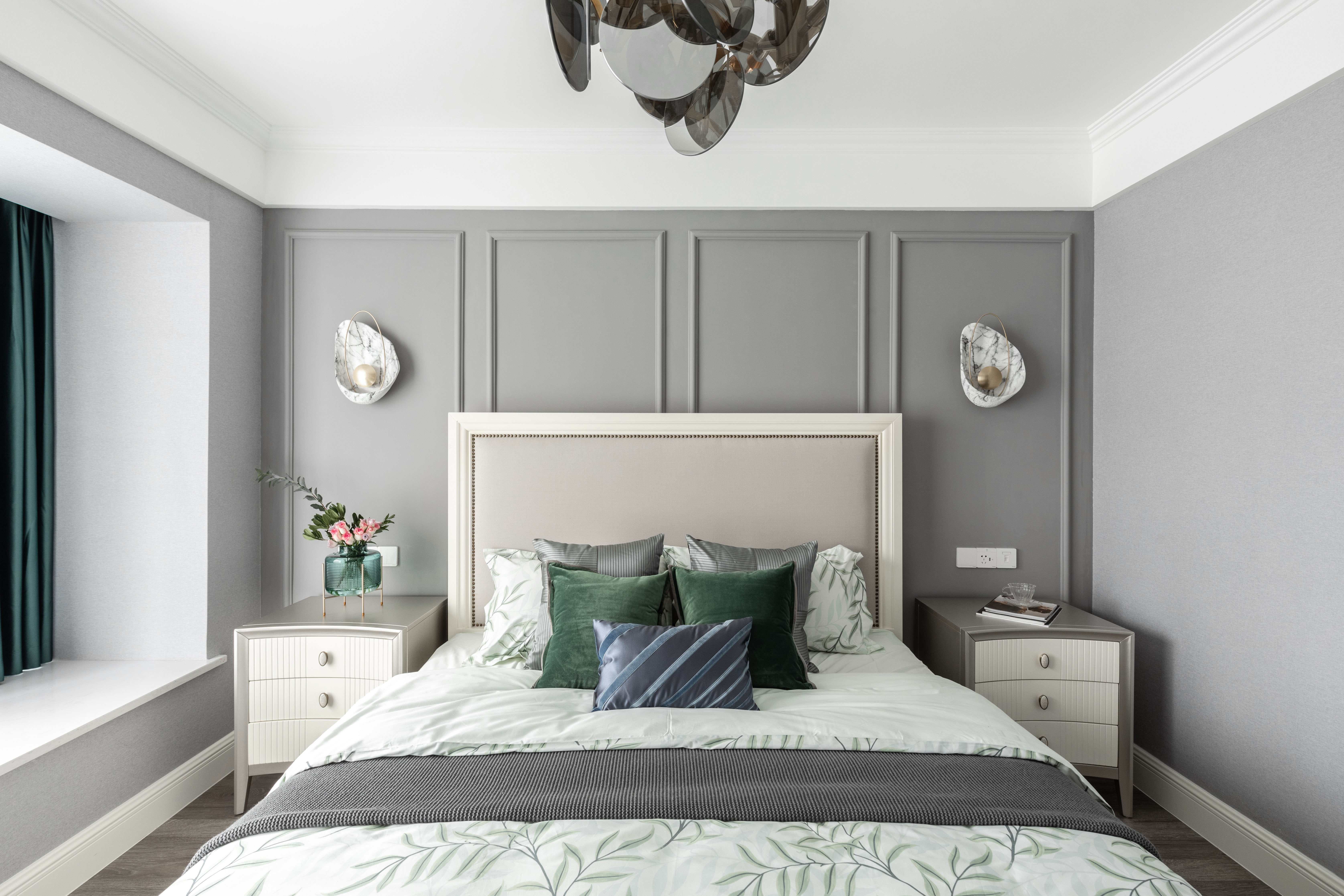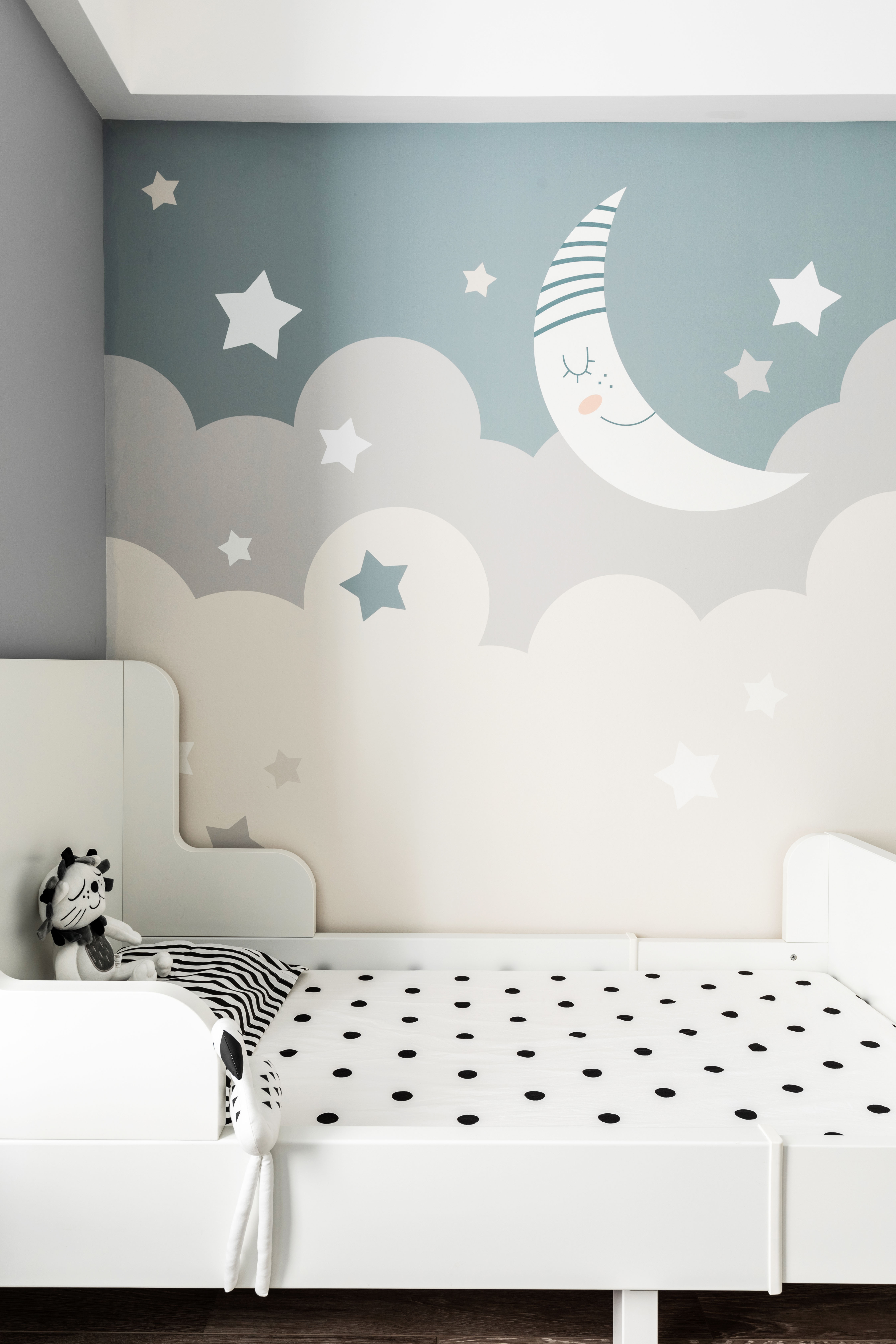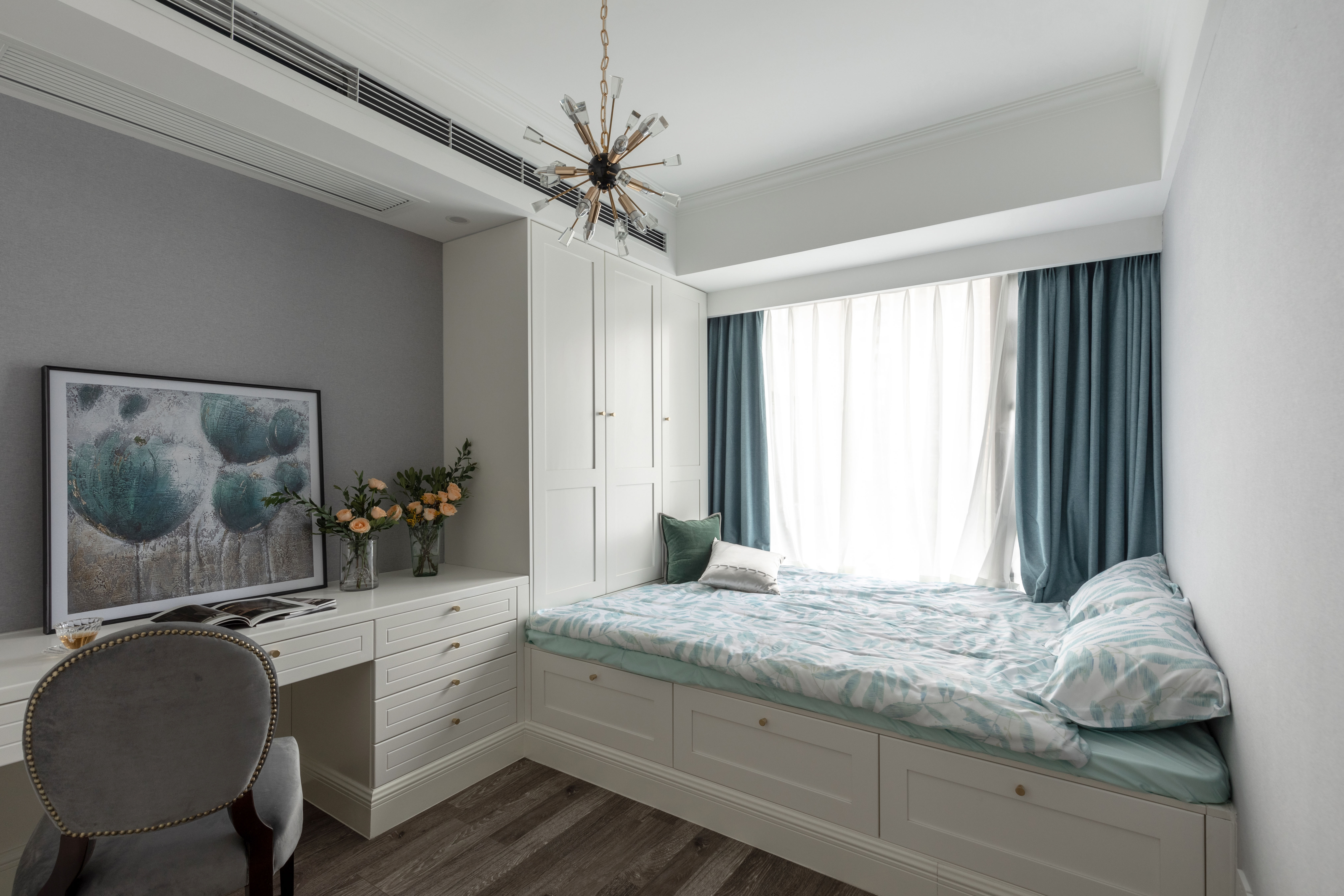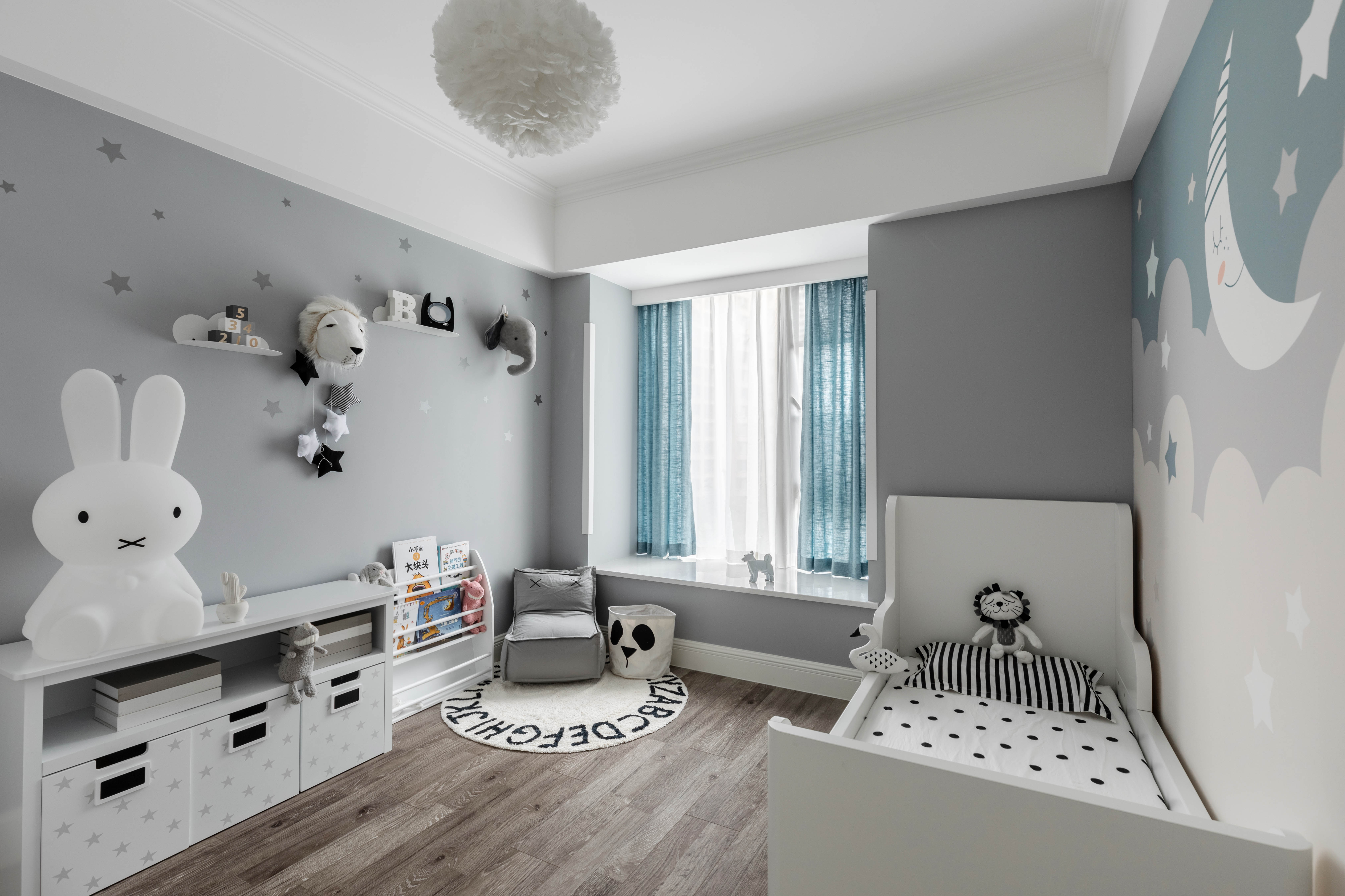 说到儿童房,也要特别谢谢女主人的配合和她细腻的心思。儿童房的配饰都由她亲自挑选,可爱的米菲兔台灯,软萌的绒布玩具,无不体现着一位母亲的暖暖的爱意,婴儿蓝的窗帘配上灰色饰面与白色绒布,为整个空间增添了柔和和宁静,可爱的孩子在这样一个充满着妈妈爱的细节卧室里,想必连做梦都是甜甜的呢。