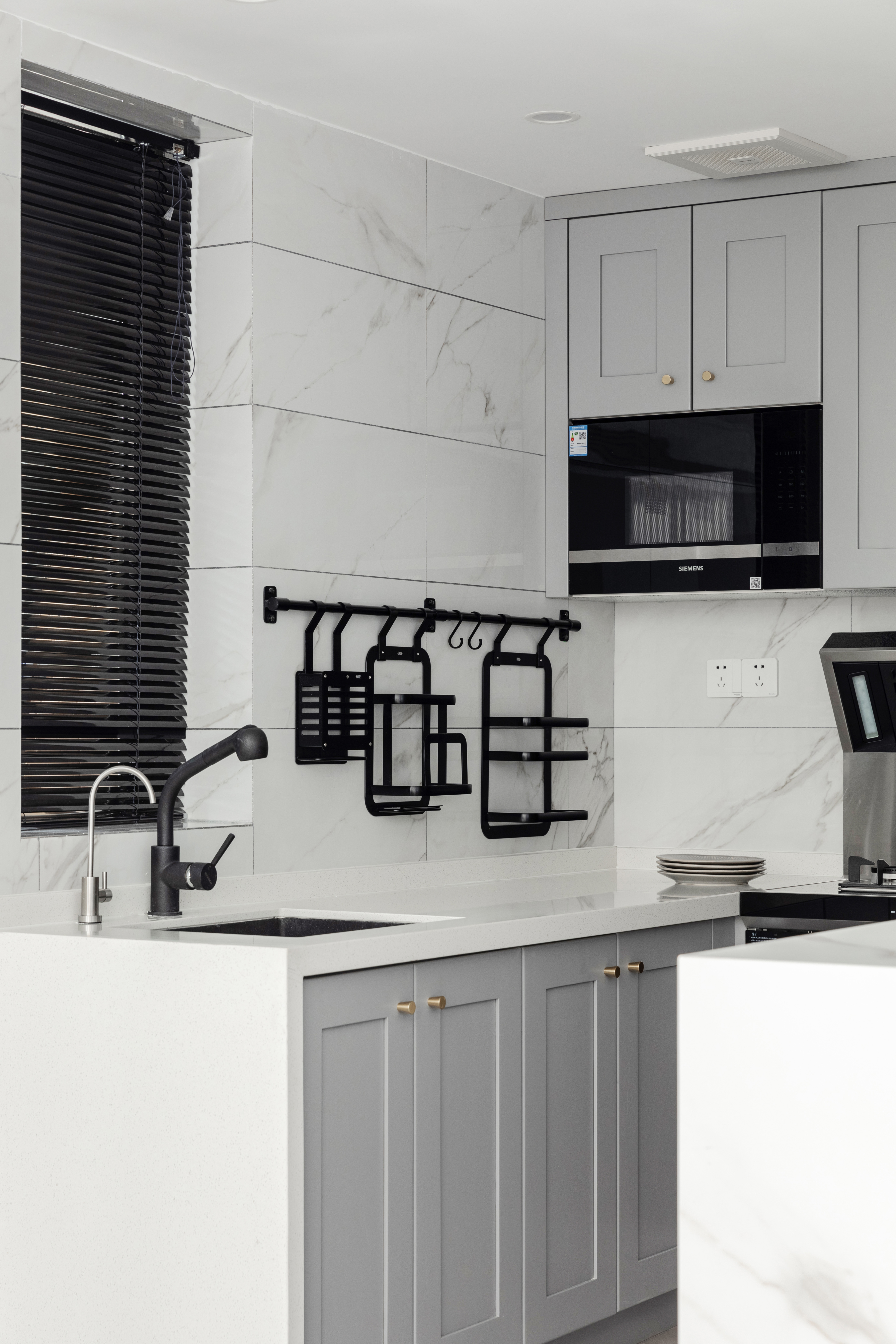 厨房也是一家人交流最直接的地方。一个干净又整洁的厨房会提高居家的幸福感,让人更有用餐的欲望。大理石吧台和灰色橱柜搭配,从视觉的整体看上去会更统一。