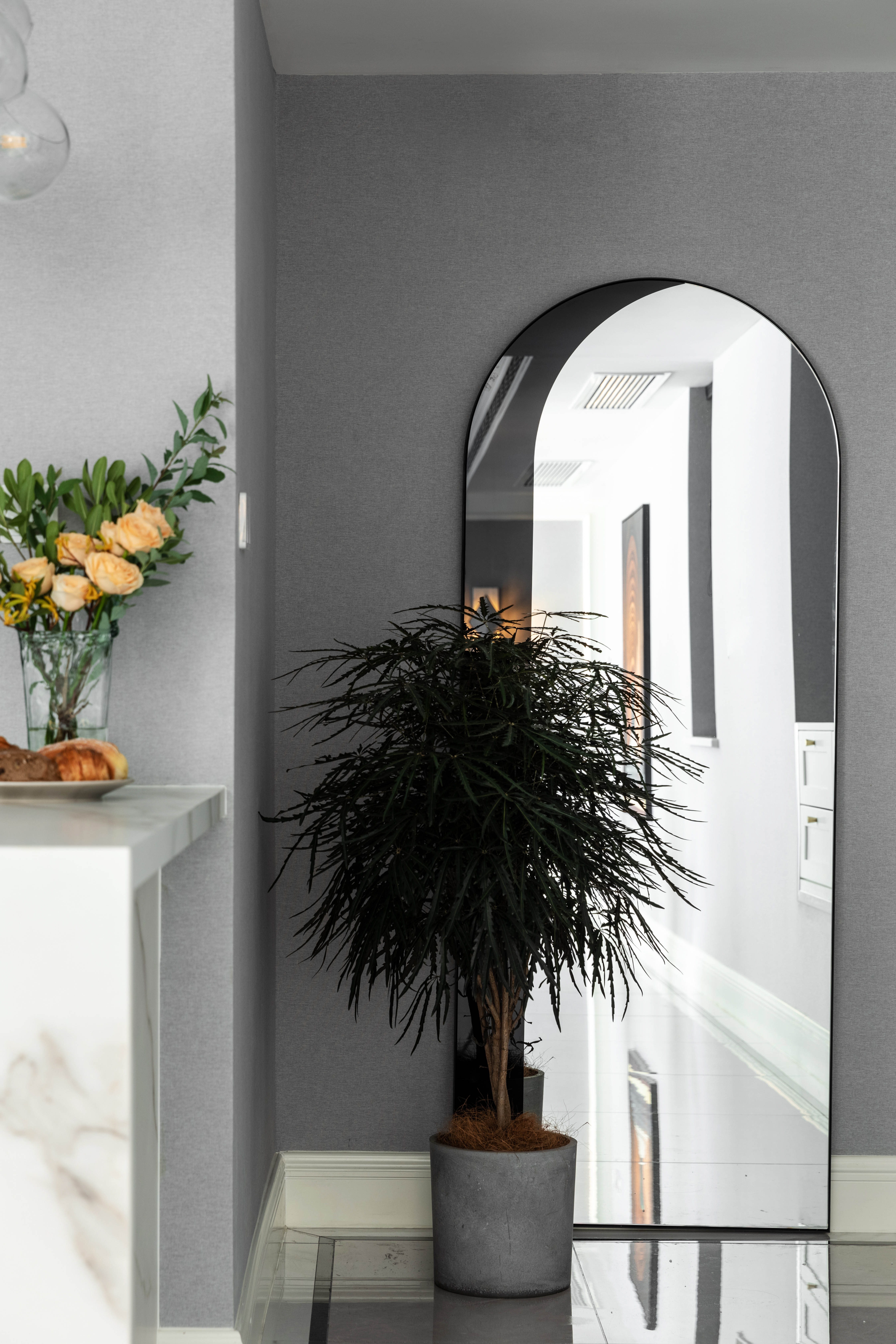 餐厅旁边的过道尽头选用了一个拱形装饰镜,为空间增加了一点趣味和神秘感。