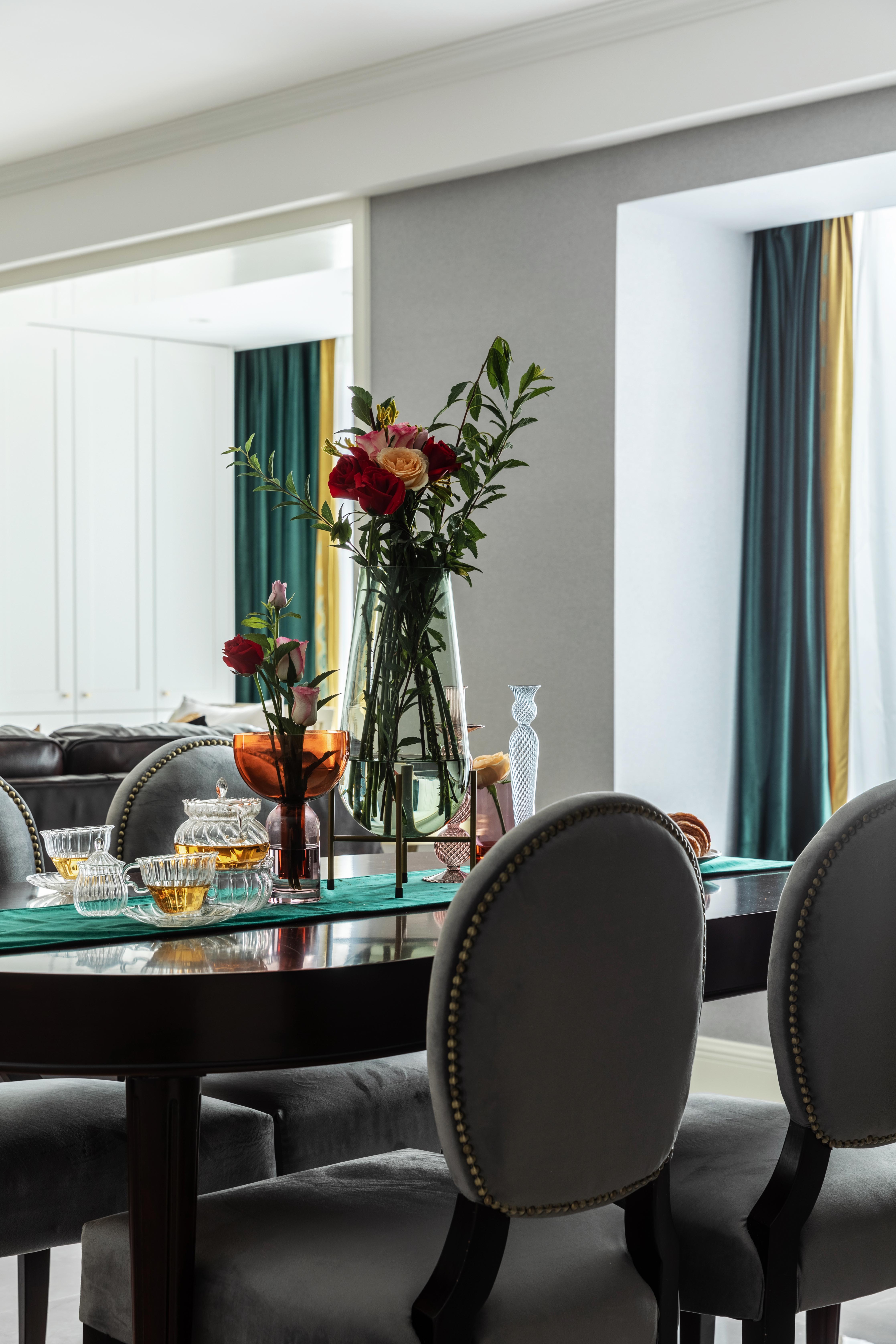 在为餐厅空间深化陈设时,我们为女主人一家构想了一个美好的清晨,咖啡的香气弥漫在指尖,可颂面包淡淡的香气缠绕着桌上的一碗一盘。花瓶里插着新鲜又精致的玫瑰,餐具交错间发出的叮当声和孩子的欢声笑语,清晨的阳光透过柔软的窗帘投射到简洁的餐具上,这不就是一个家幸福的仪式感么?家人,始终是你最终的归宿,家人的样子便是我们行走世间心底最坚硬的依靠。