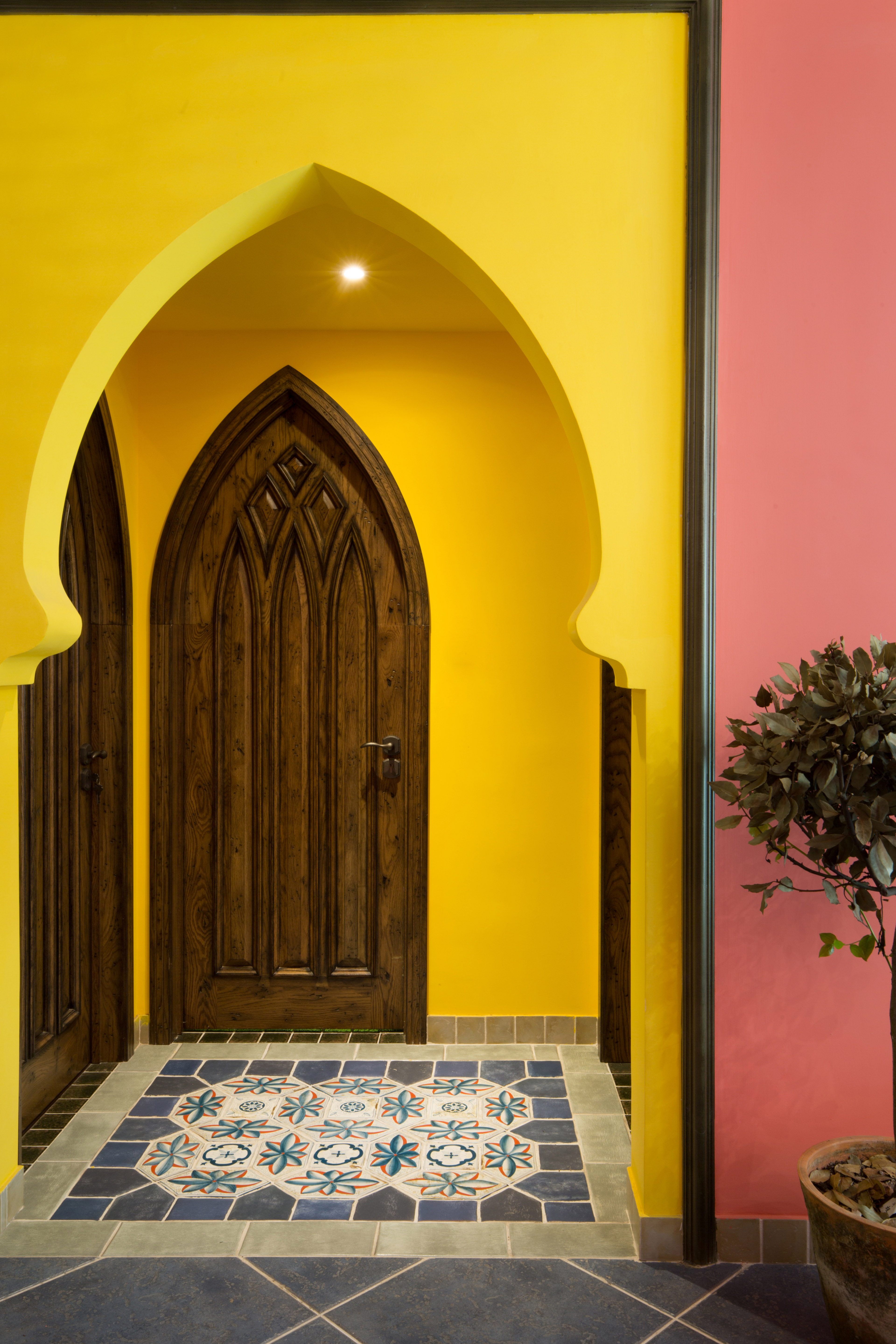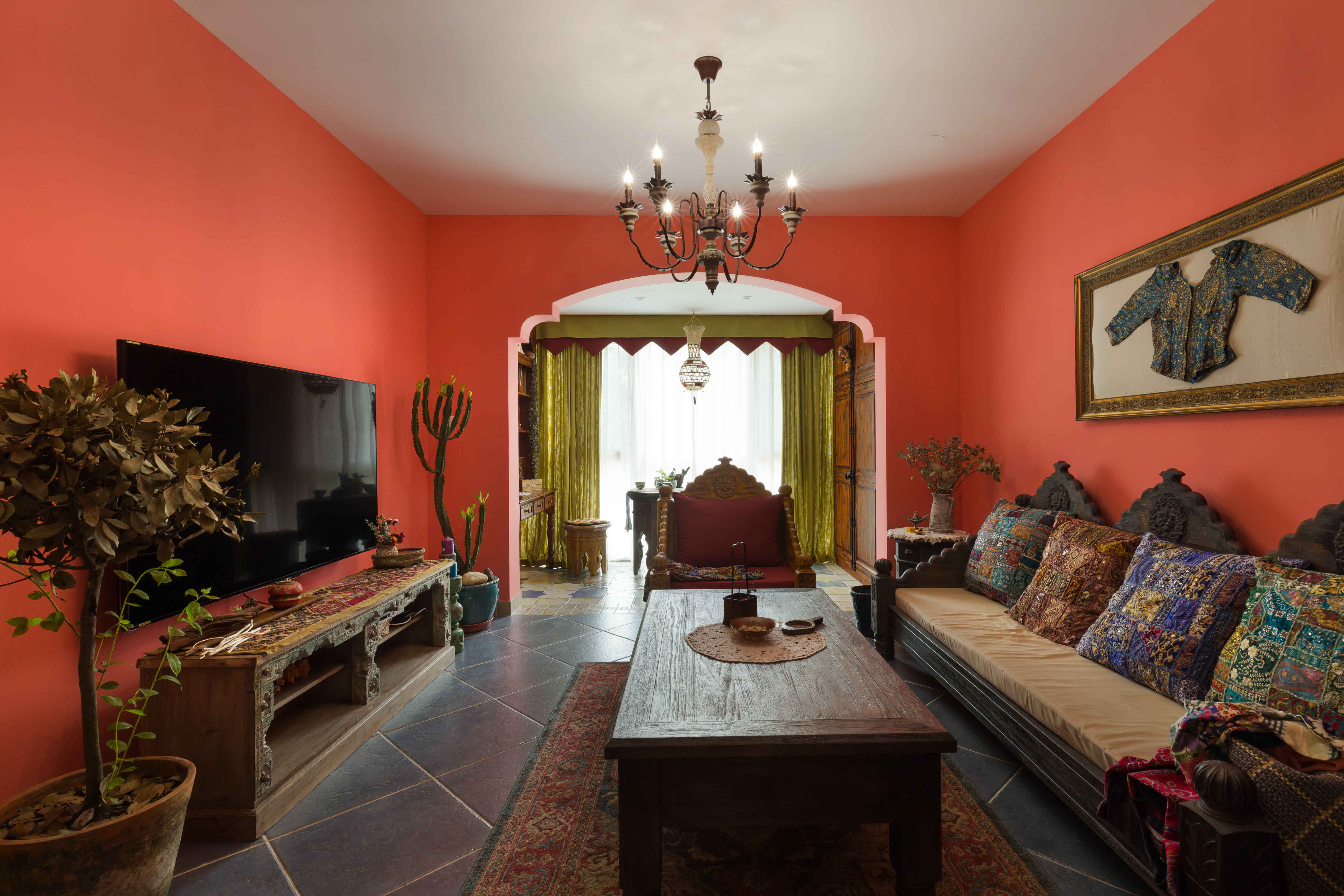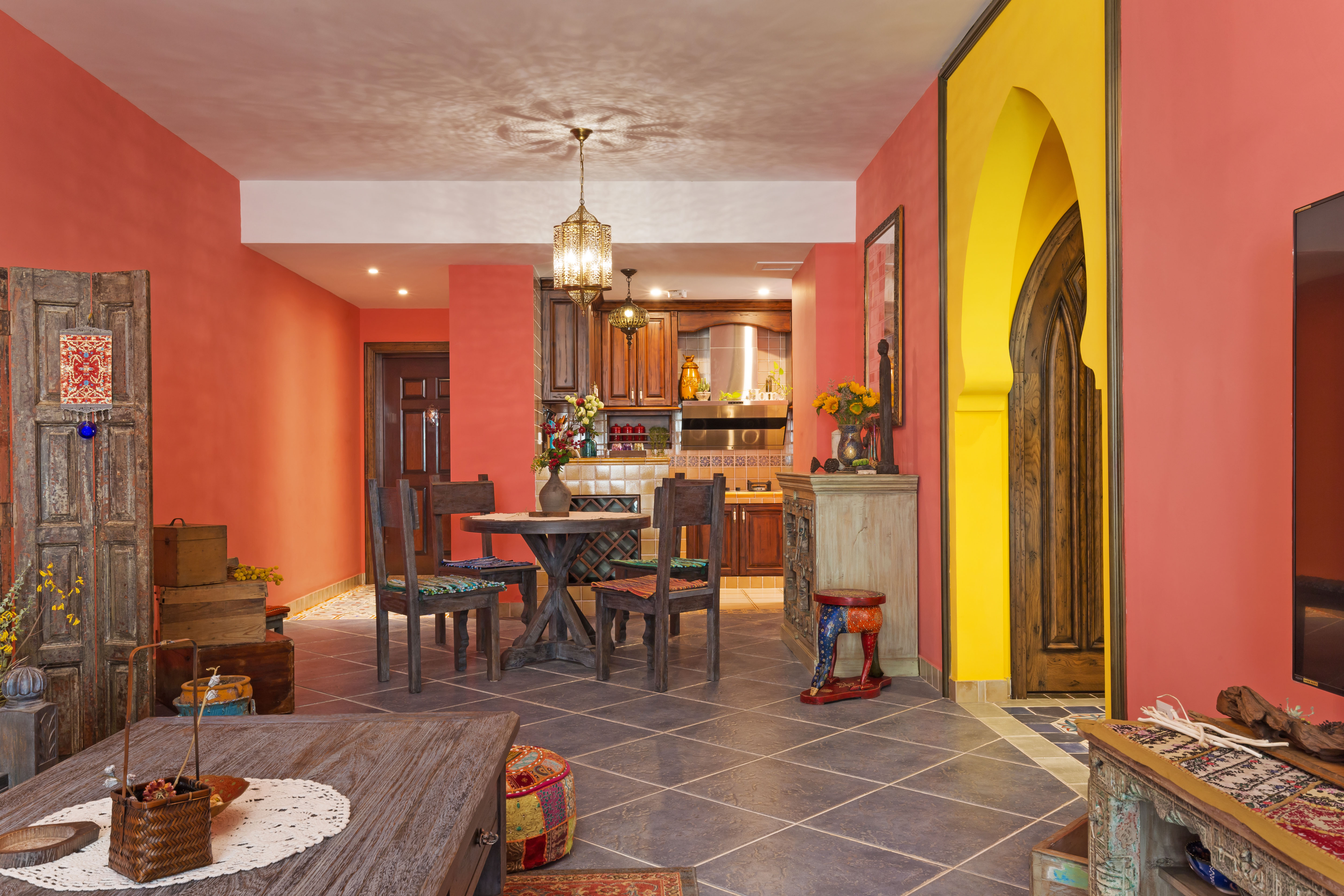 门洞的设计提取了摩洛哥当地的建筑,独具特色的弧形造型,让人在家都仿佛置身于摩洛哥当地某一家咖啡馆。花砖与明艳的色彩交织在一起,如同一首明快的情歌。